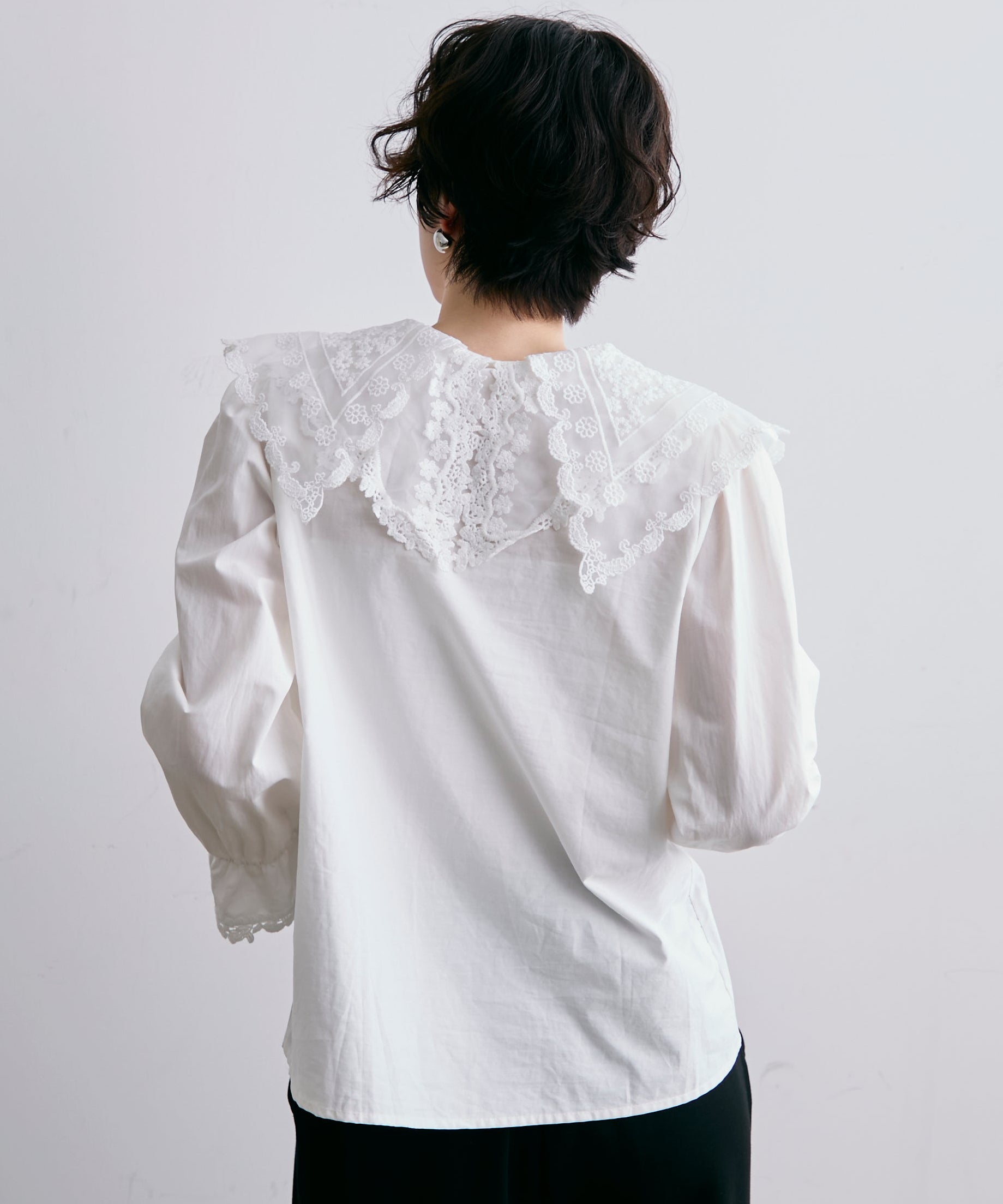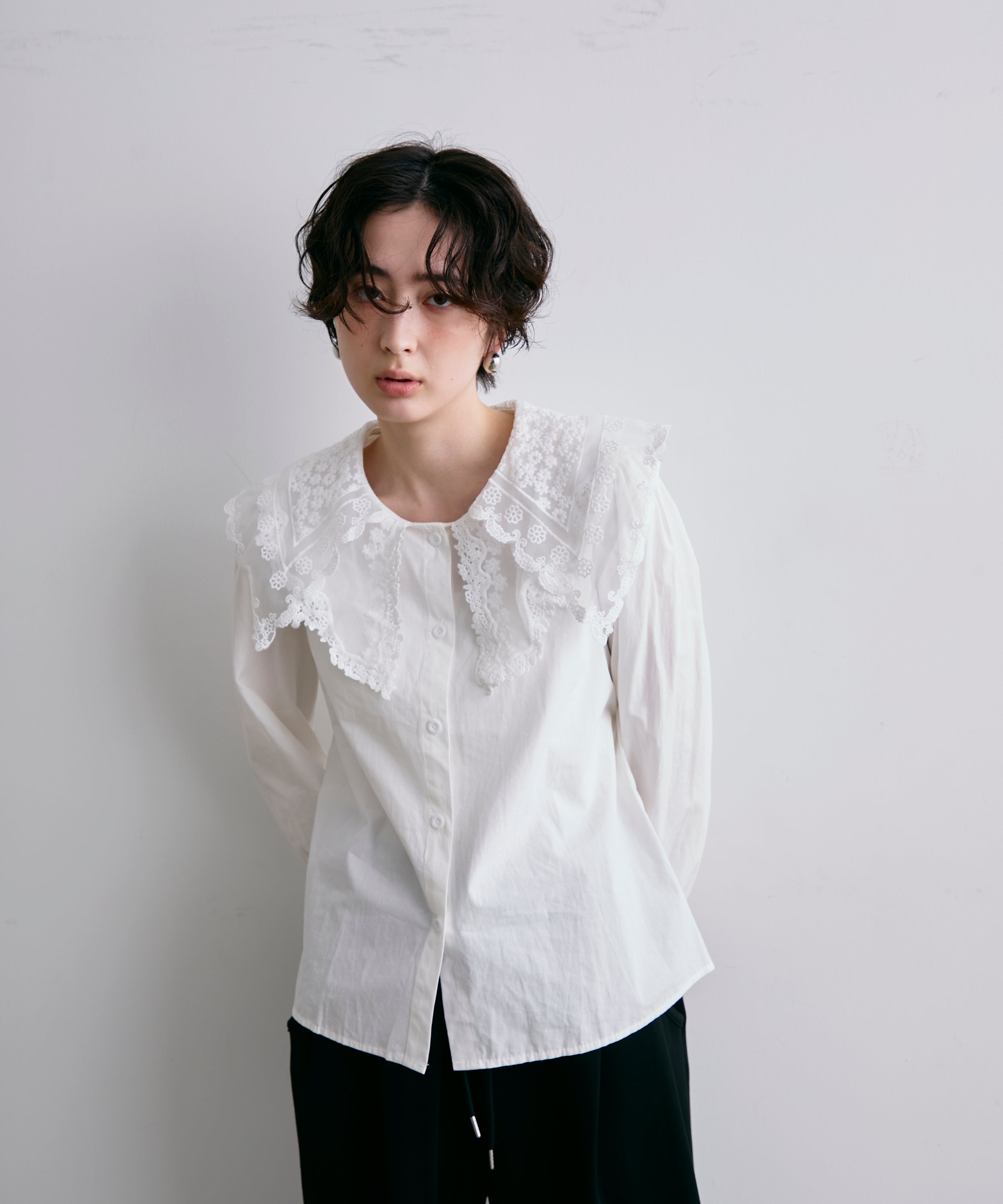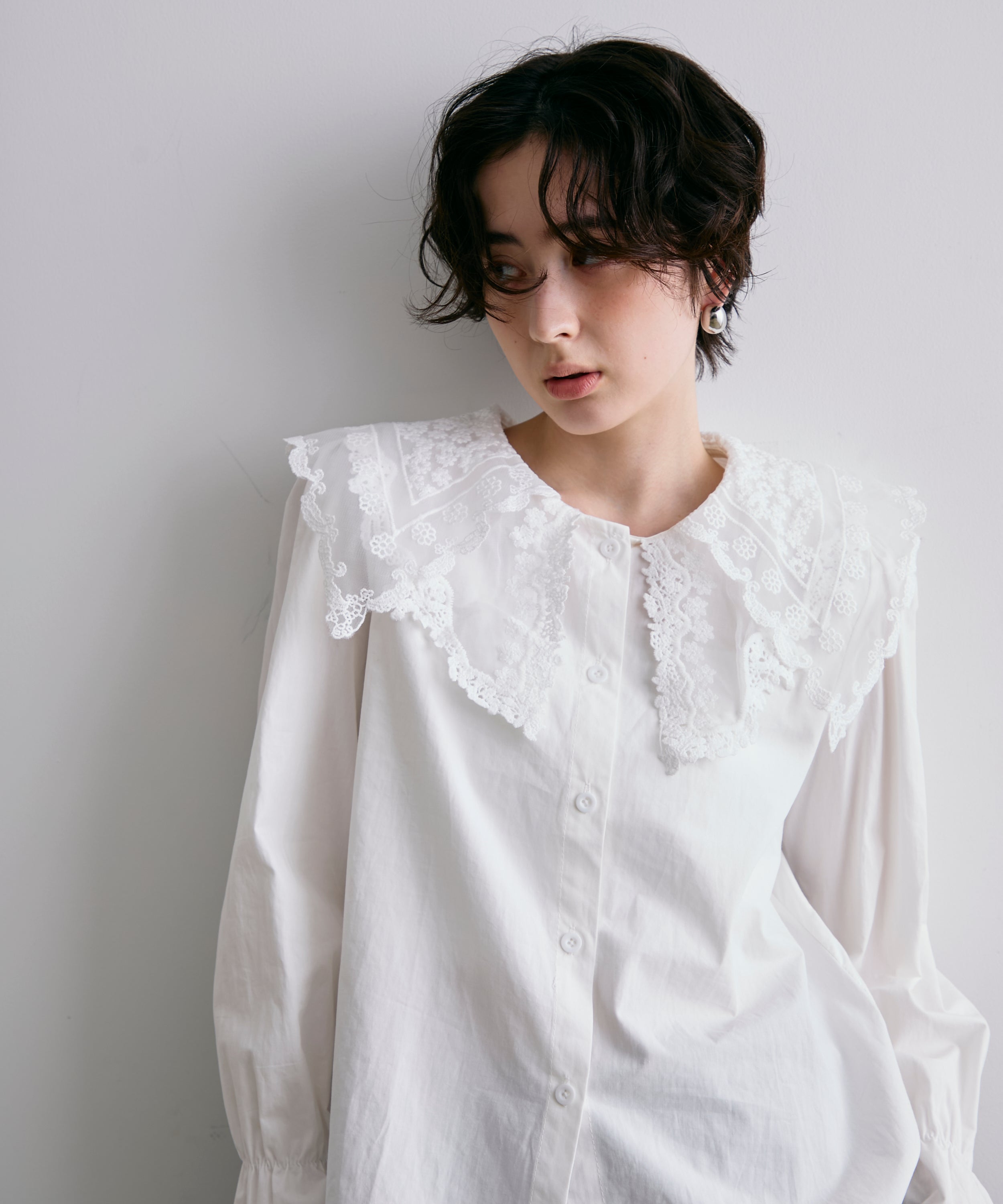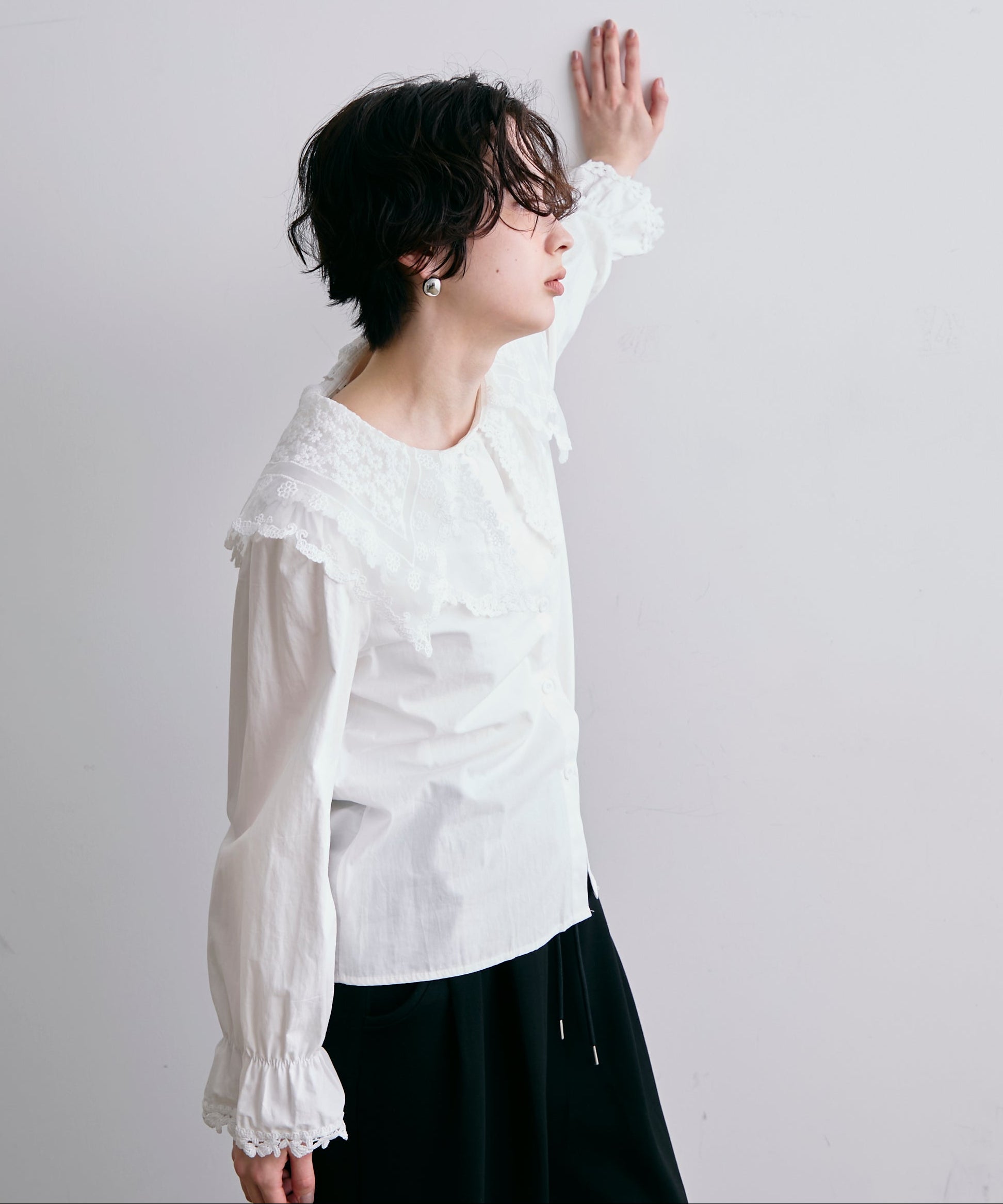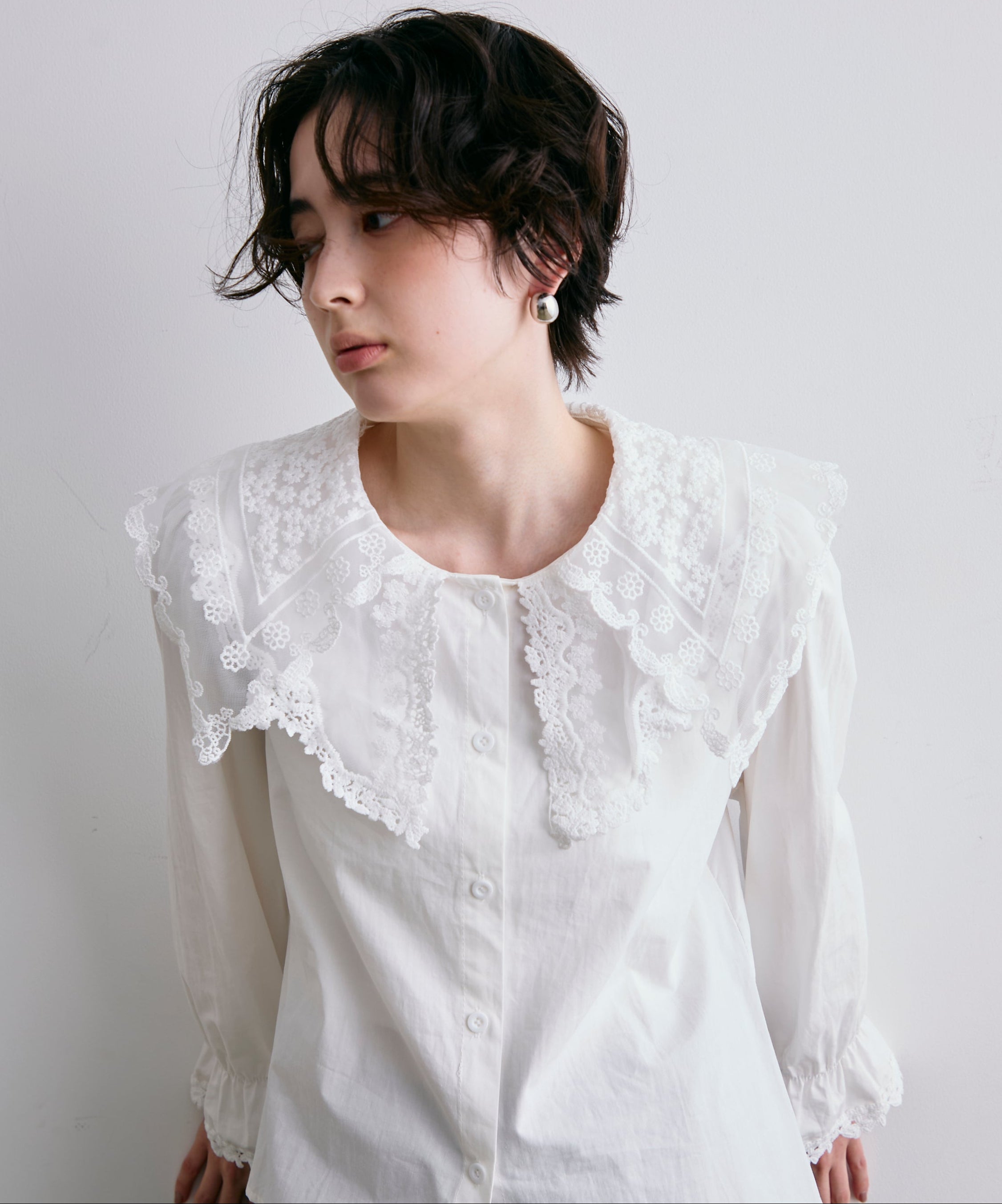 繊細なエンブロイダリー刺繍と存在感のあるビッグカラーが印象的なブラウス。