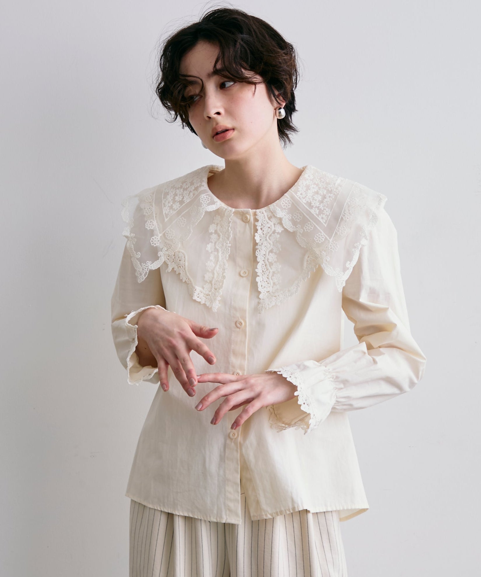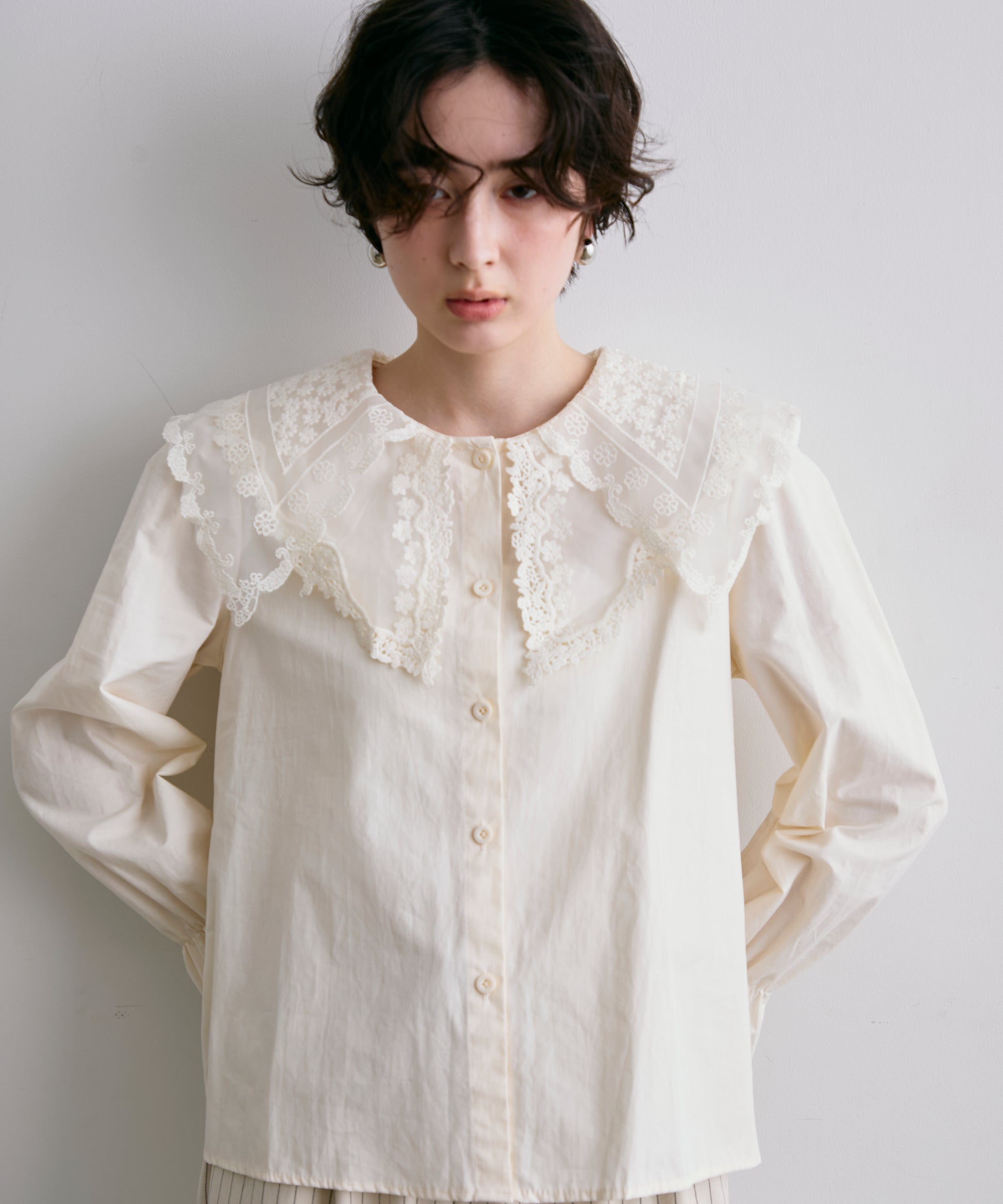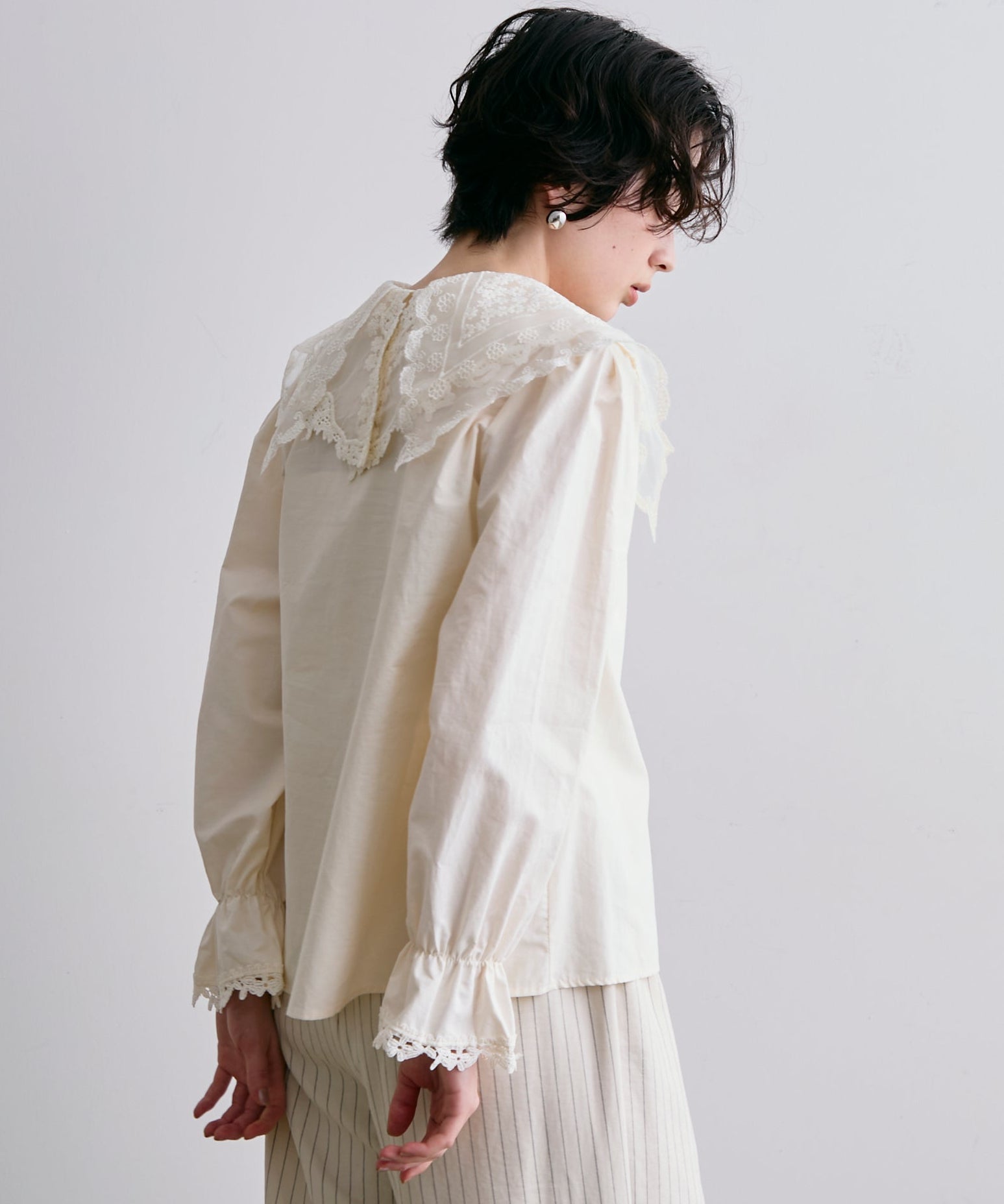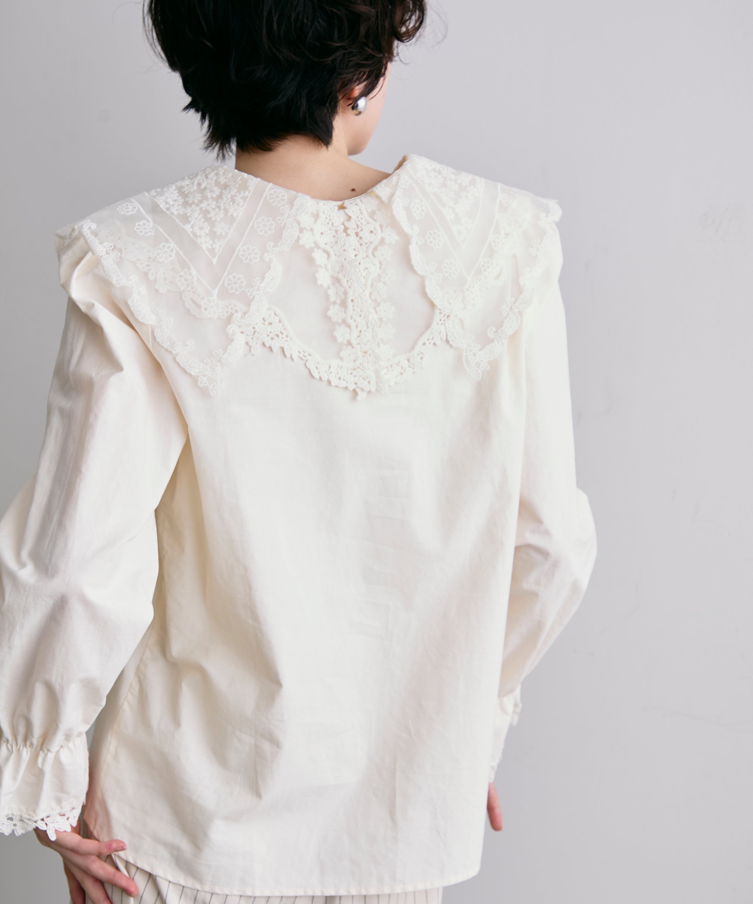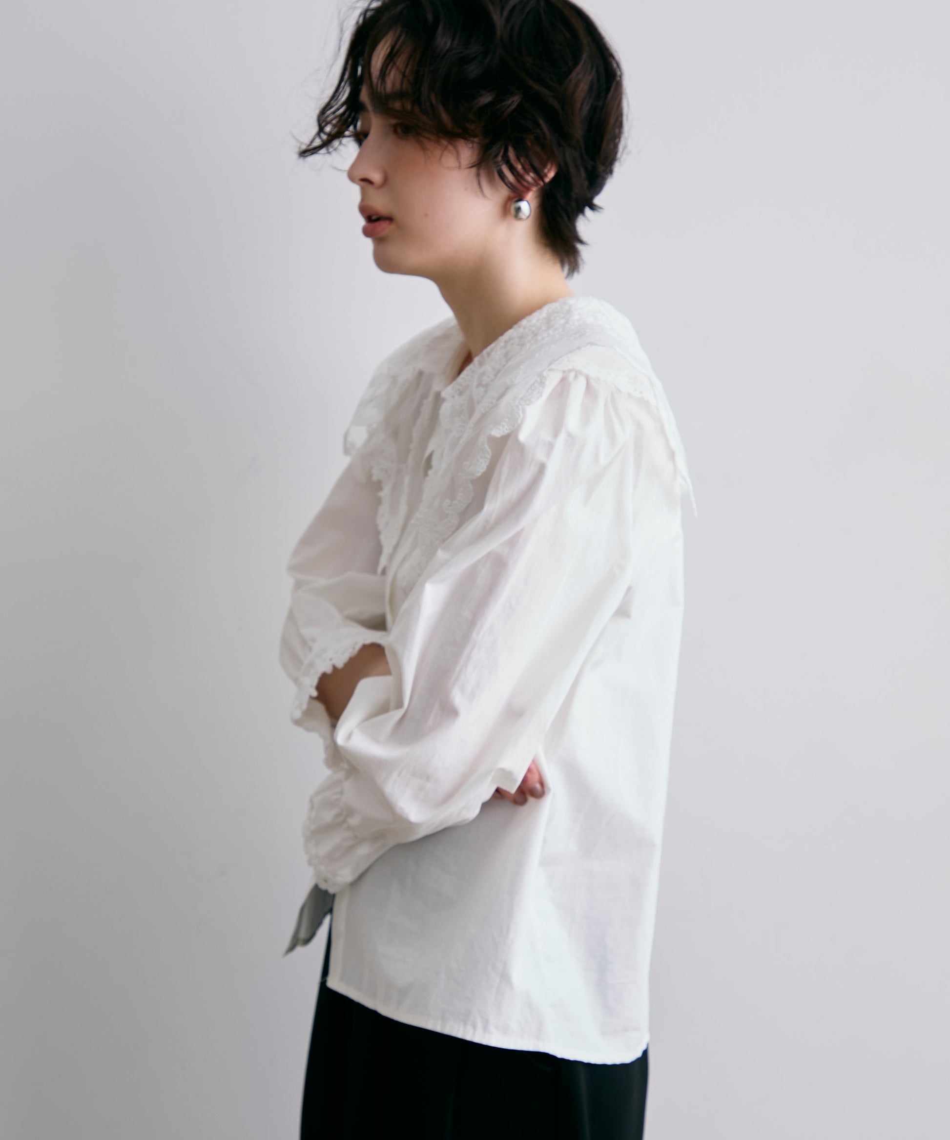 繊細なエンブロイダリー刺繍と存在感のあるビッグカラーが印象的なブラウス。