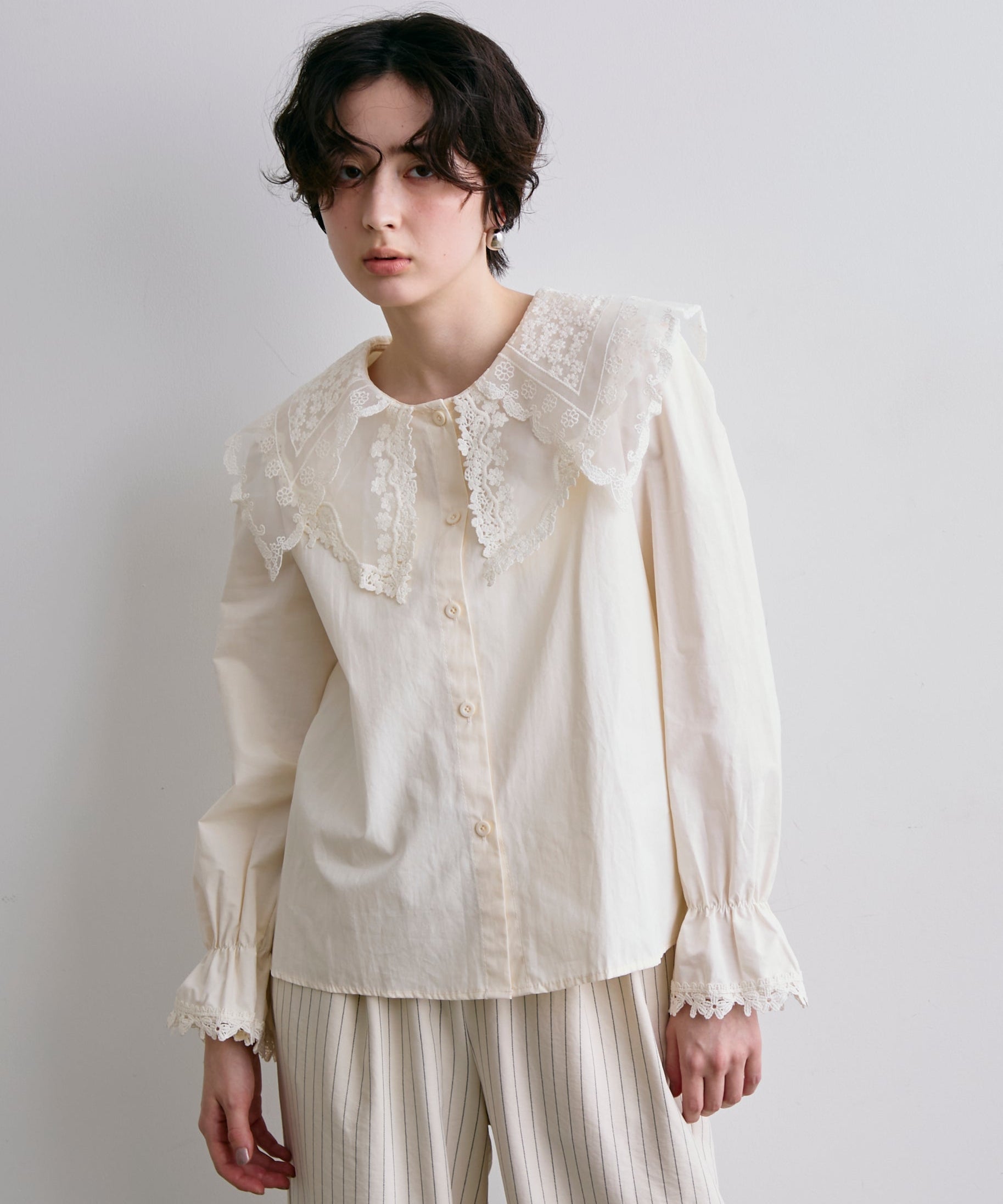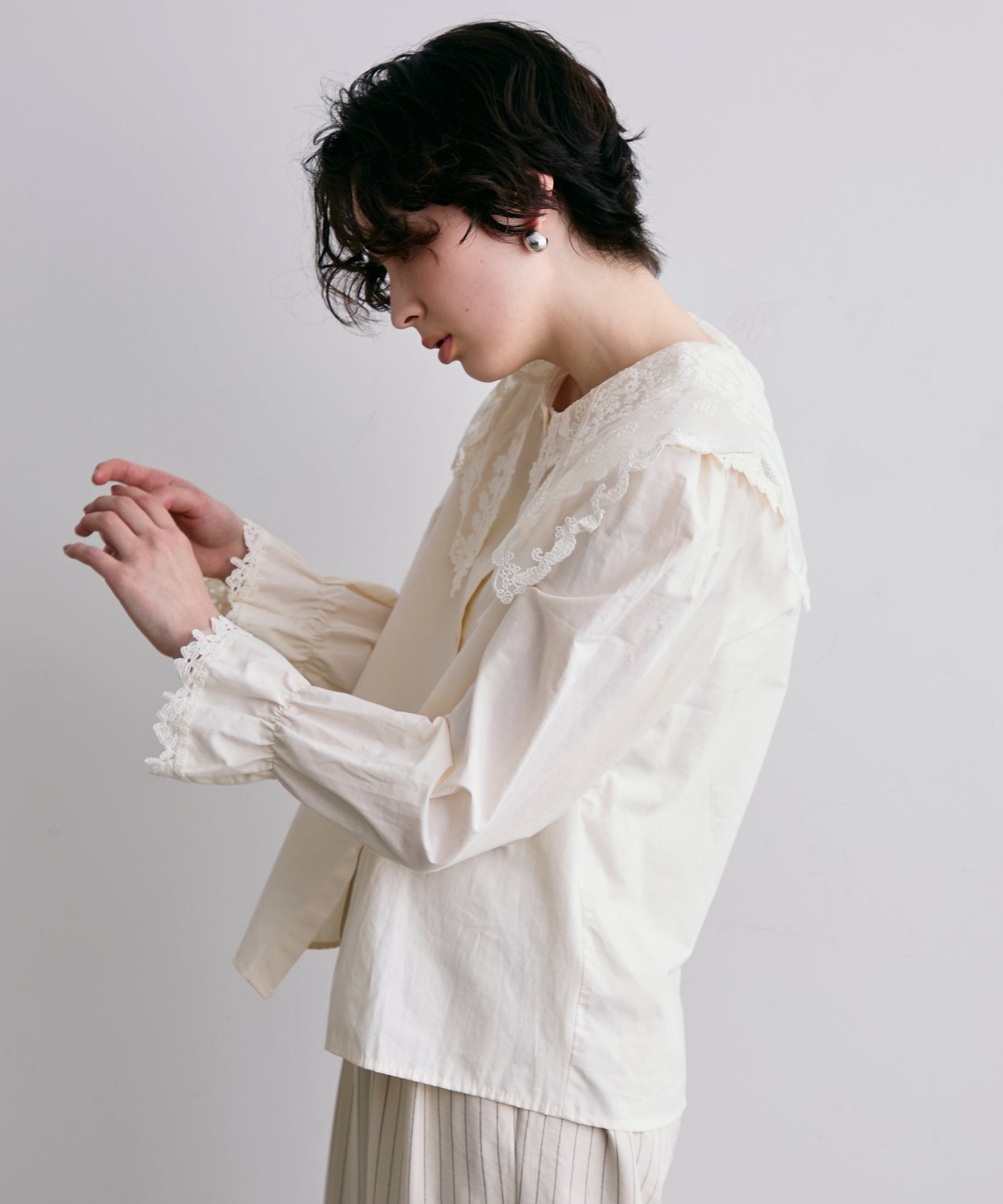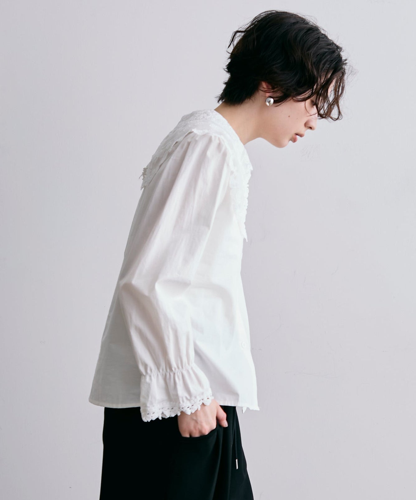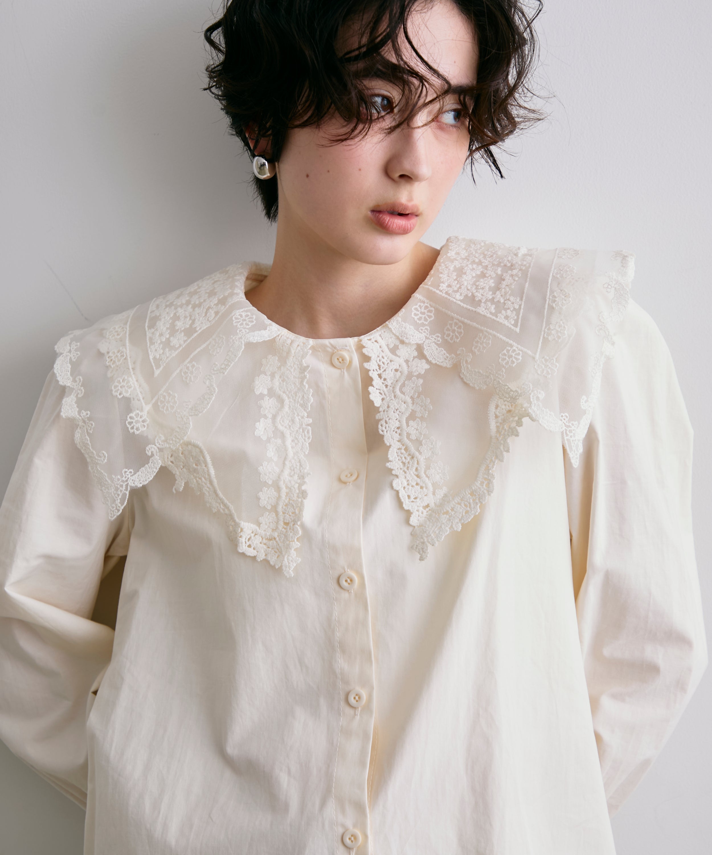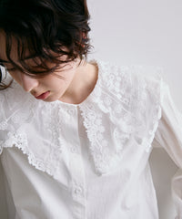 繊細なエンブロイダリー刺繍と存在感のあるビッグカラーが印象的なブラウス。