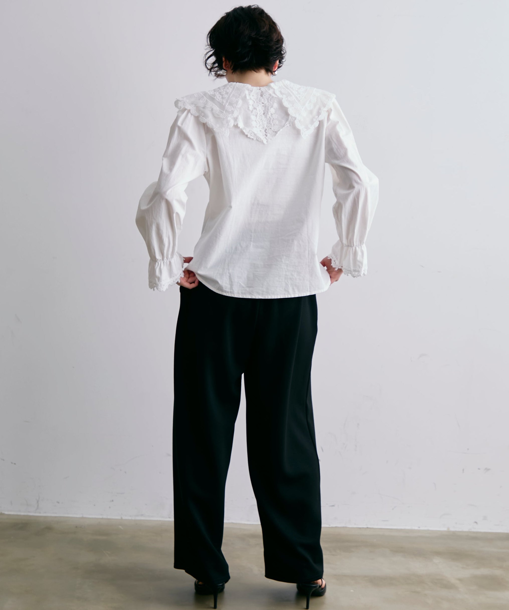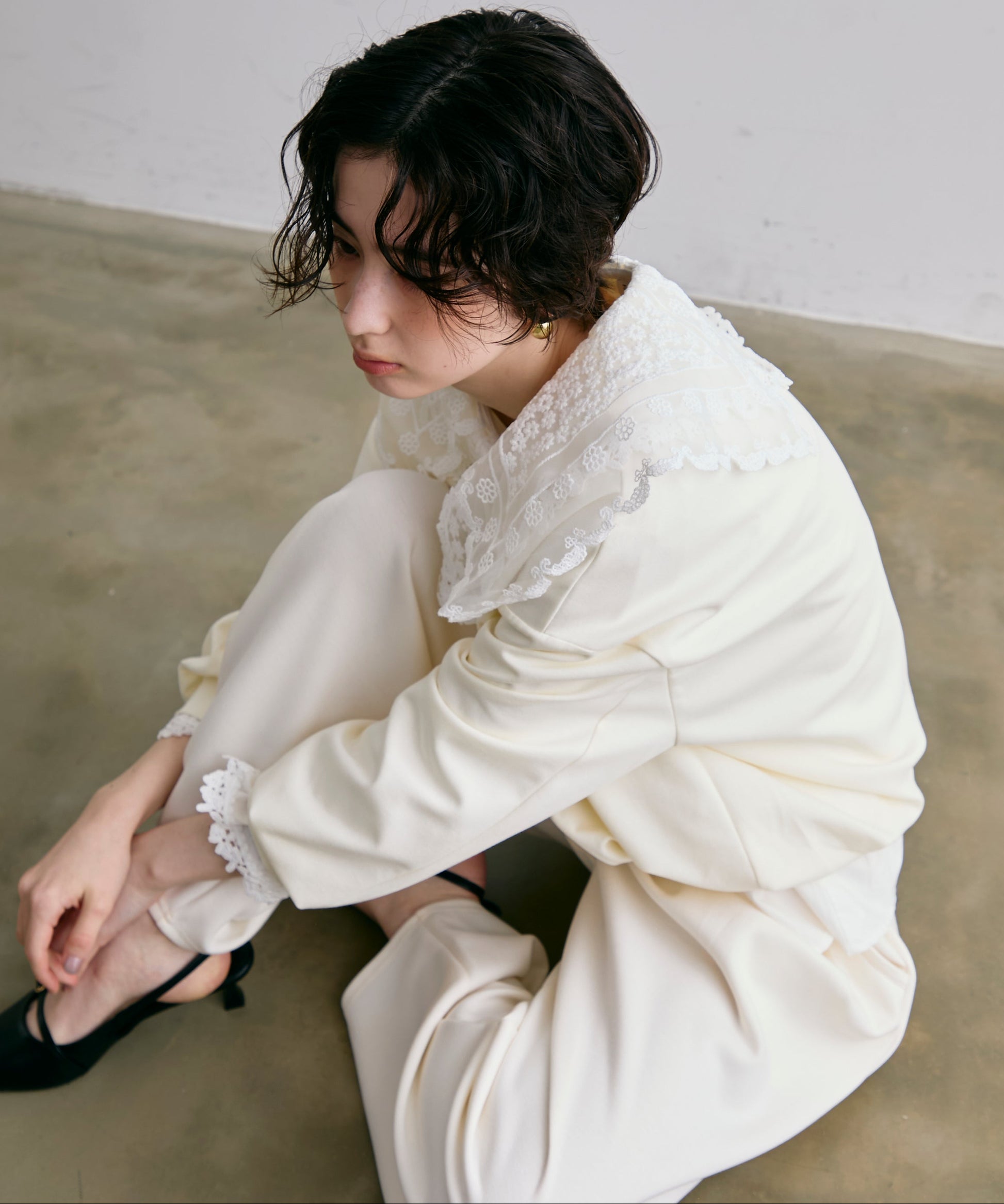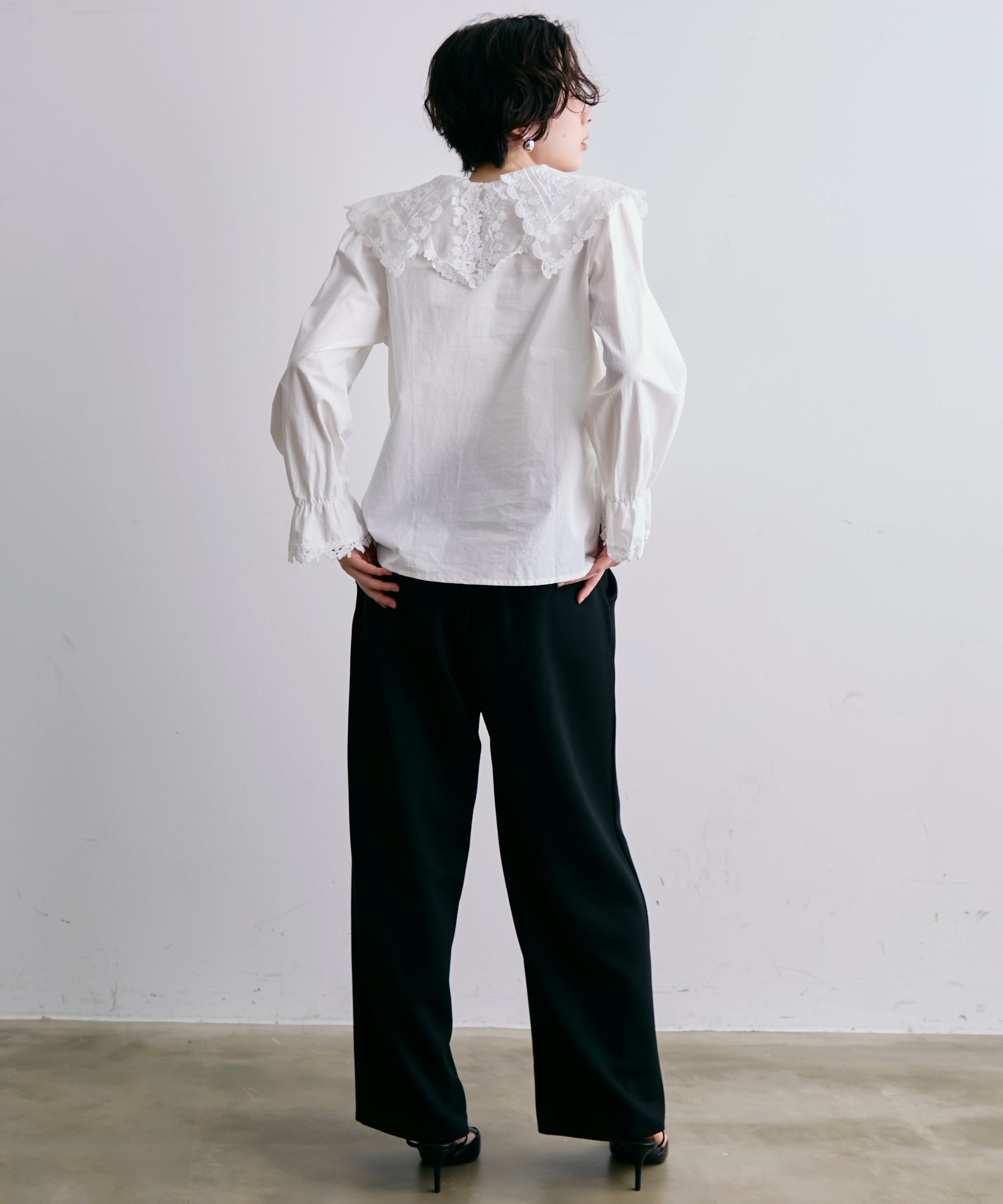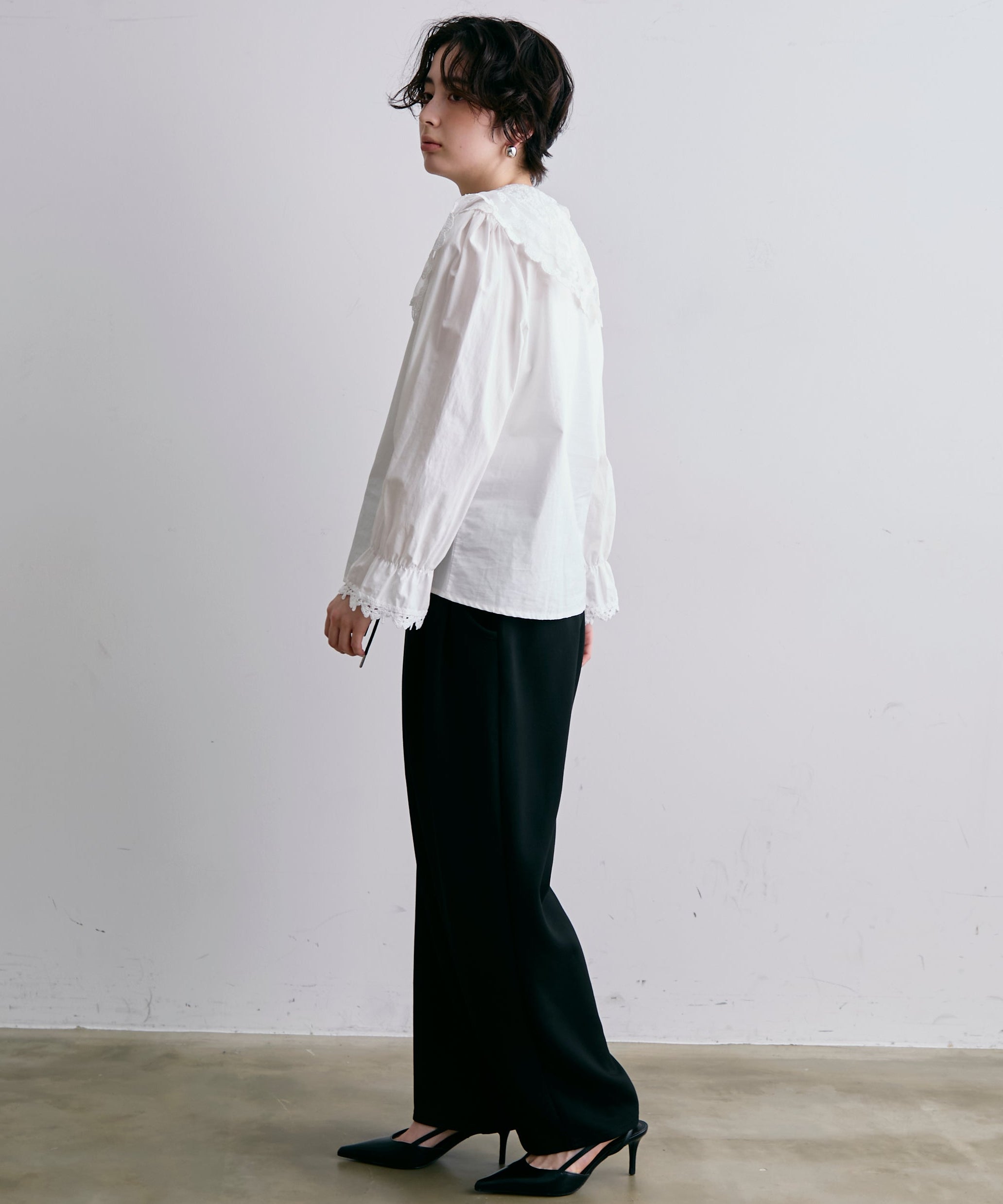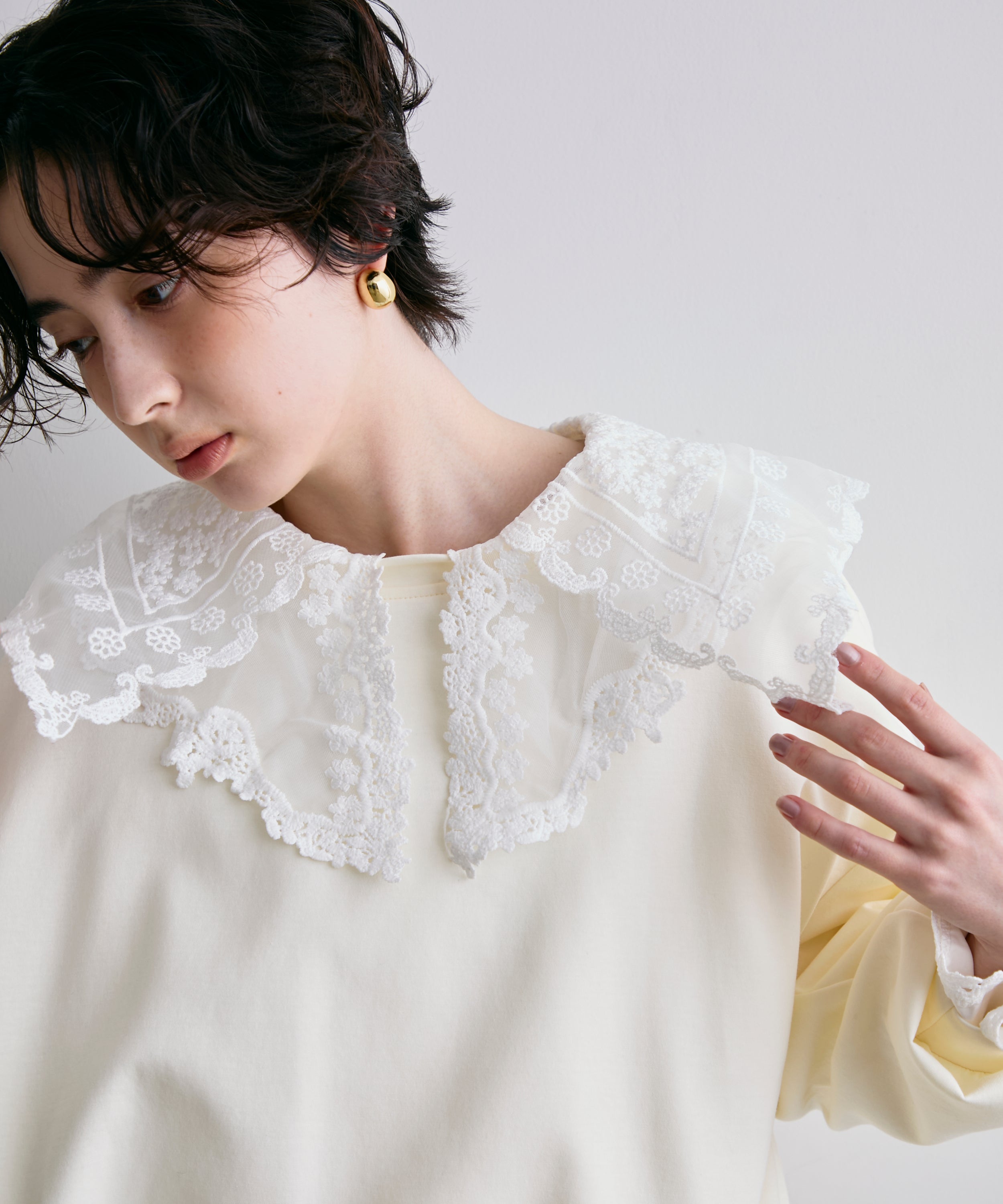 繊細なエンブロイダリー刺繍と存在感のあるビッグカラーが印象的なブラウス。