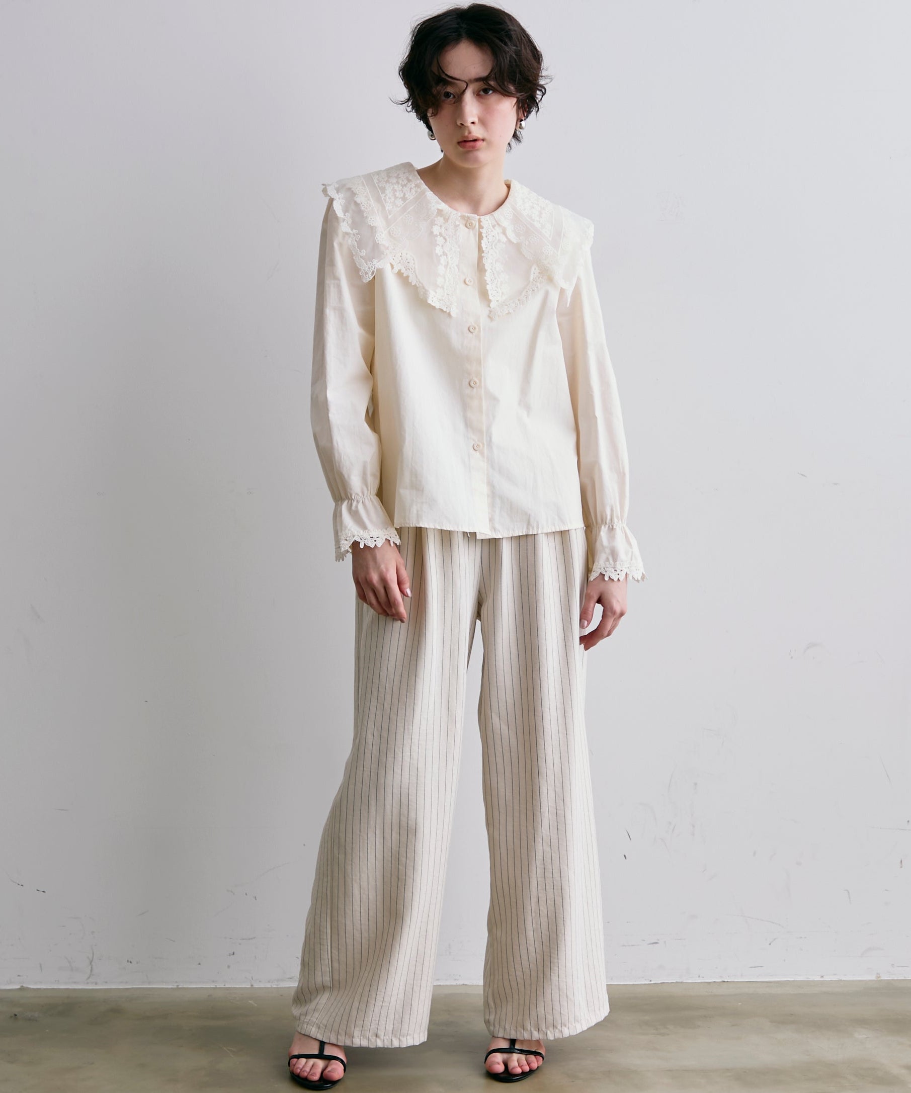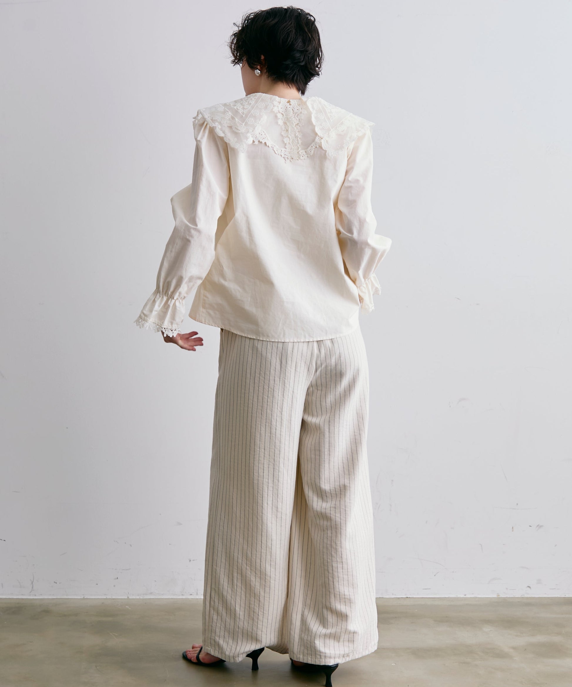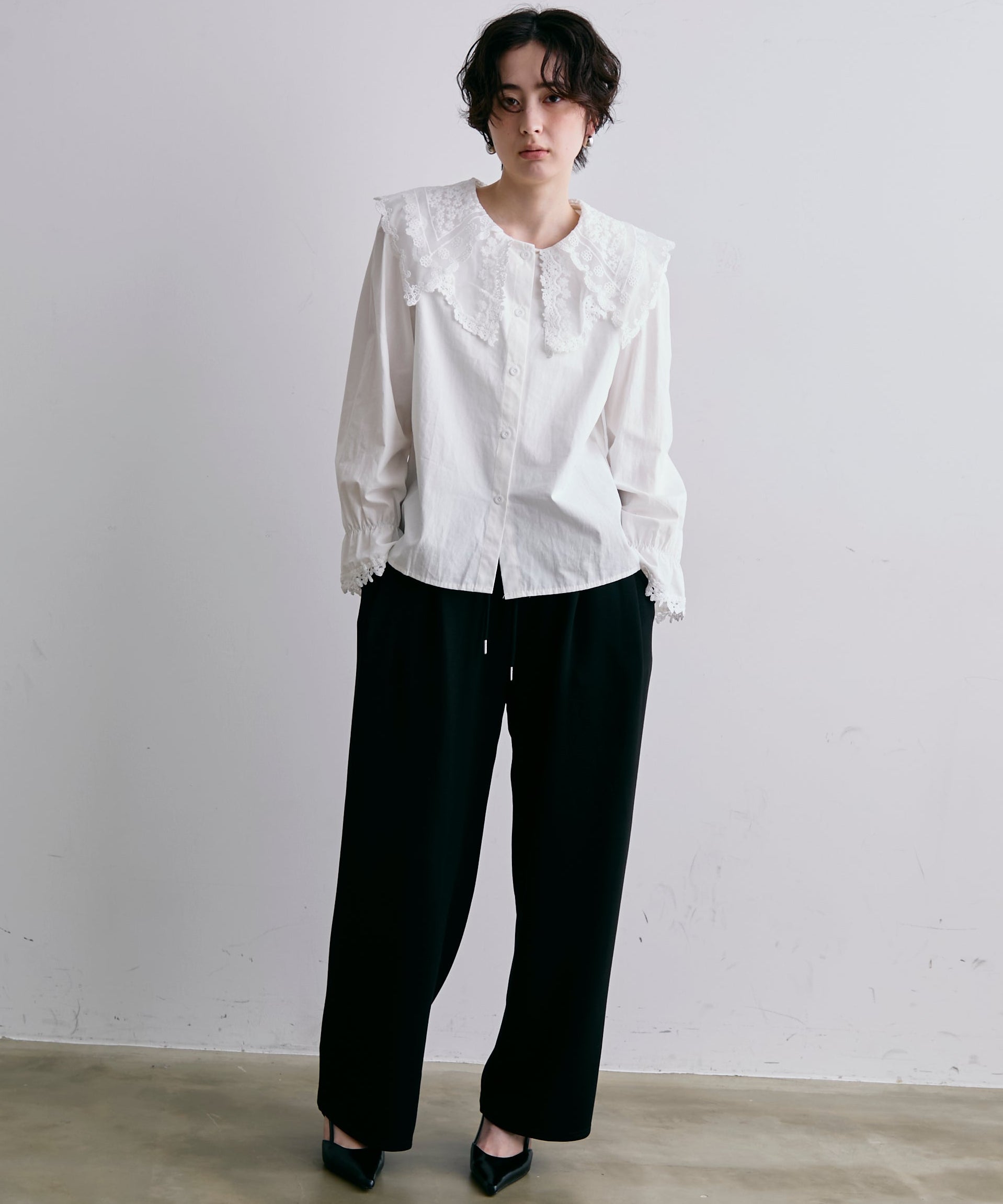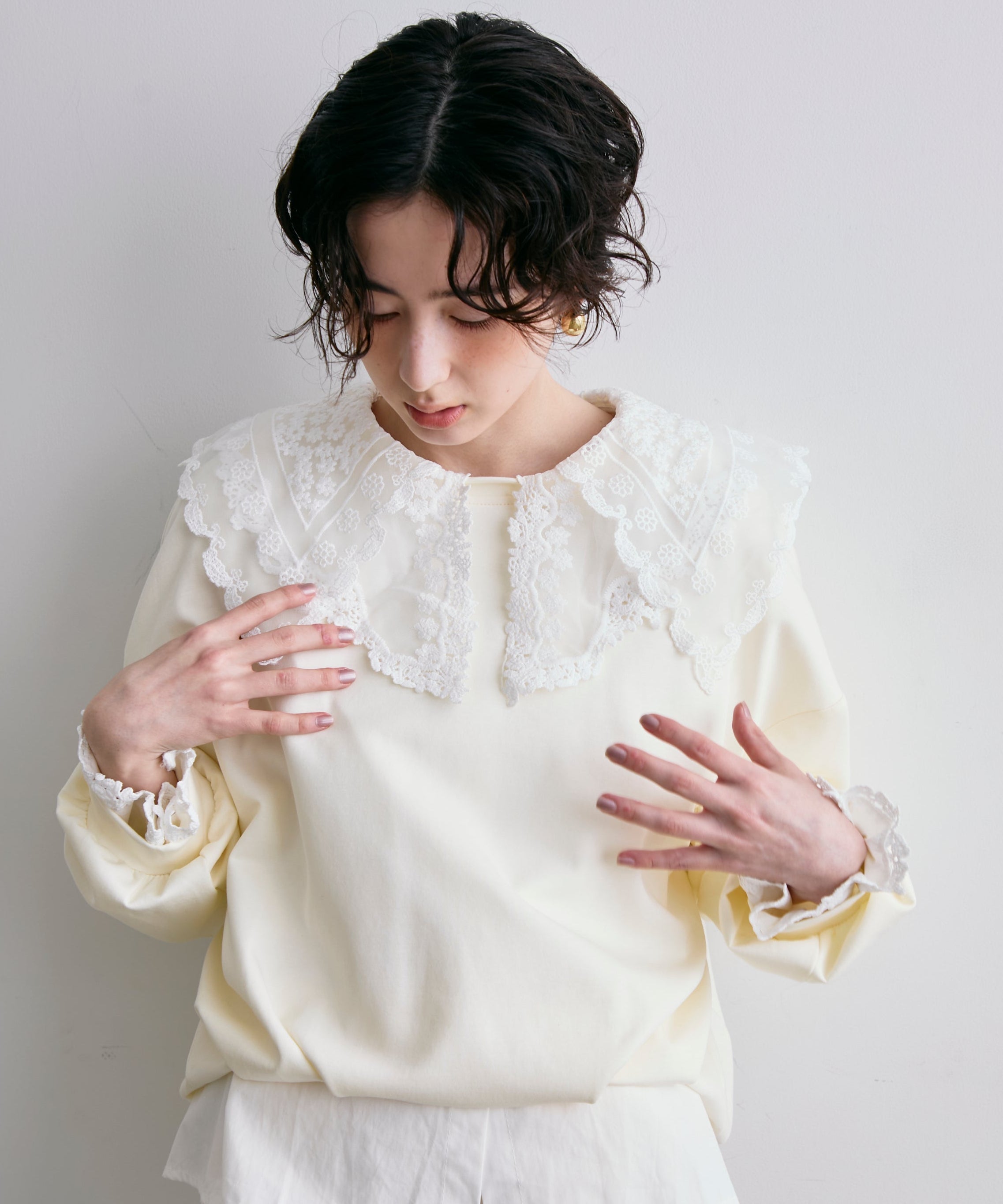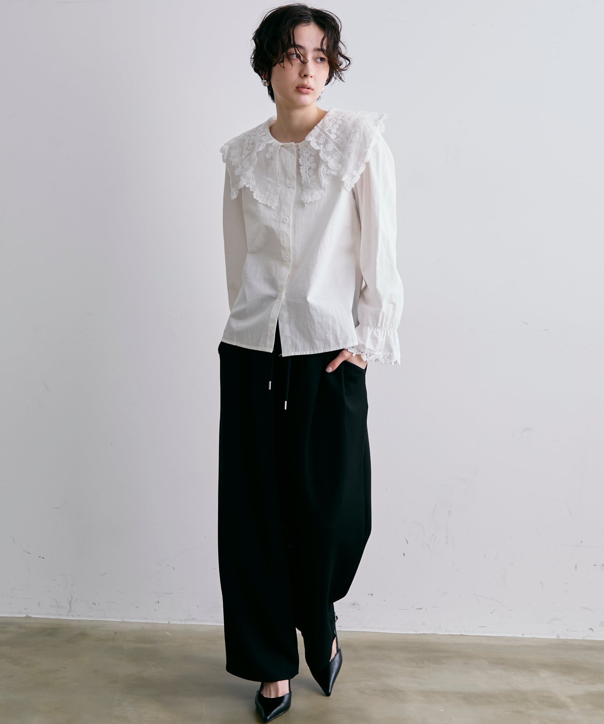 繊細なエンブロイダリー刺繍と存在感のあるビッグカラーが印象的なブラウス。