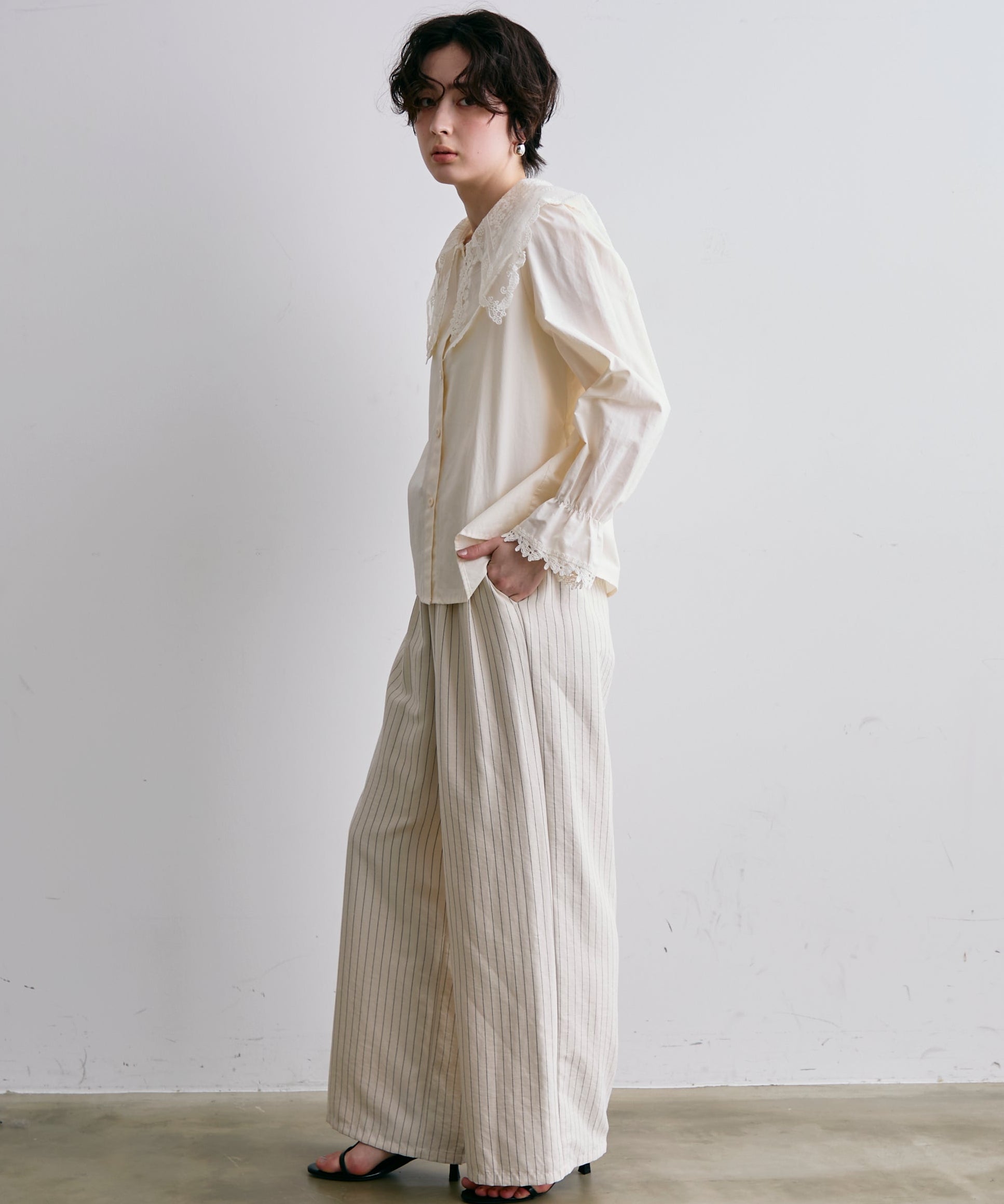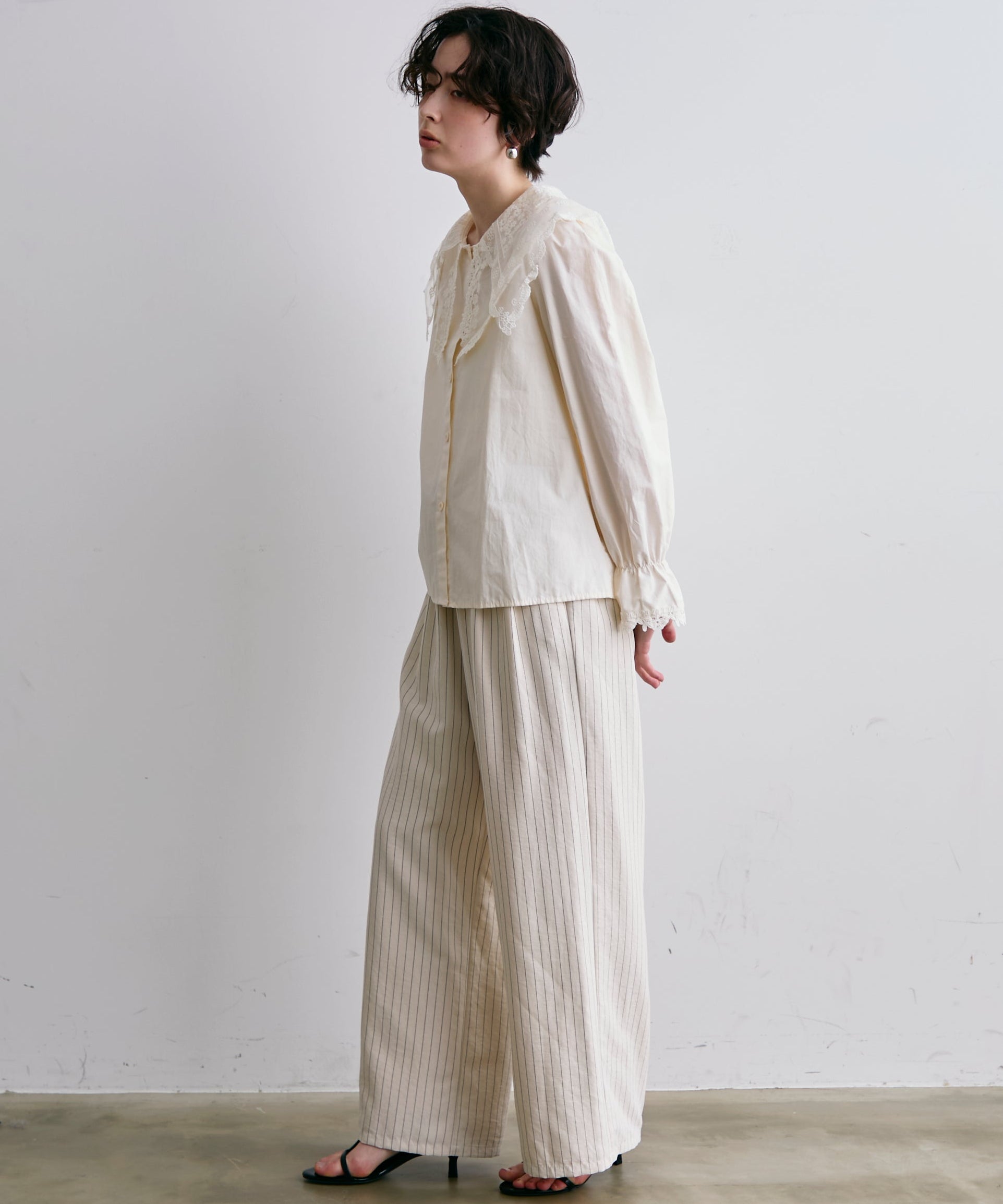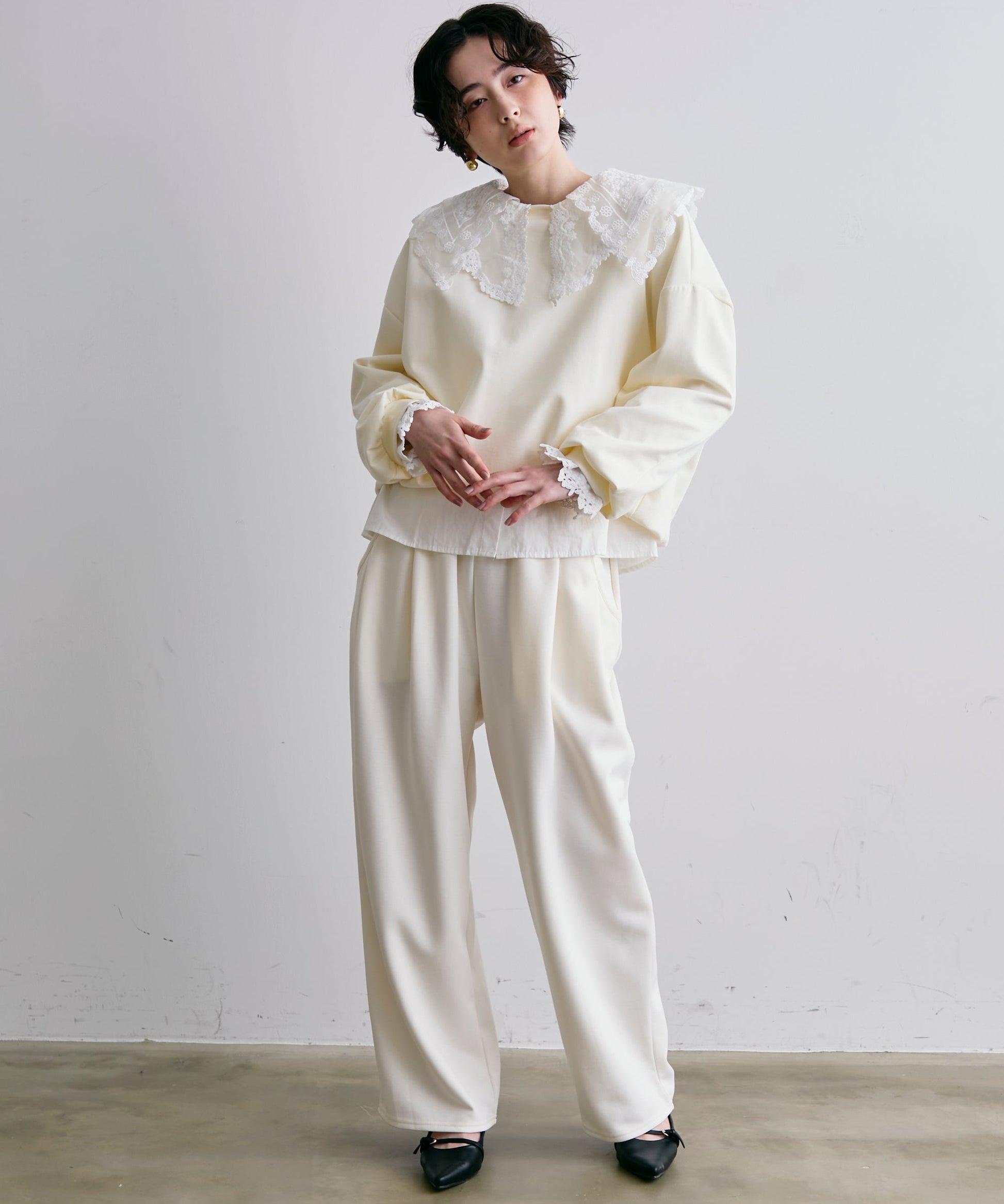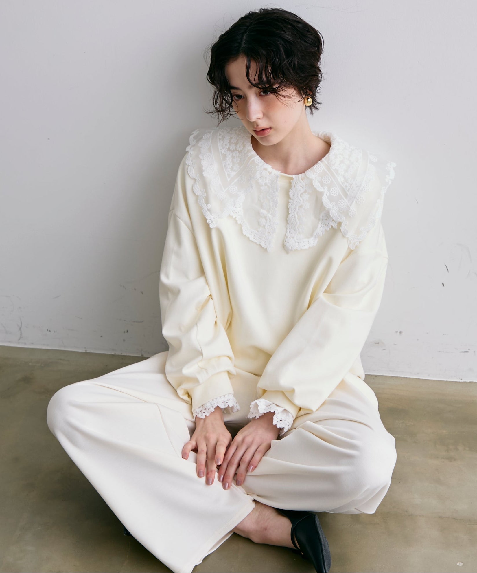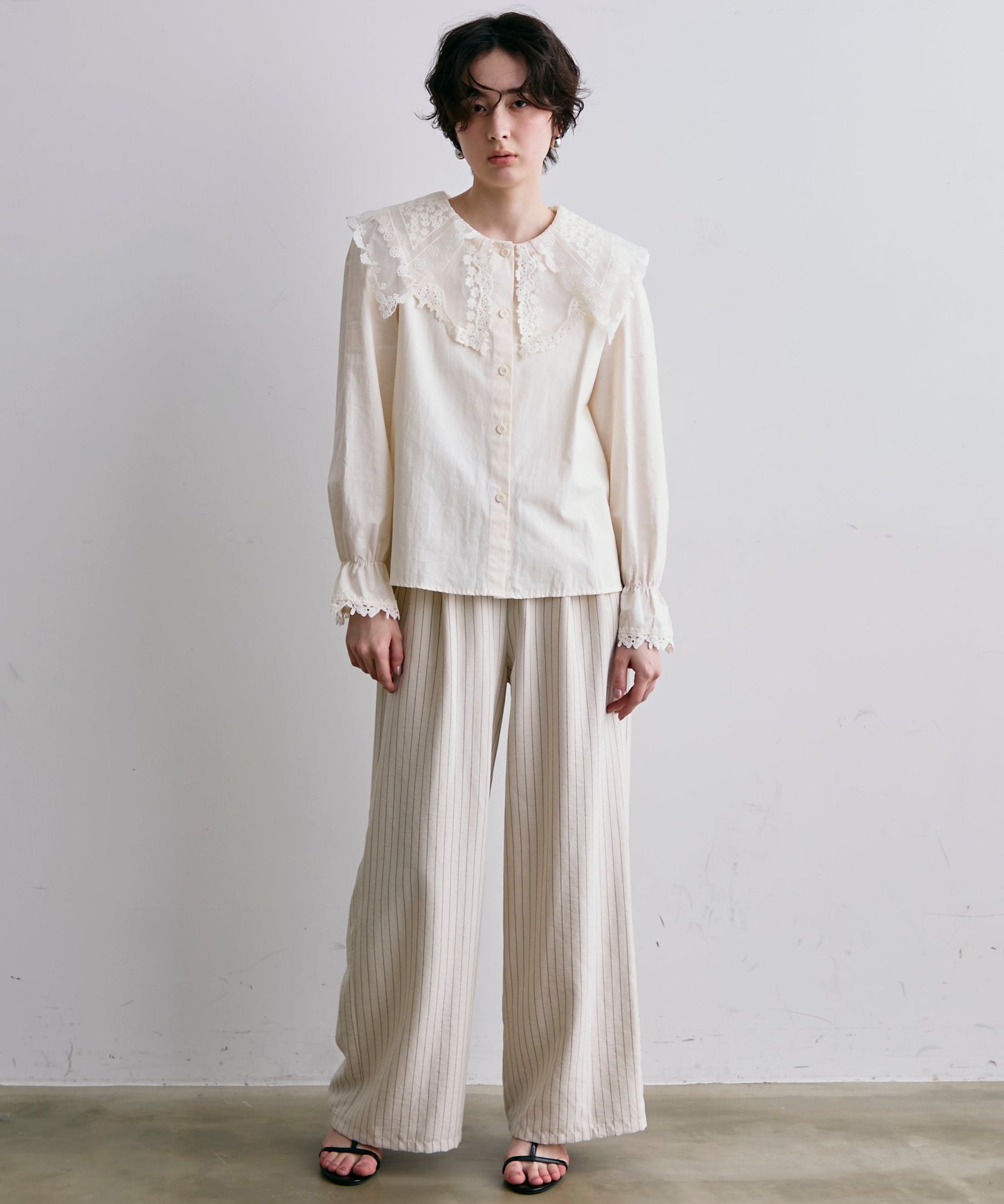繊細なエンブロイダリー刺繍と存在感のあるビッグカラーが印象的なブラウス。