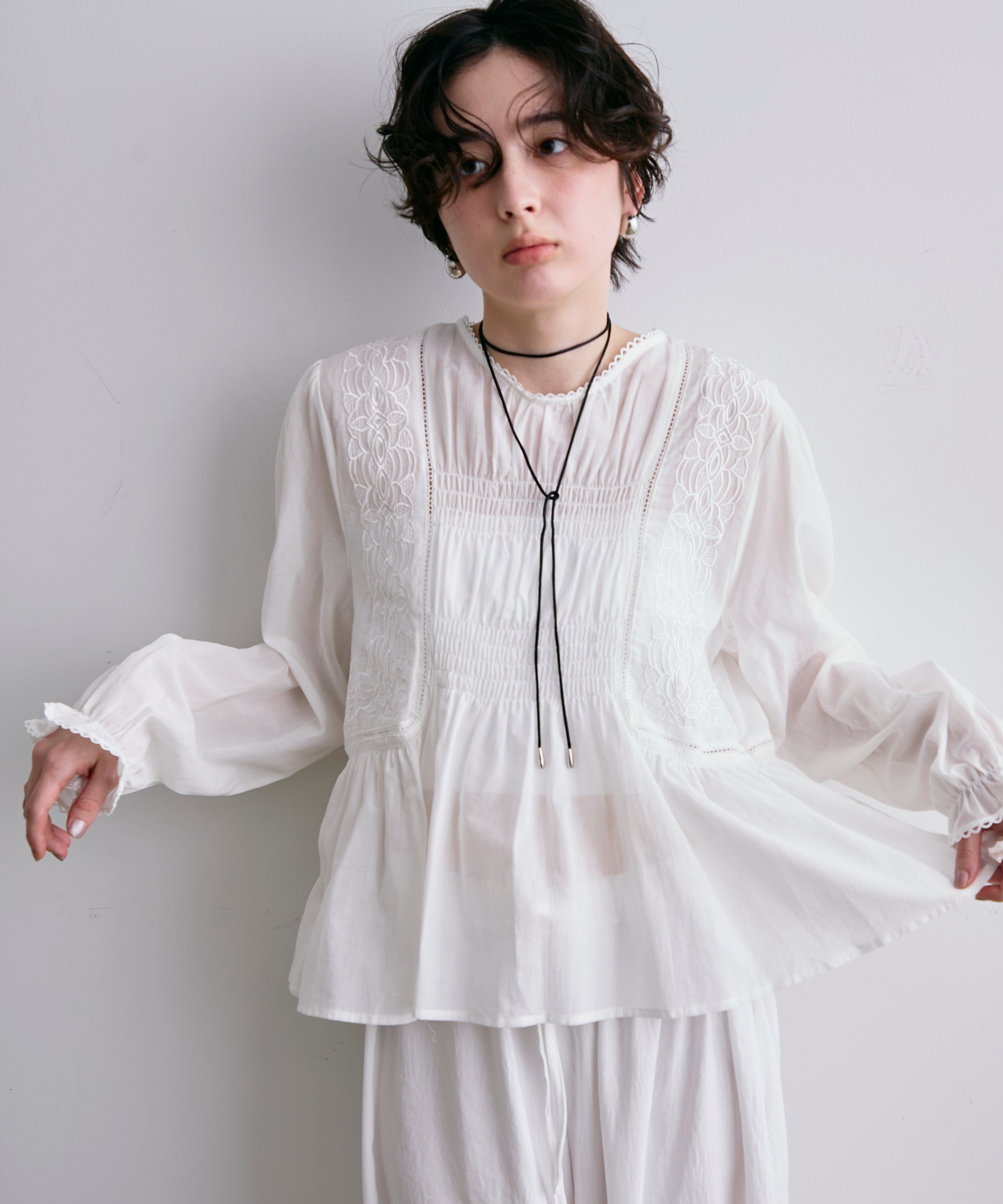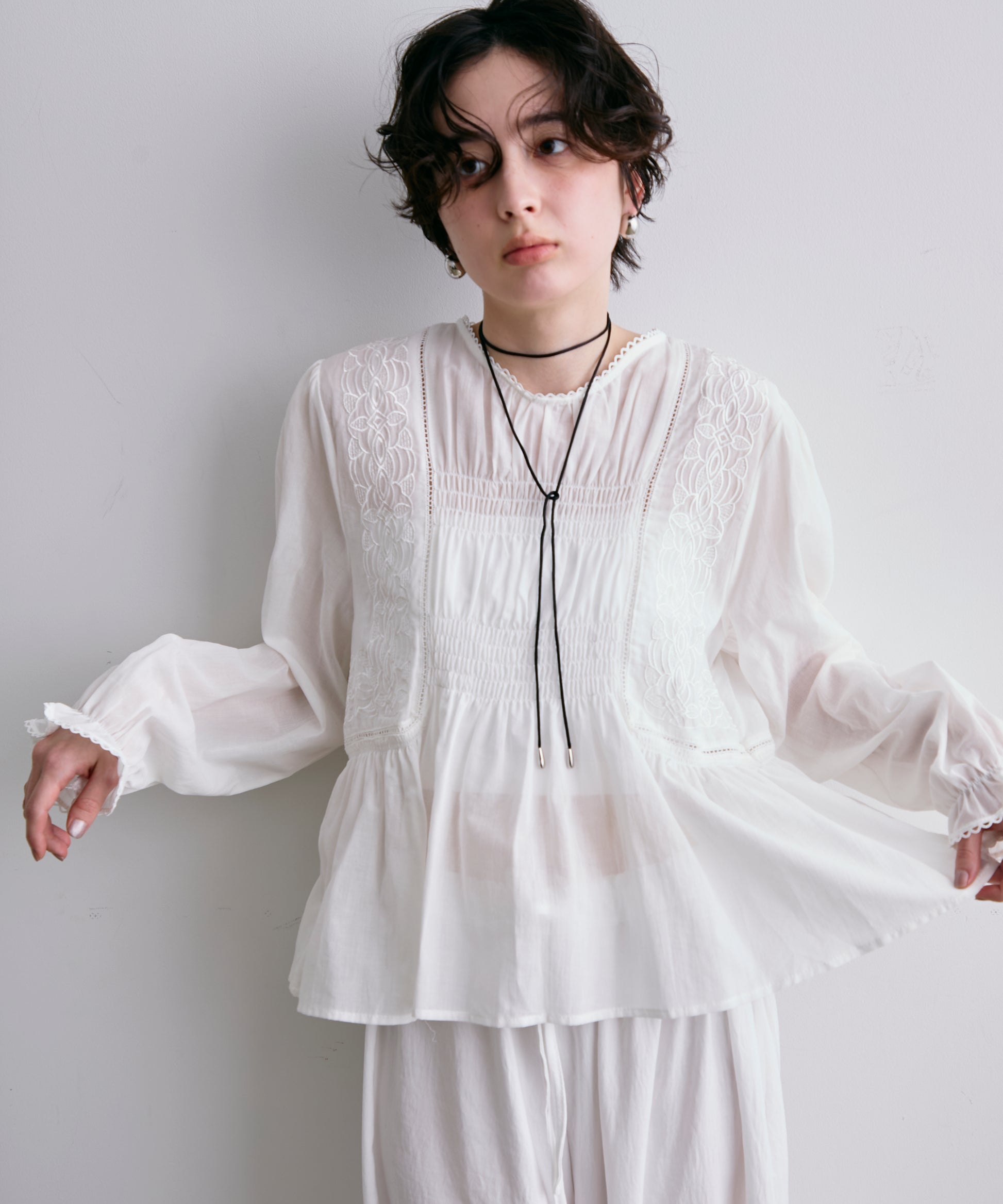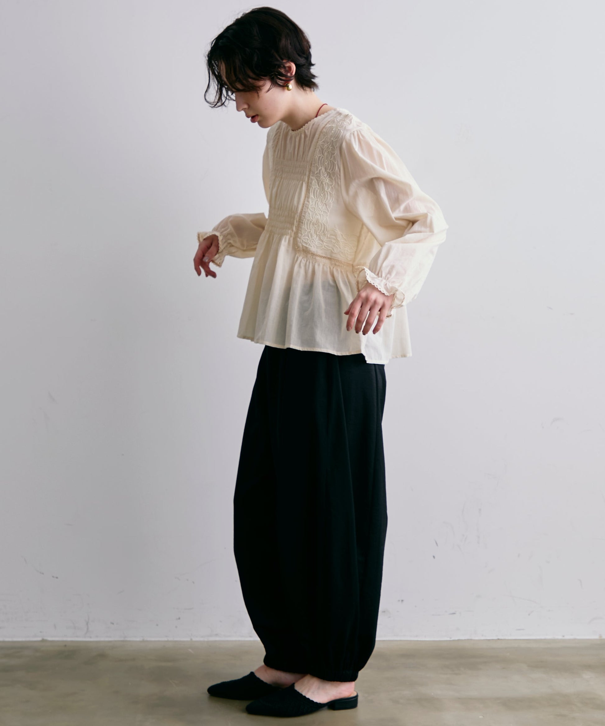 フォークロア調の刺繍が目を惹くペプラムブラウス。