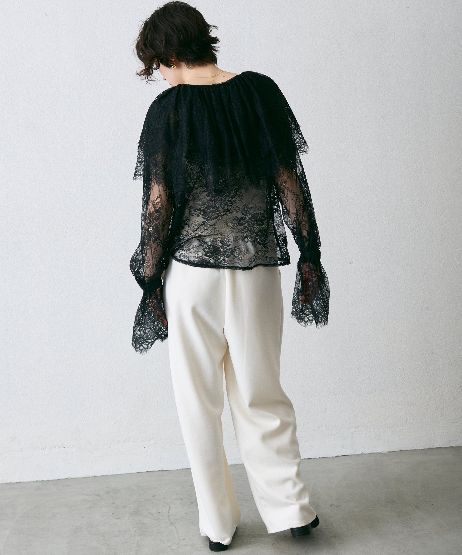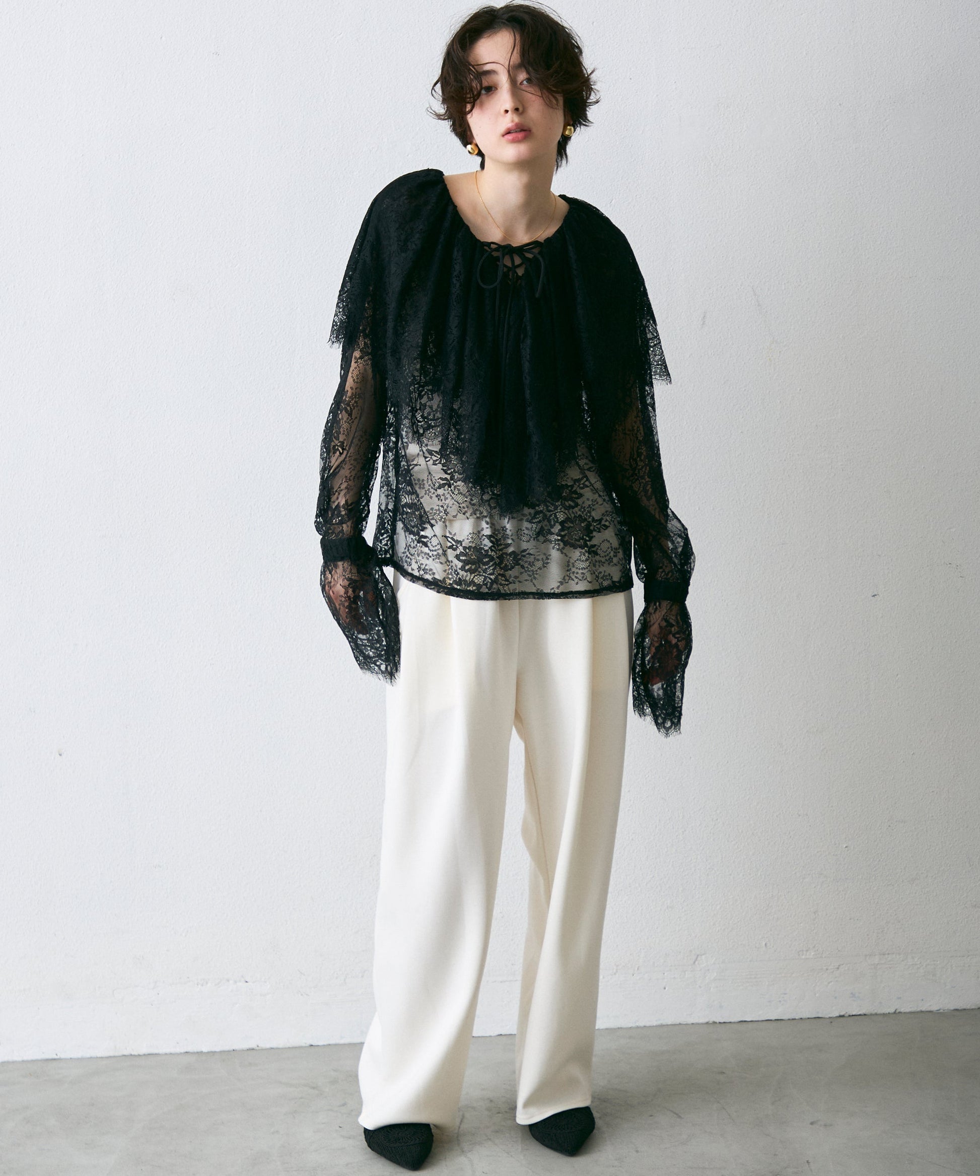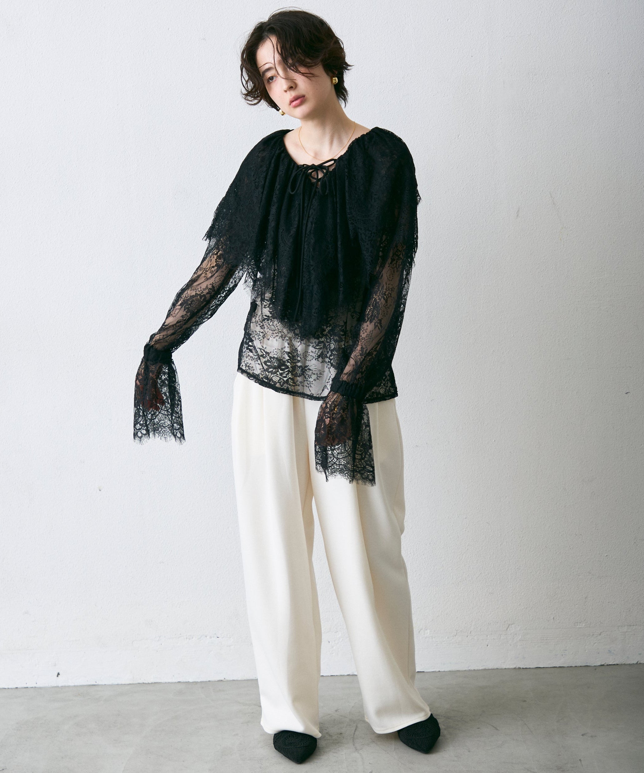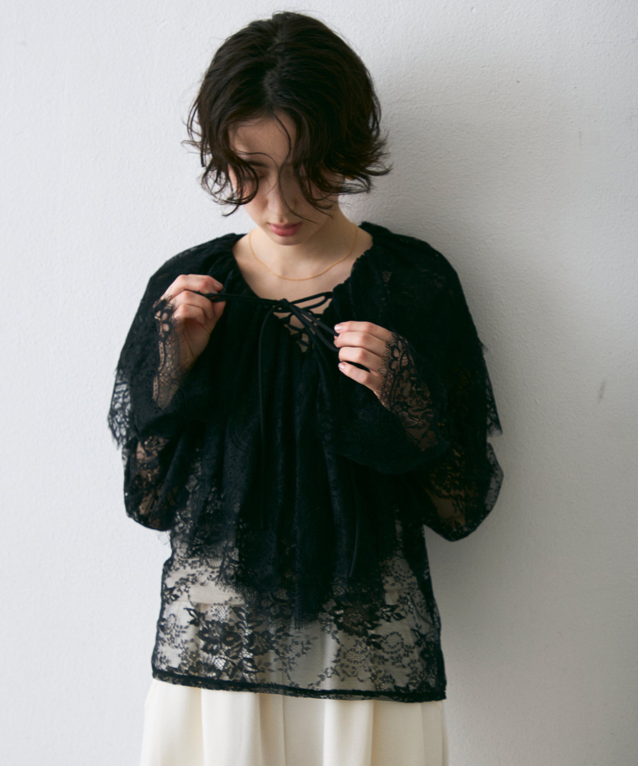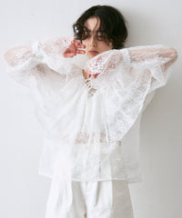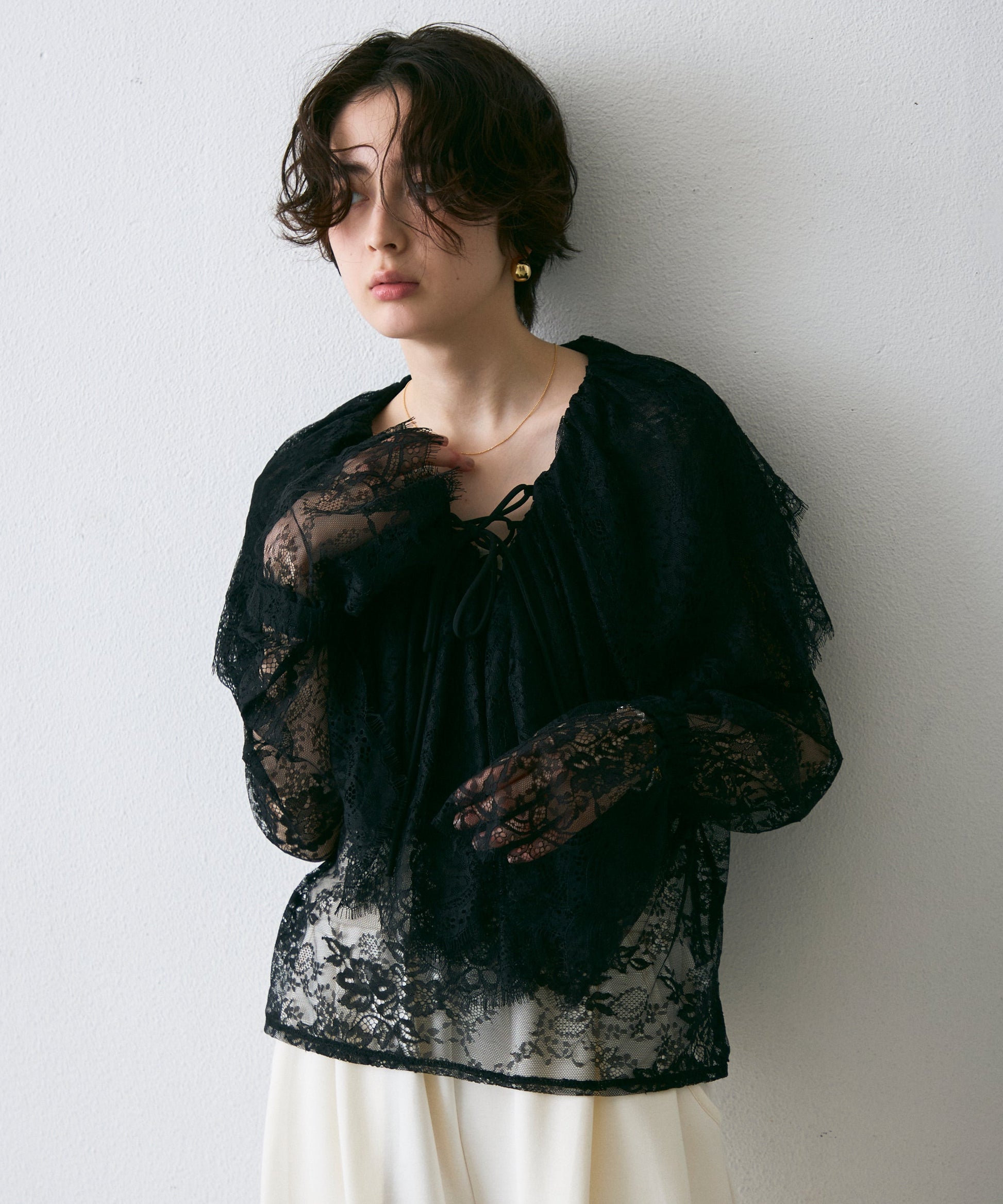 顔まわりを華やかに見せるレースのビッグカラーが主役のブラウス。