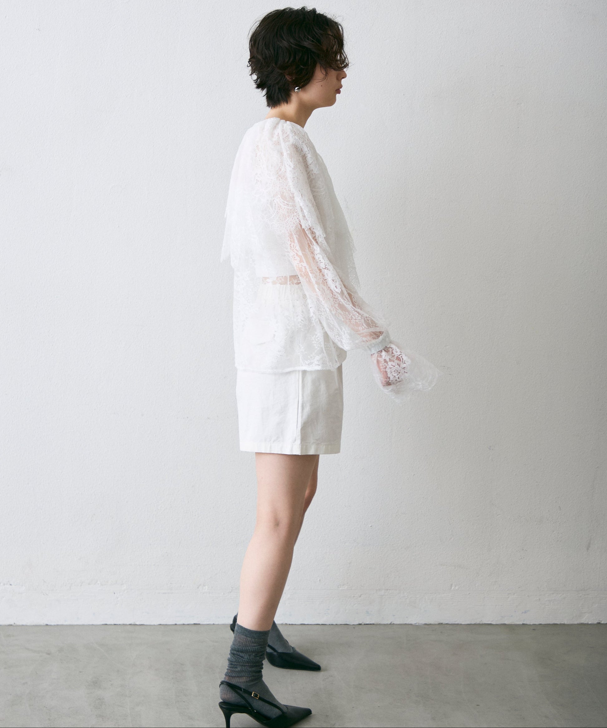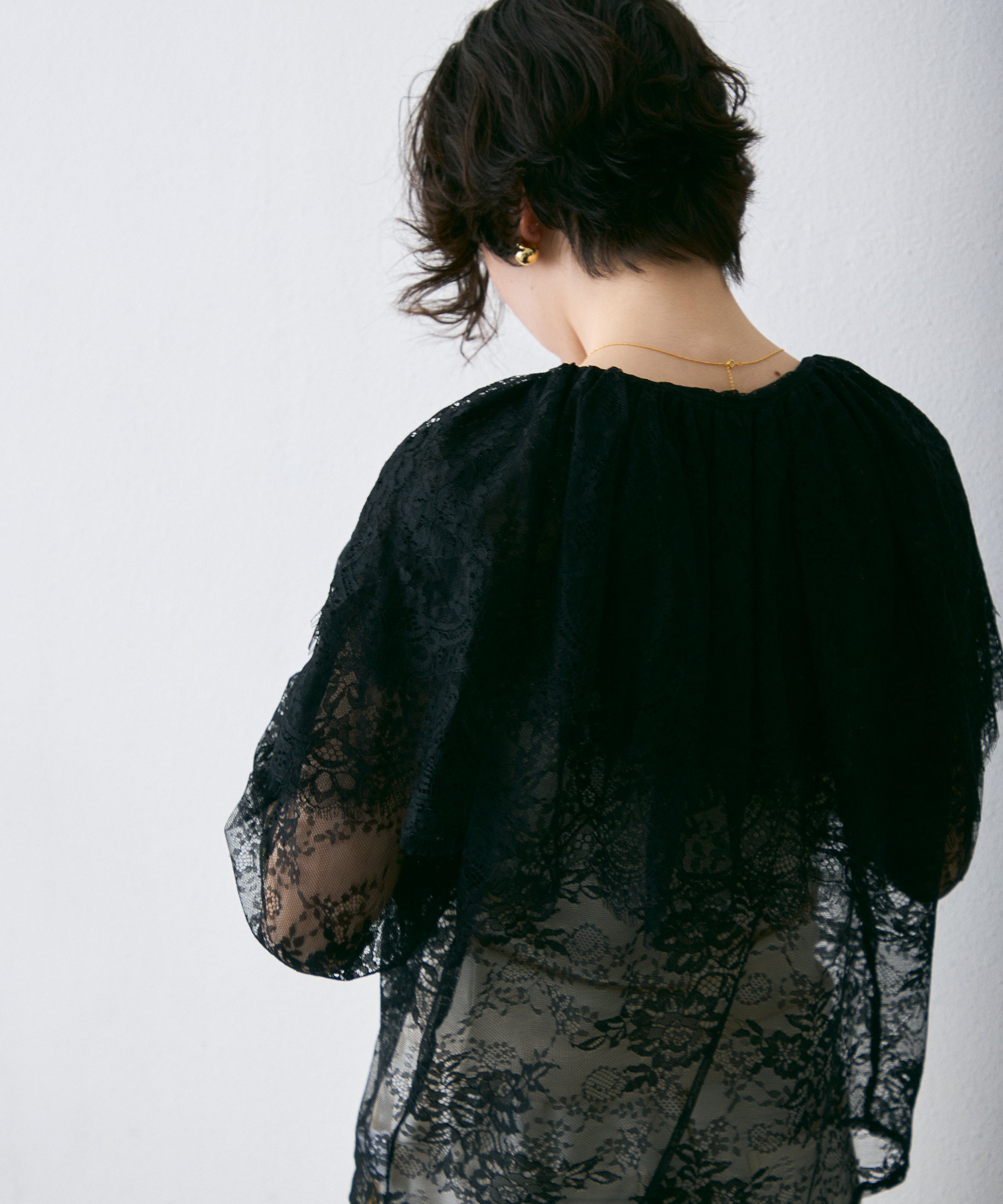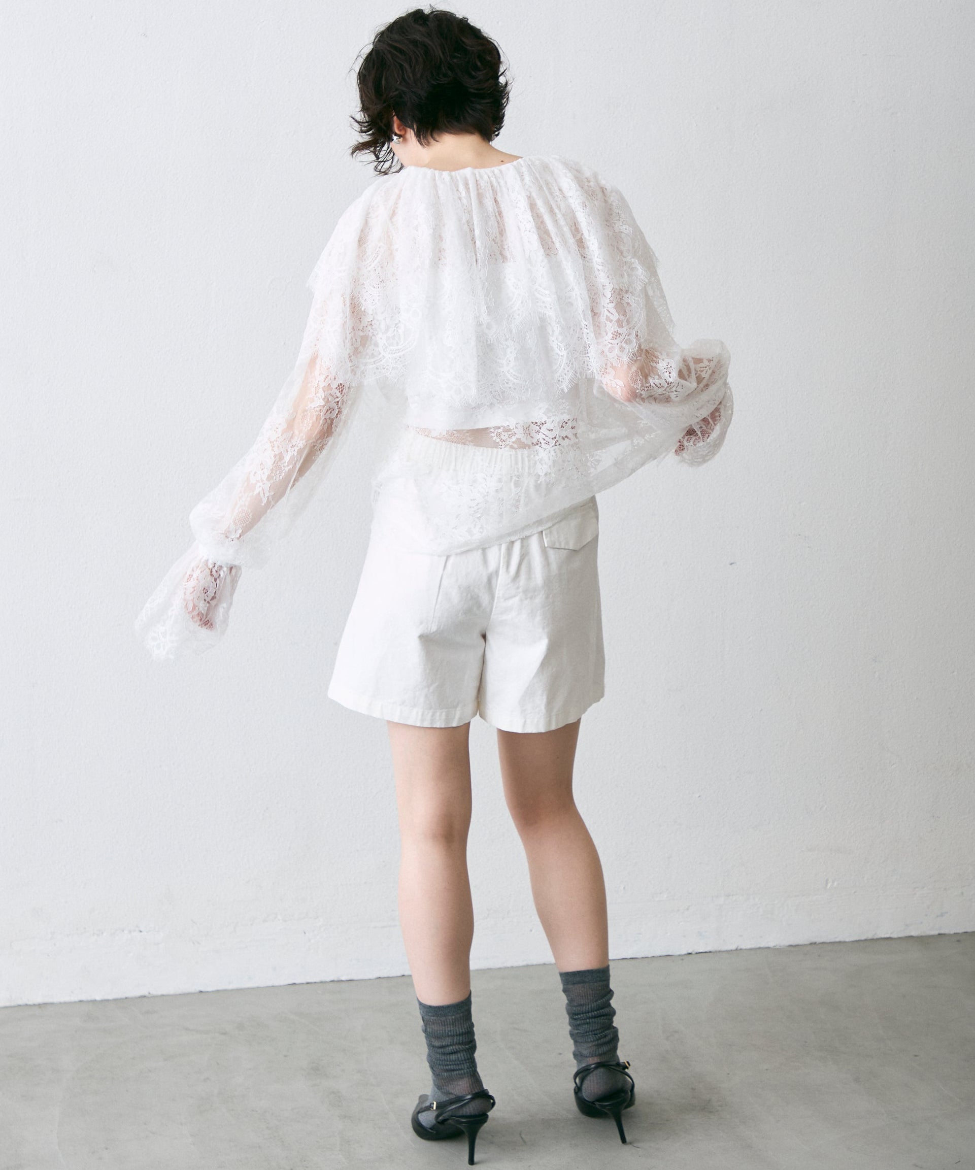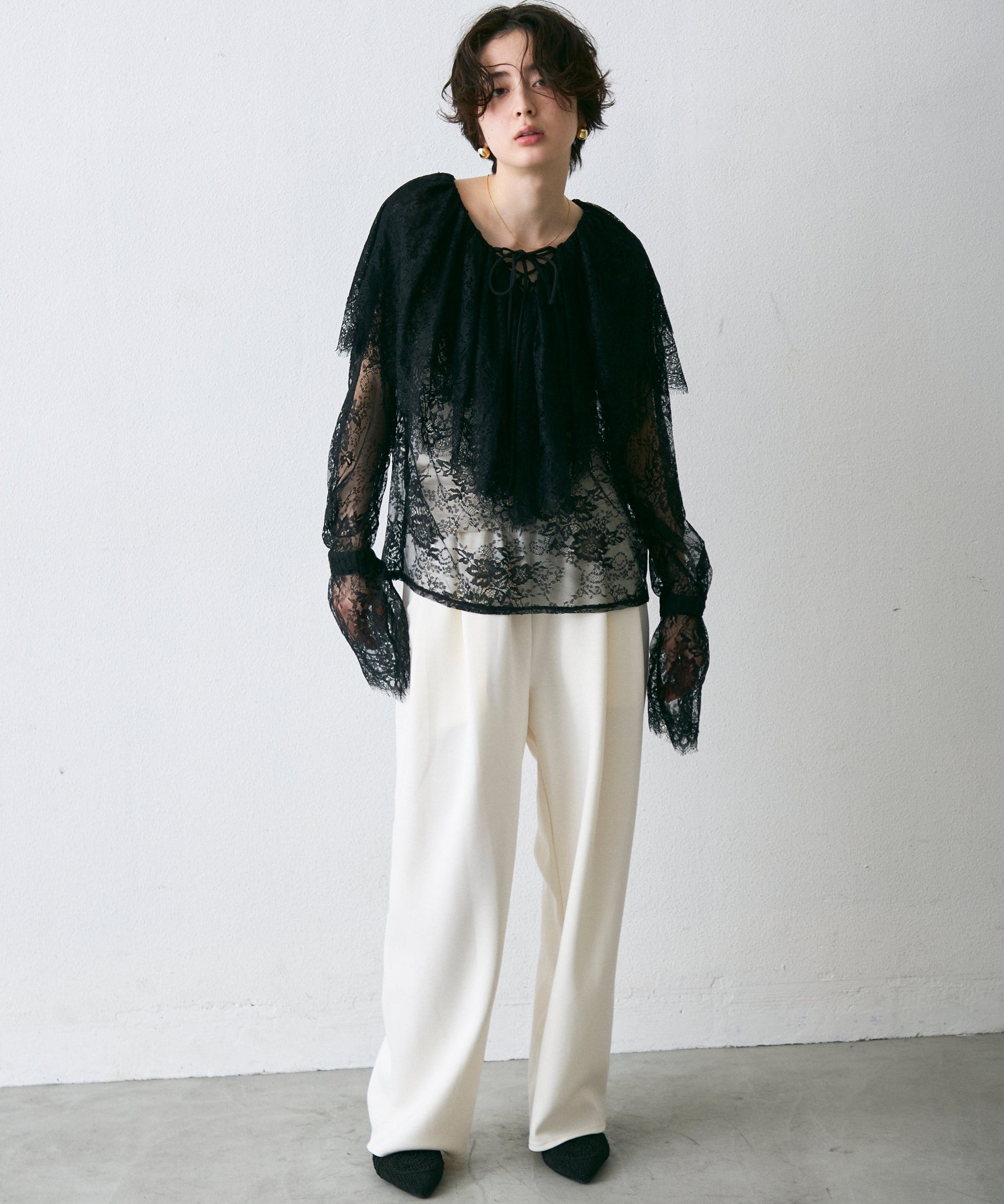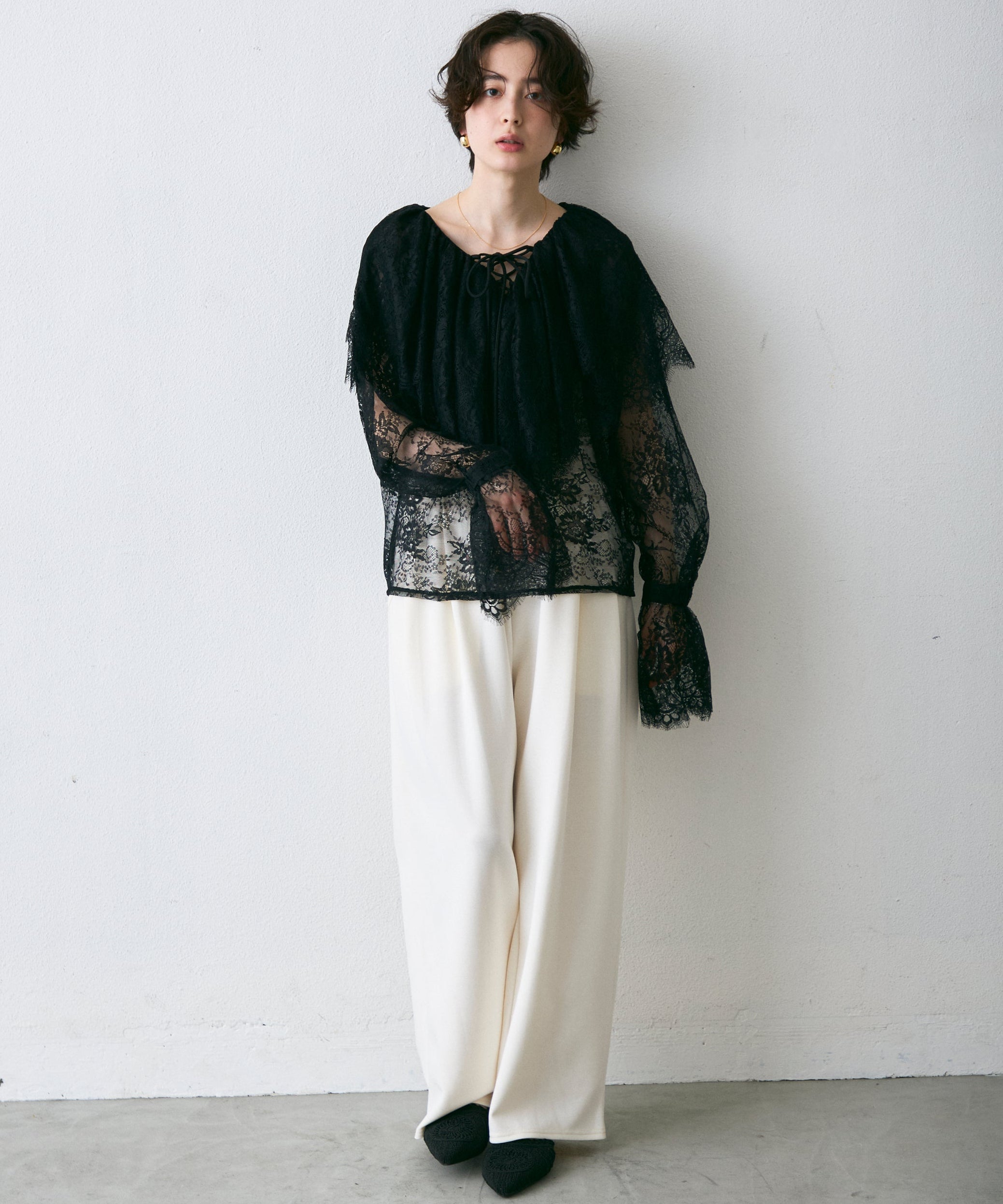 顔まわりを華やかに見せるレースのビッグカラーが主役のブラウス。