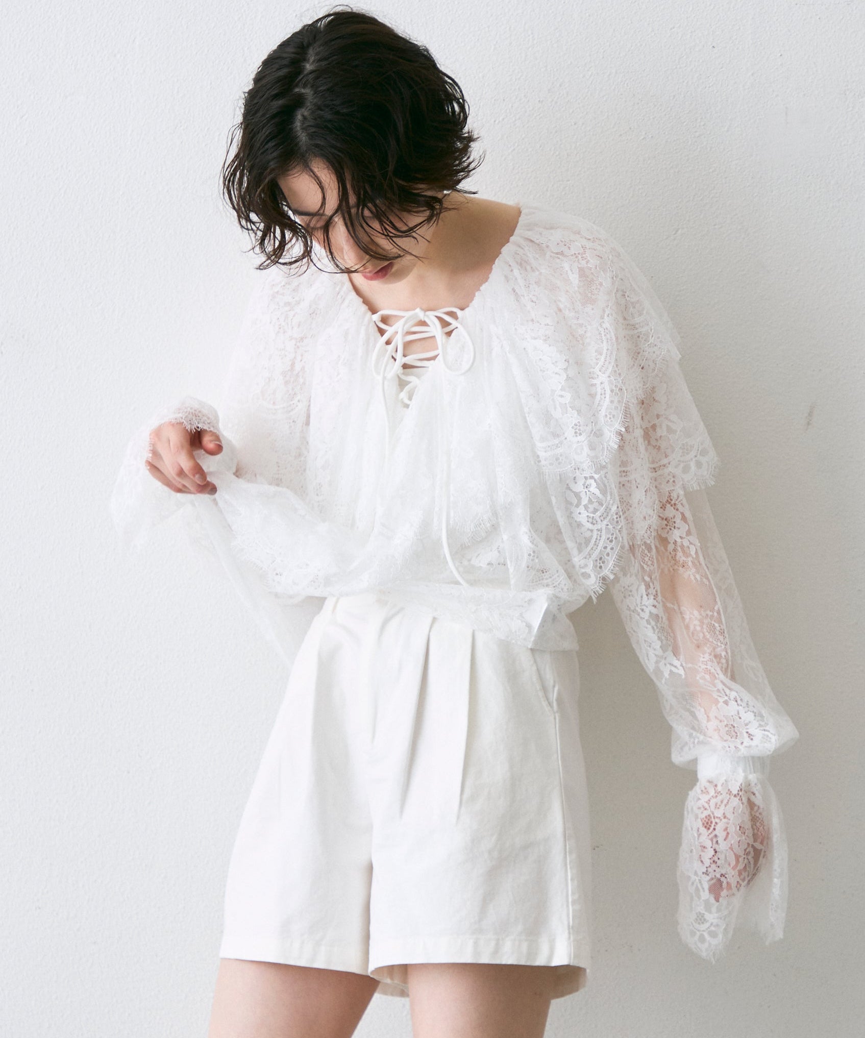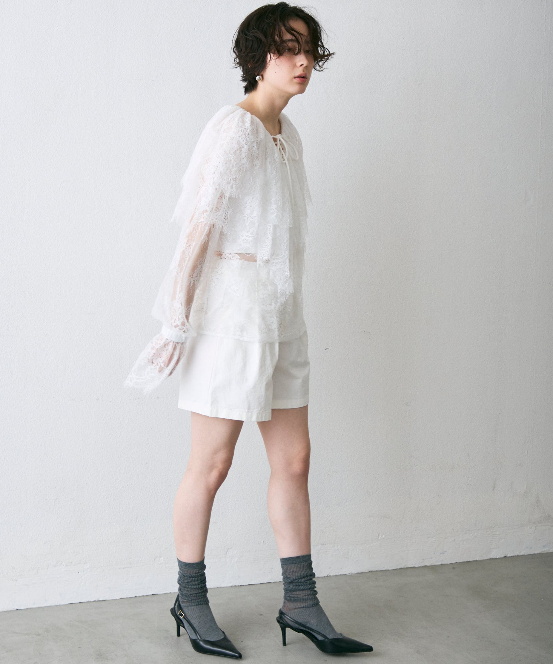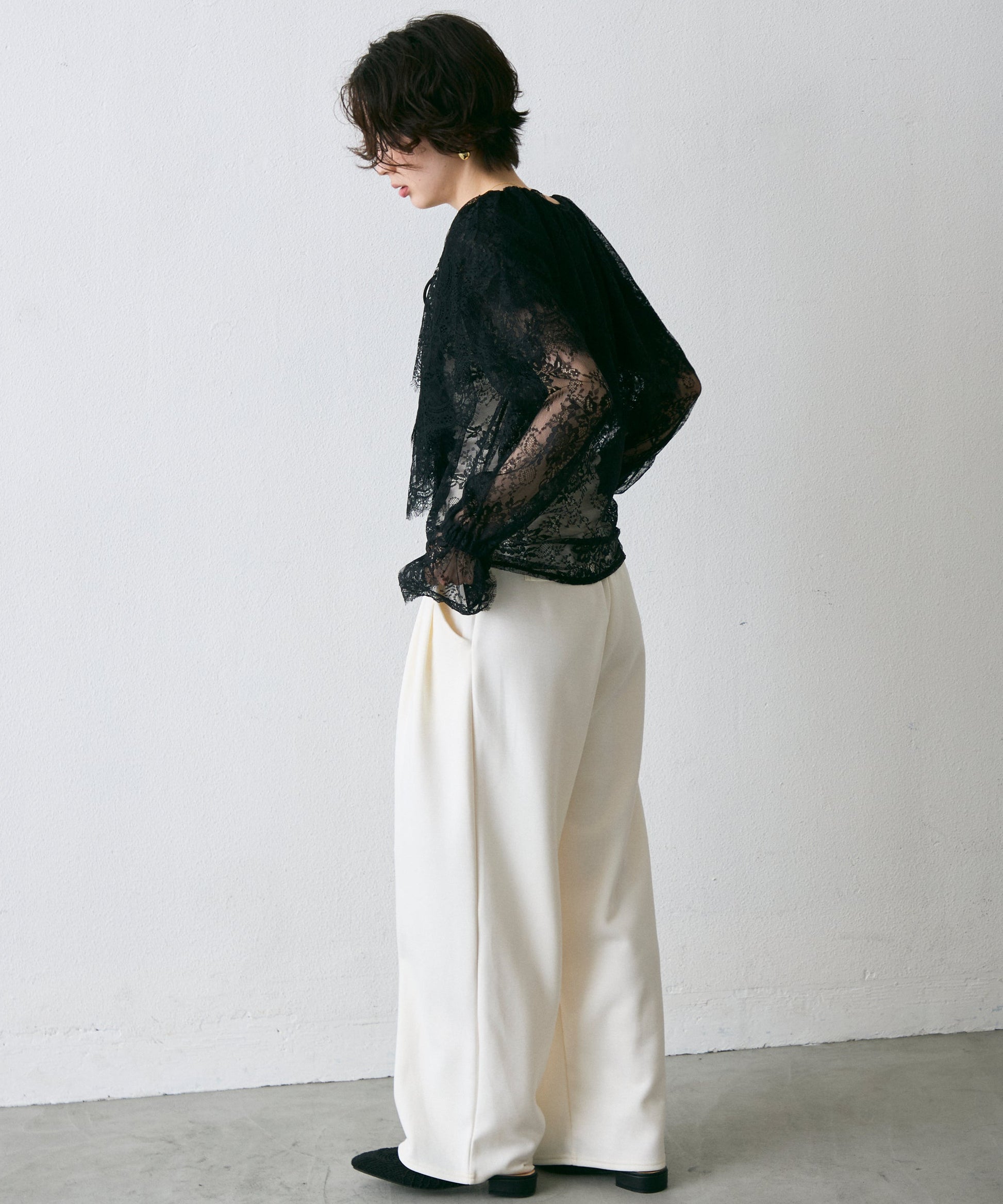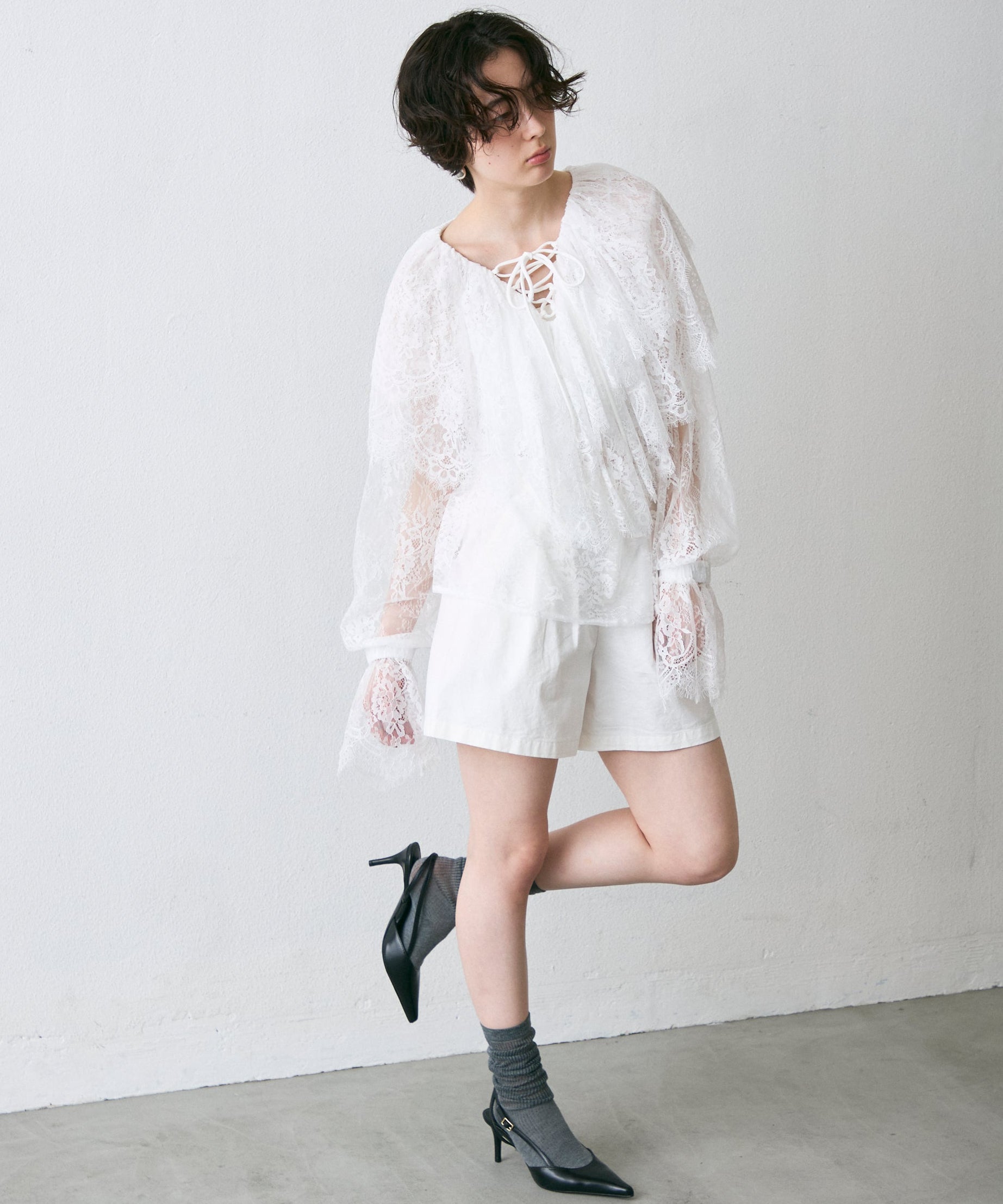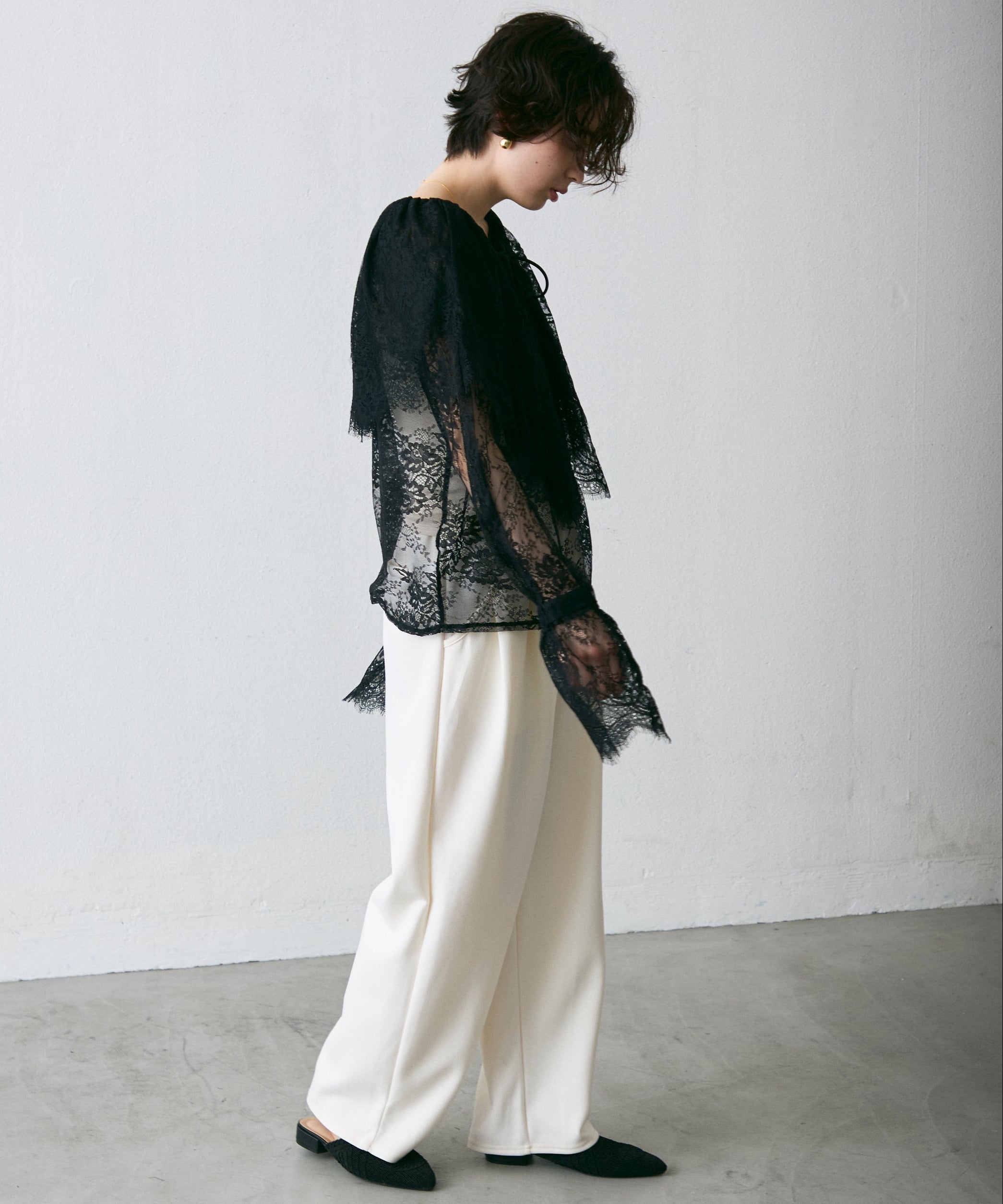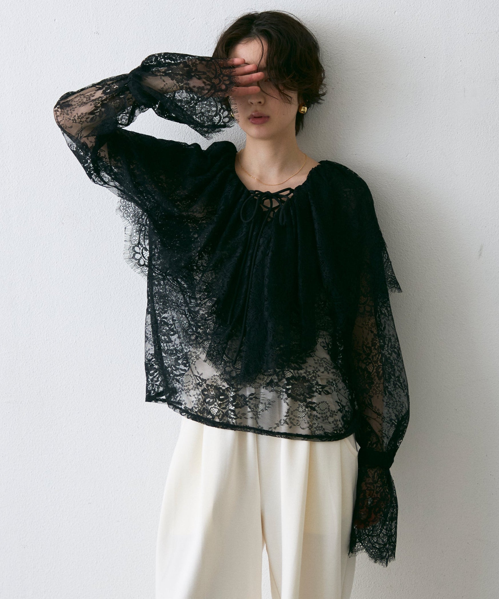顔まわりを華やかに見せるレースのビッグカラーが主役のブラウス。