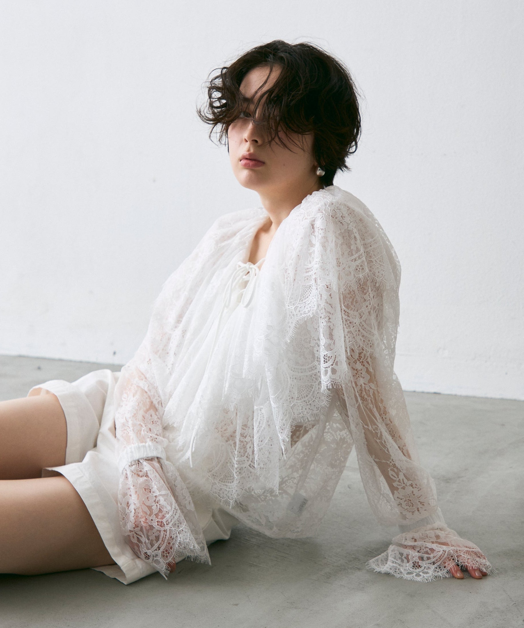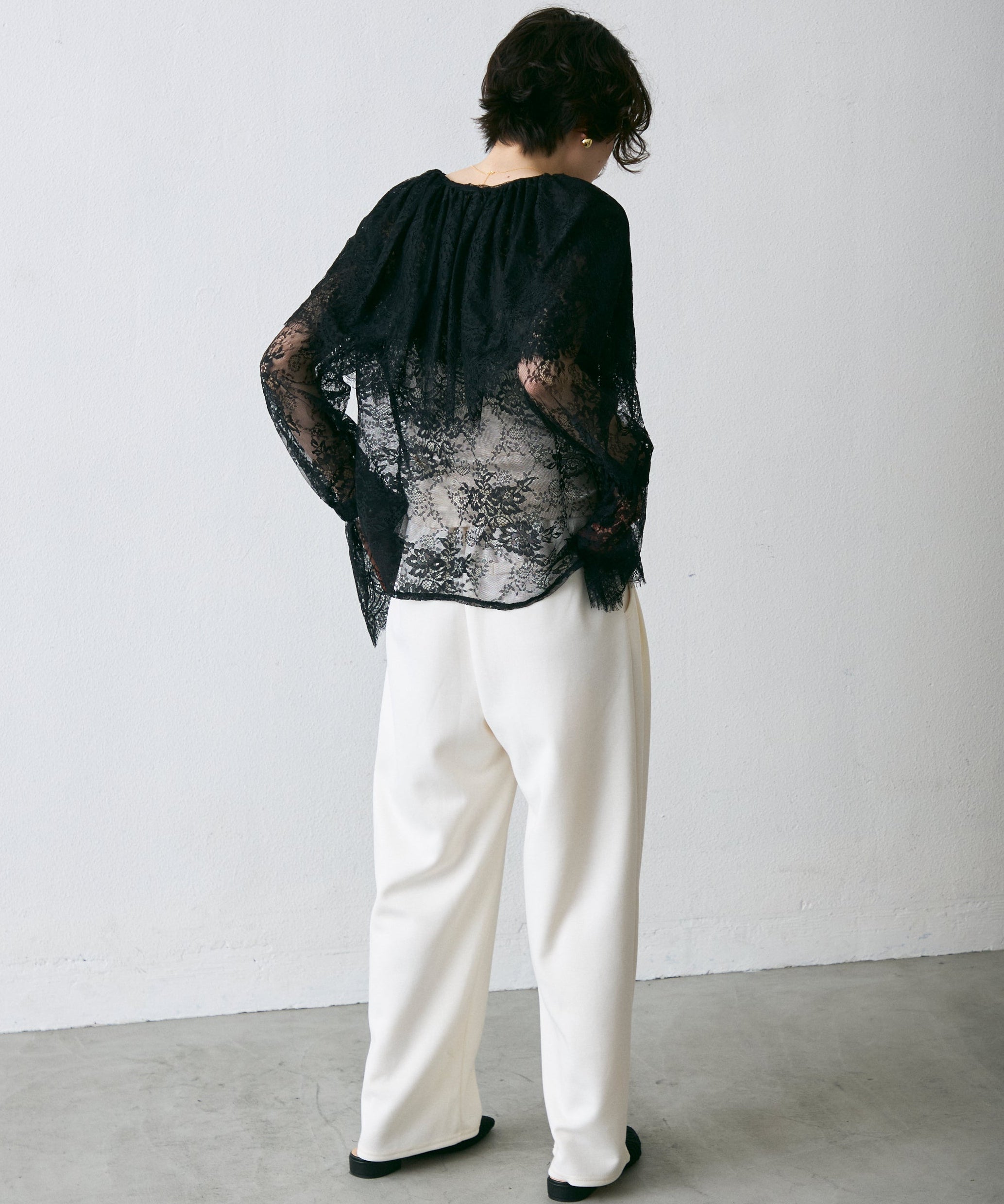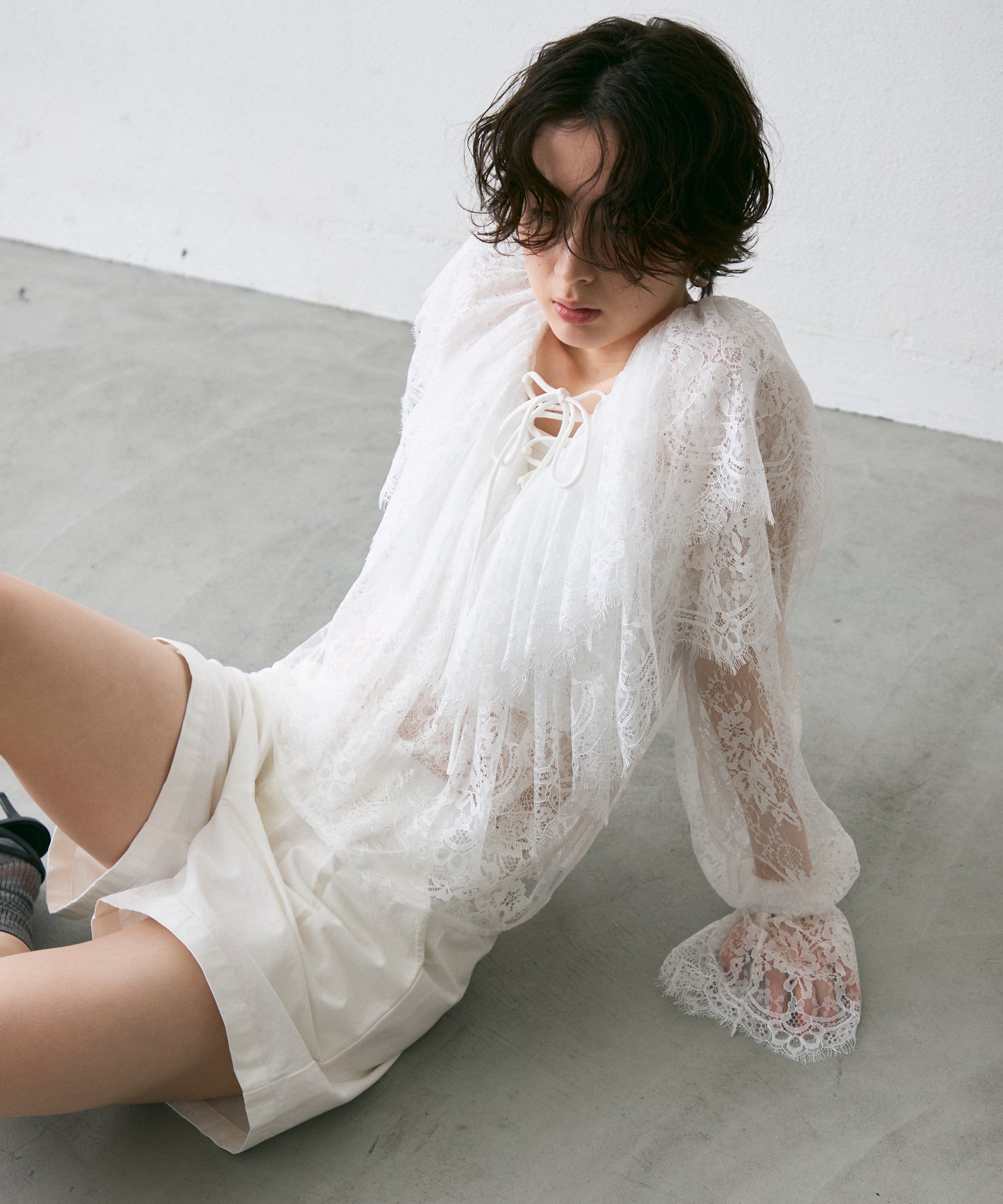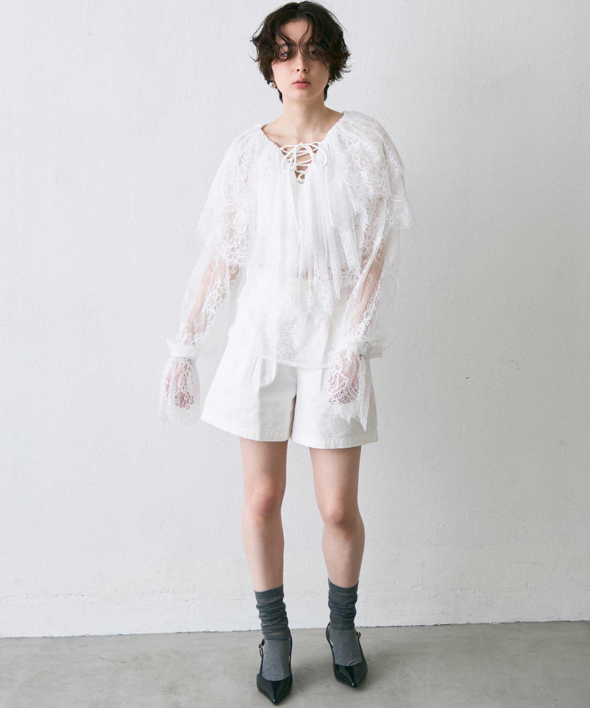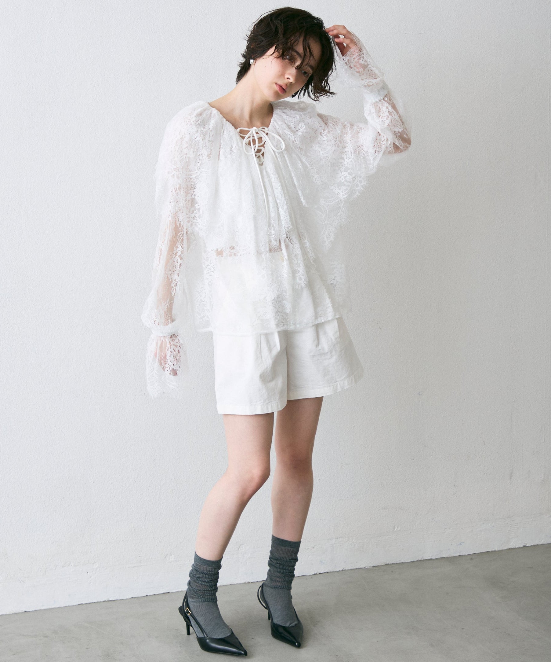 顔まわりを華やかに見せるレースのビッグカラーが主役のブラウス。