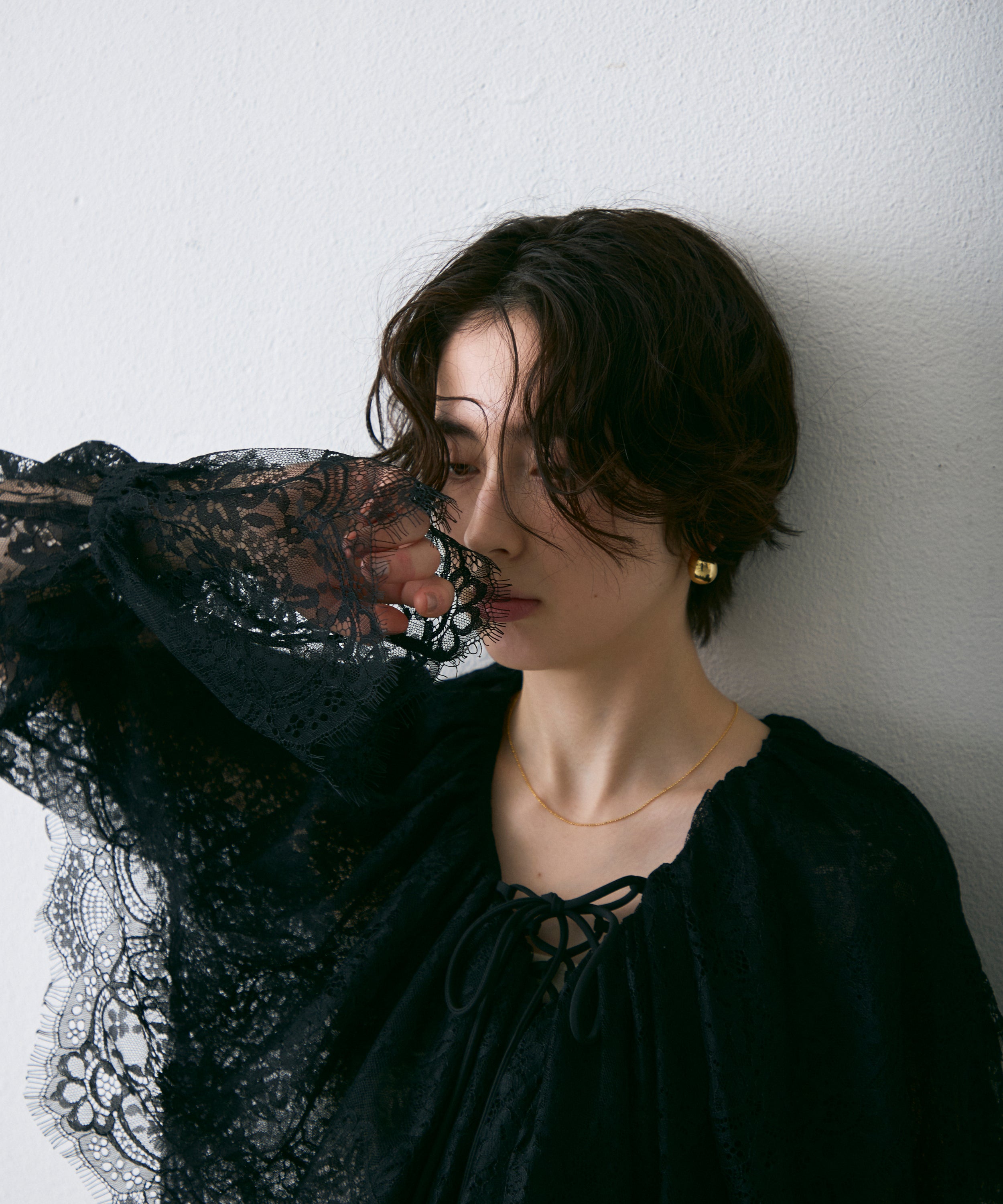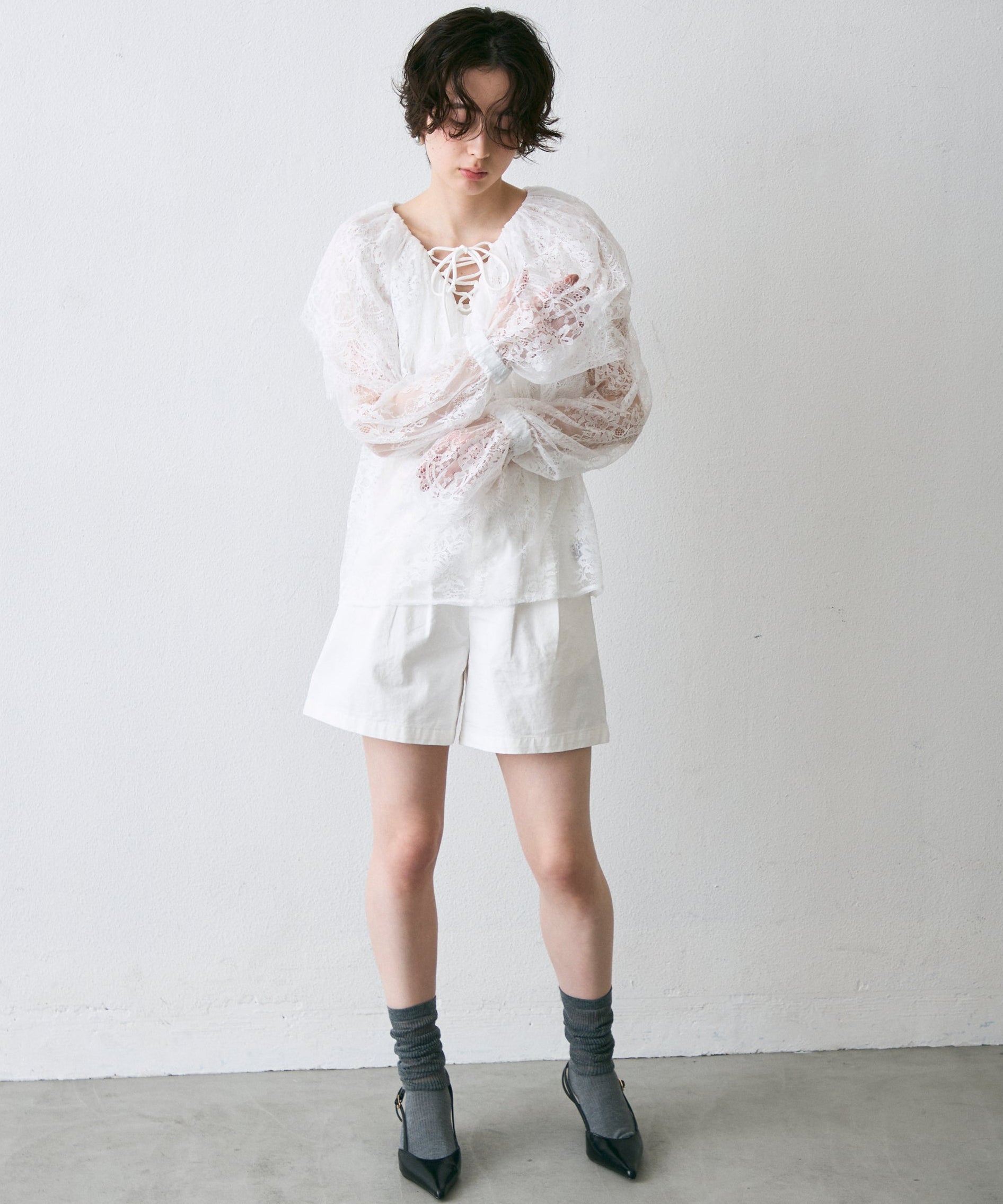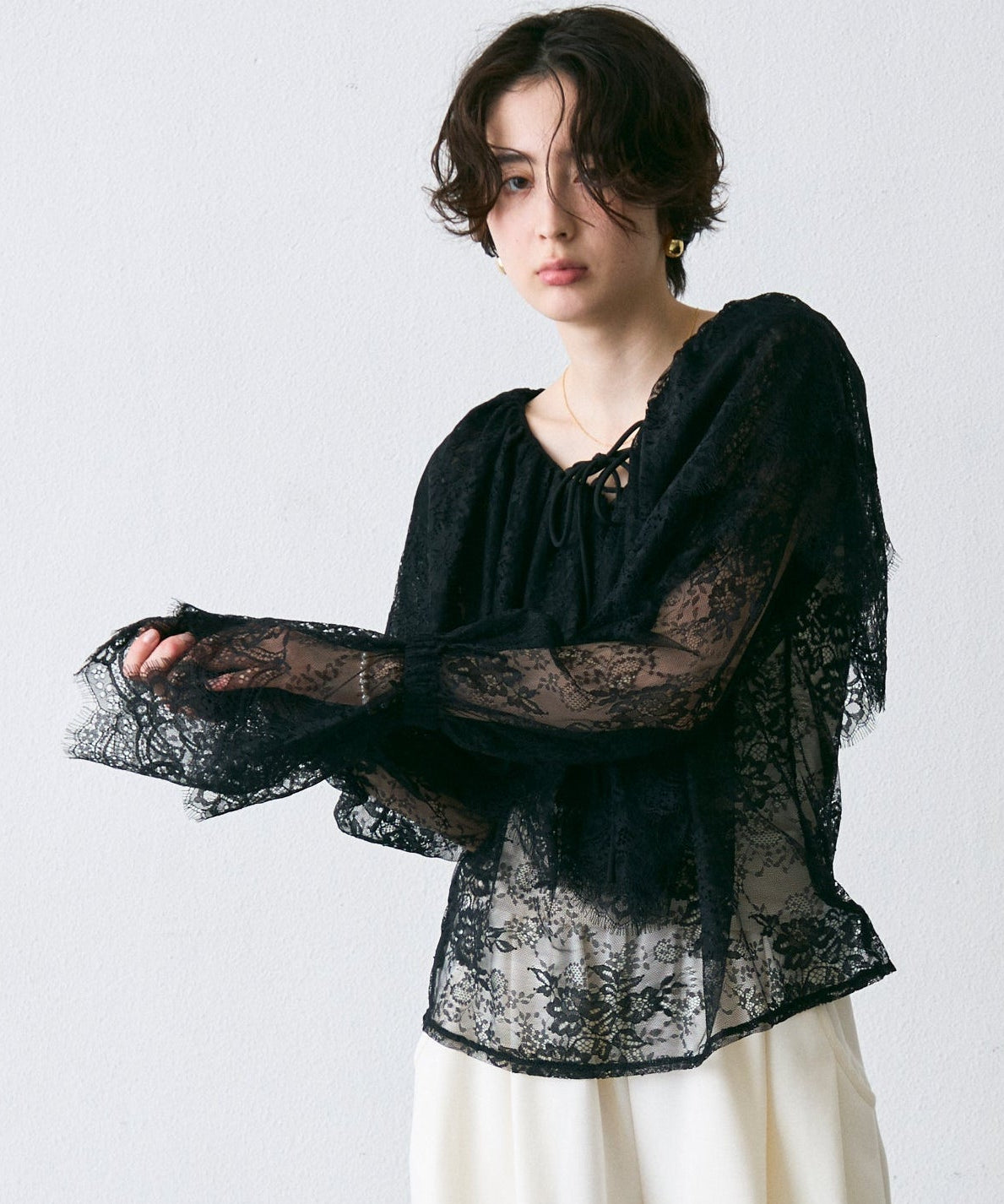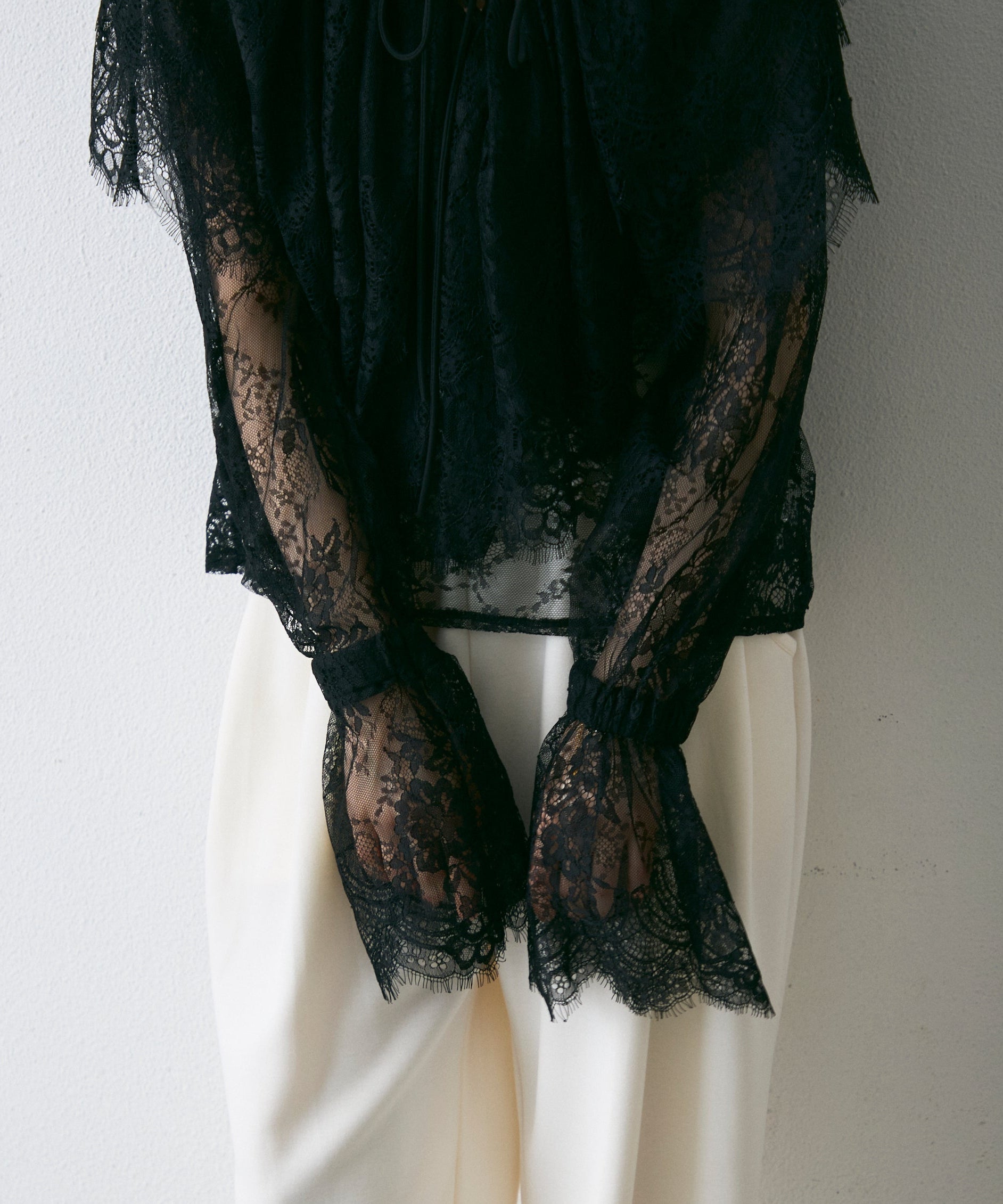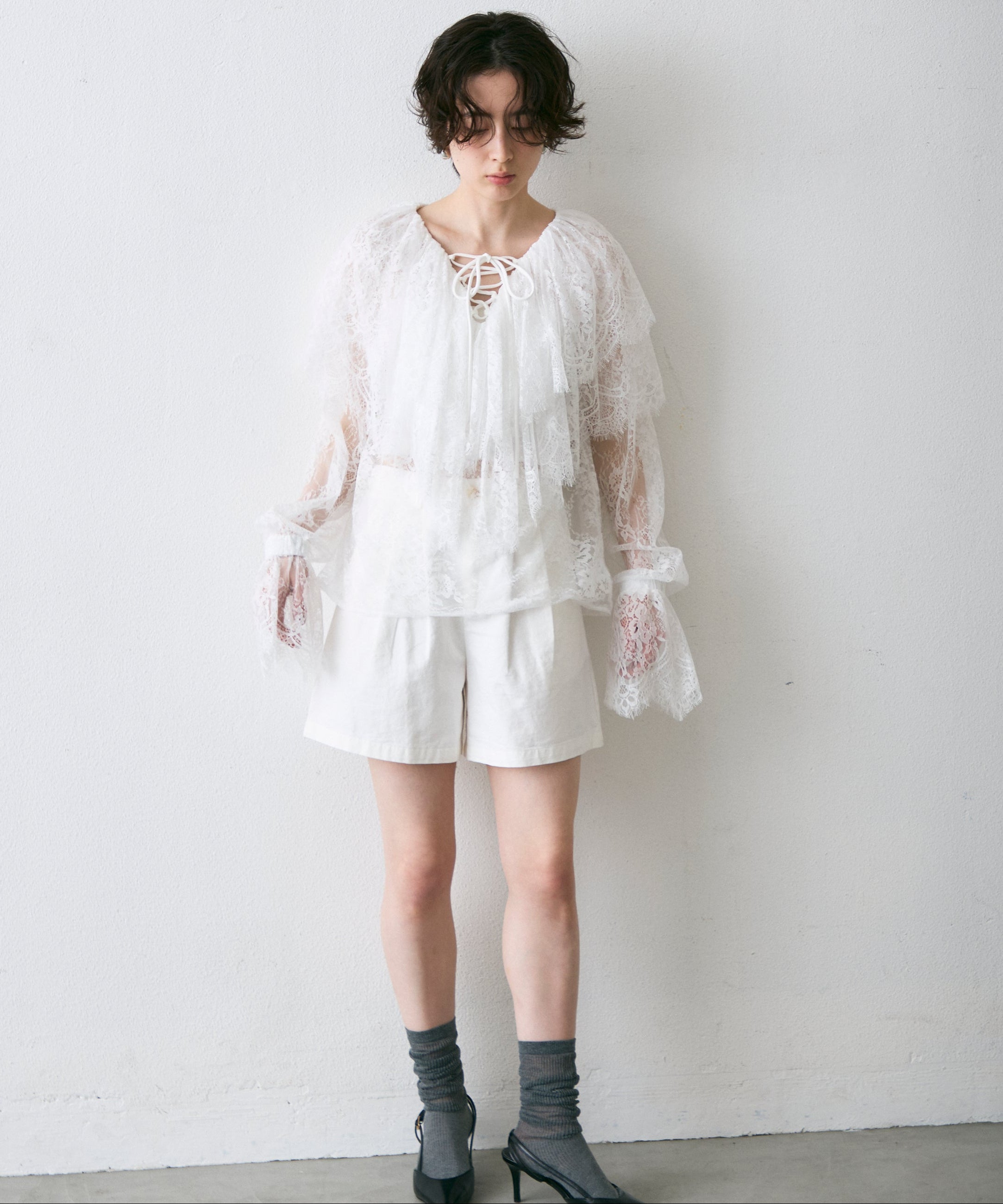 顔まわりを華やかに見せるレースのビッグカラーが主役のブラウス。