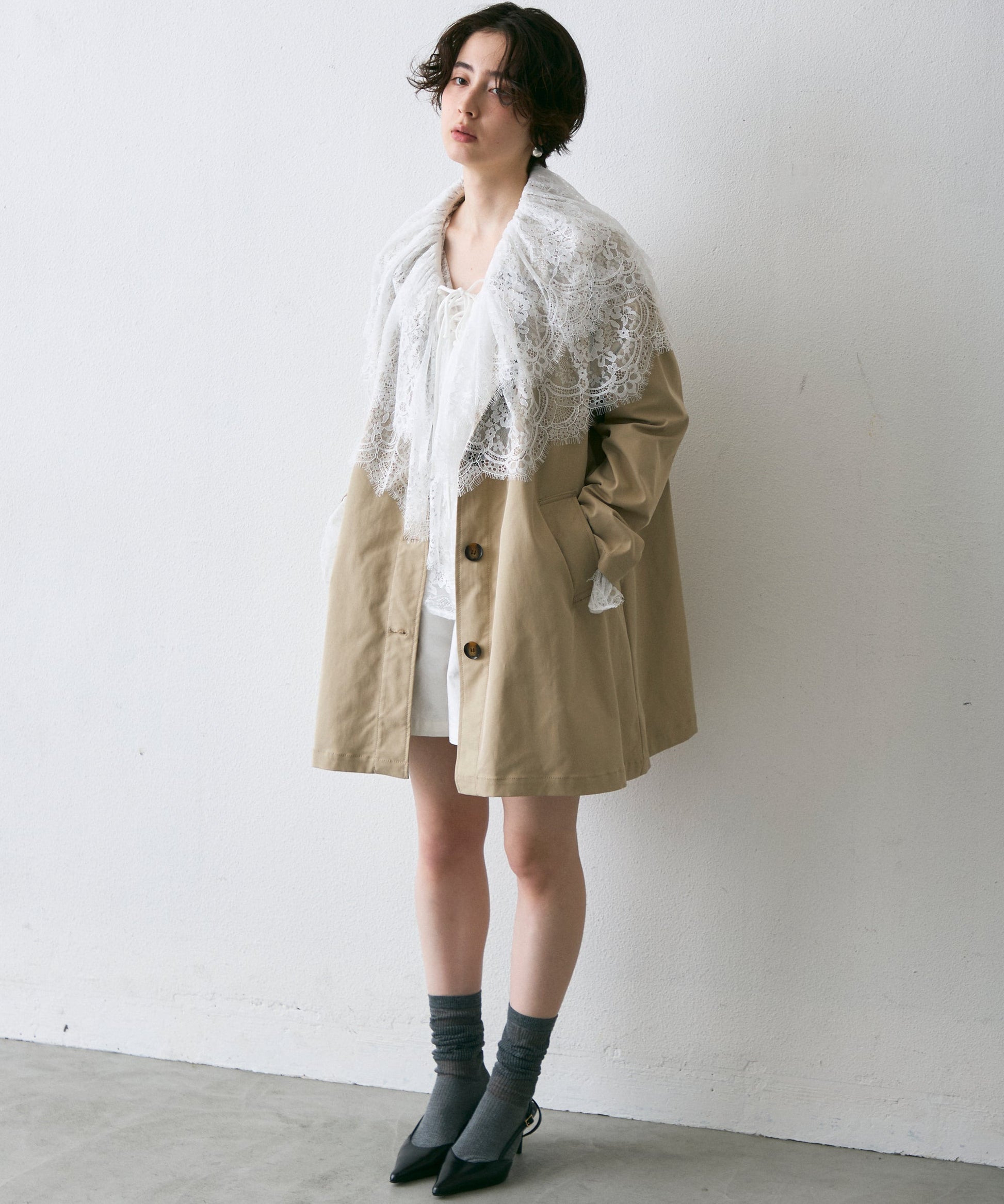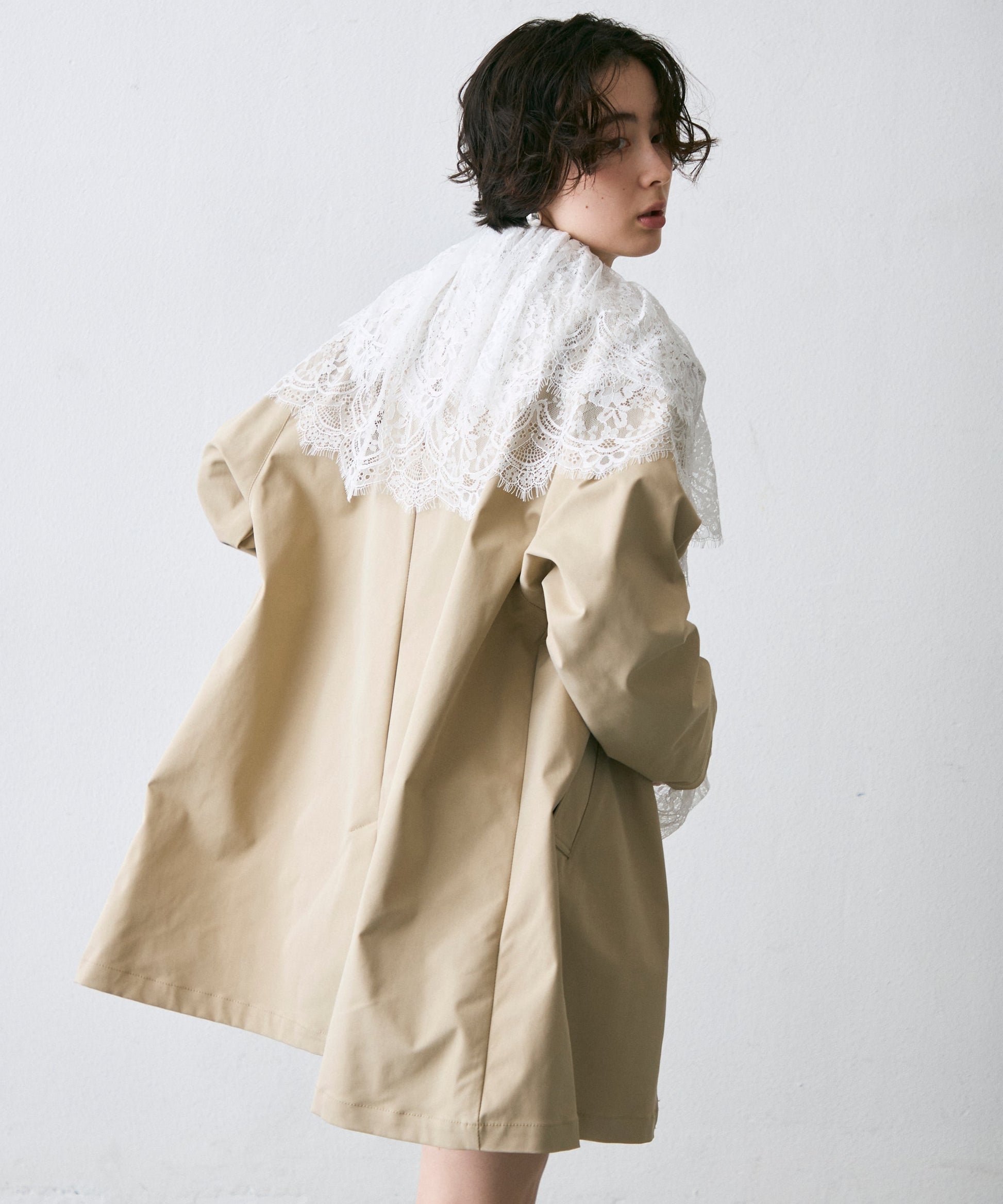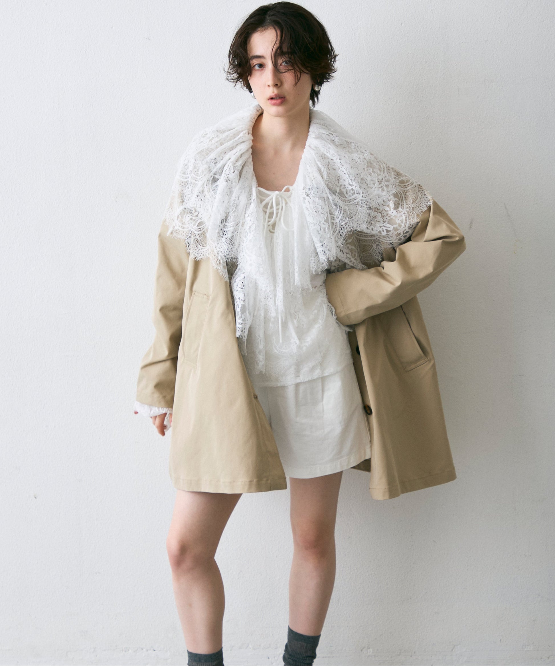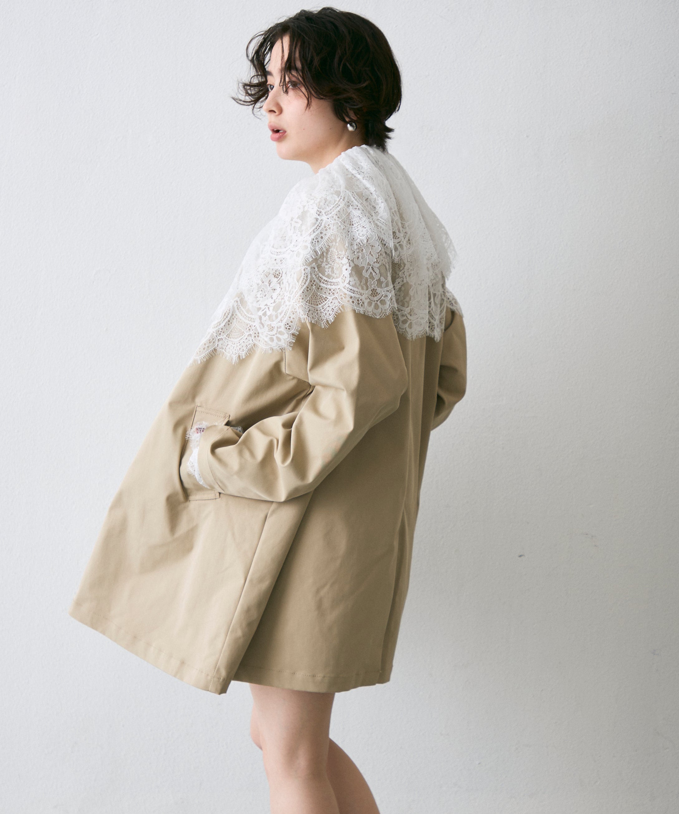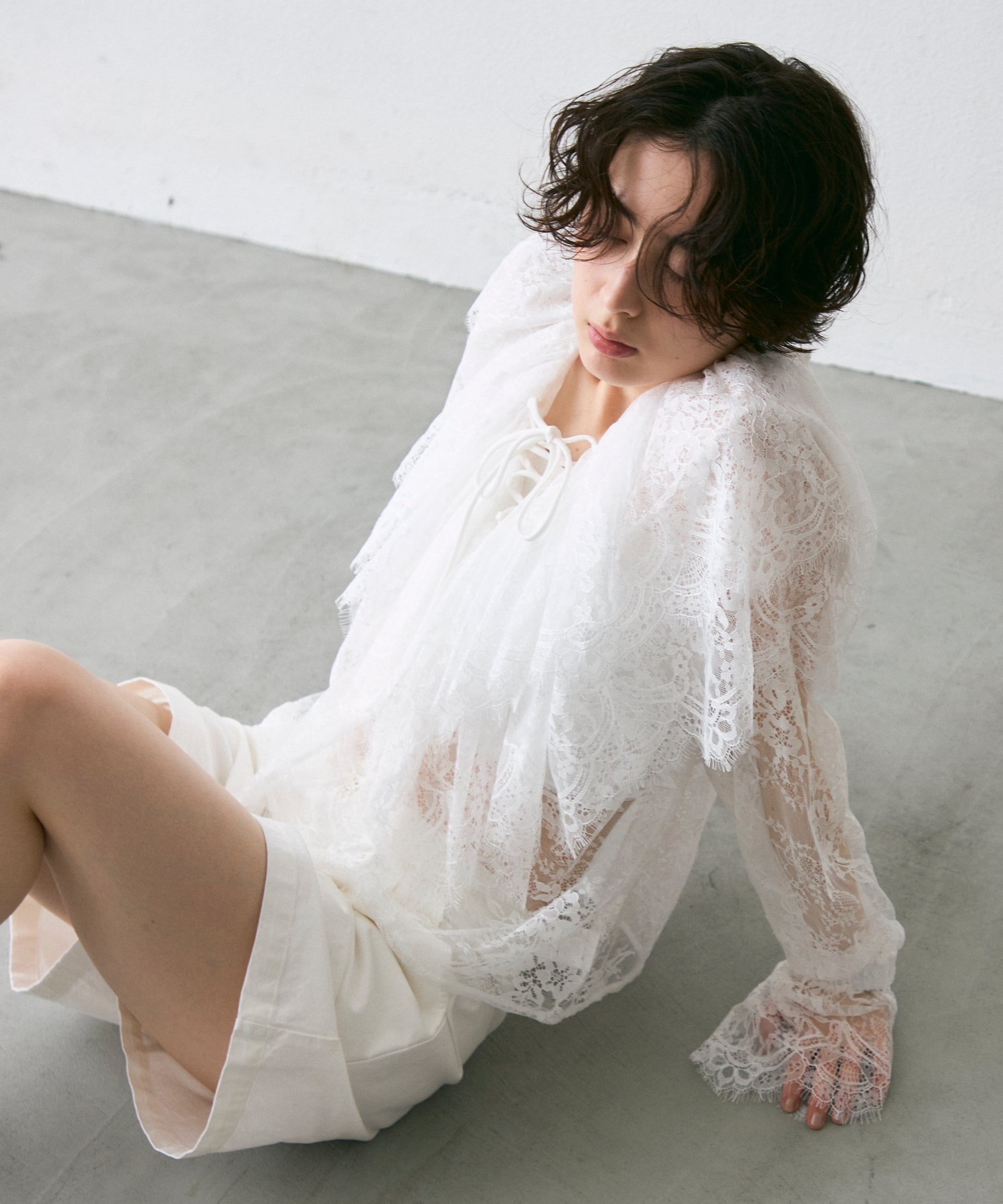 繊細なレースをたっぷりあしらったビッグカラーデザインが、上品な甘さを演出。