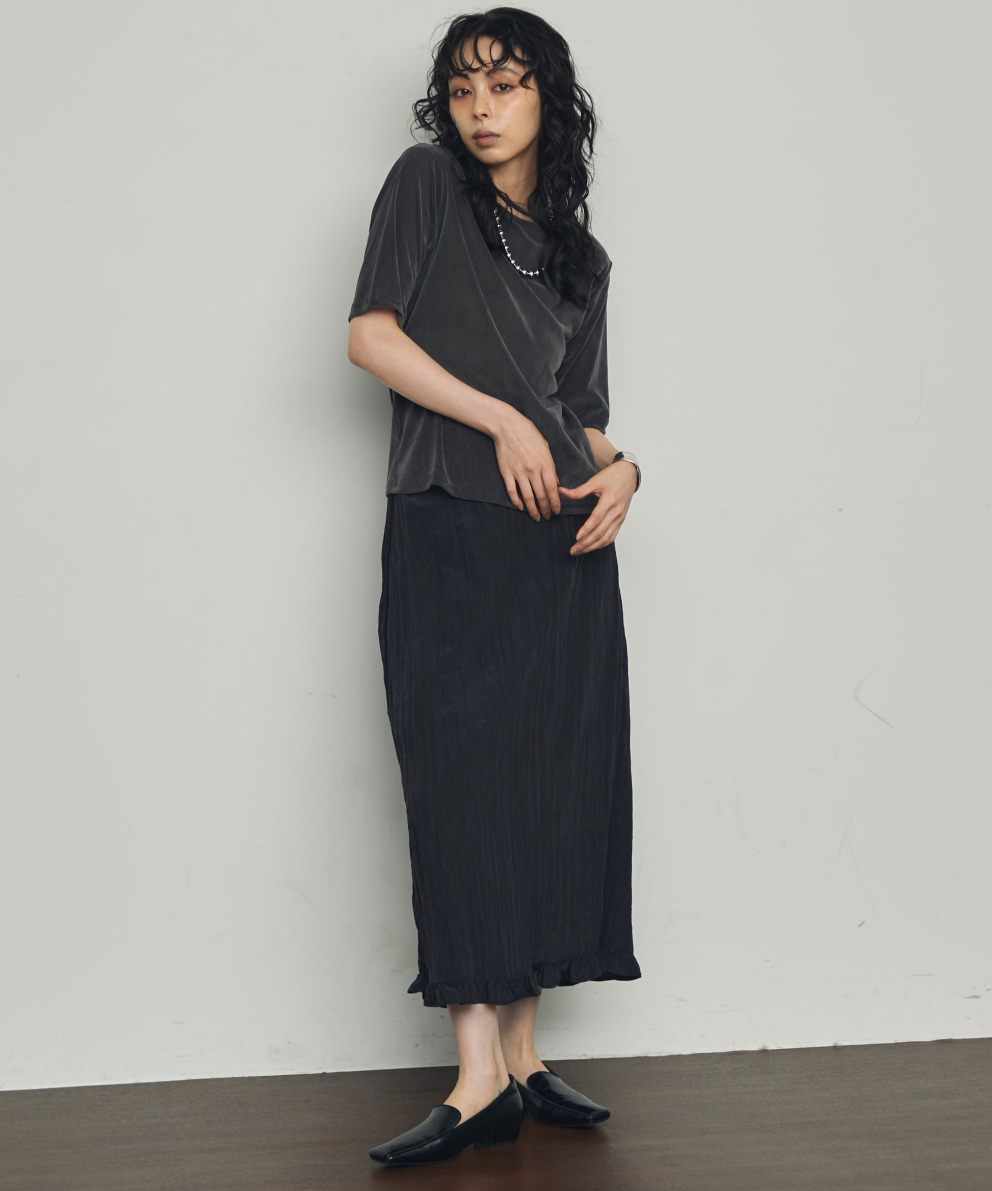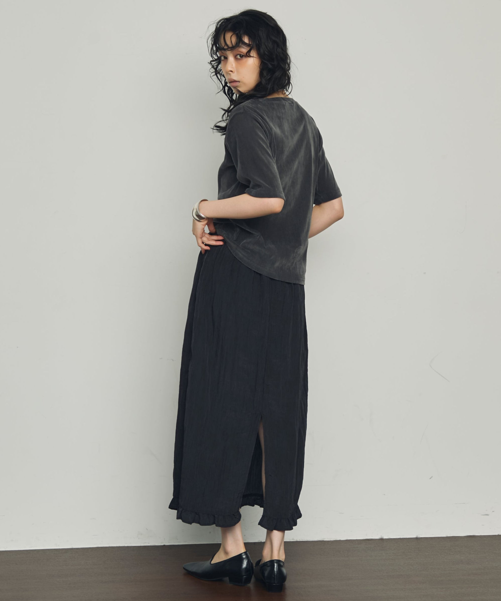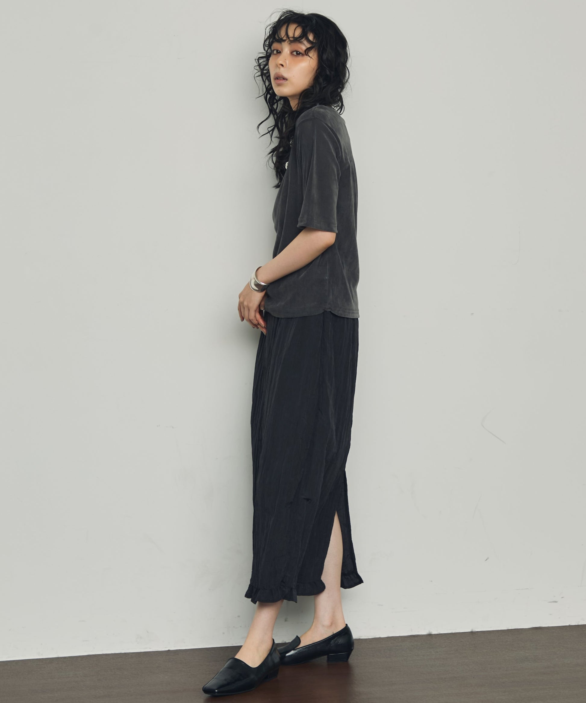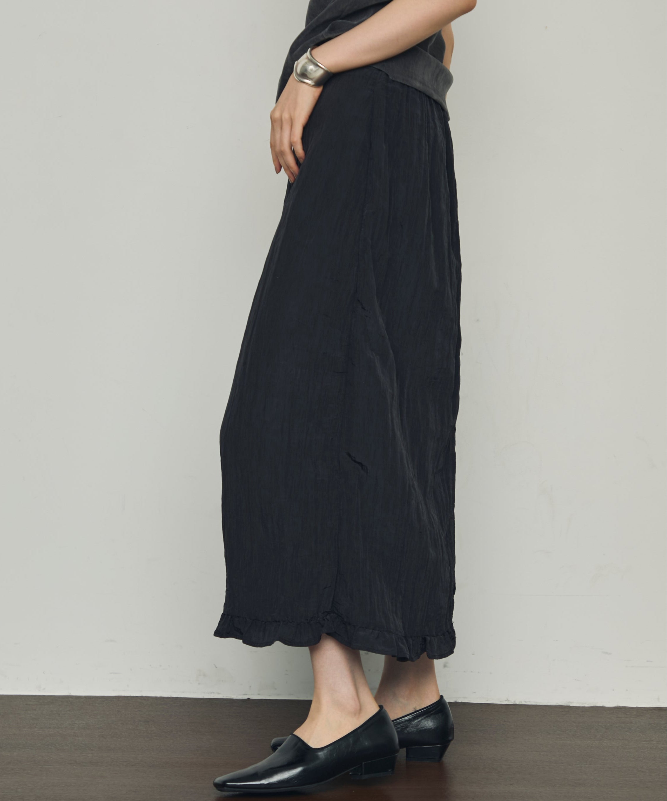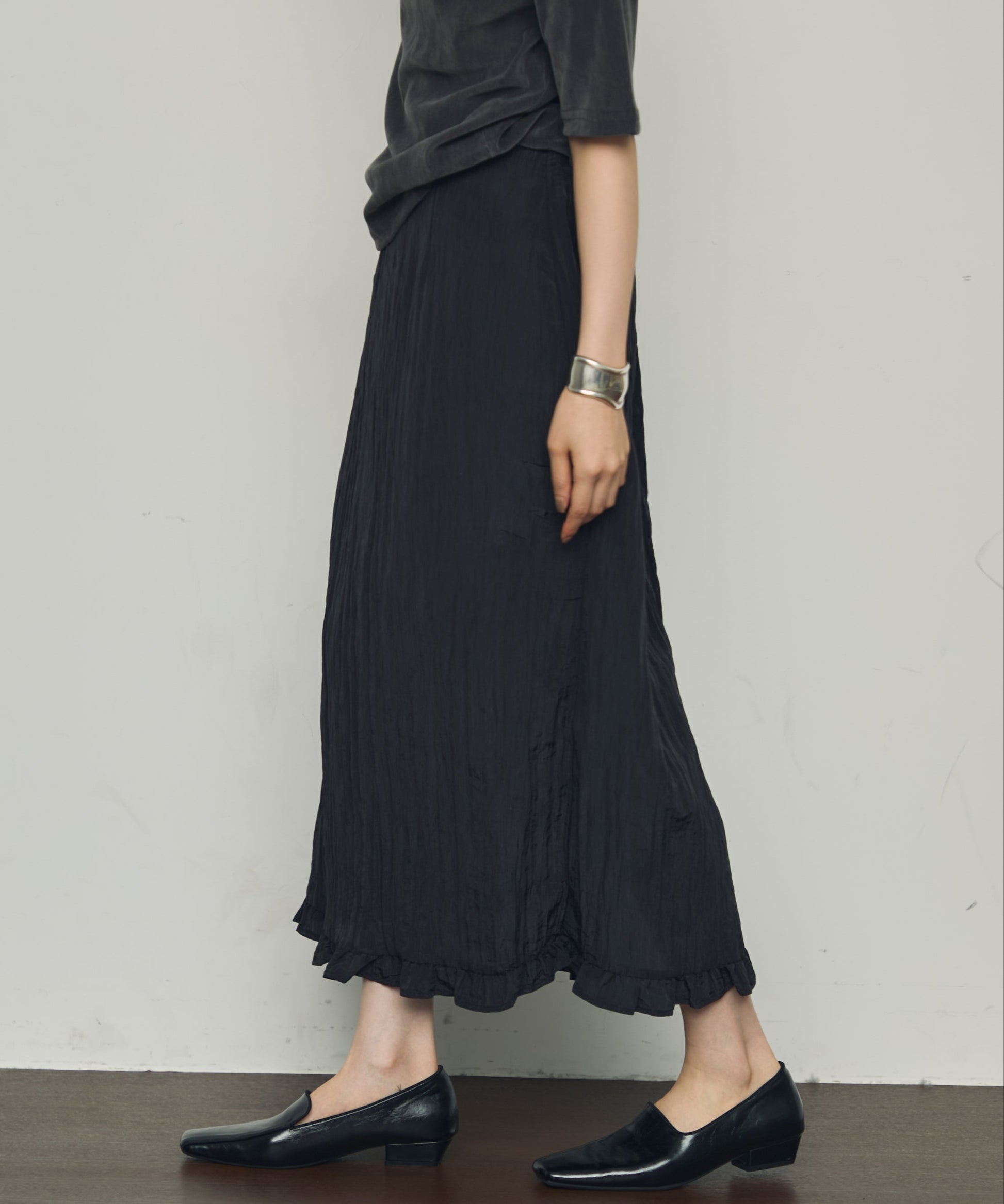 上品なサテンの艶感と裾のフリルが女性らしさを格上げしてくれる一枚。