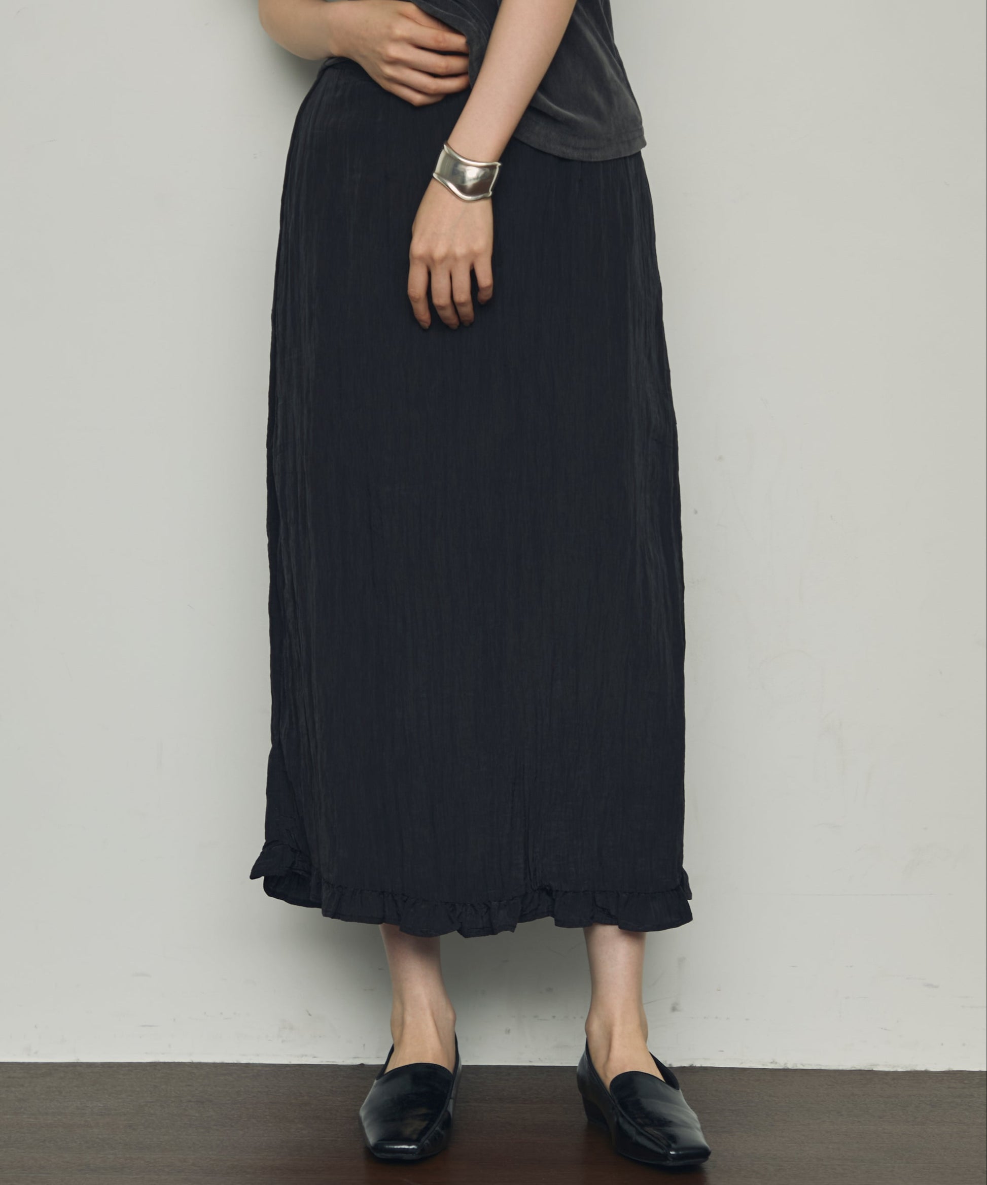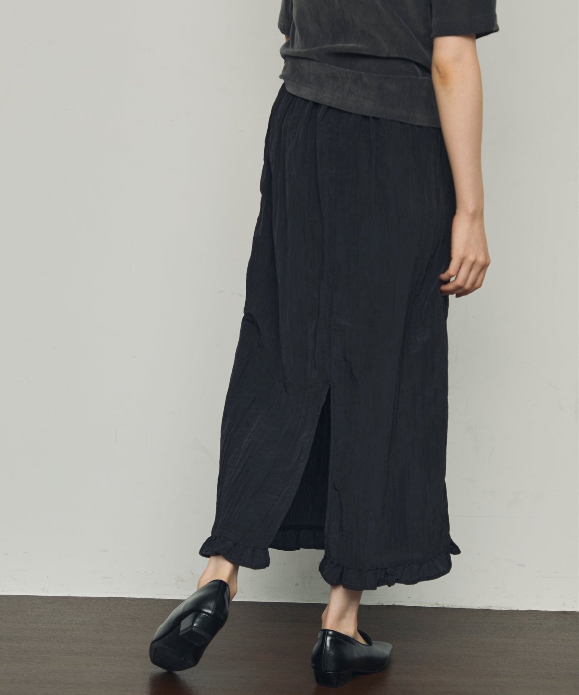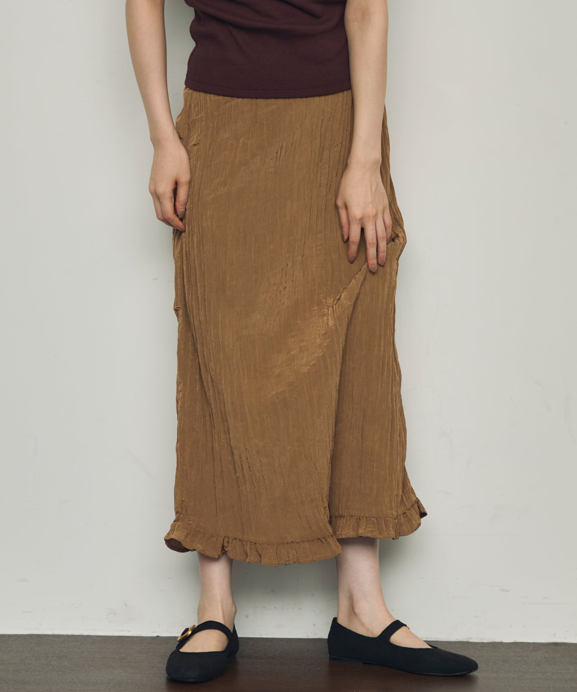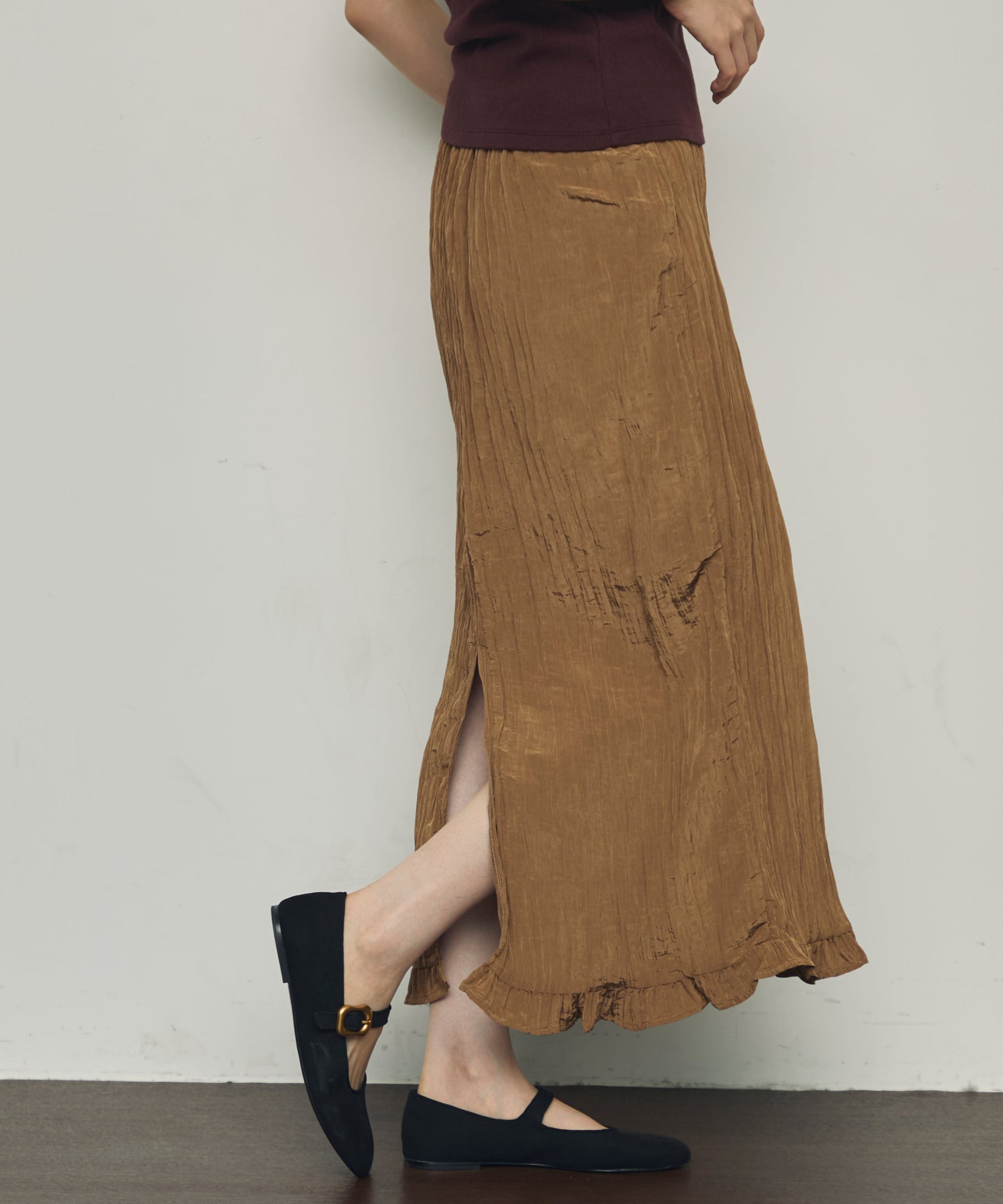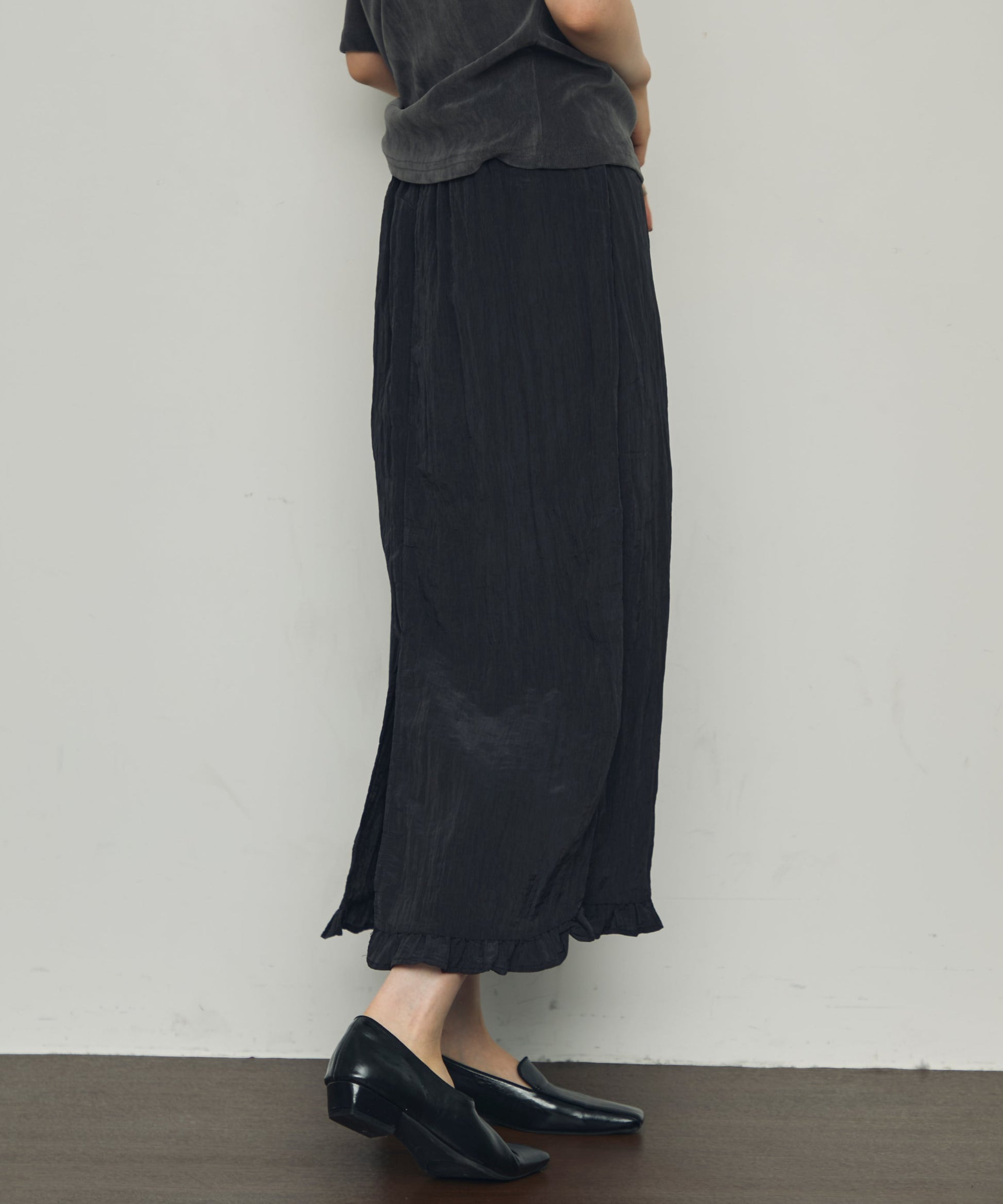上品なサテンの艶感と裾のフリルが女性らしさを格上げしてくれる一枚。