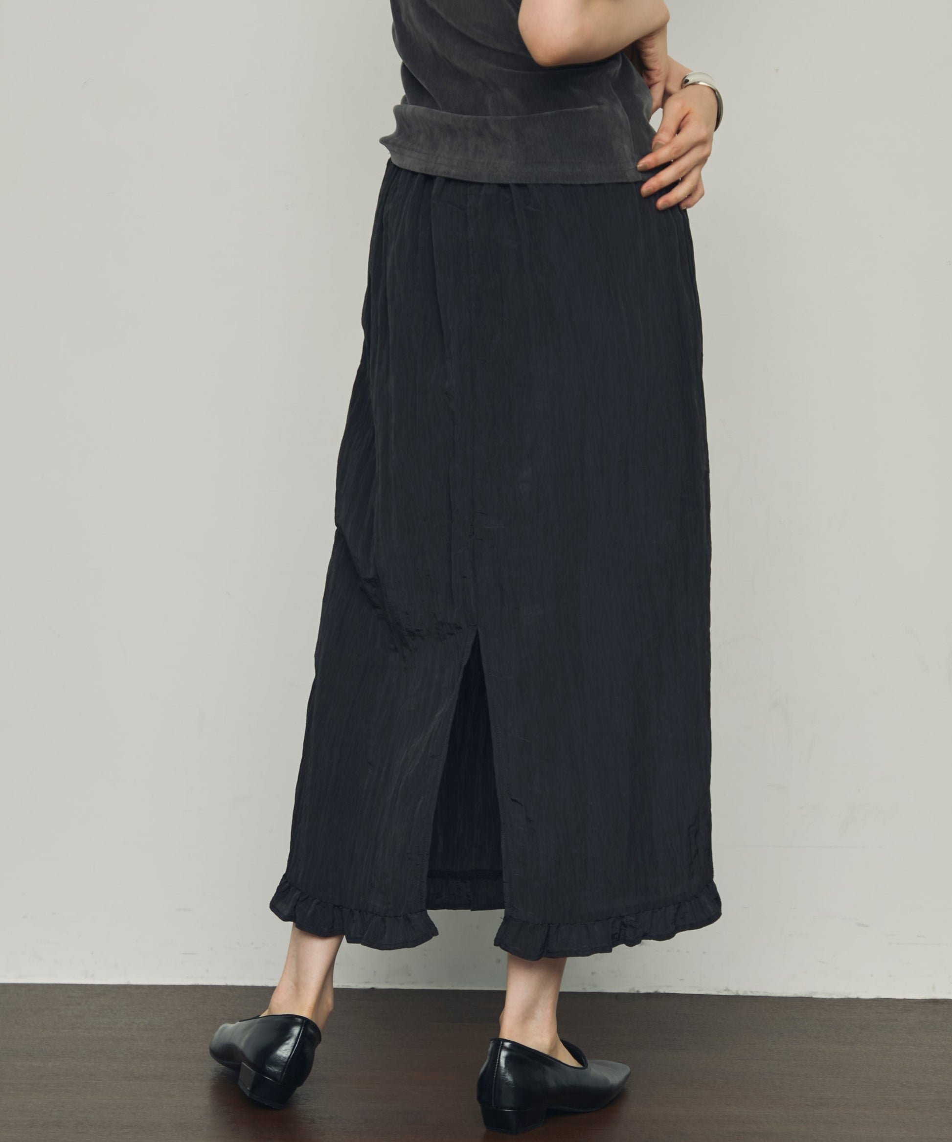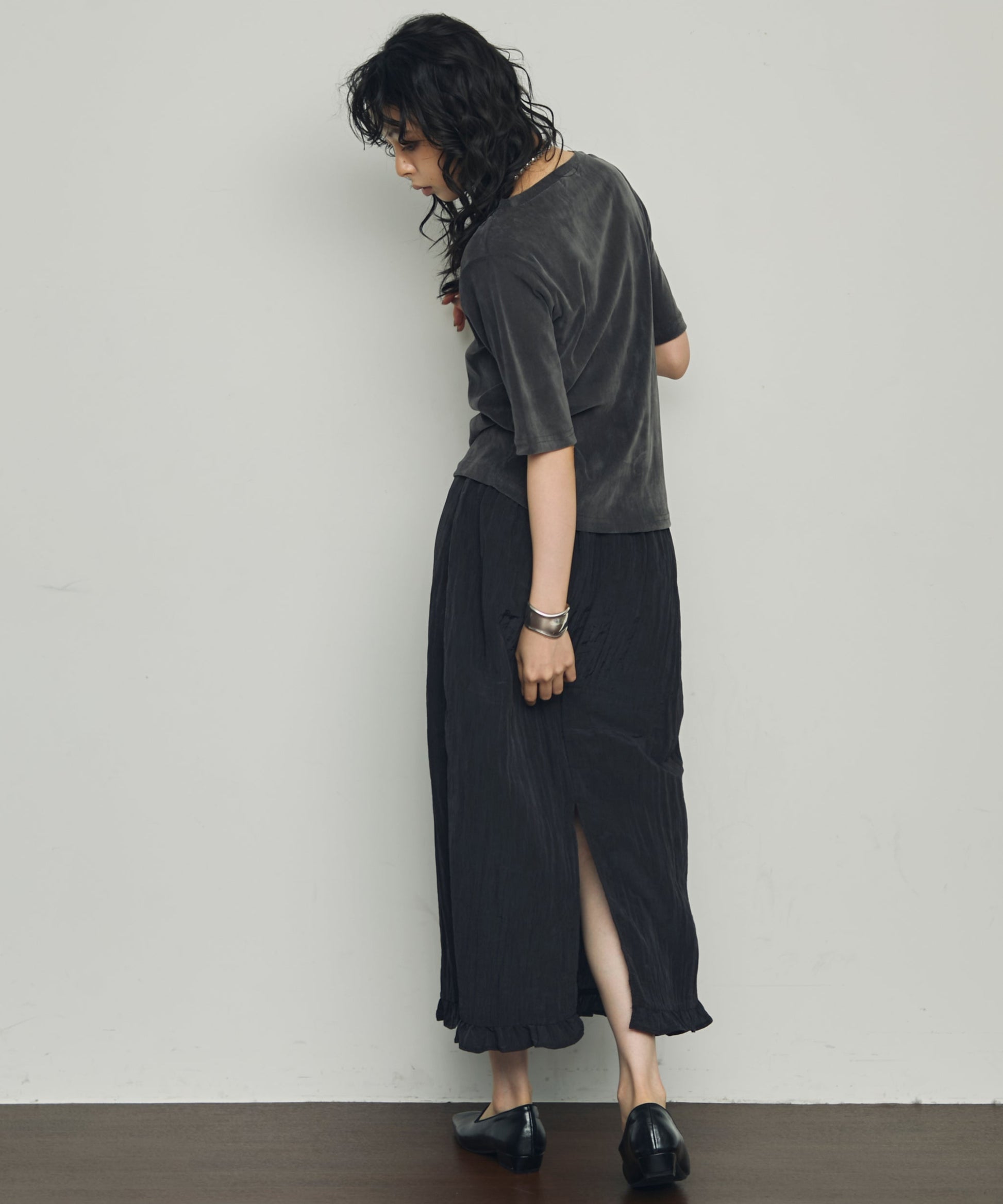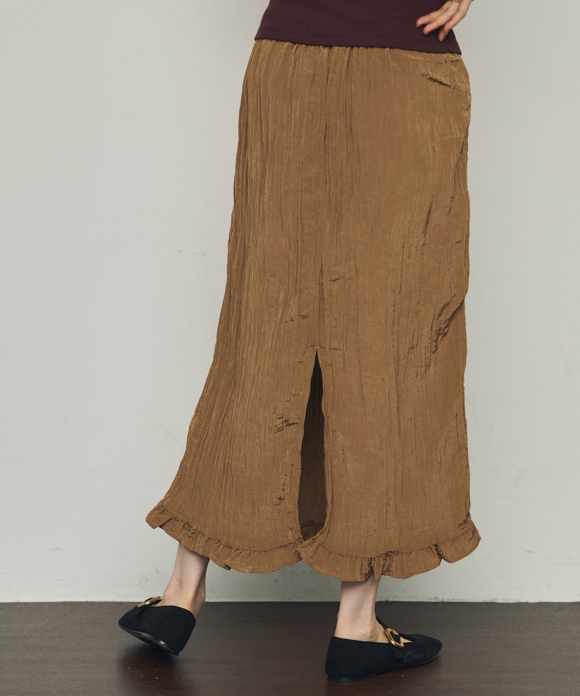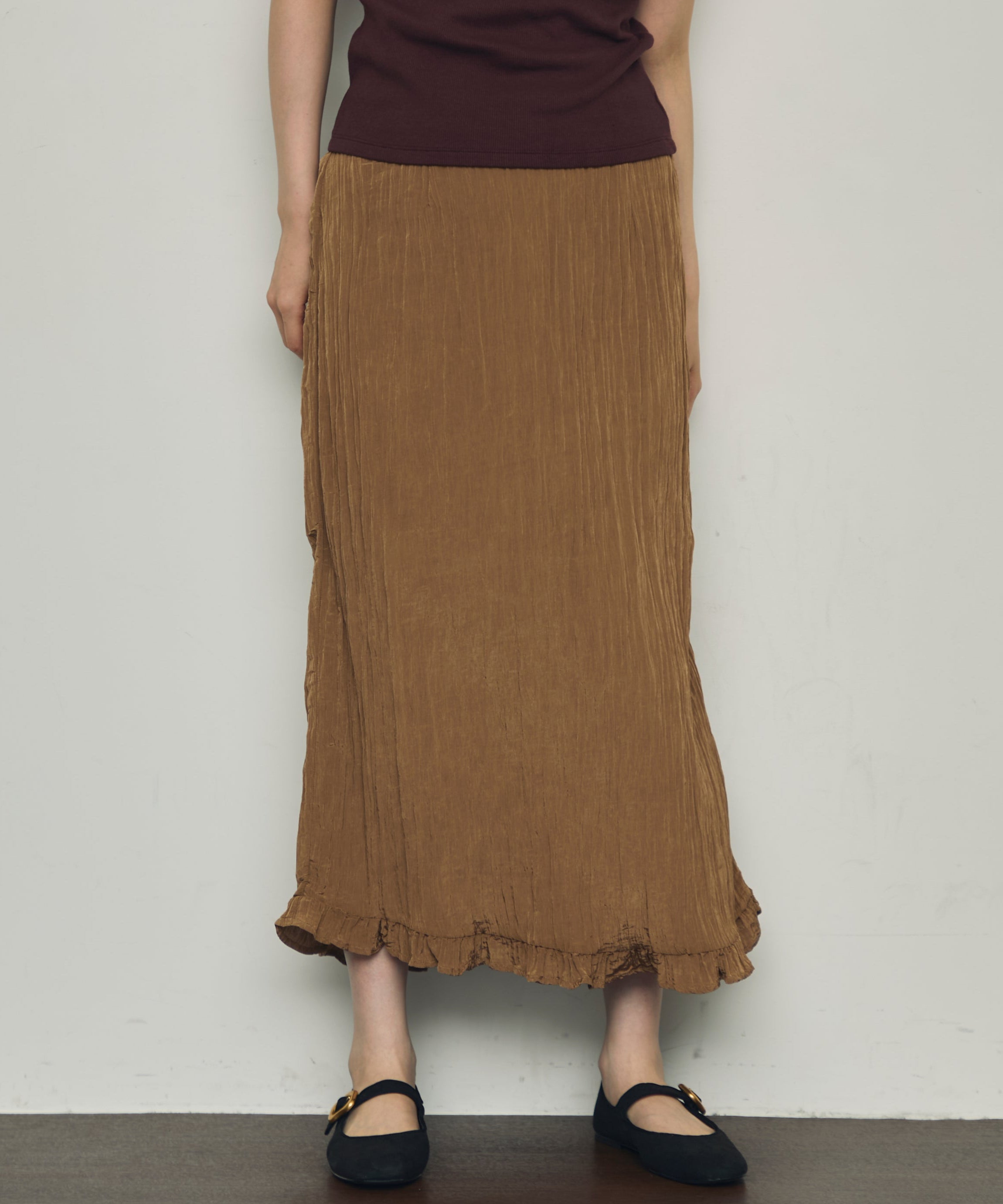 上品なサテンの艶感と裾のフリルが女性らしさを格上げしてくれる一枚。