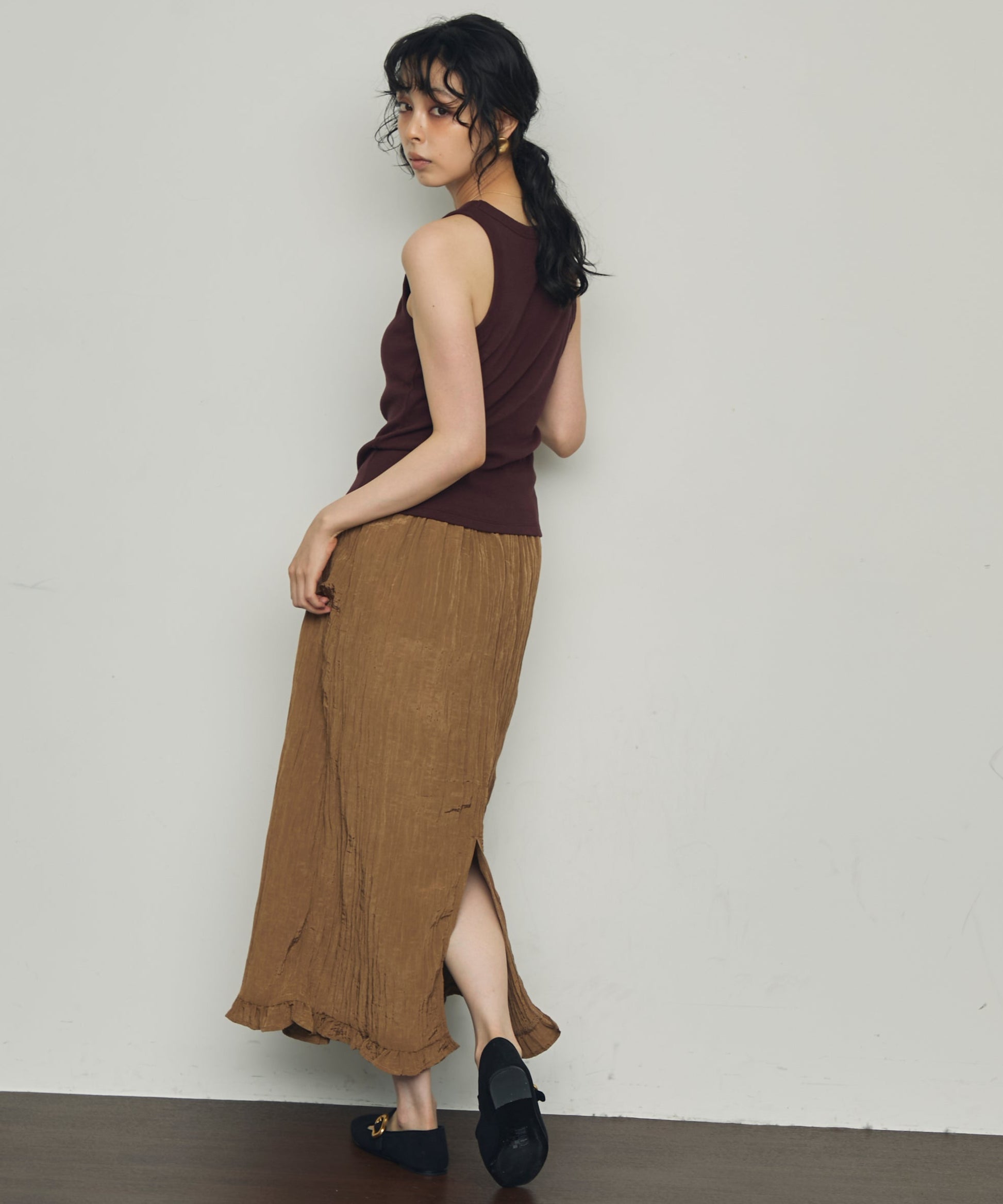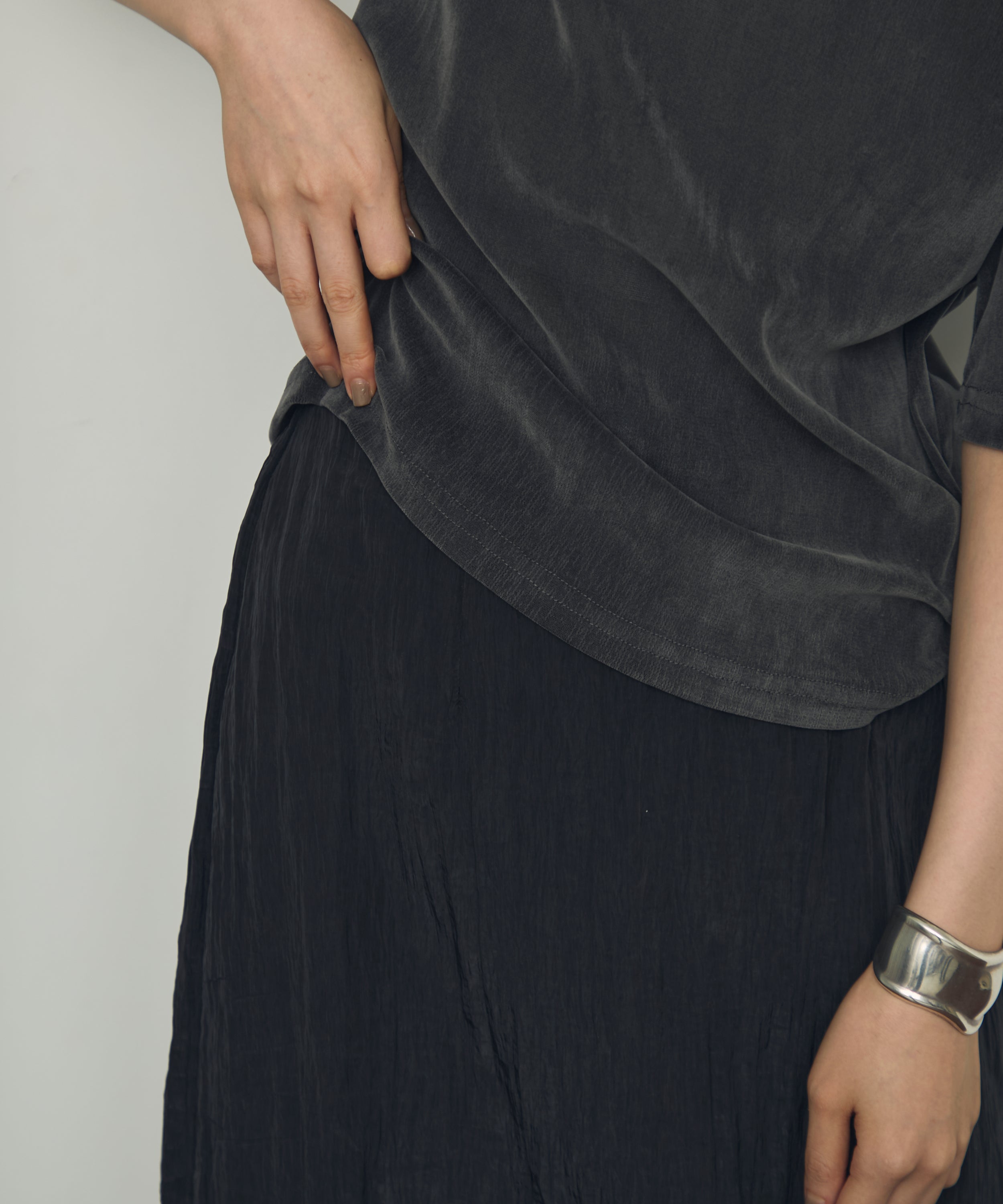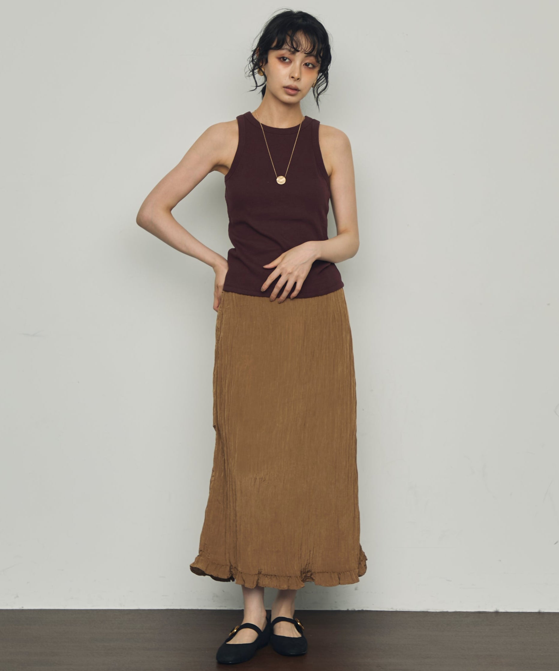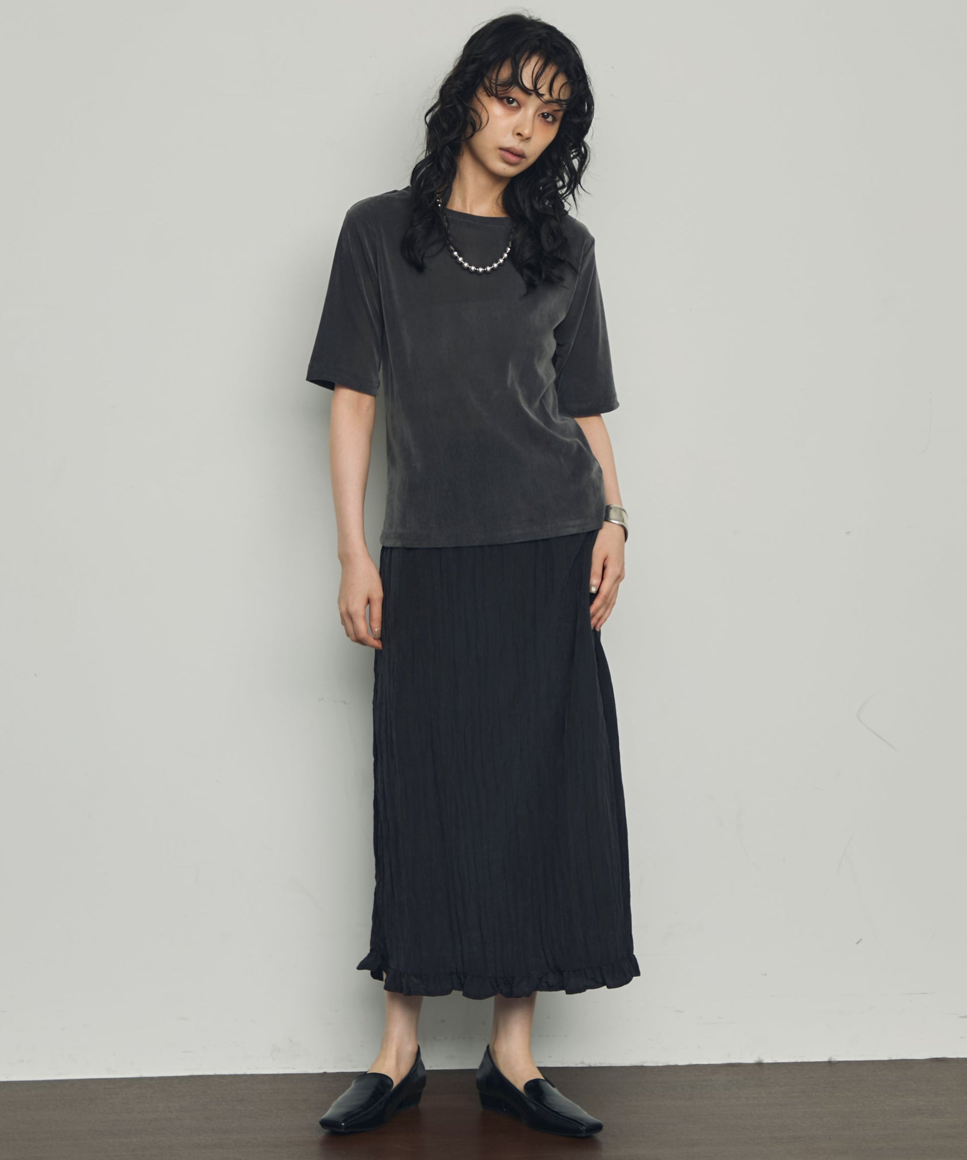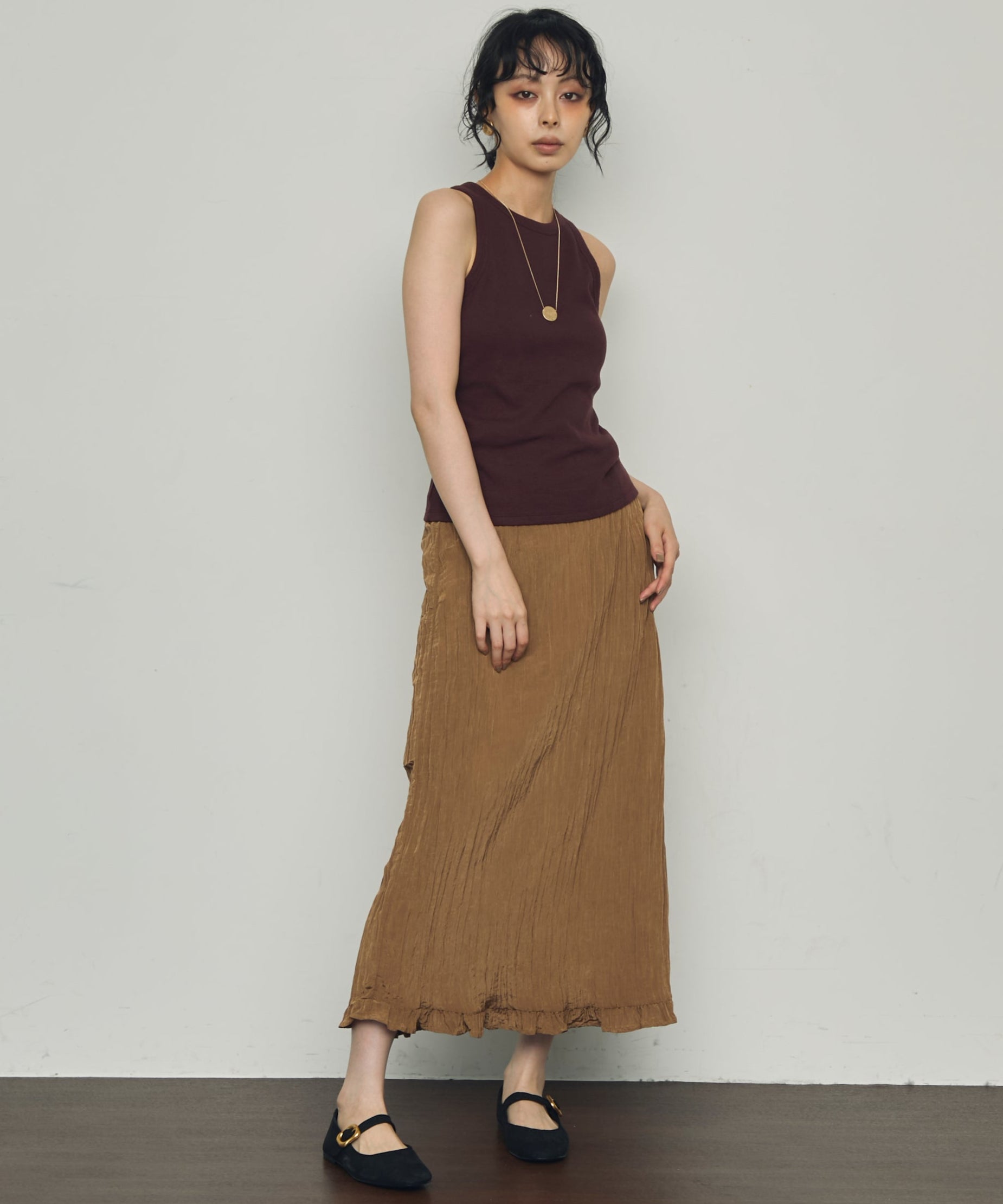 上品なサテンの艶感と裾のフリルが女性らしさを格上げしてくれる一枚。