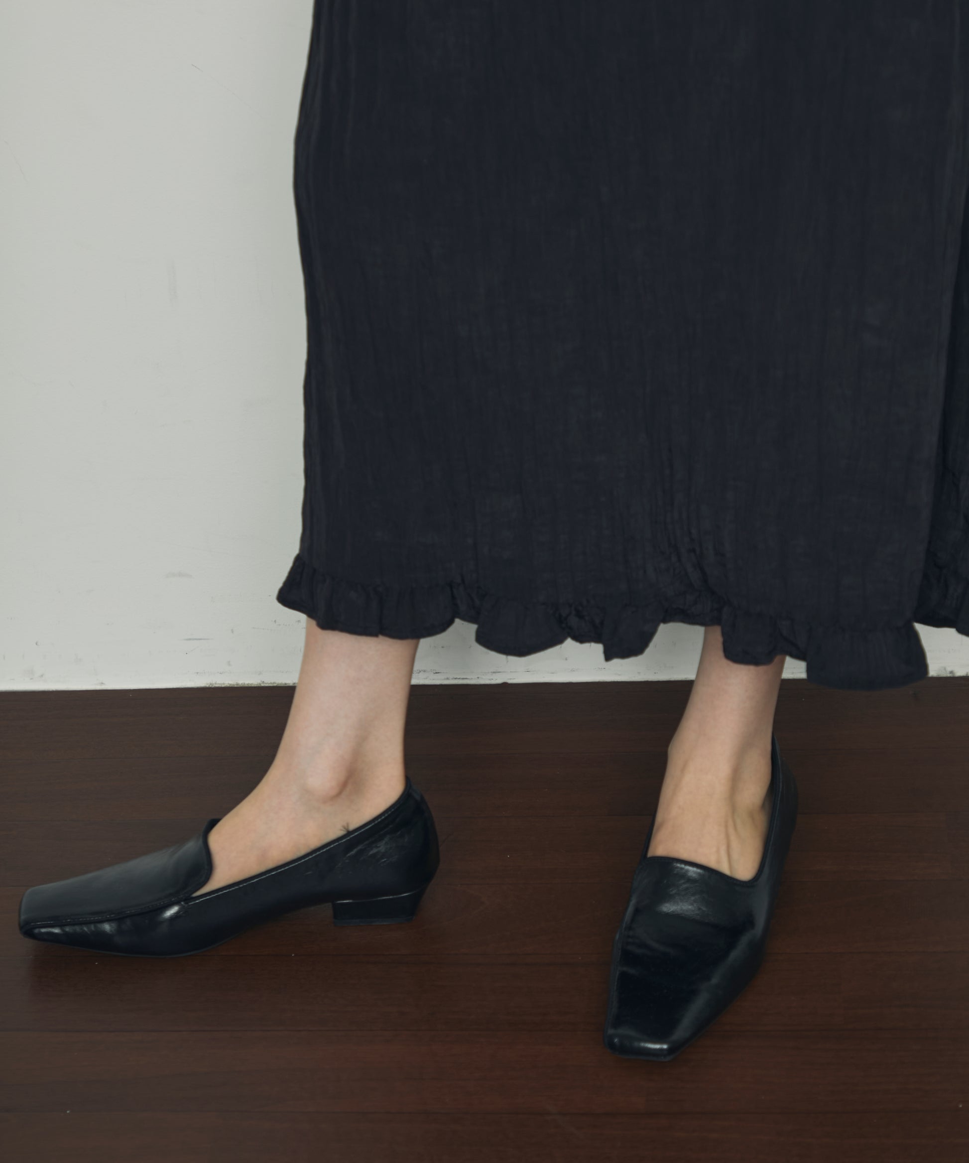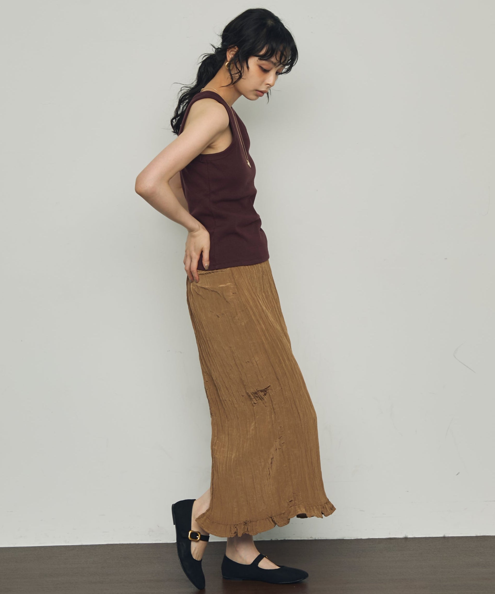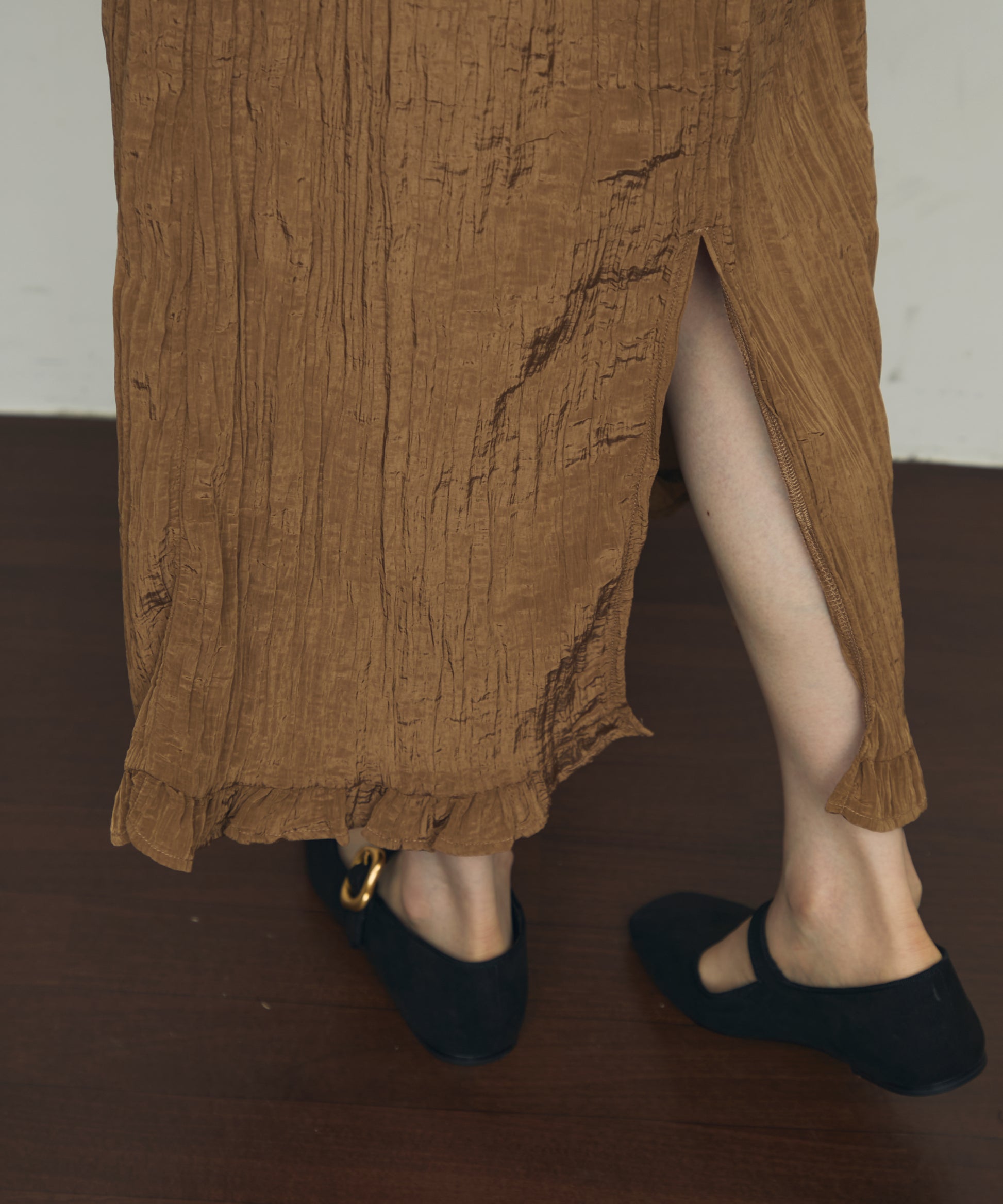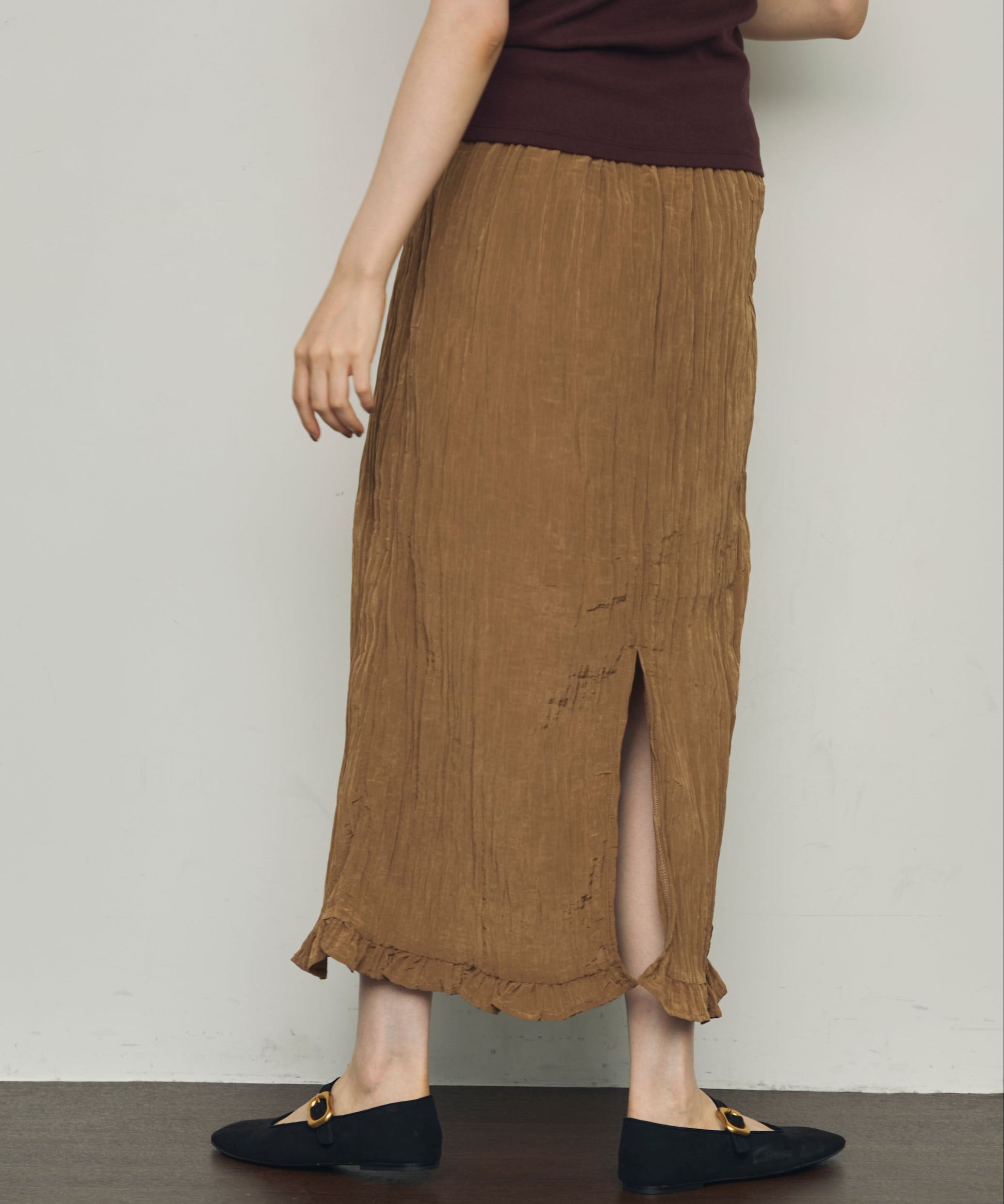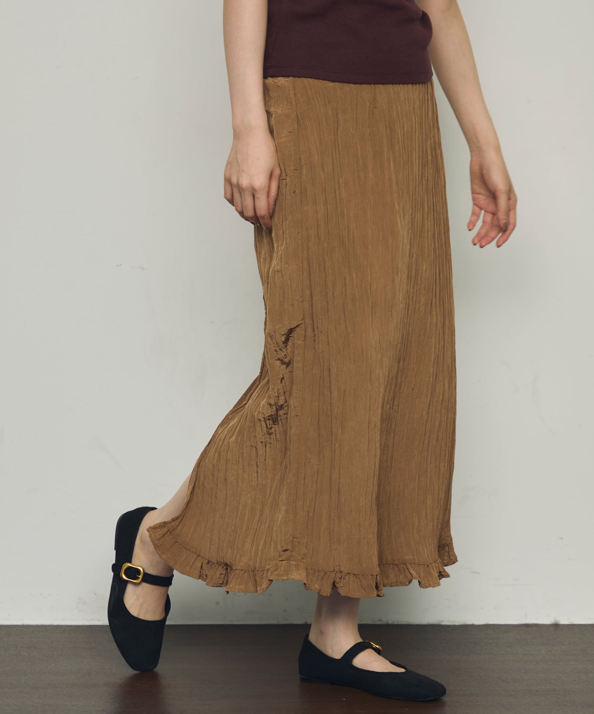 上品なサテンの艶感と裾のフリルが女性らしさを格上げしてくれる一枚。