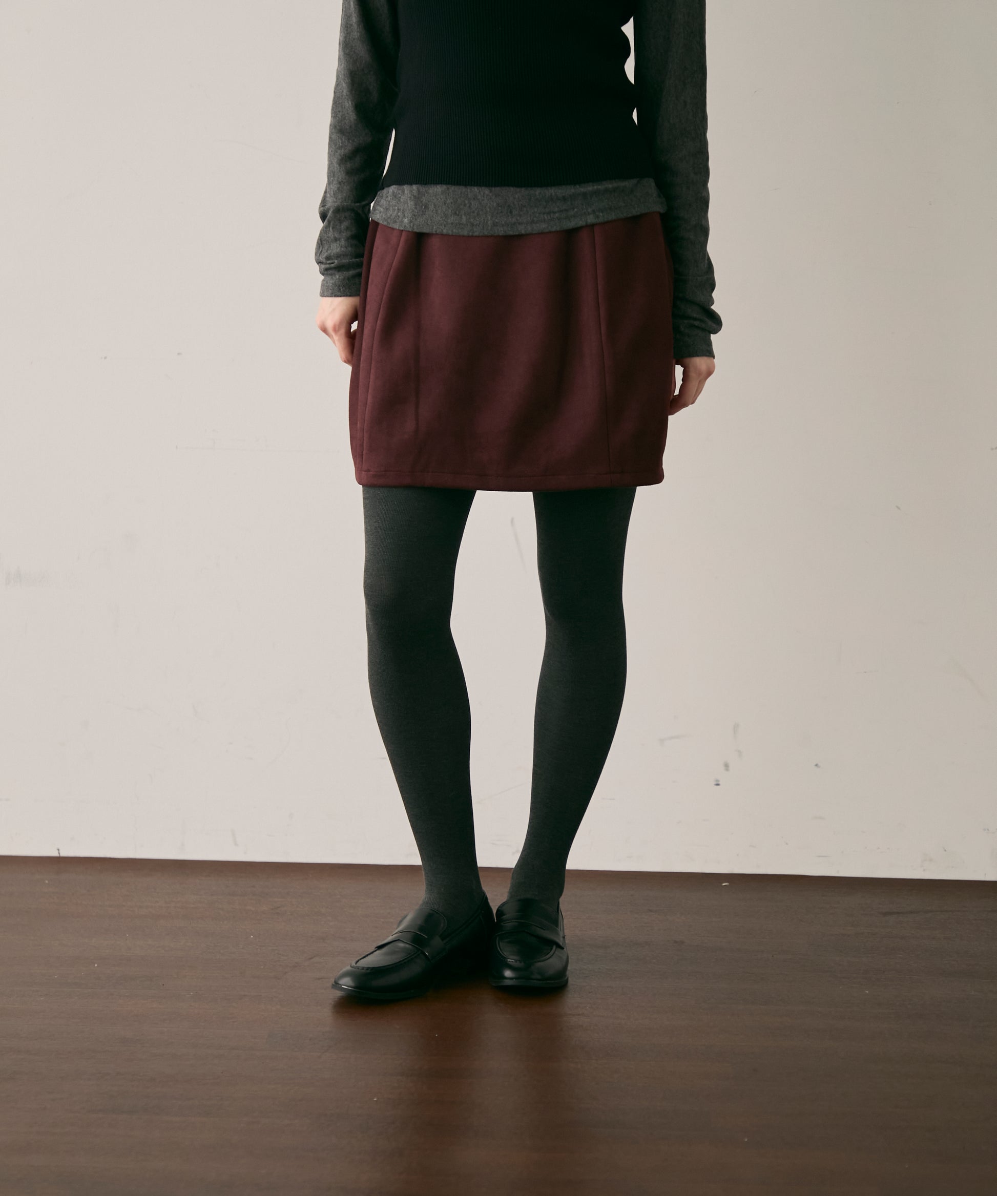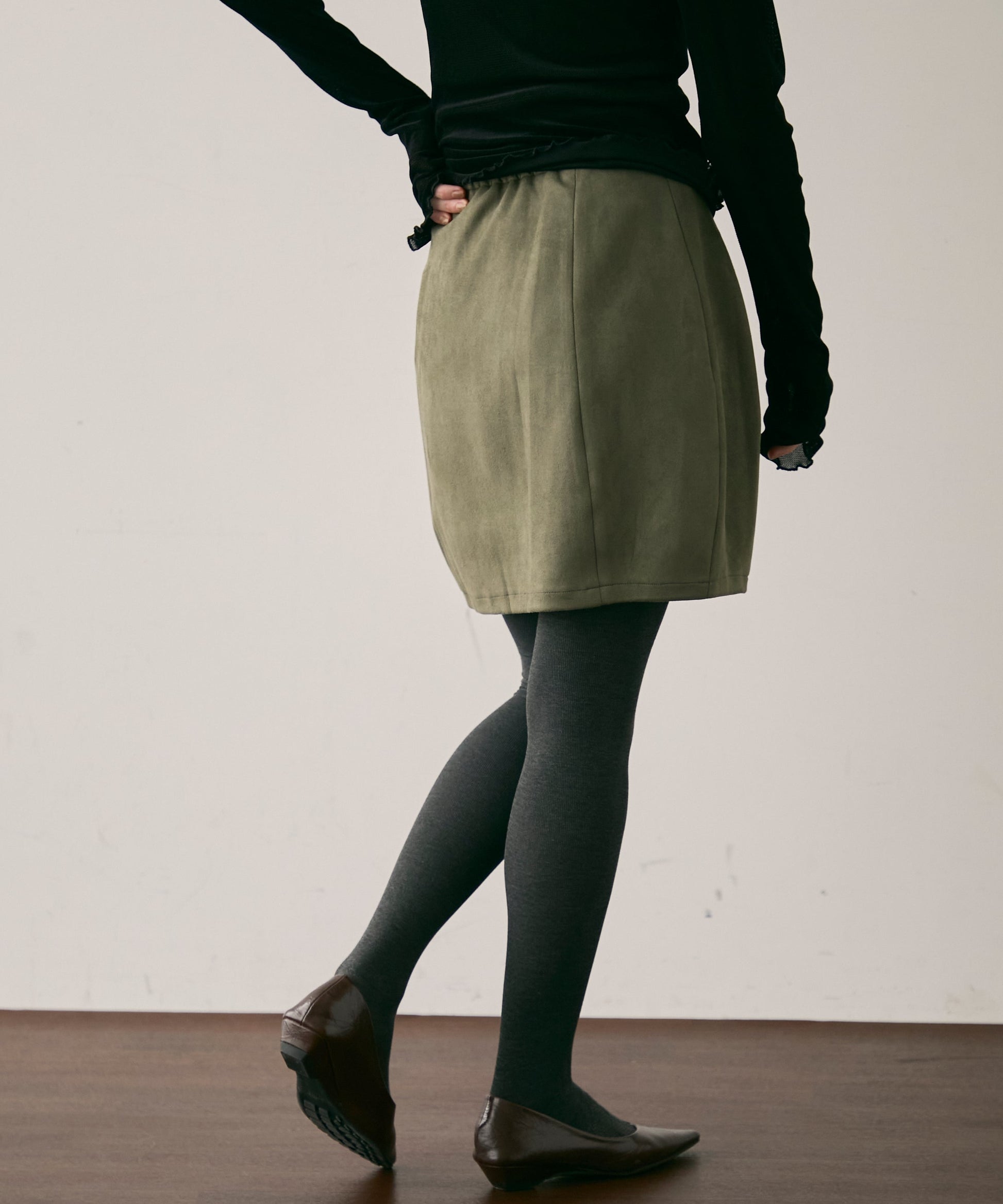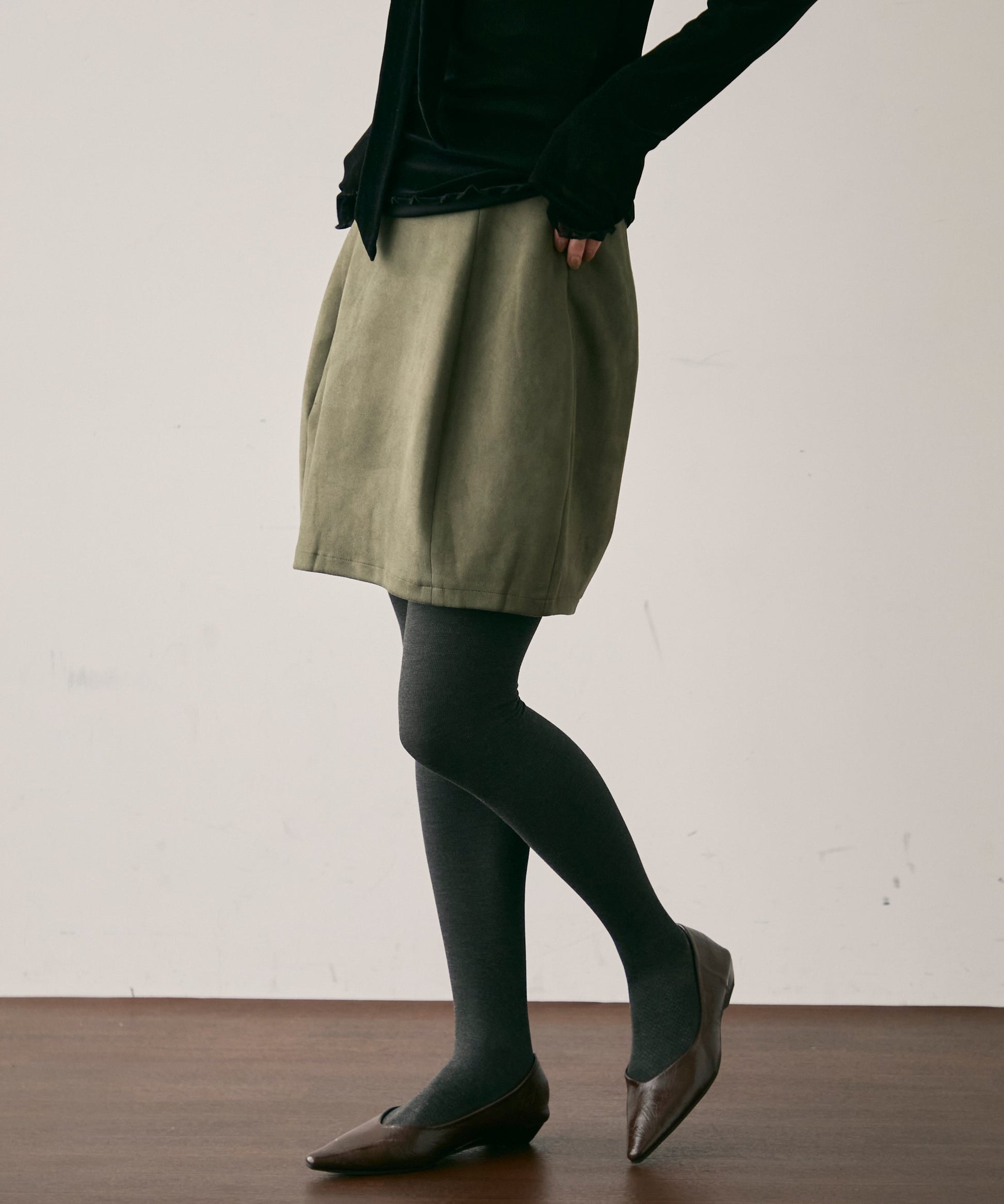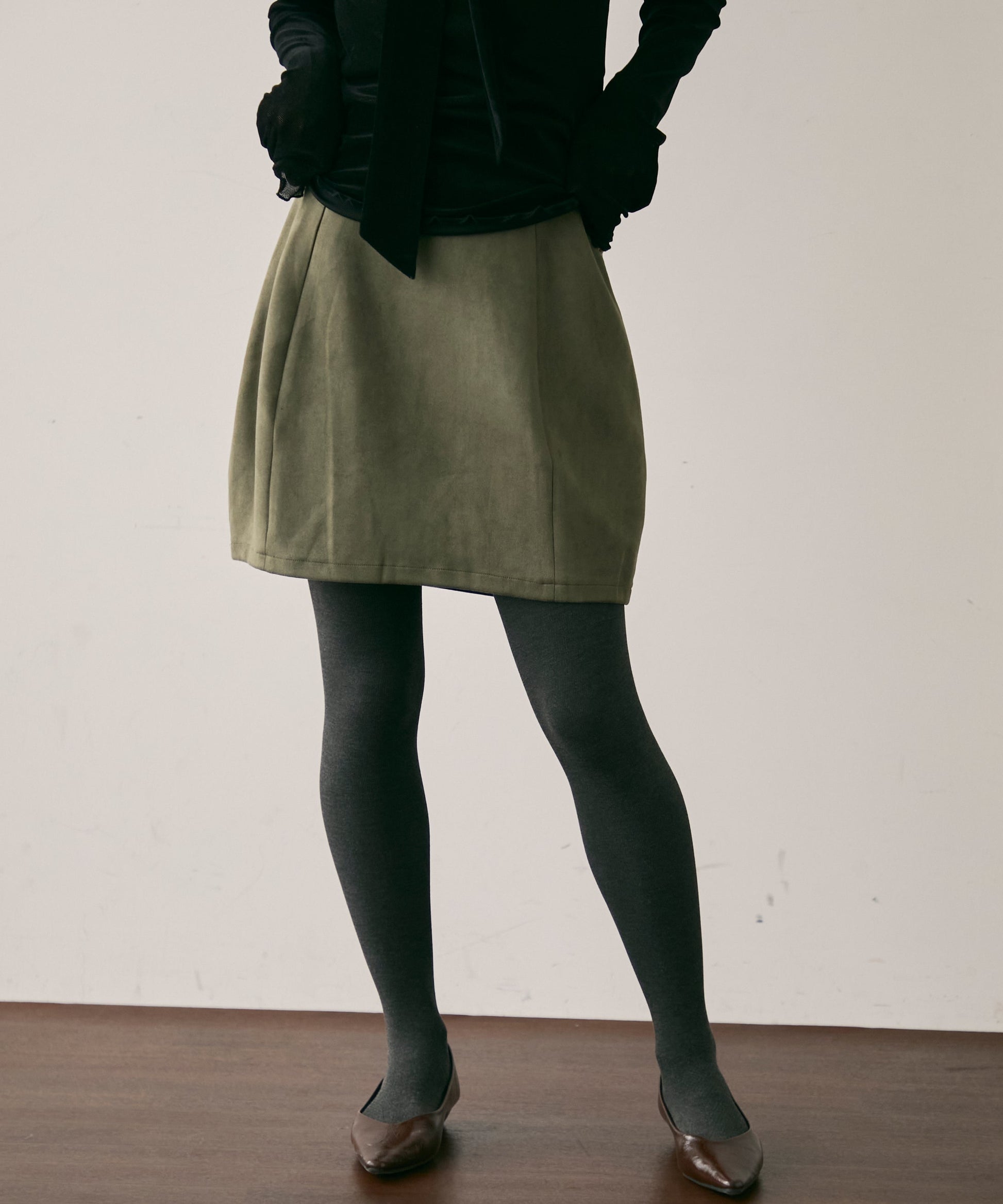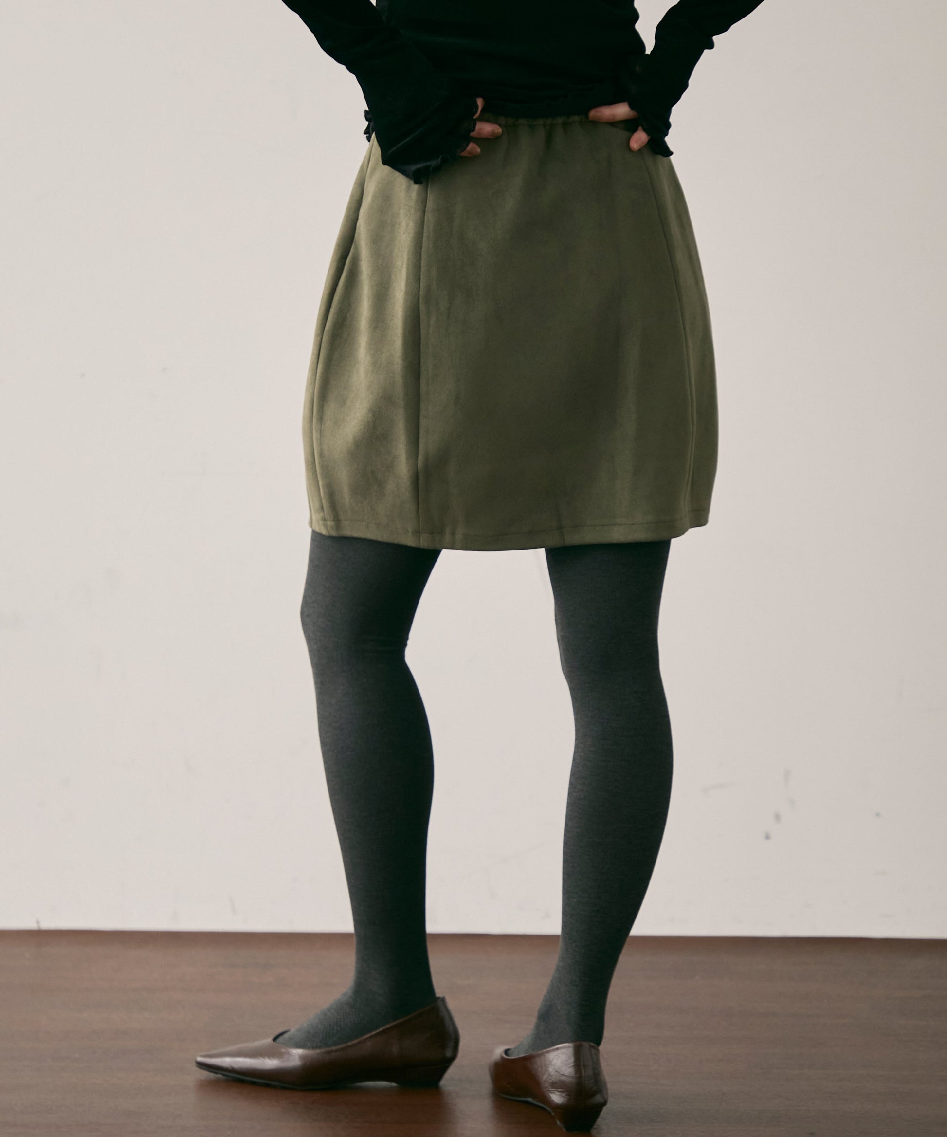 スエード調のしっとりとした風合いが魅力のコクーンスカート。程よいボリューム感が体型をさりげなくカバーしつつ、こなれ感のあるスタイリングを叶えます。ニットやスウェットとも好相性。