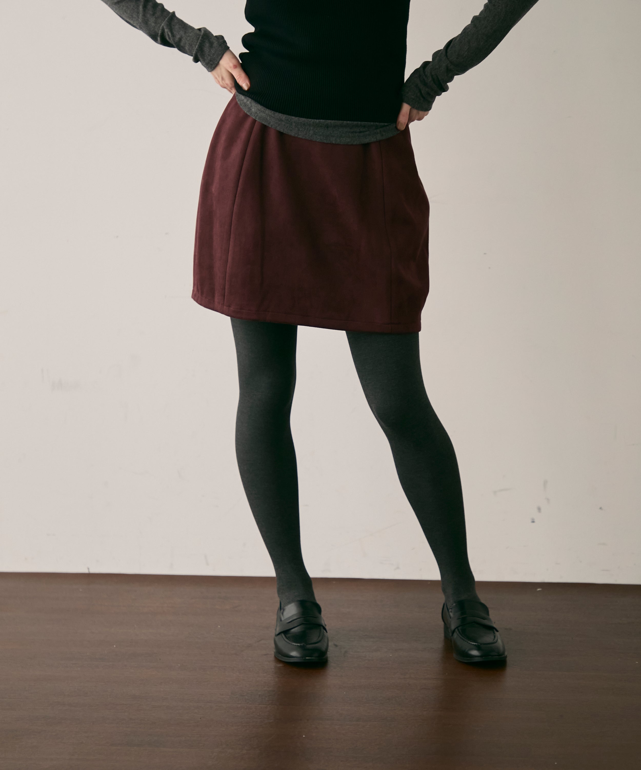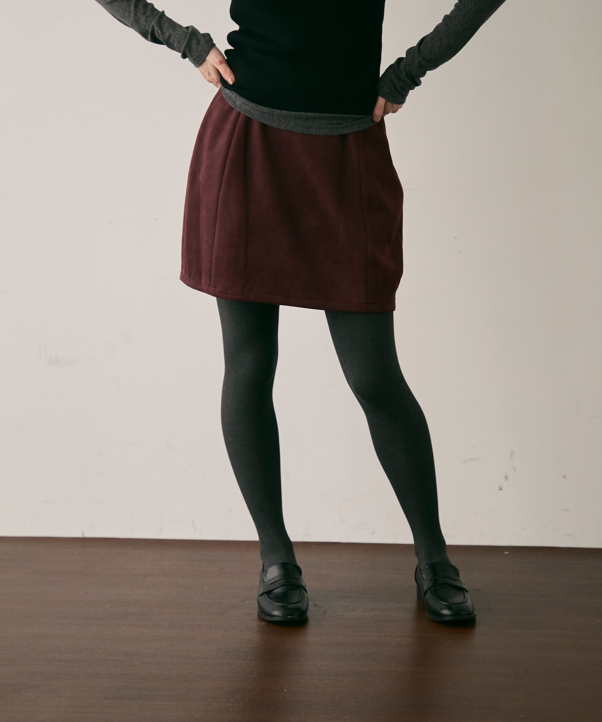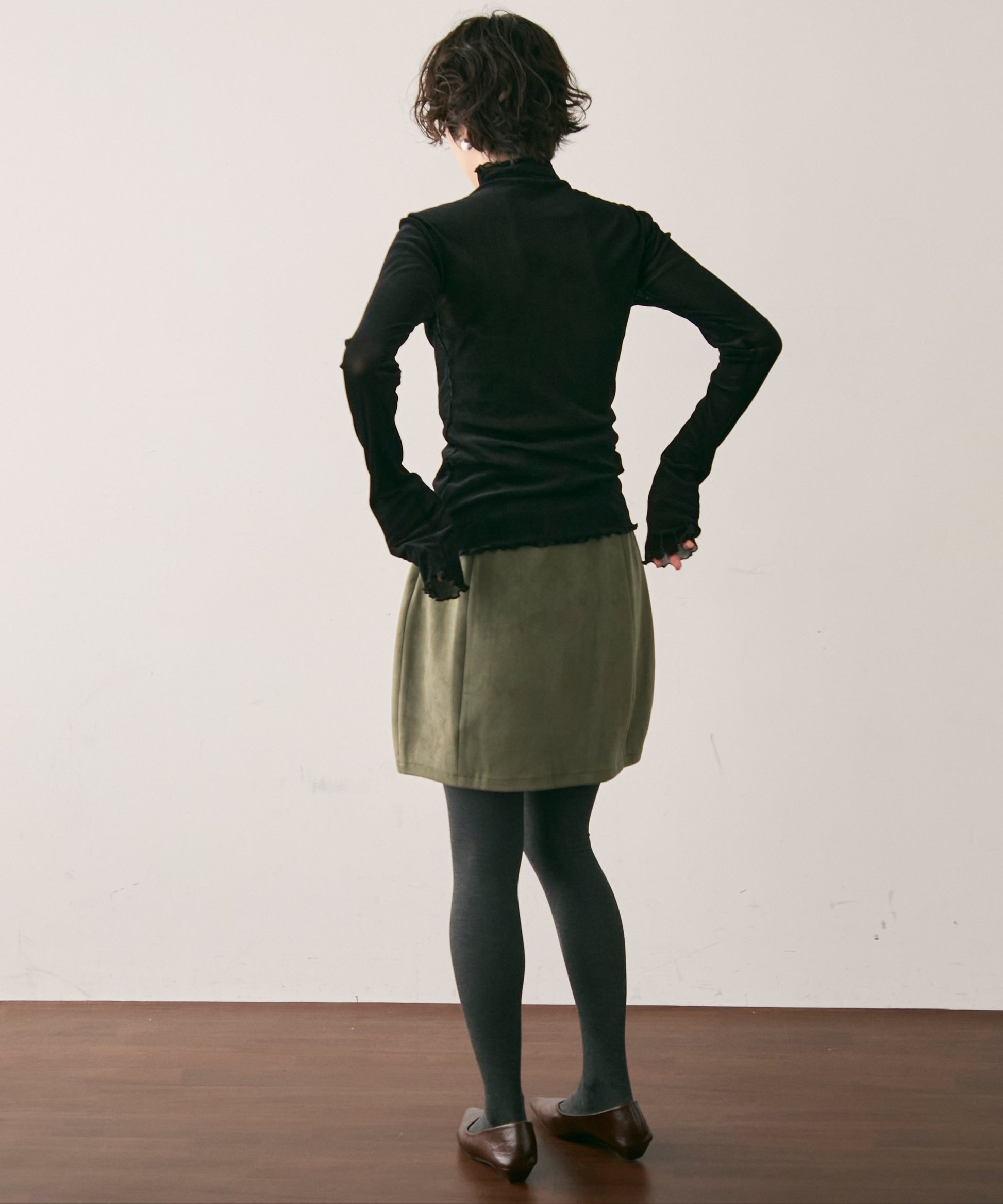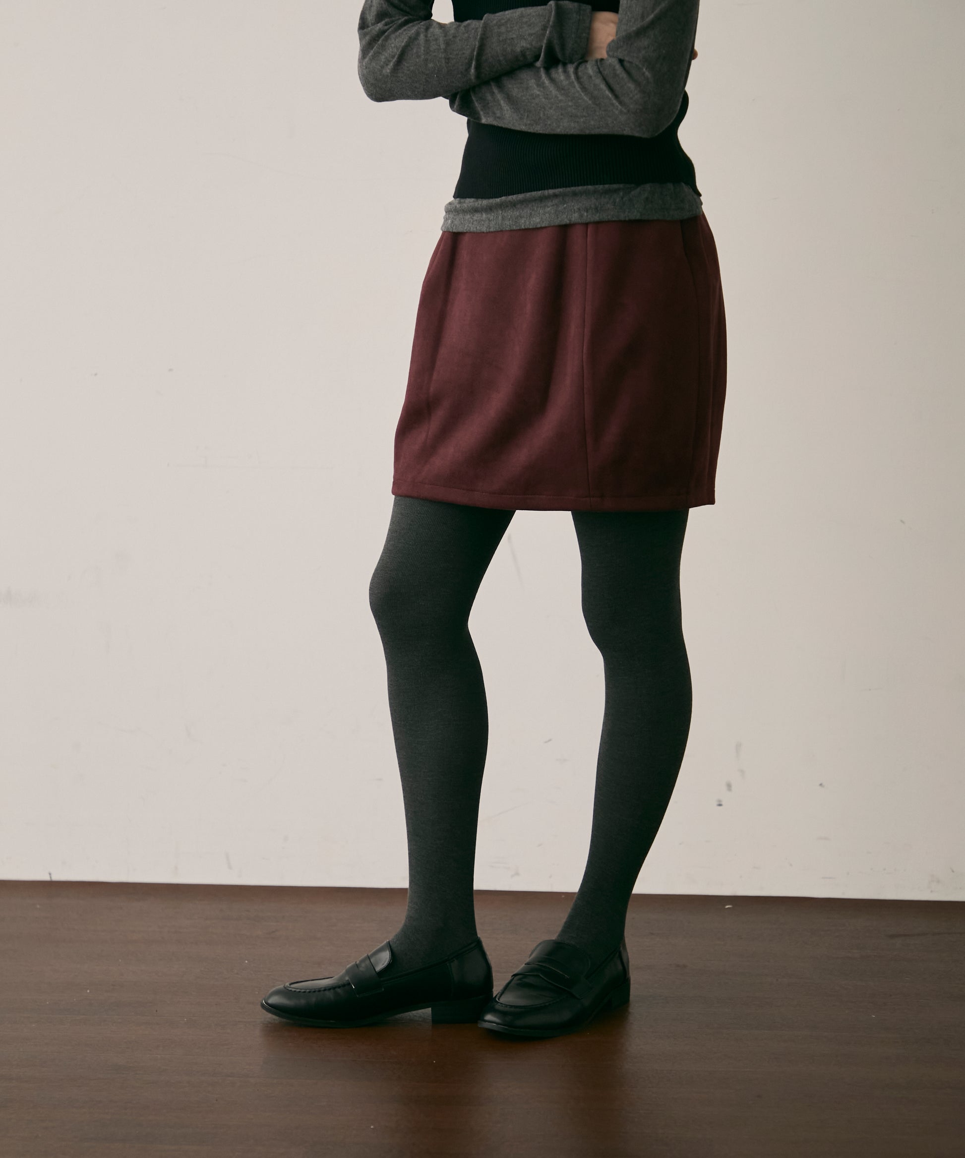 スエード調のしっとりとした風合いが魅力のコクーンスカート。程よいボリューム感が体型をさりげなくカバーしつつ、こなれ感のあるスタイリングを叶えます。ニットやスウェットとも好相性。