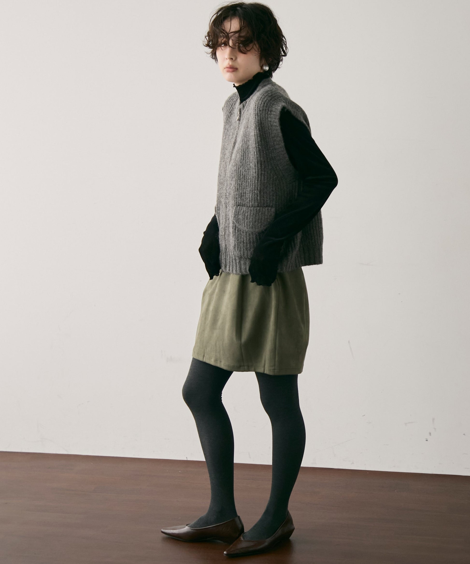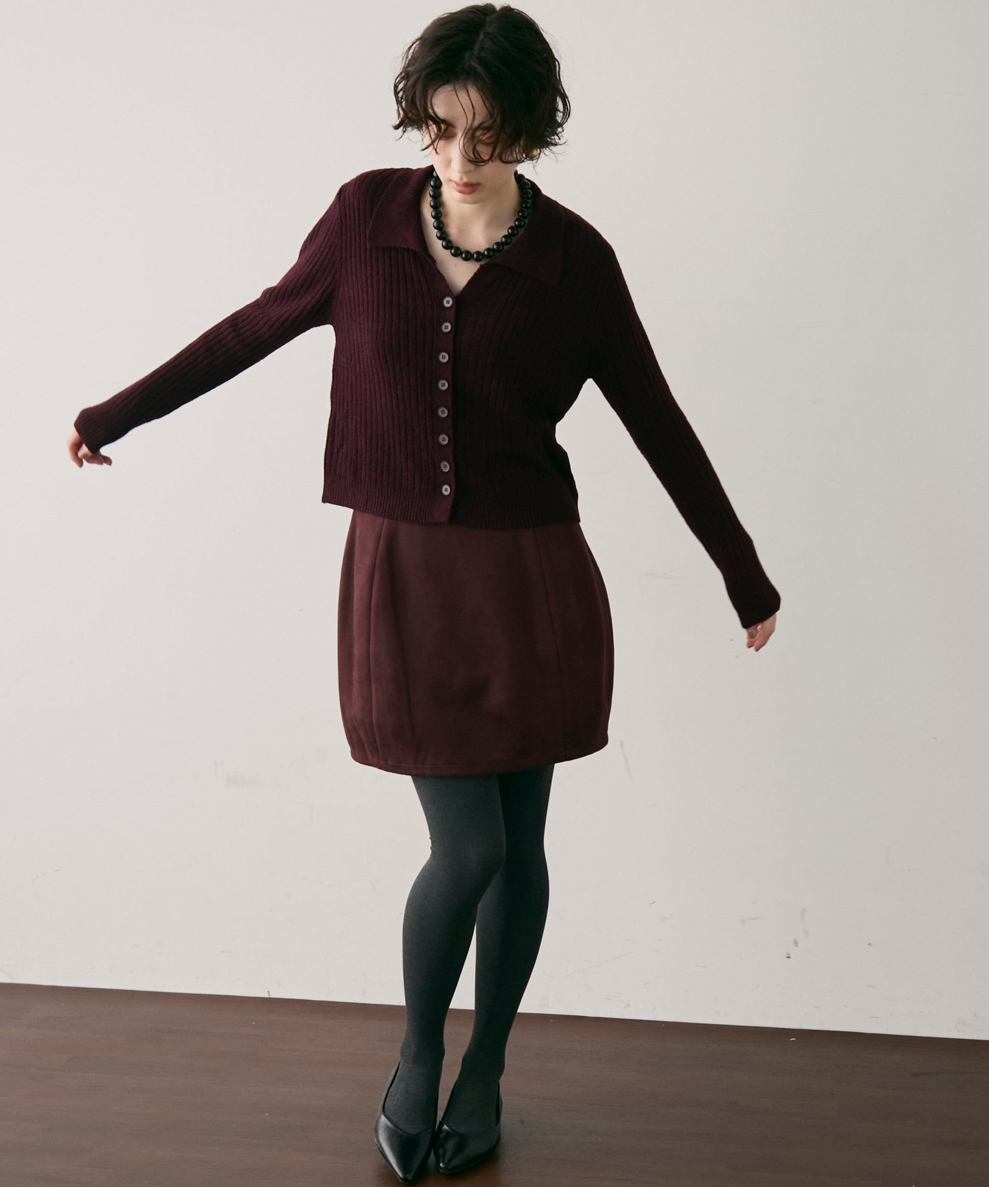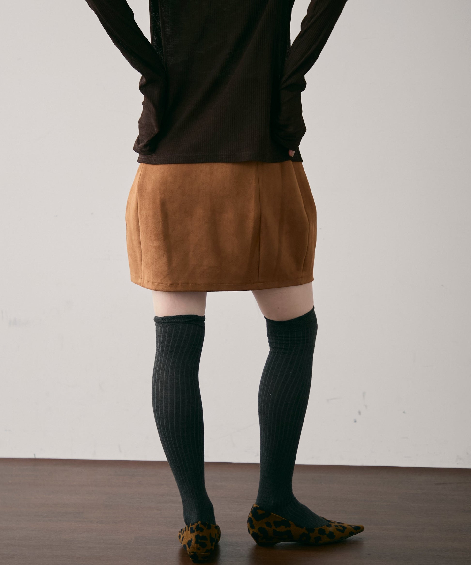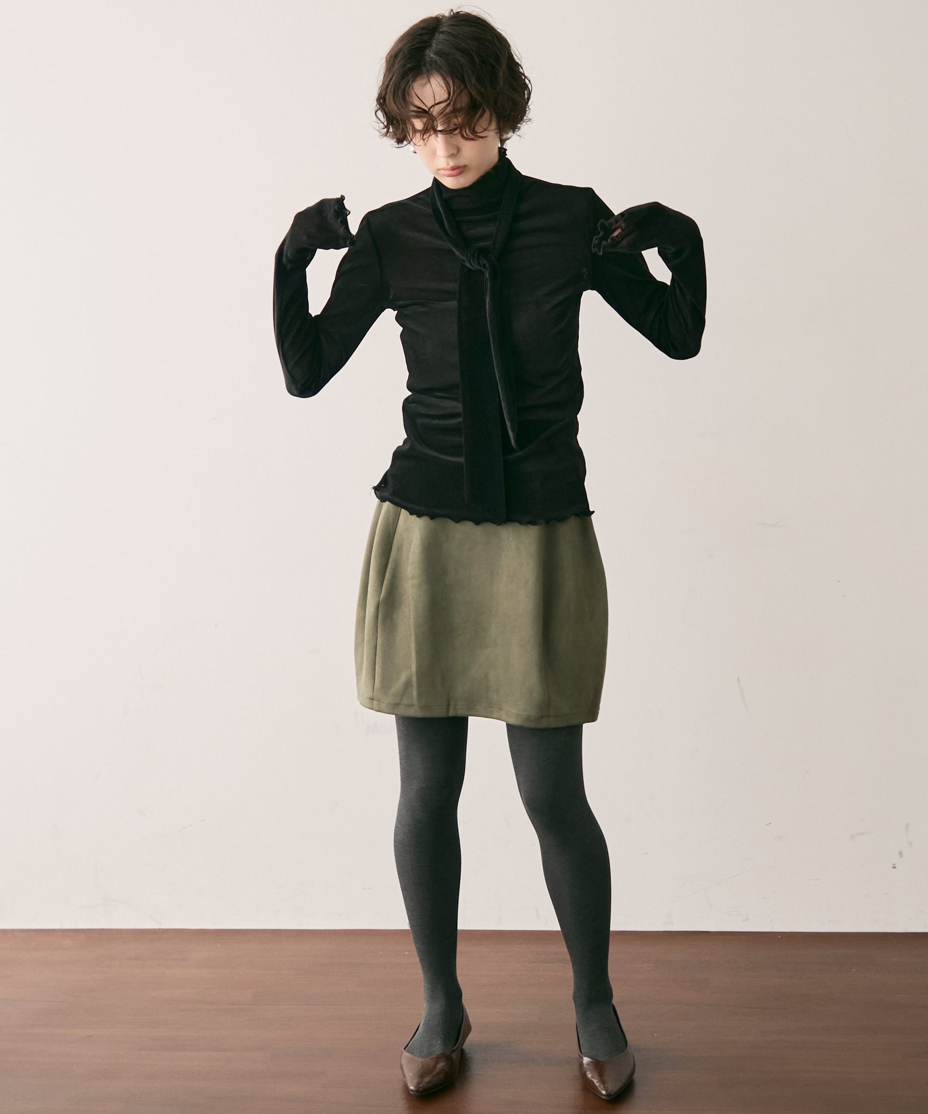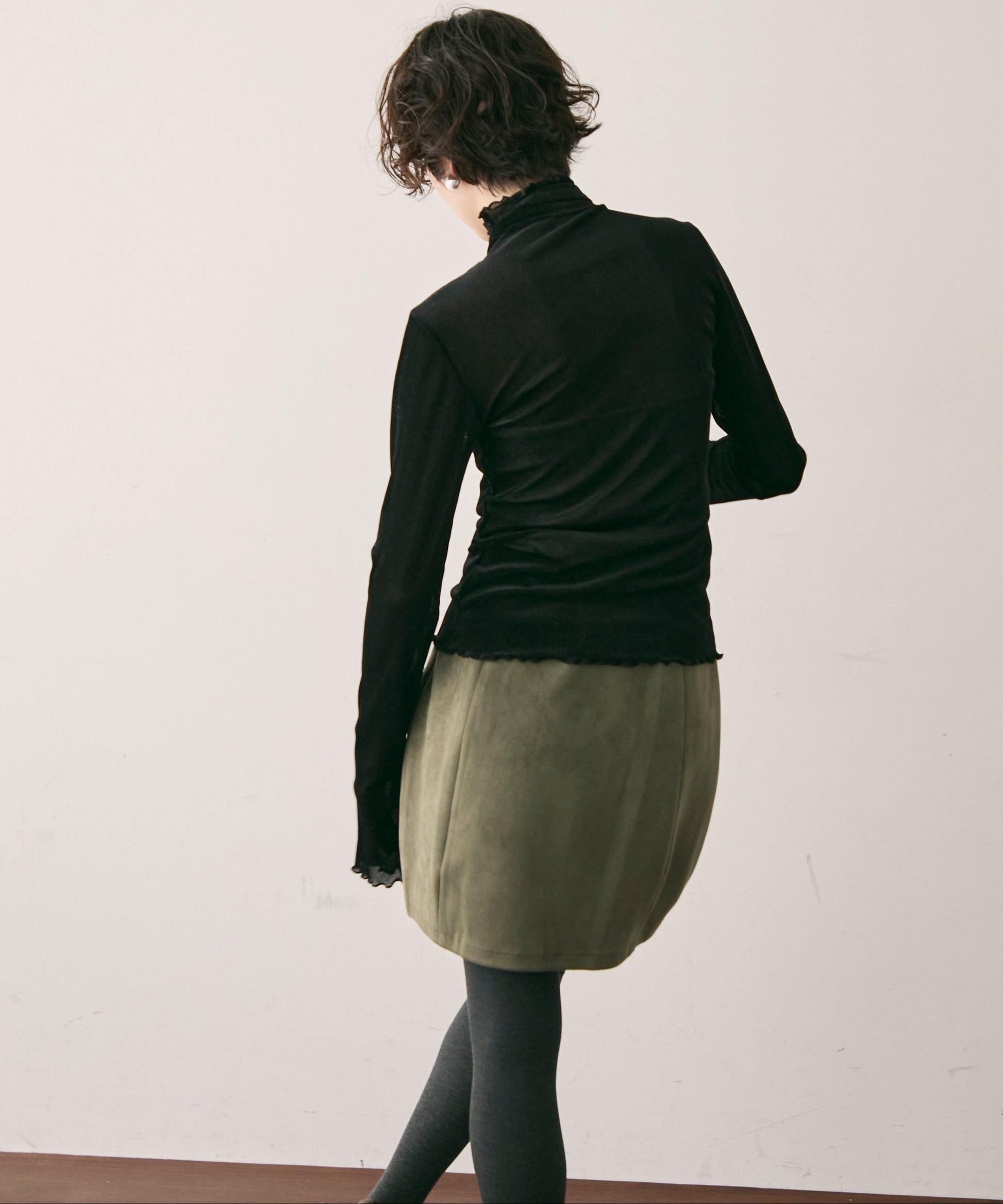 スエード調のしっとりとした風合いが魅力のコクーンスカート。程よいボリューム感が体型をさりげなくカバーしつつ、こなれ感のあるスタイリングを叶えます。ニットやスウェットとも好相性。