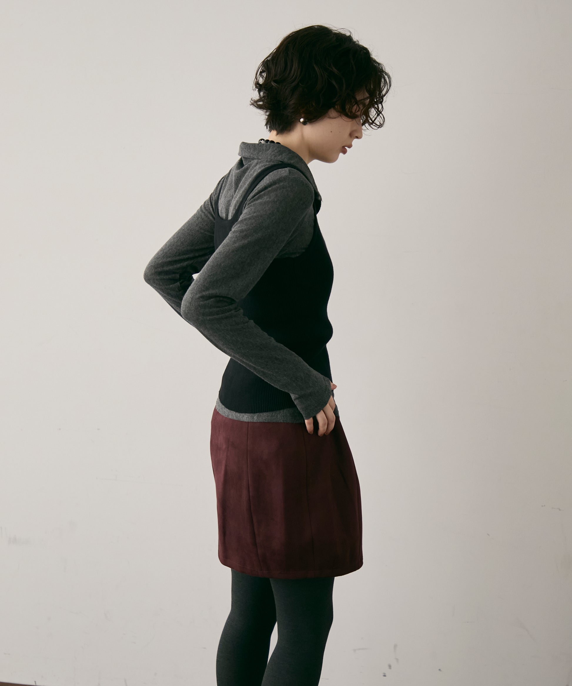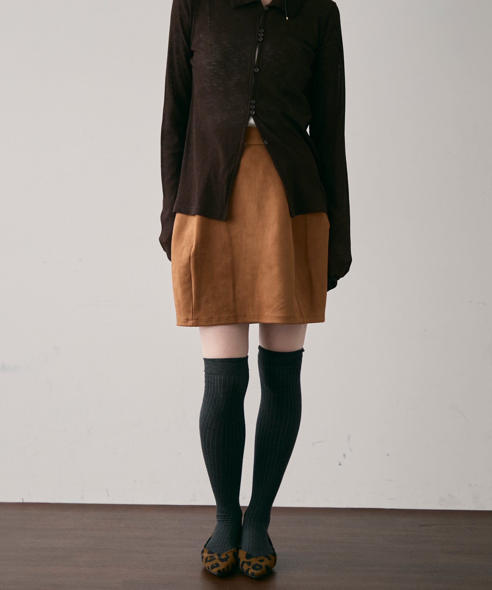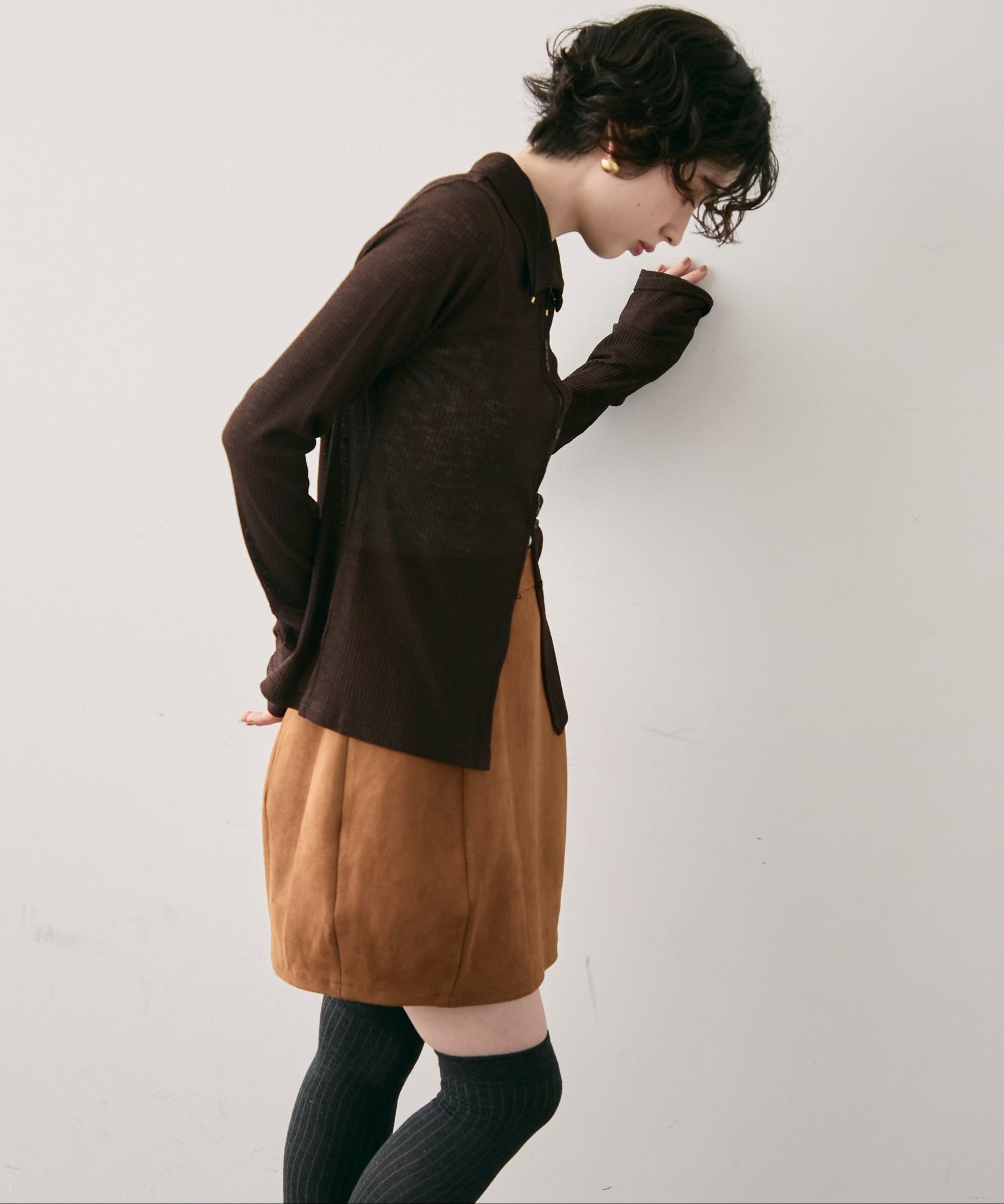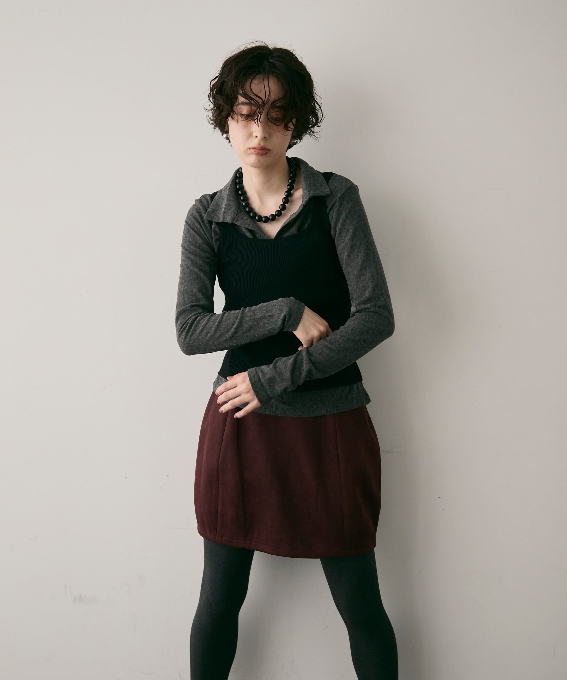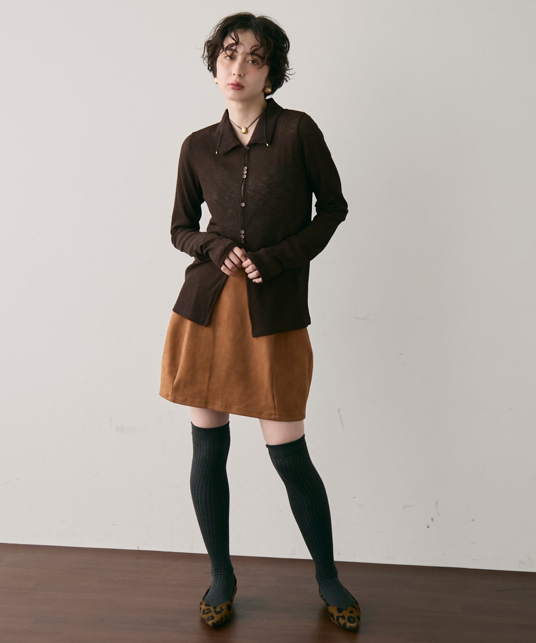 スエード調のしっとりとした風合いが魅力のコクーンスカート。程よいボリューム感が体型をさりげなくカバーしつつ、こなれ感のあるスタイリングを叶えます。ニットやスウェットとも好相性。