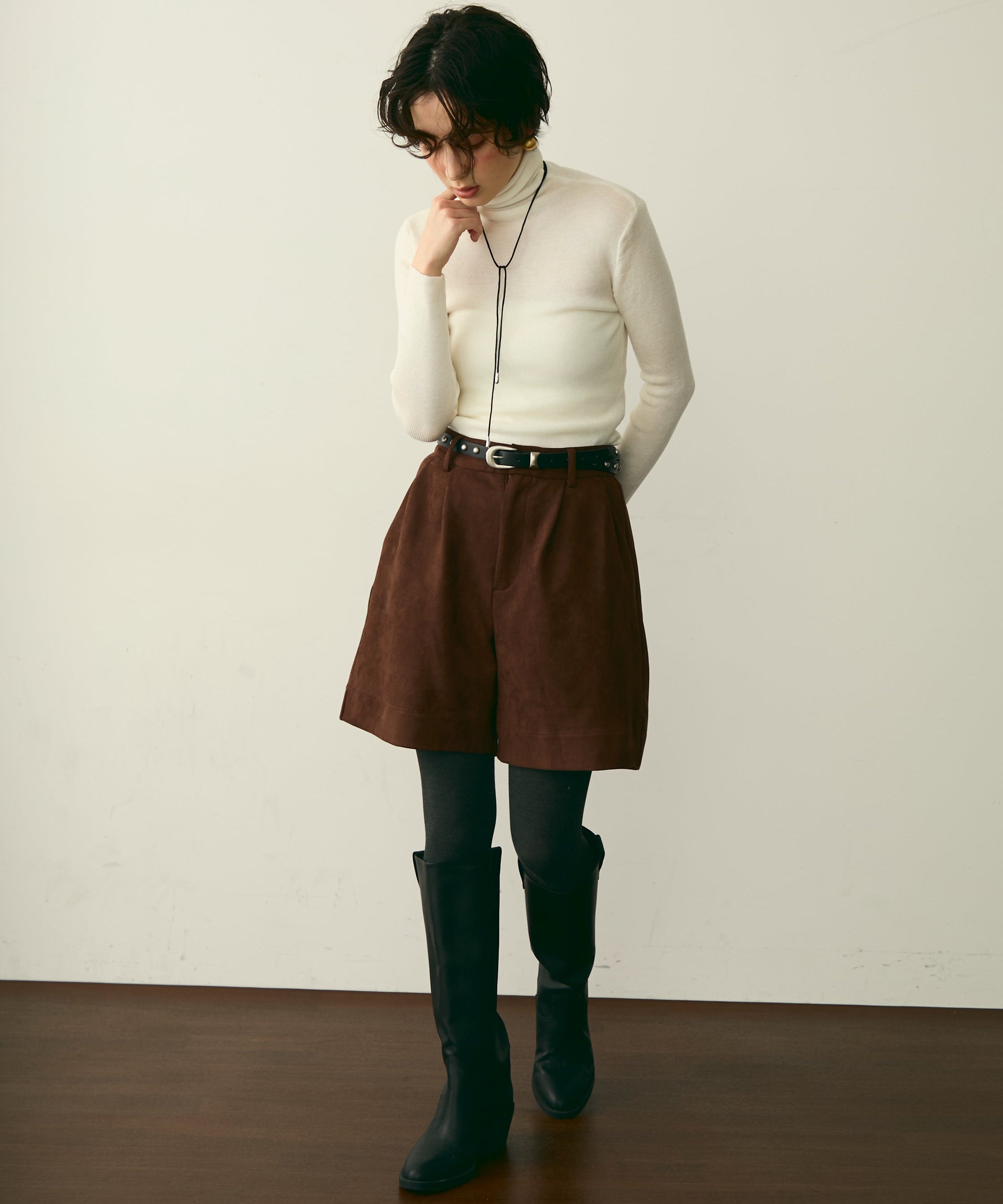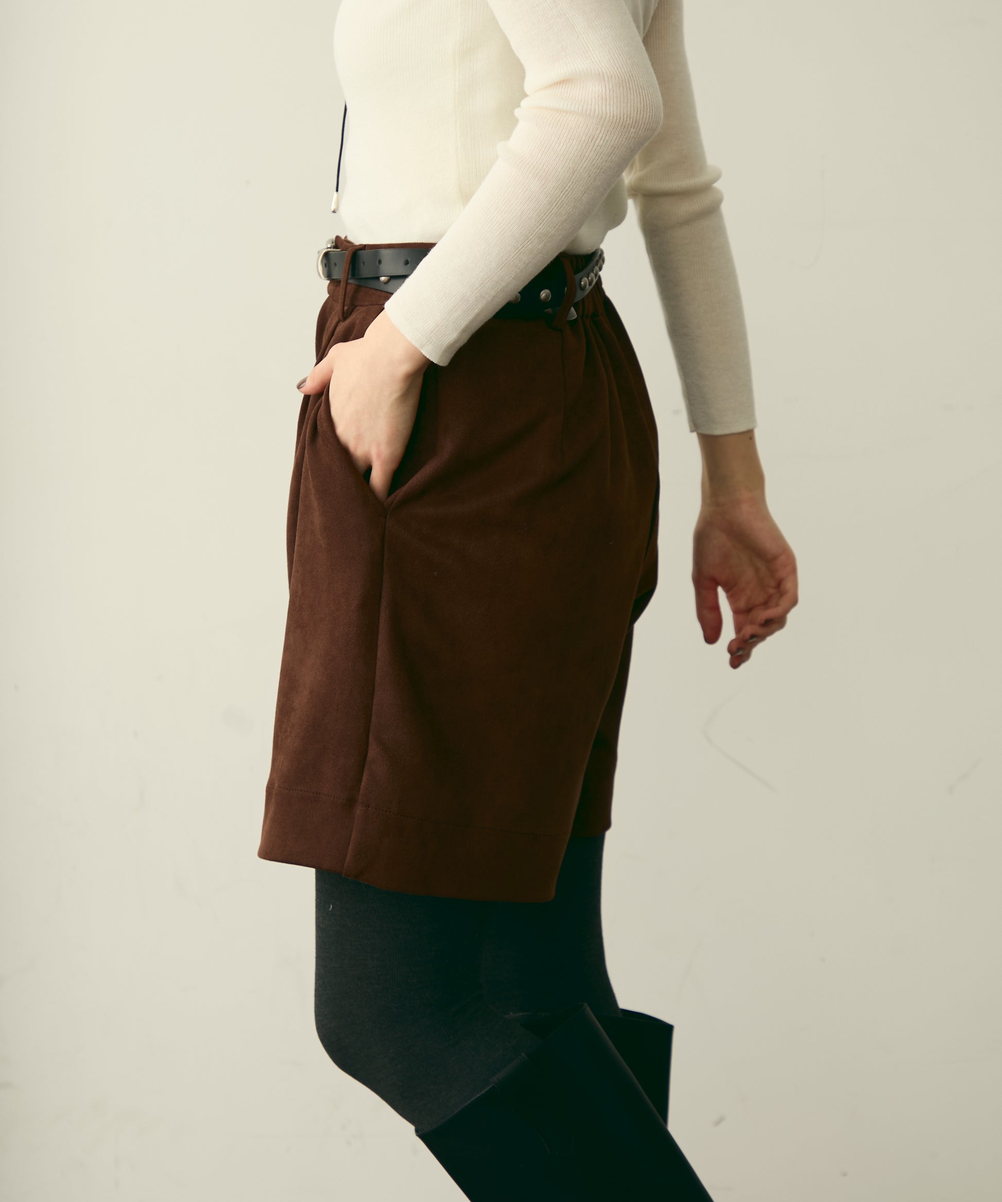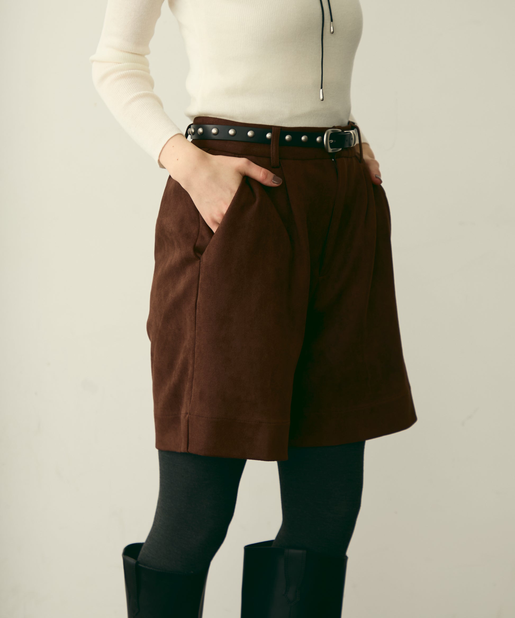 スエードライクタックハーフパンツなめらかなスエード調素材が高見えするタック入りハーフパンツ。