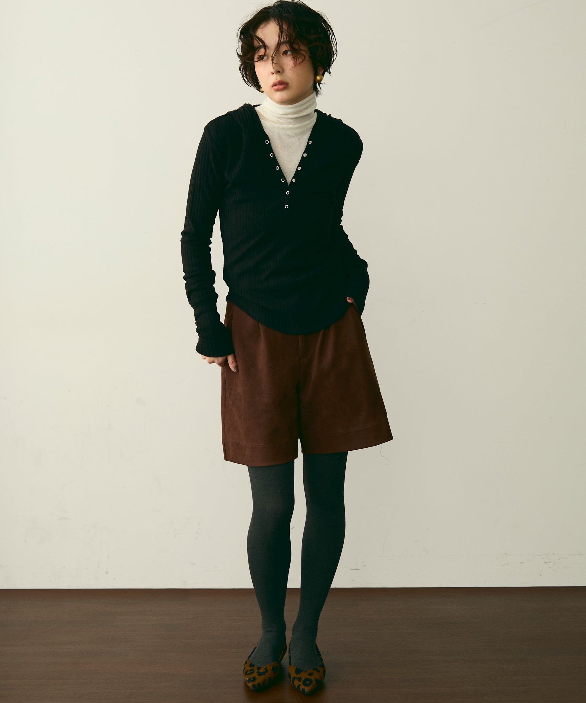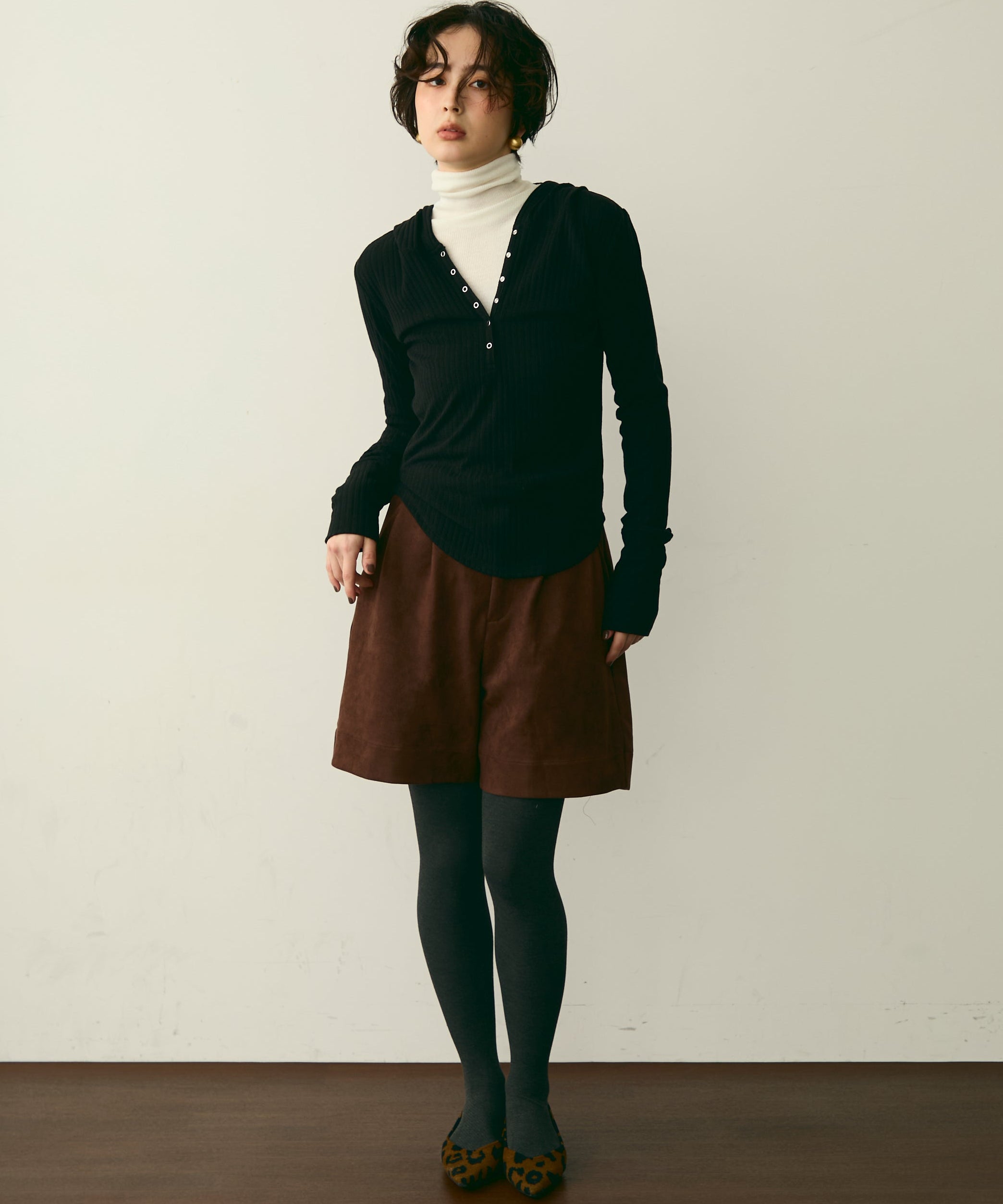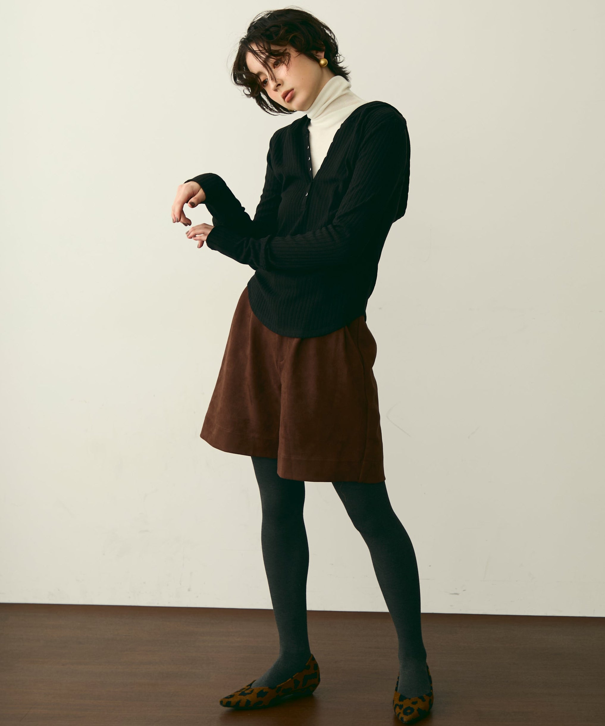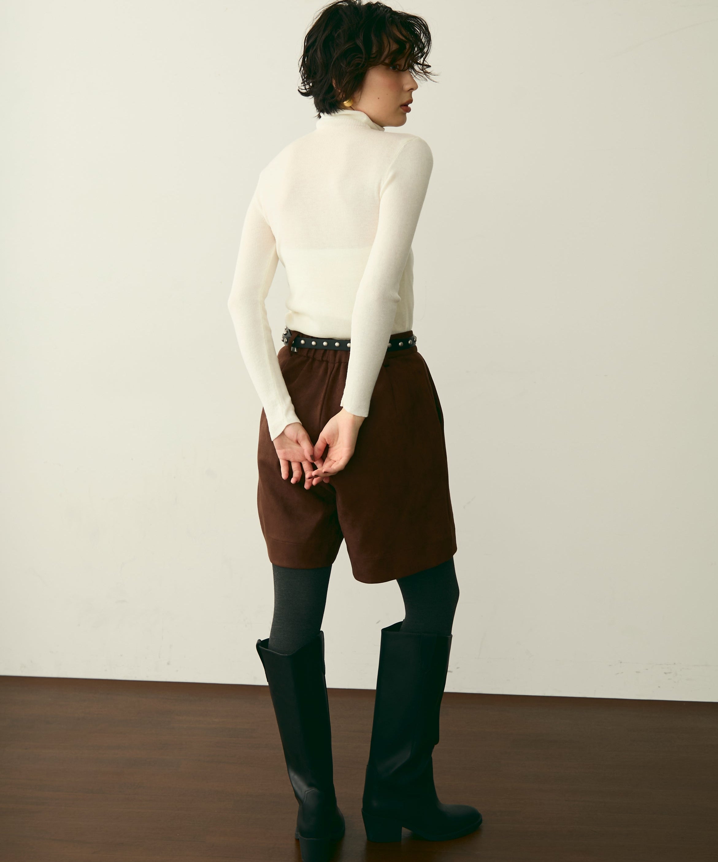 スエードライクタックハーフパンツなめらかなスエード調素材が高見えするタック入りハーフパンツ。