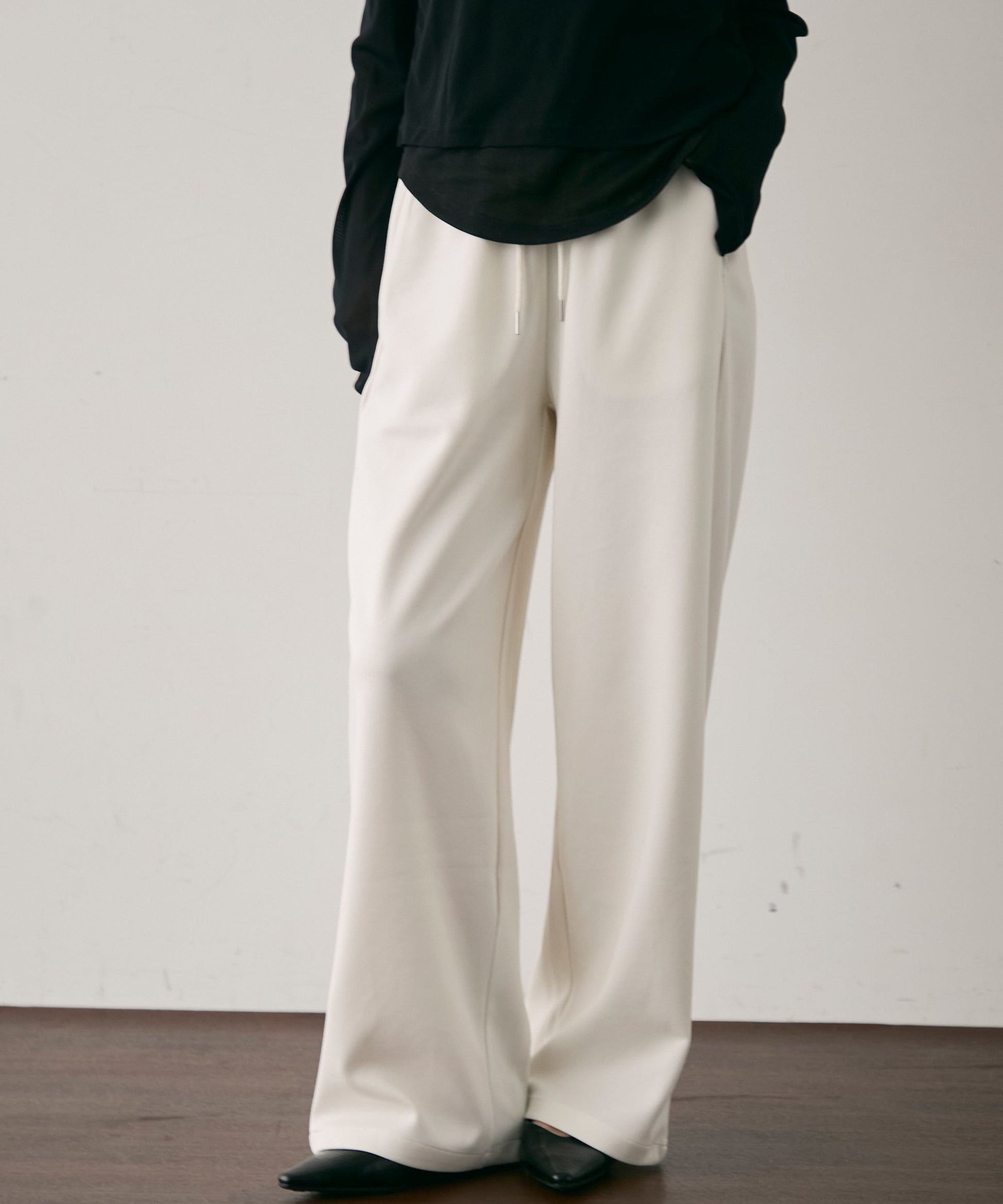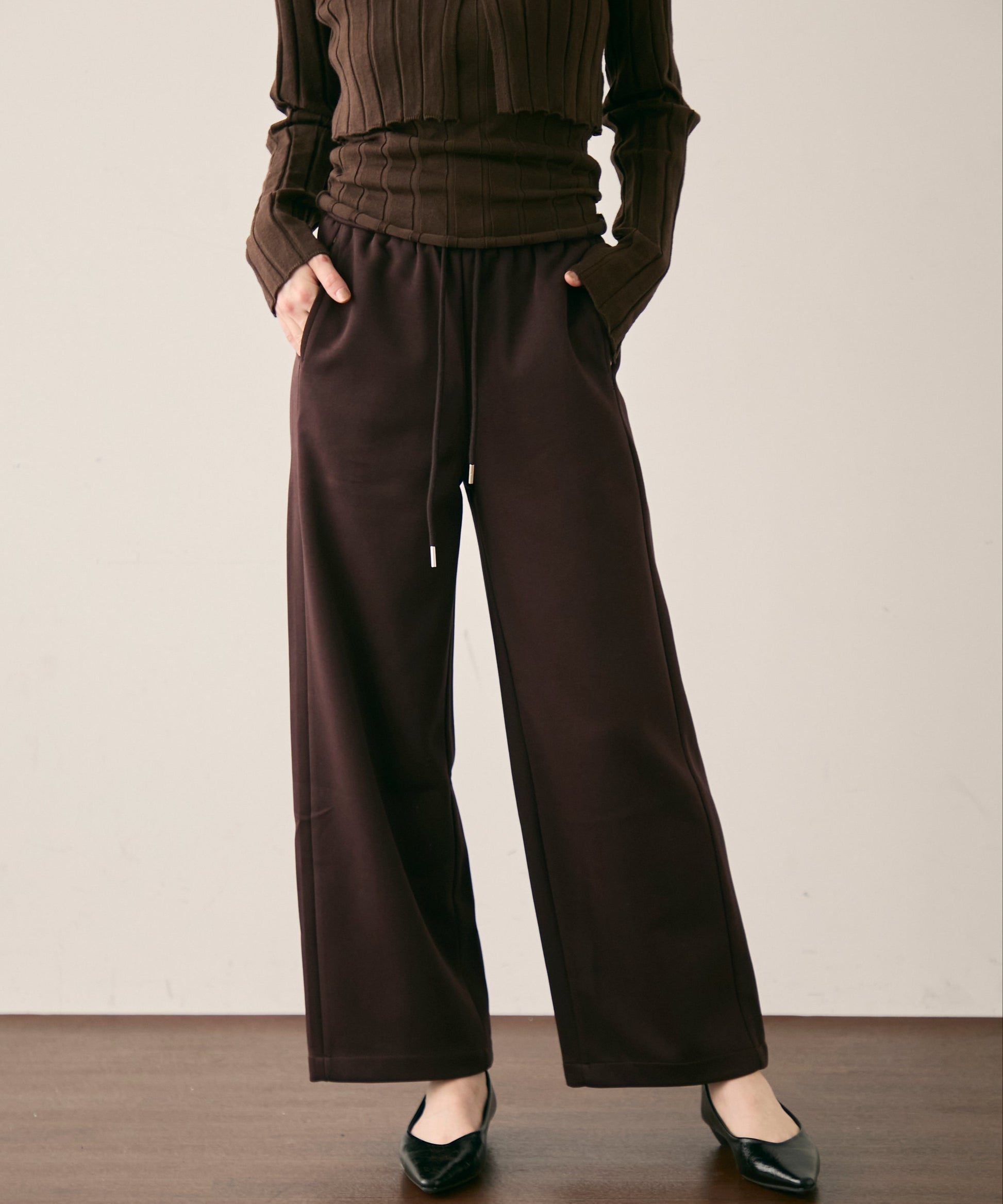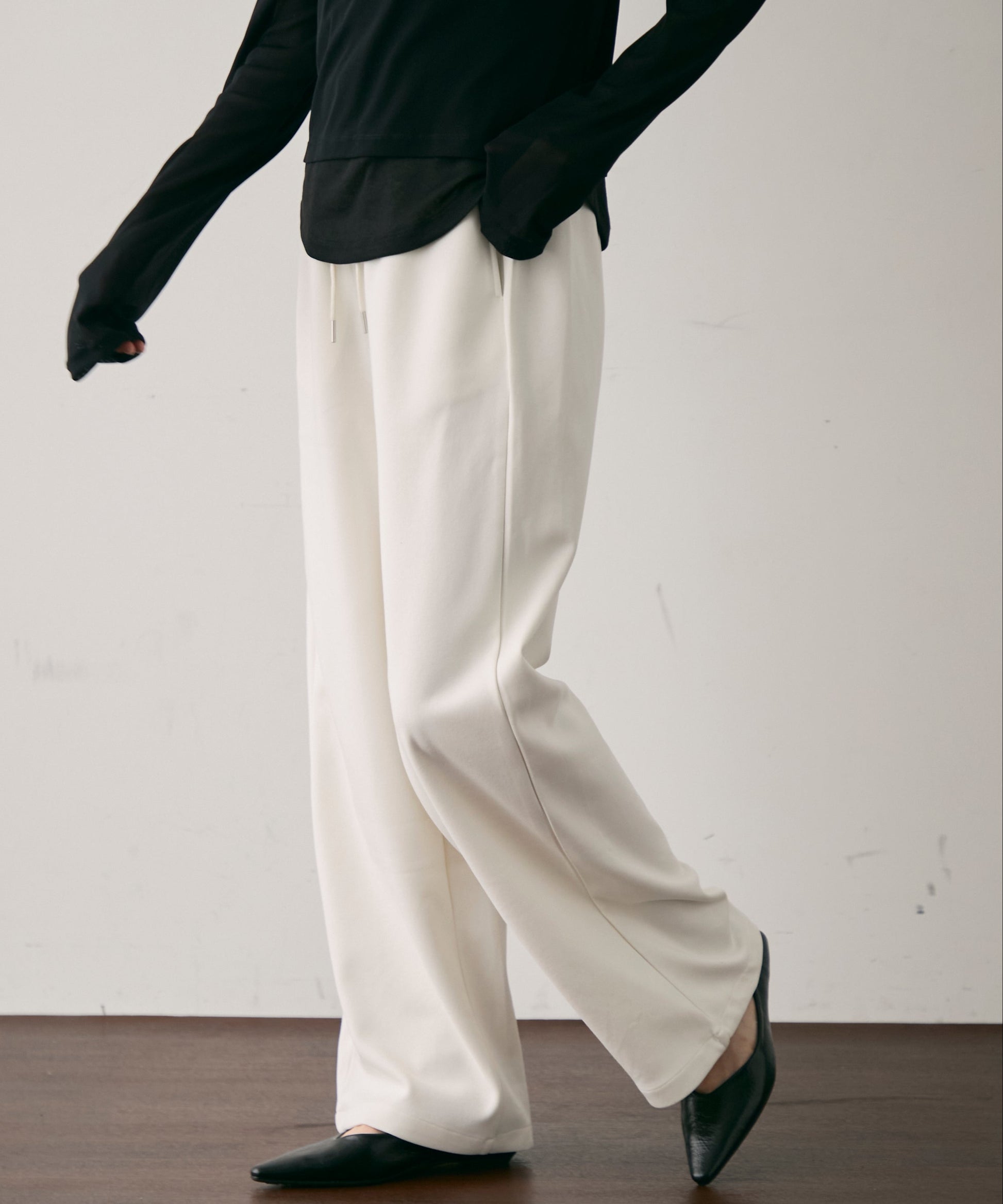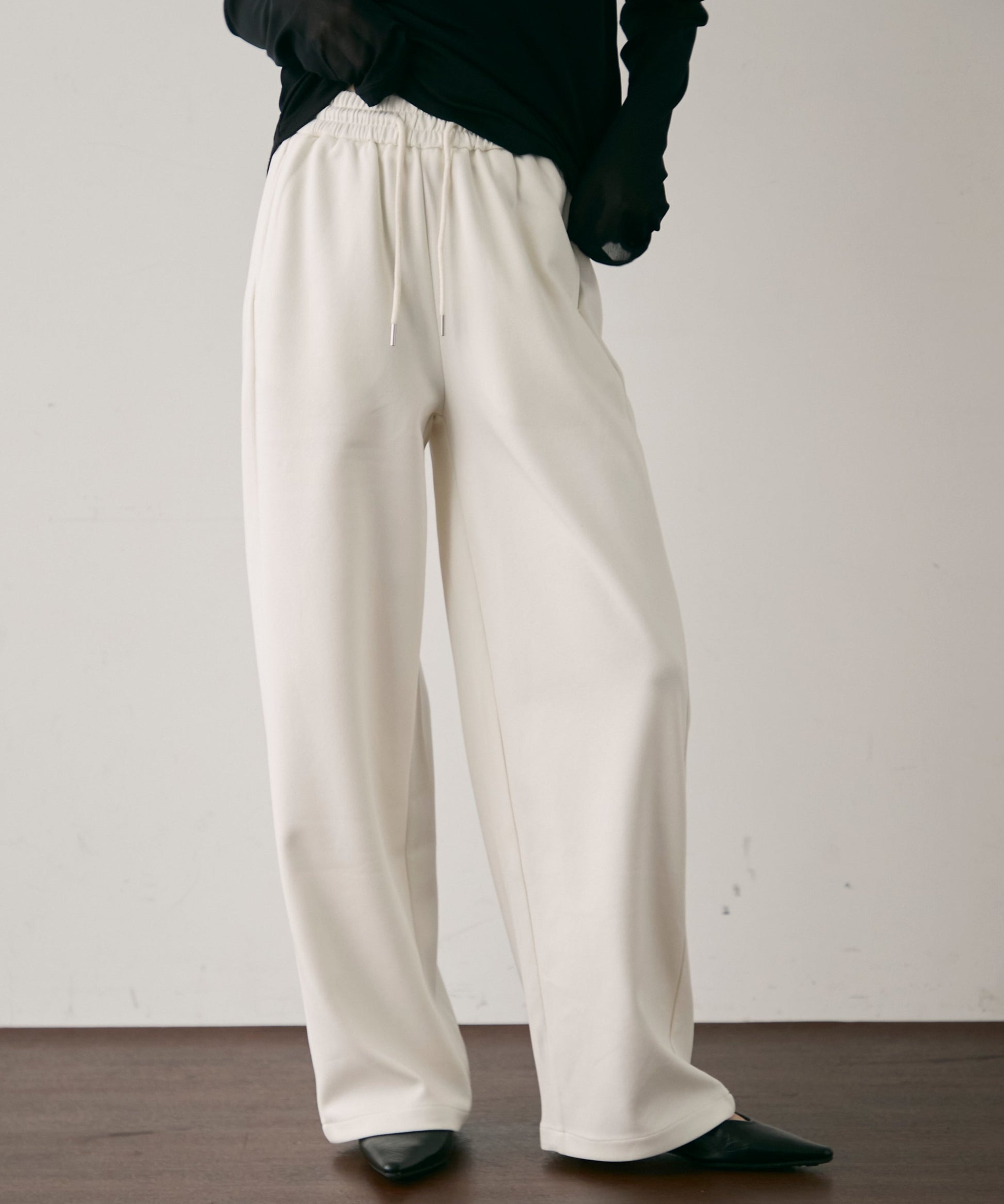 ウエストのドローストリングでフィット感を調整できるスウェットパンツ。