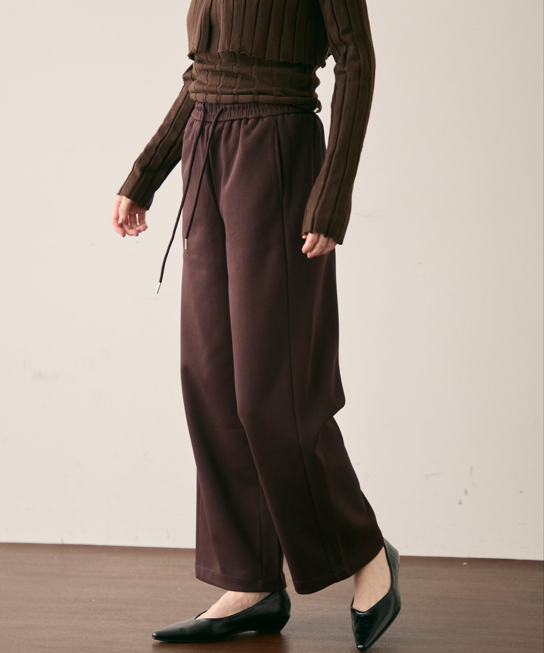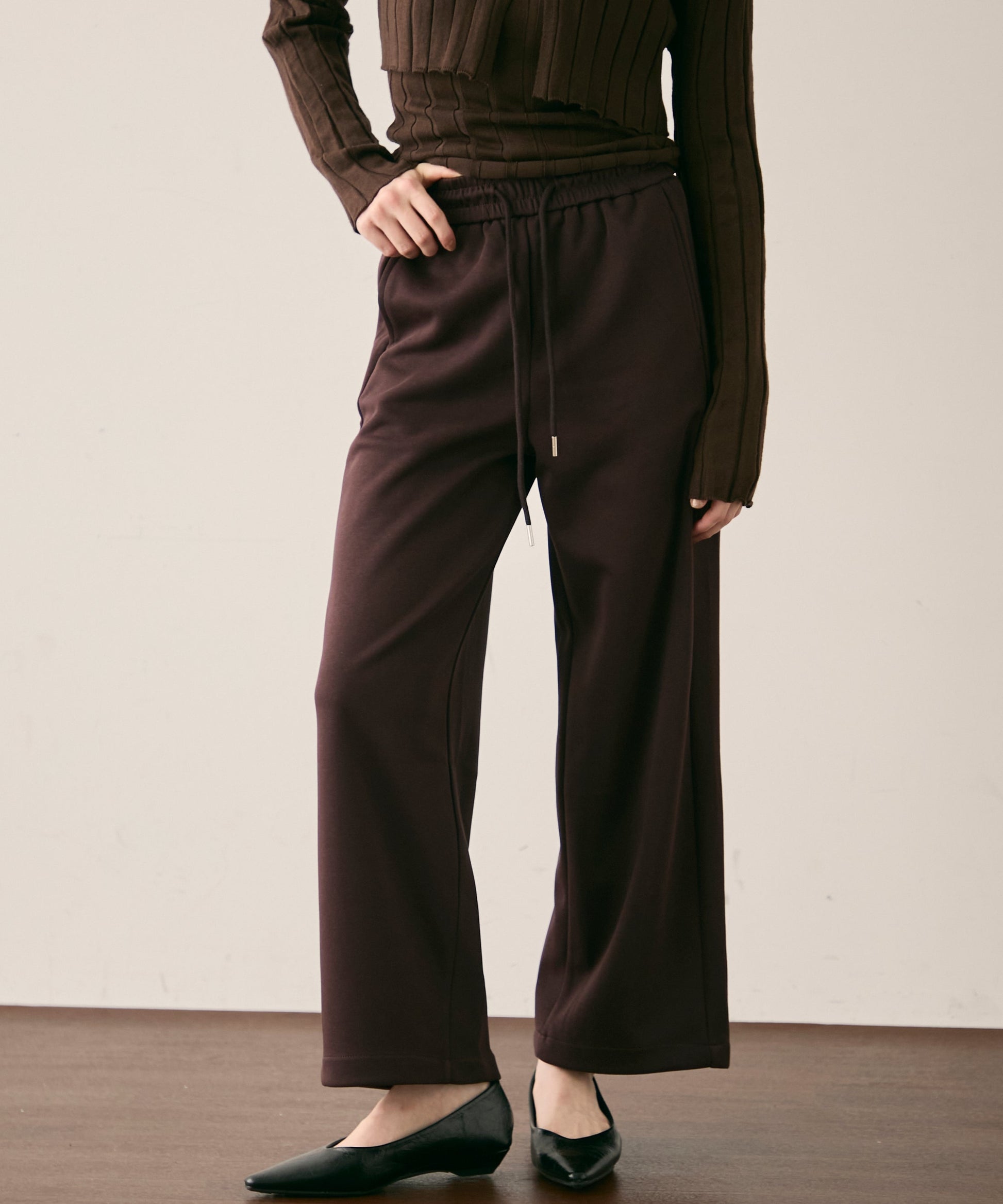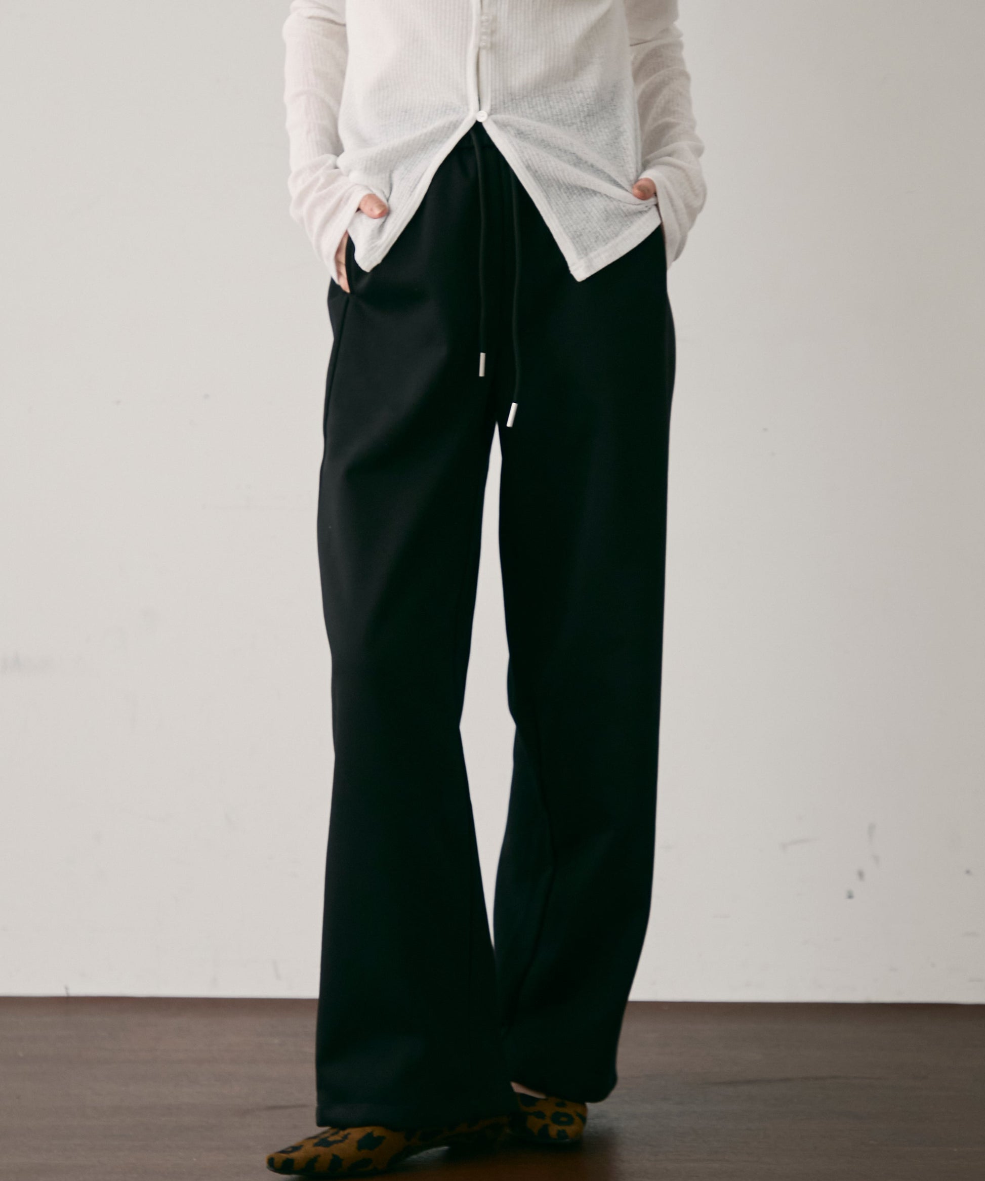 ウエストのドローストリングでフィット感を調整できるスウェットパンツ。