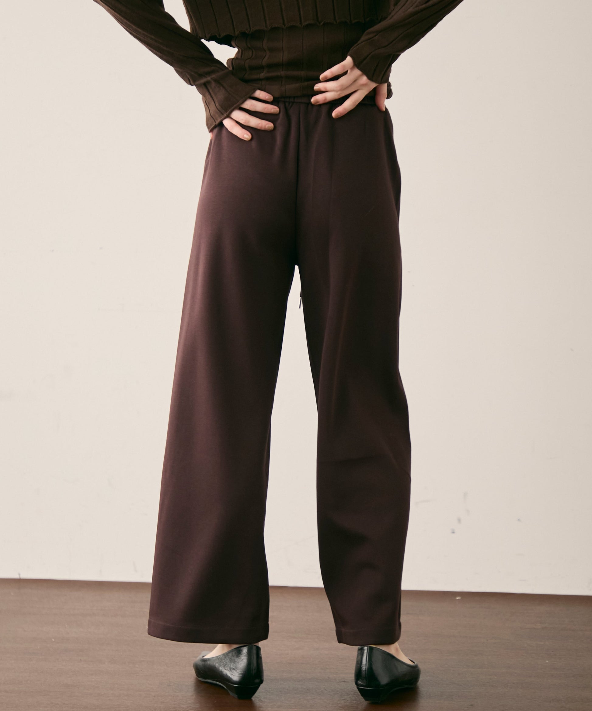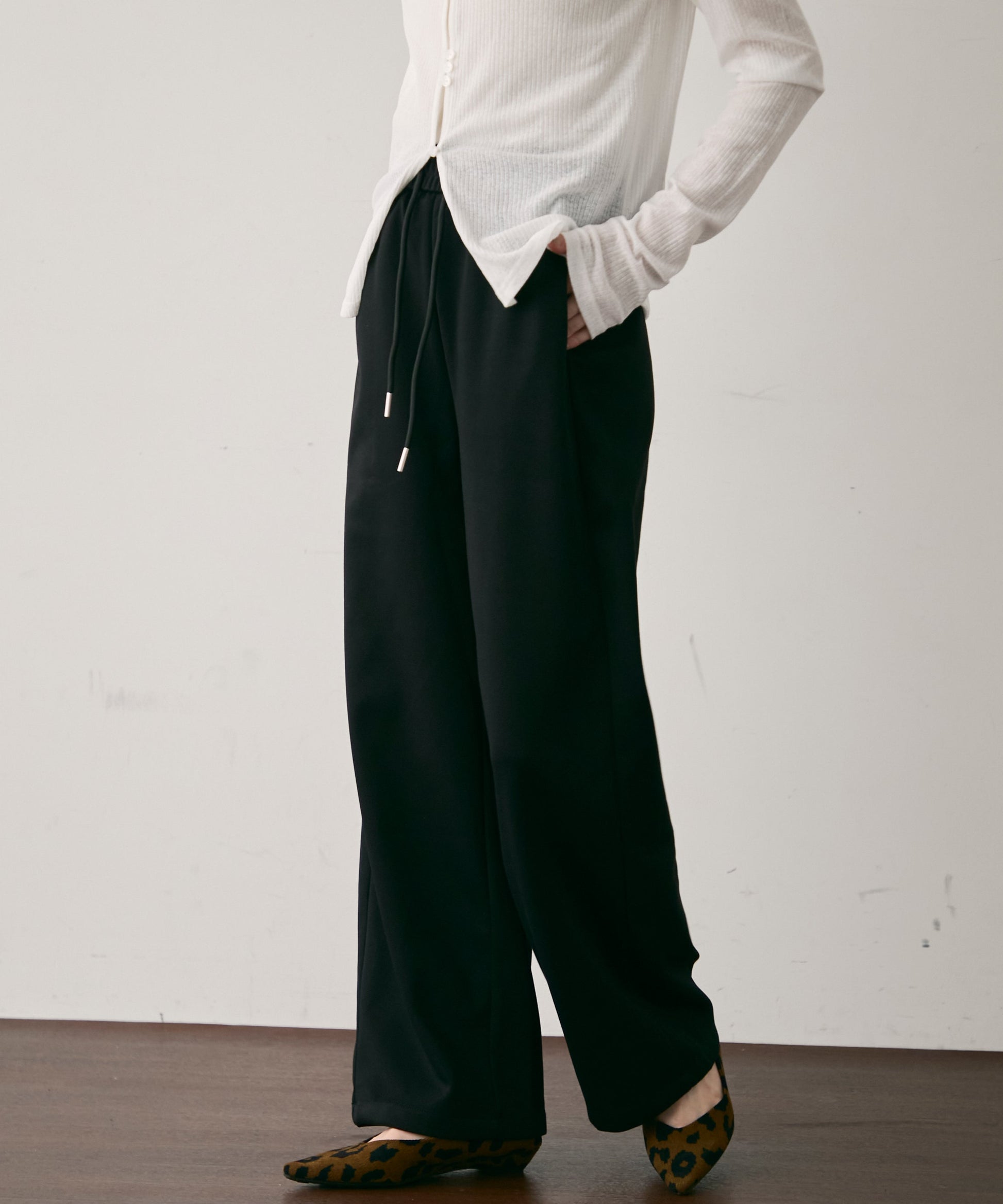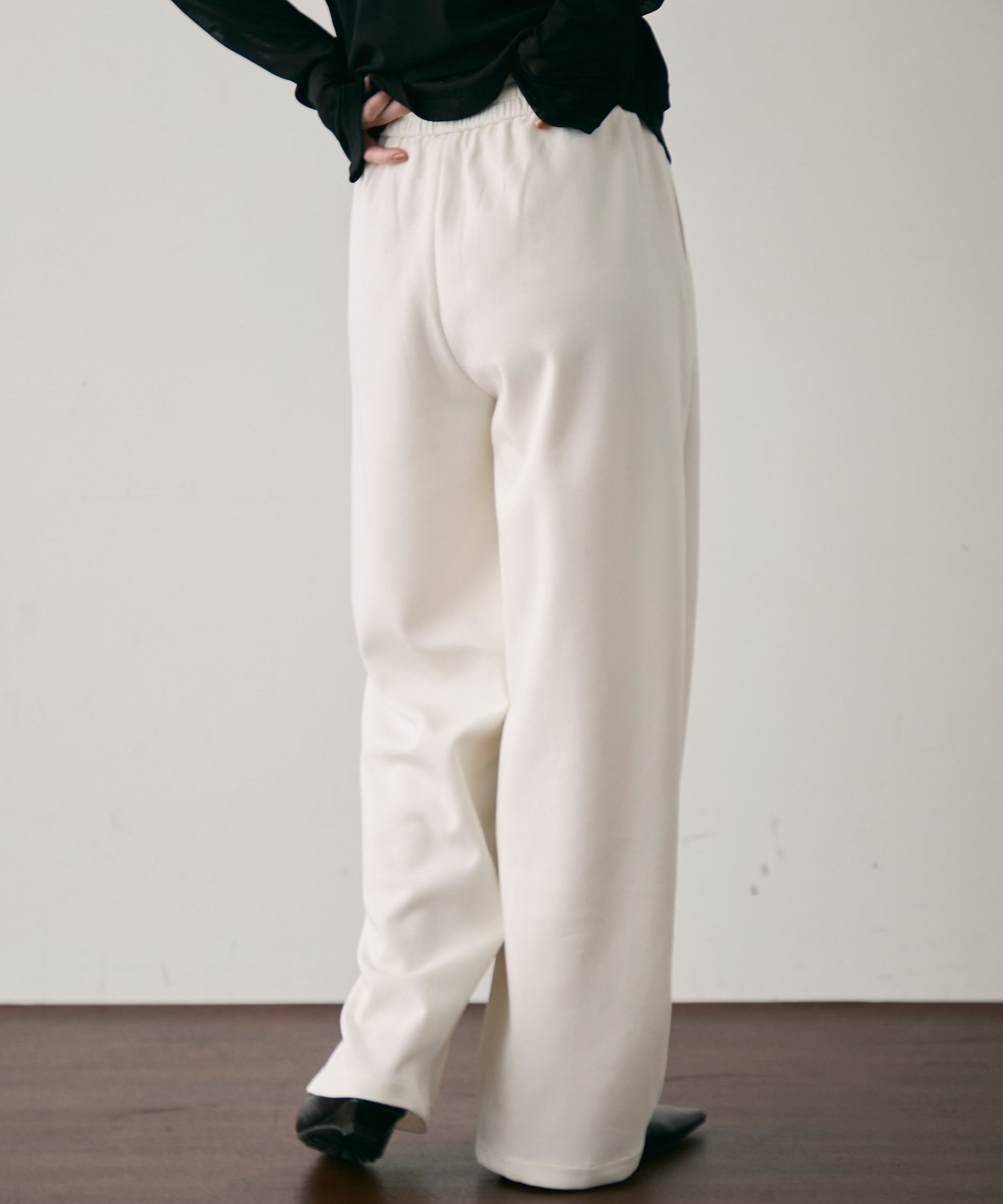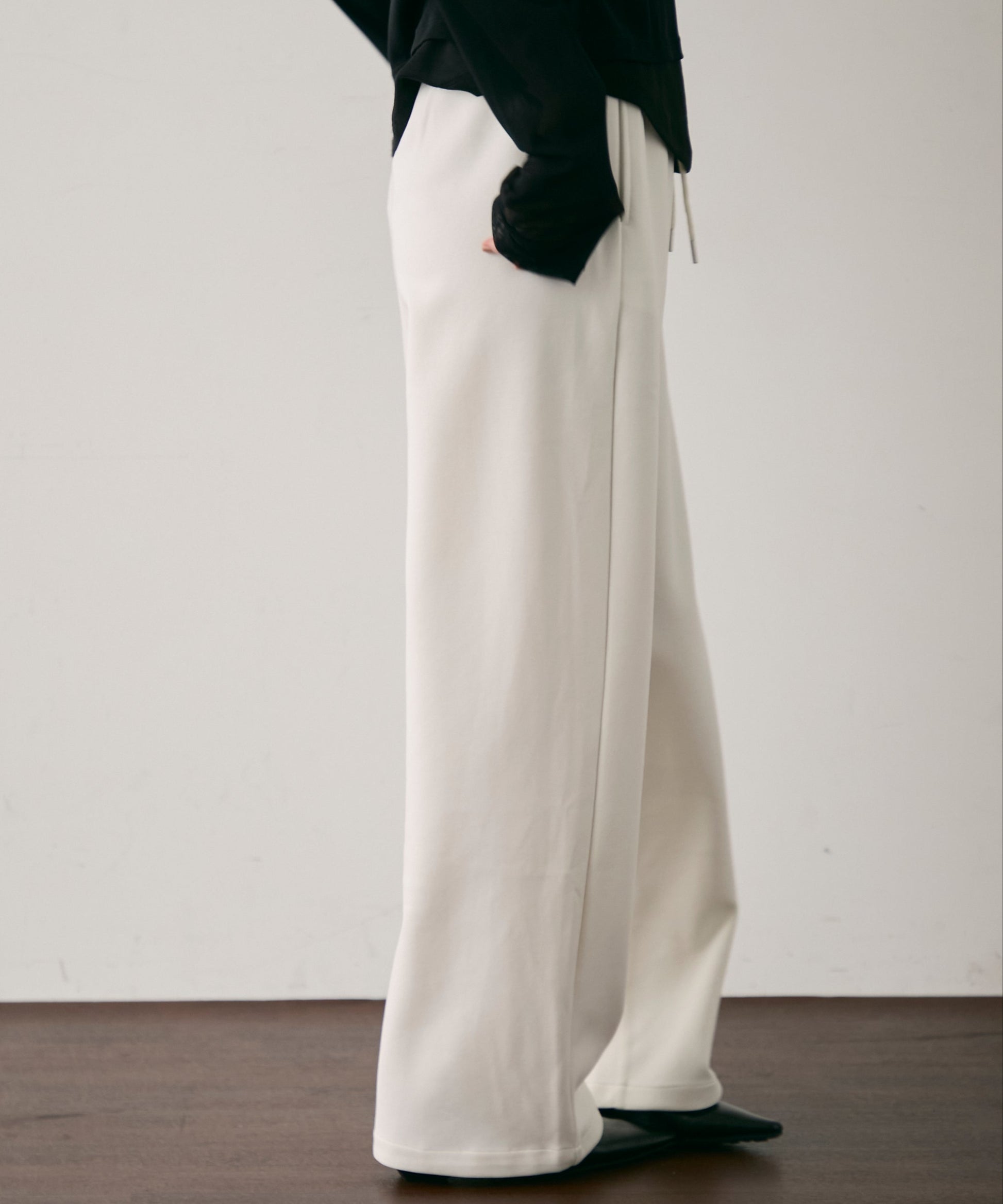 ウエストのドローストリングでフィット感を調整できるスウェットパンツ。