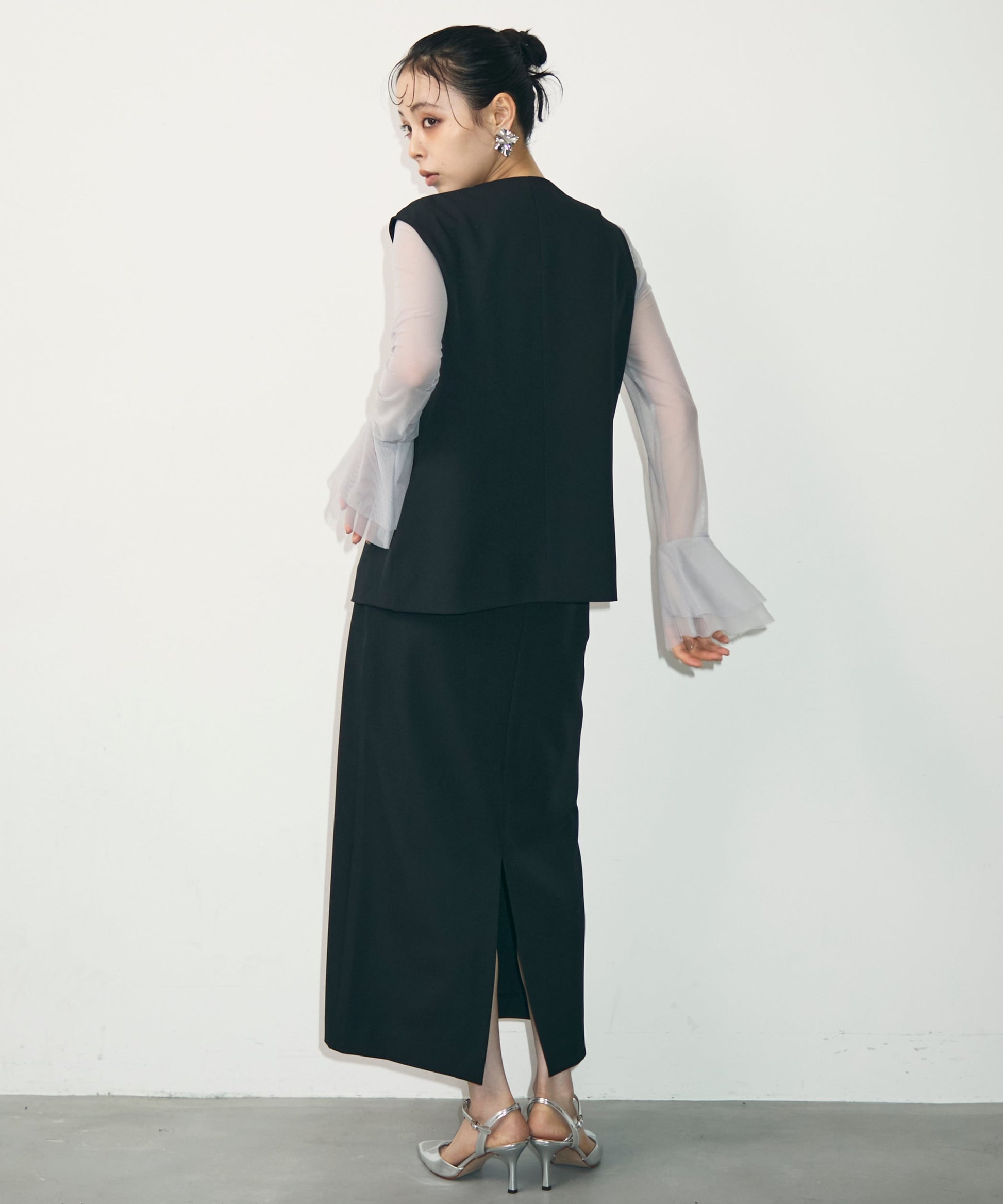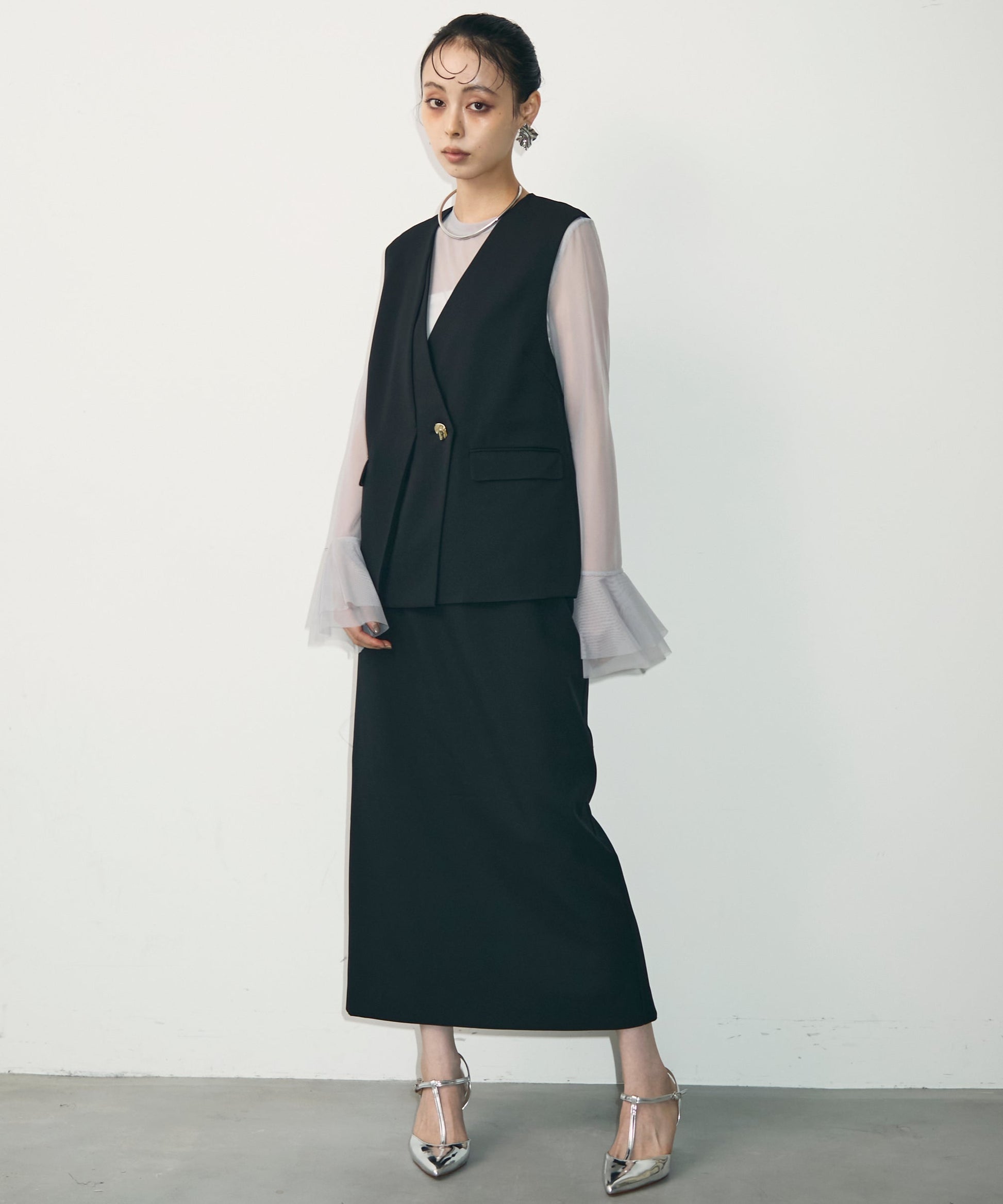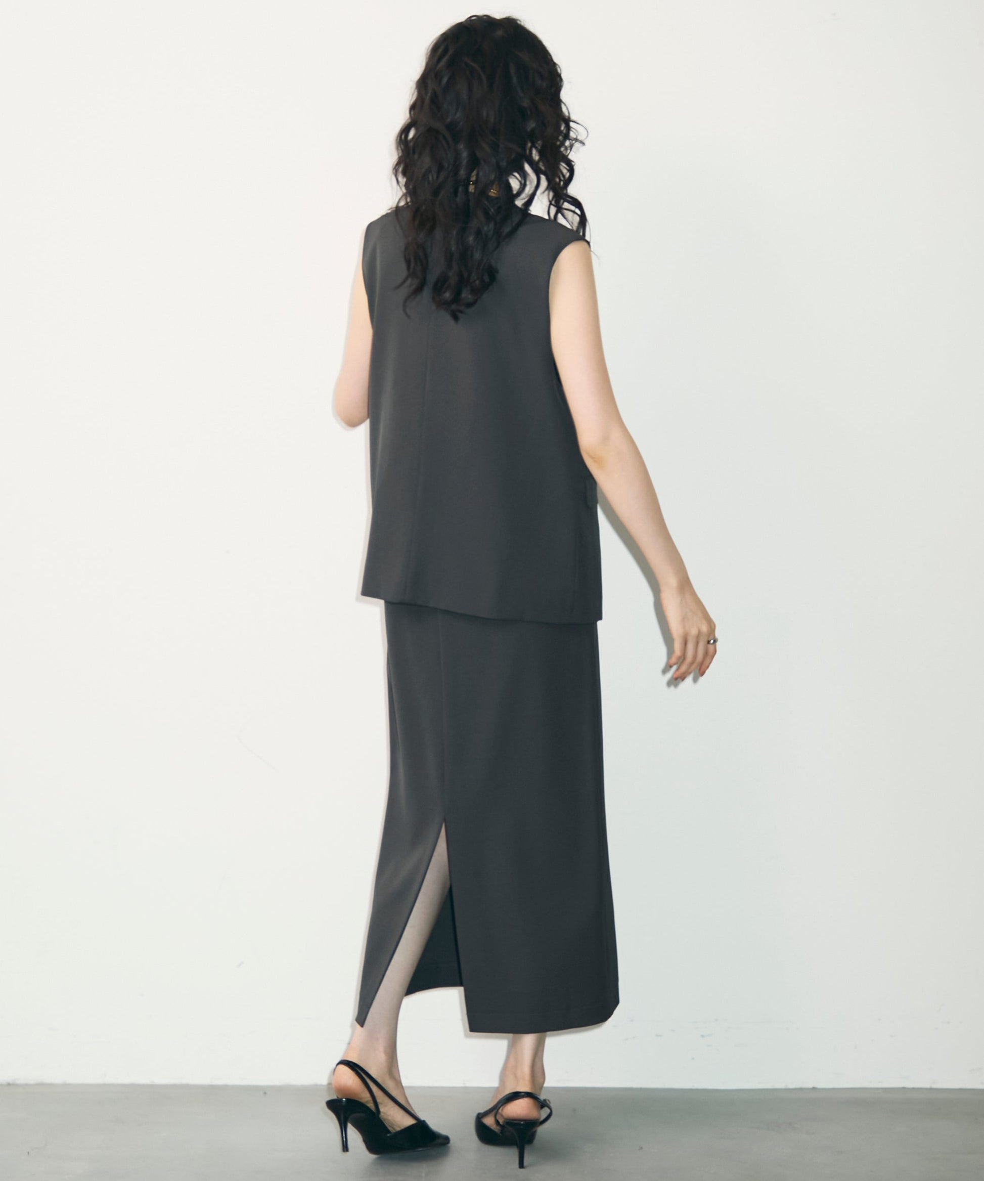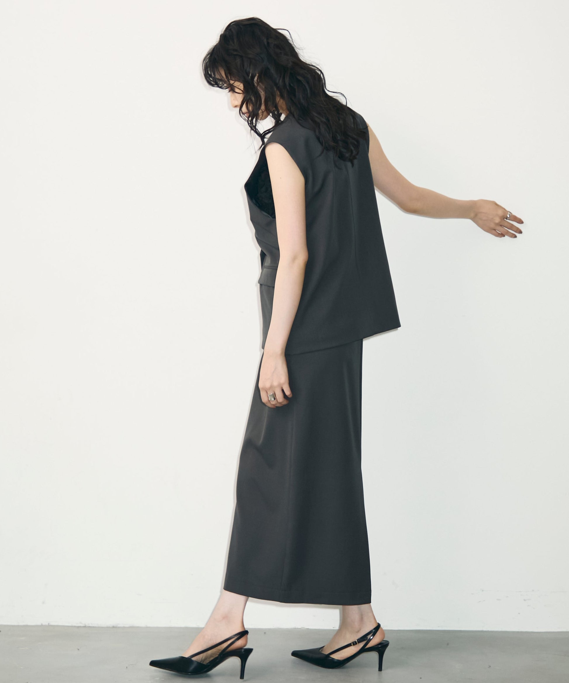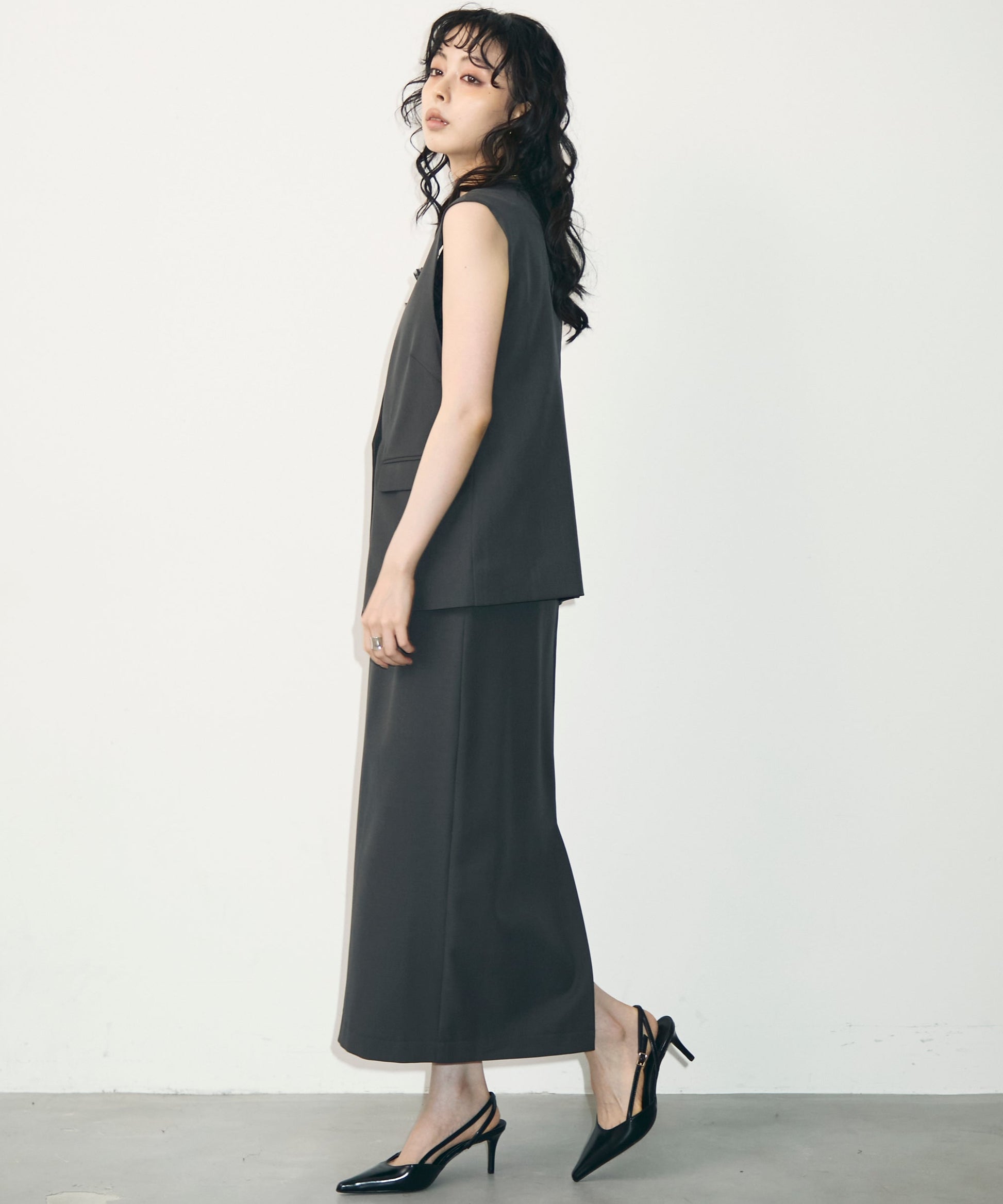 きちんと感を演出できるノーカラーベストとスカートのSETUPです。