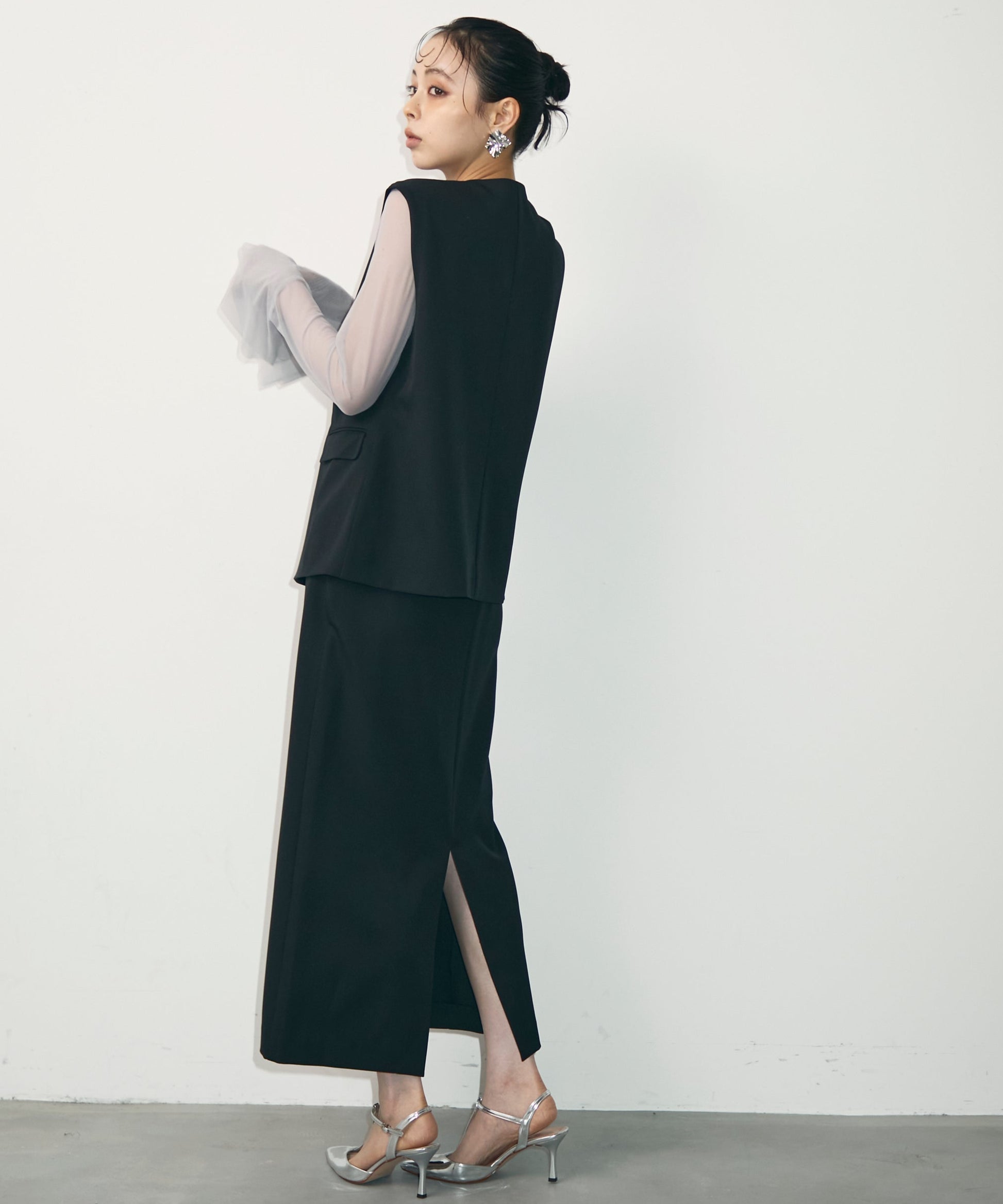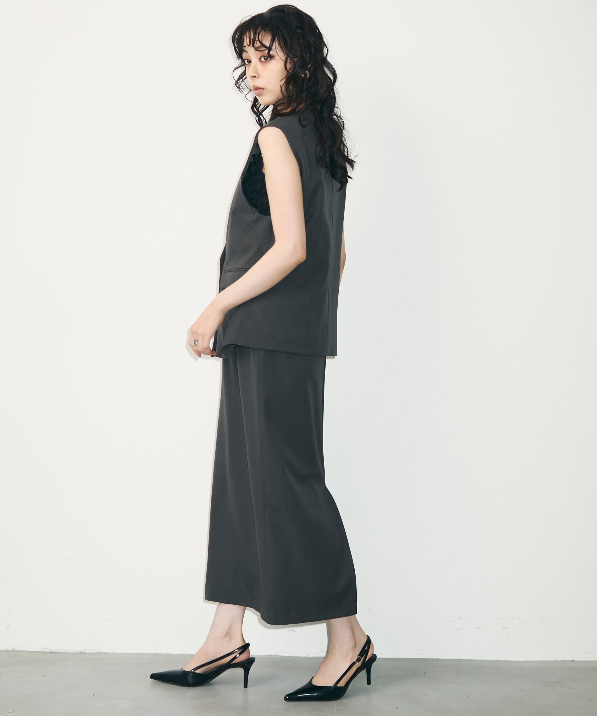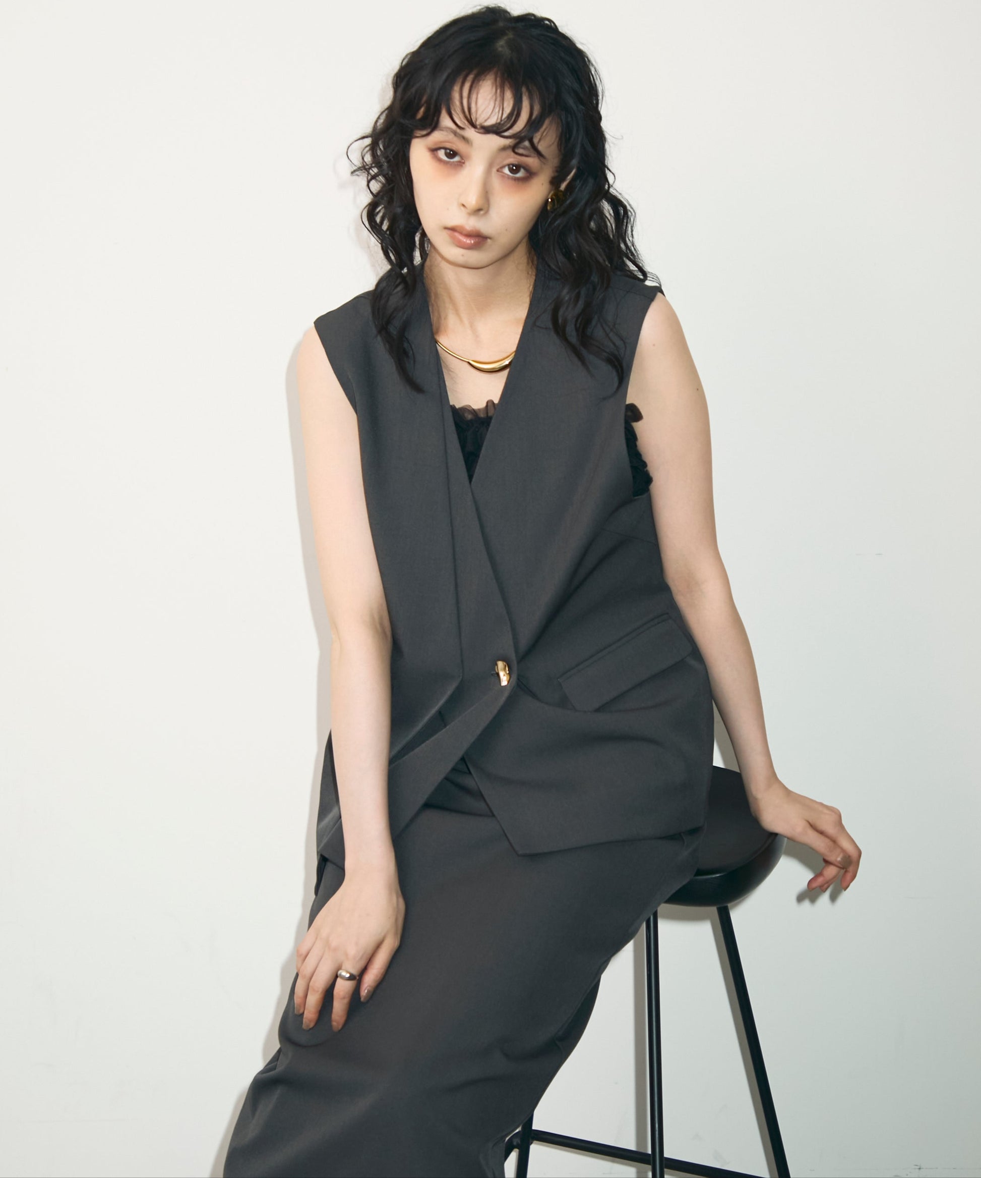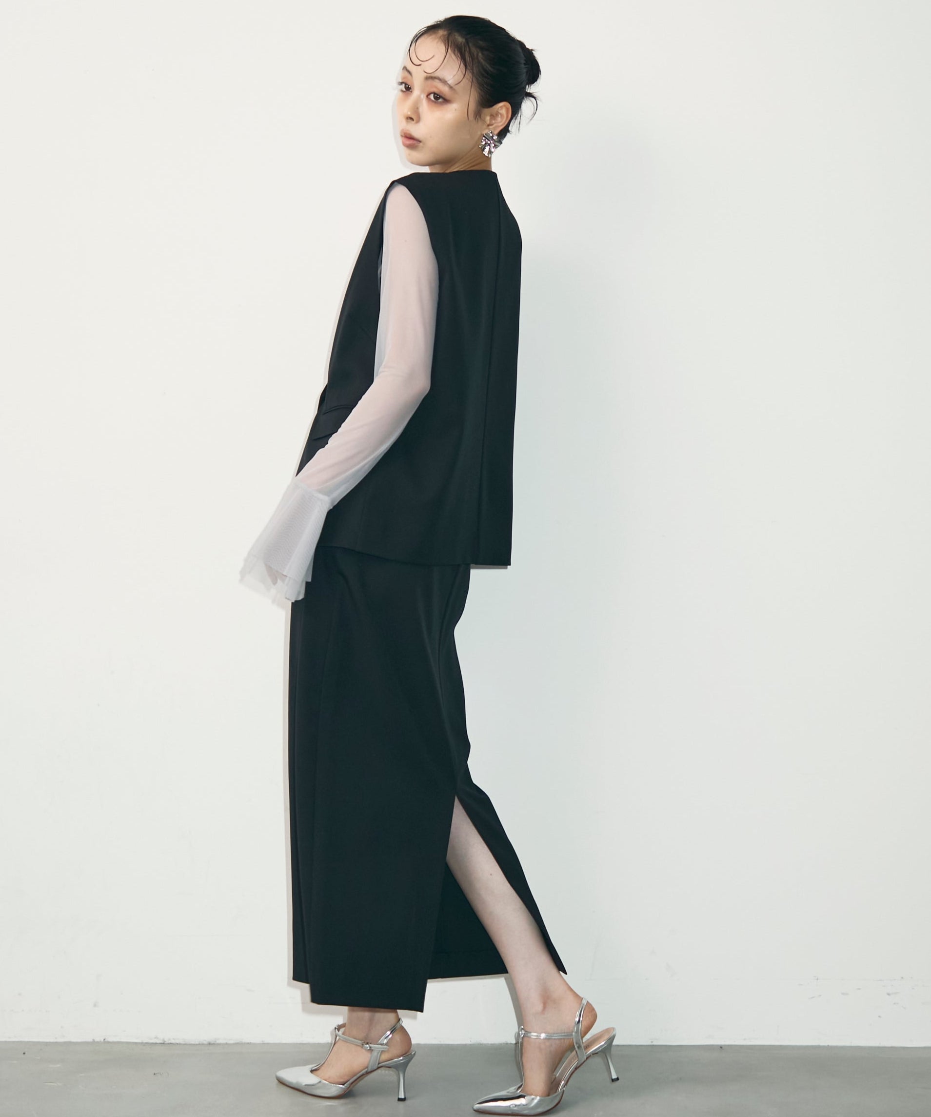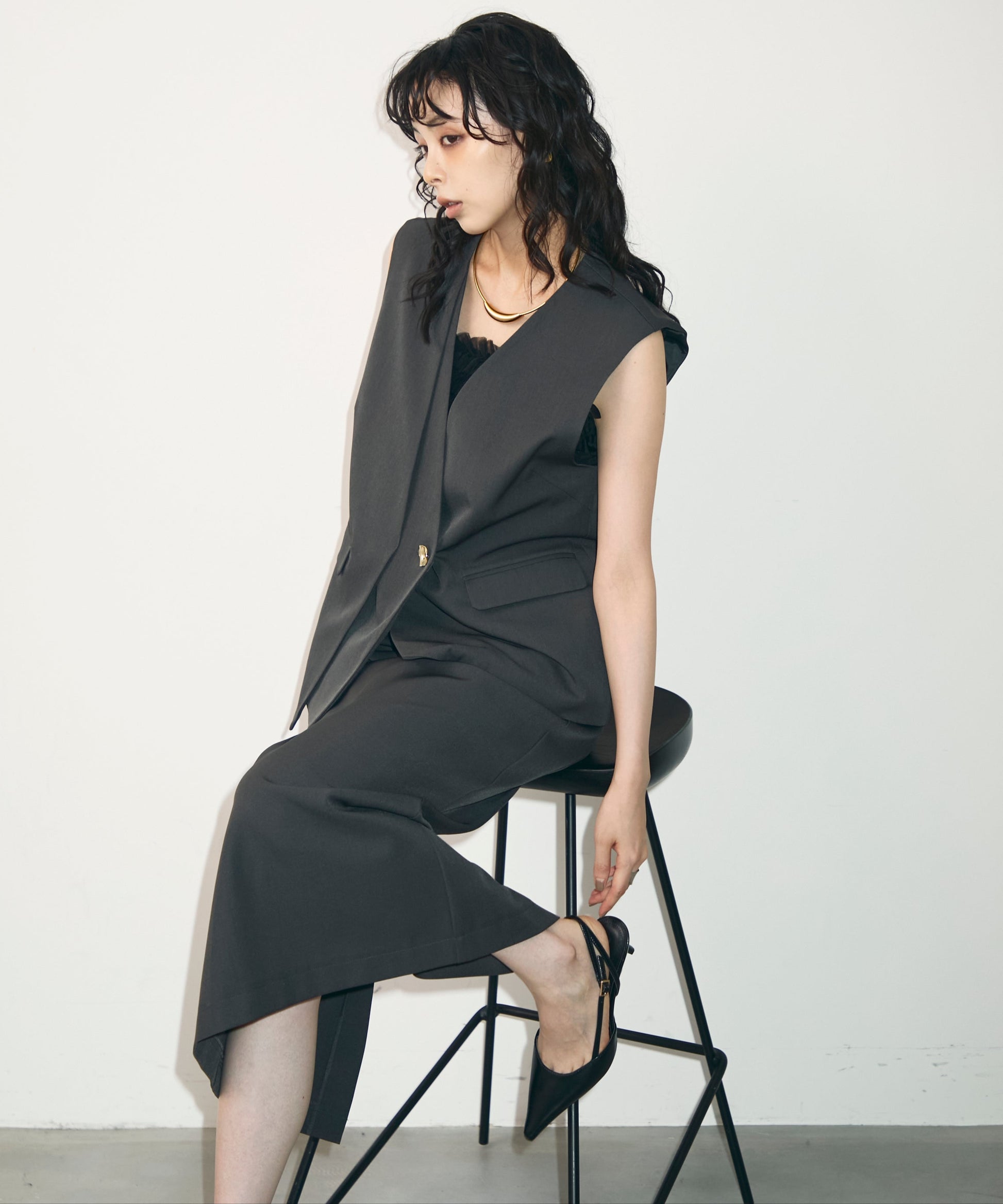 きちんと感を演出できるノーカラーベストとスカートのSETUPです。