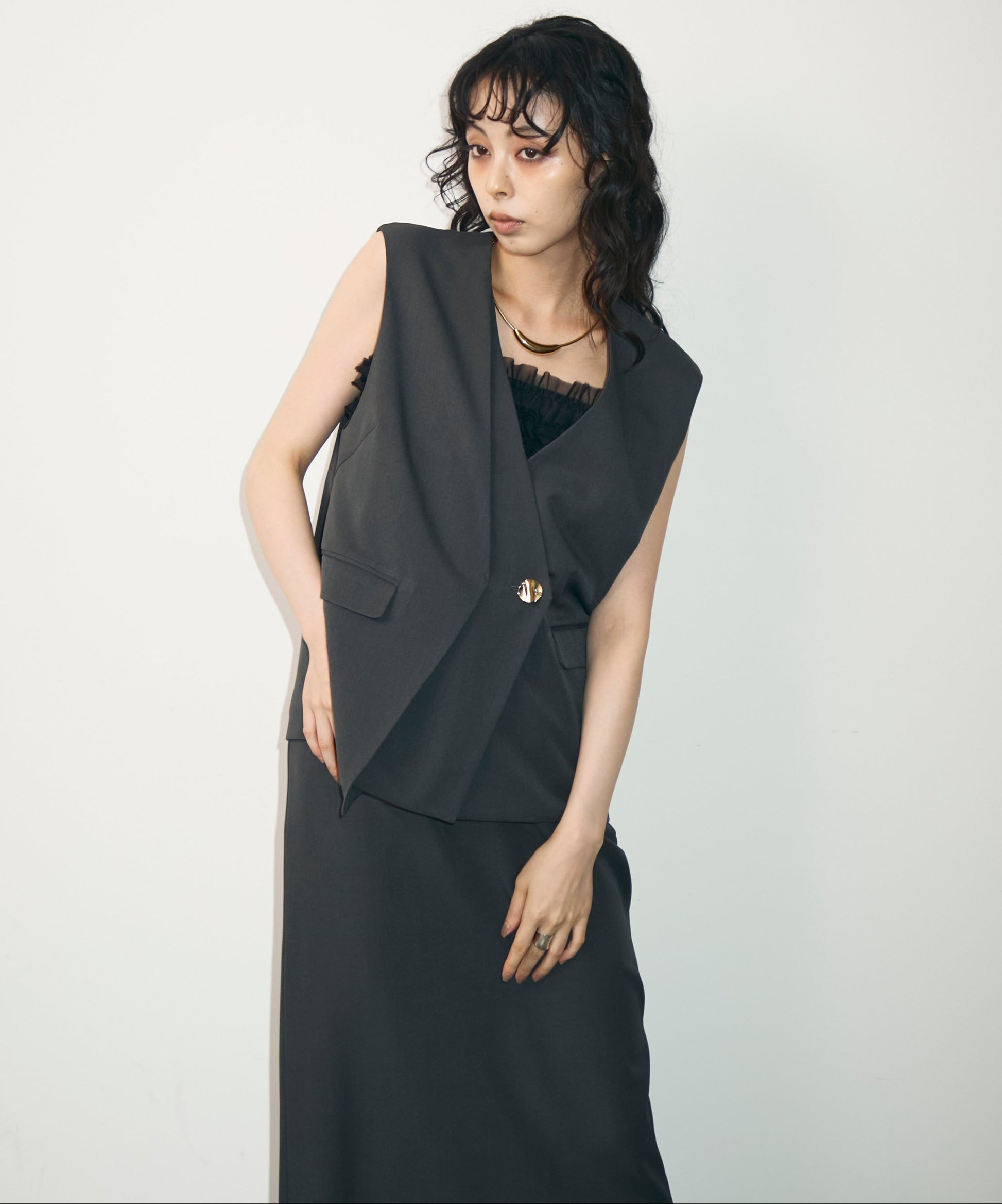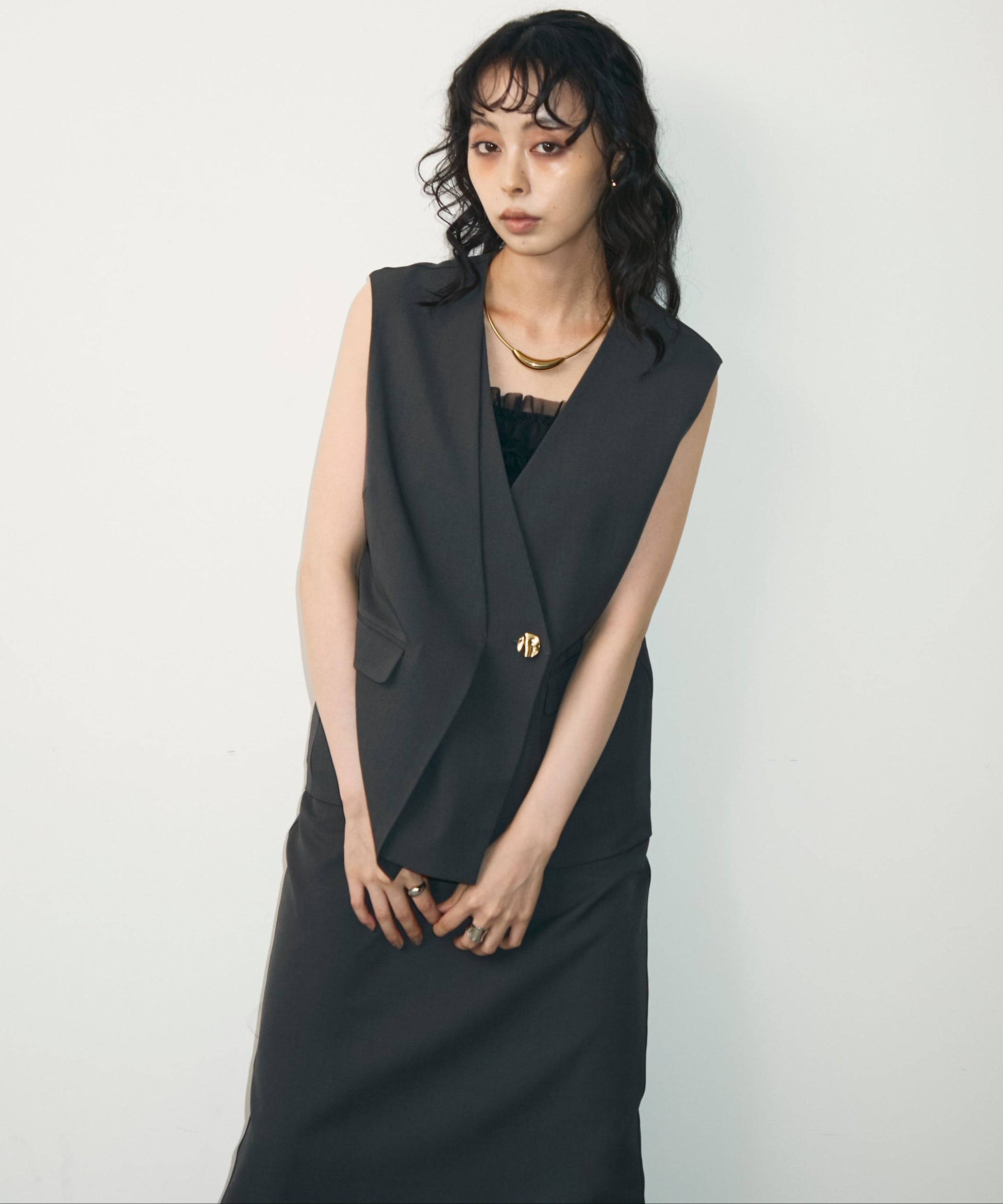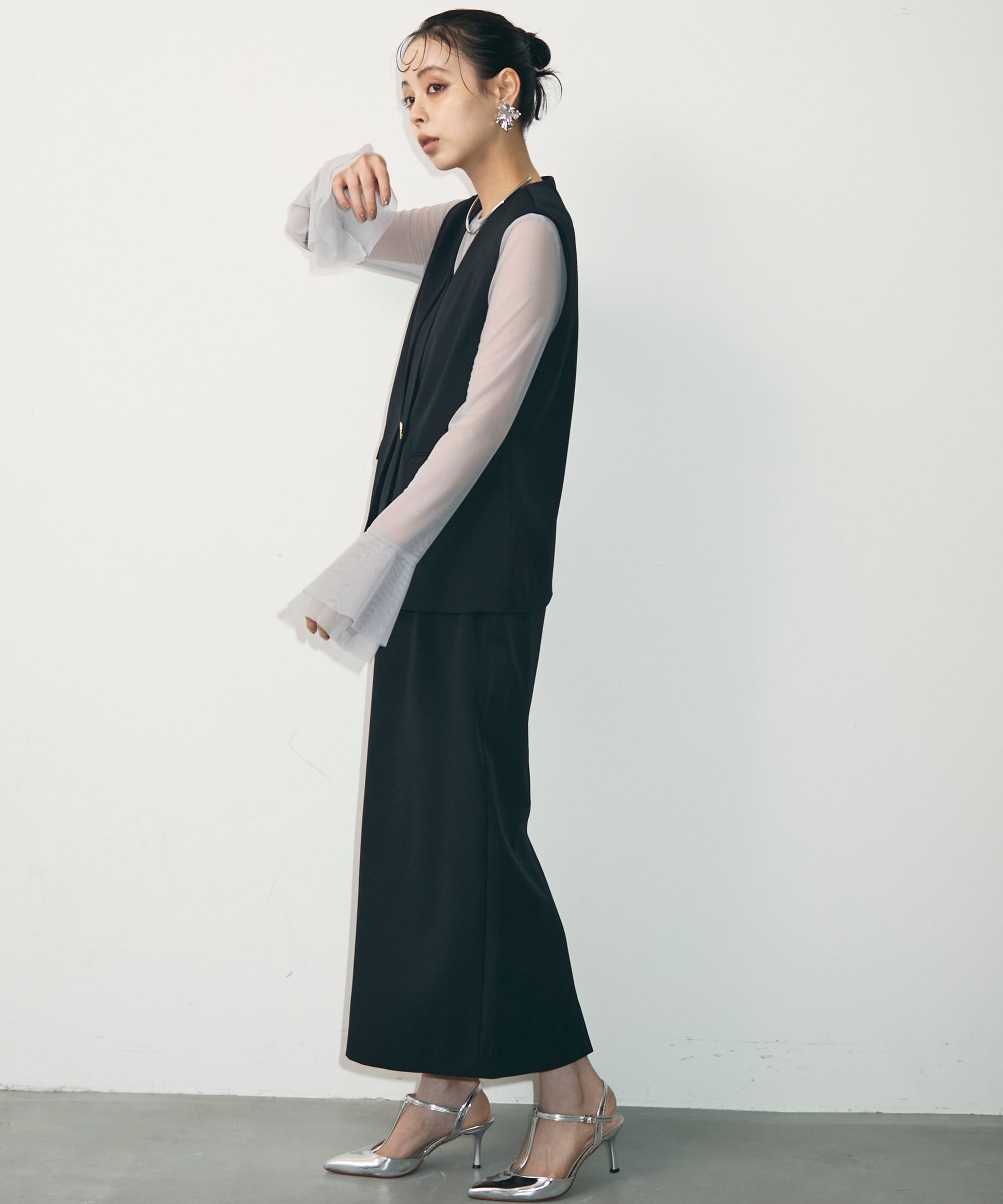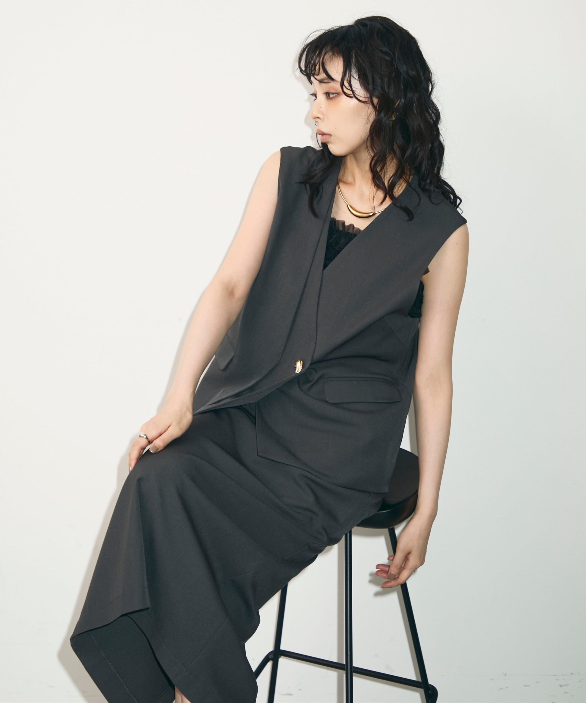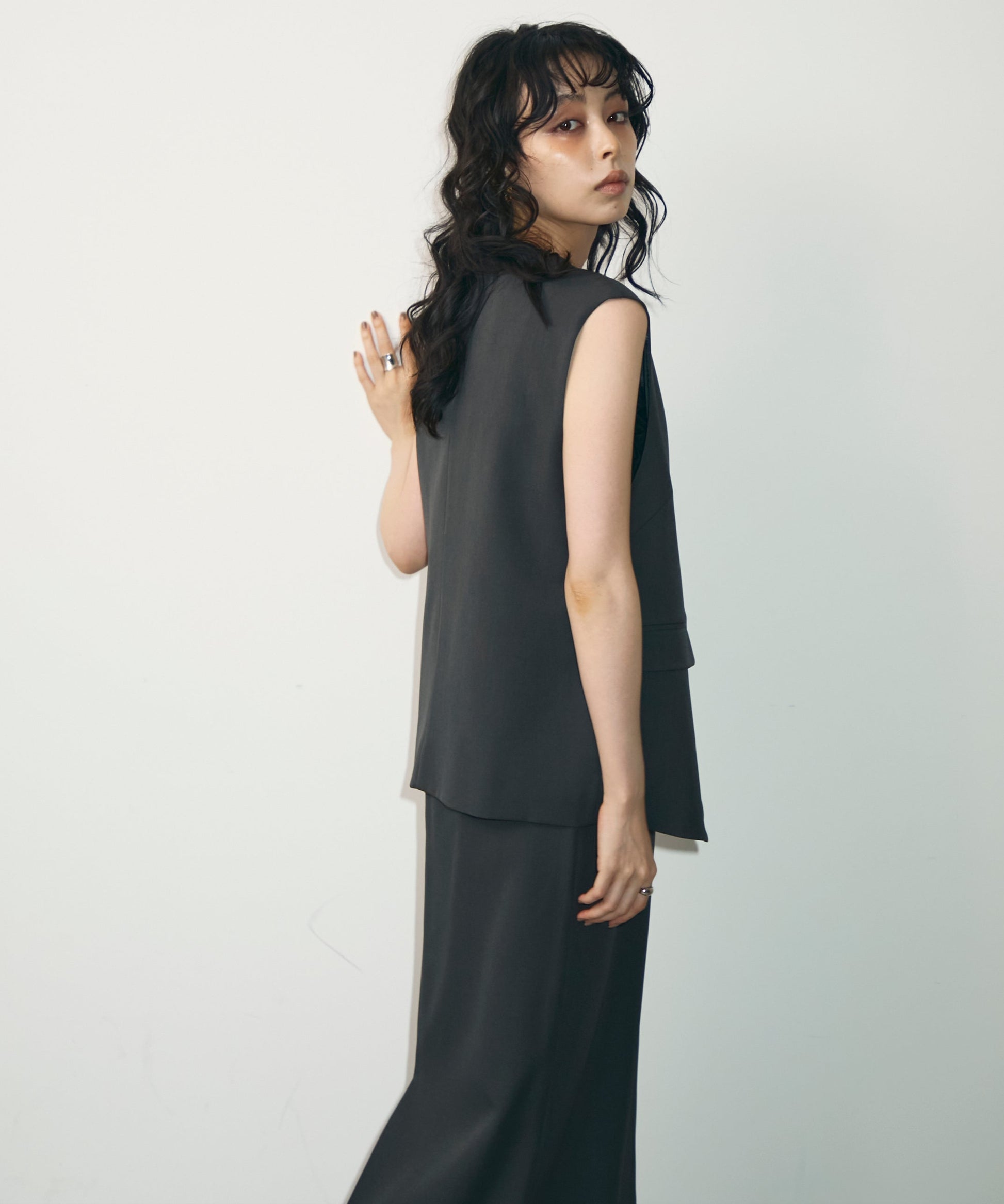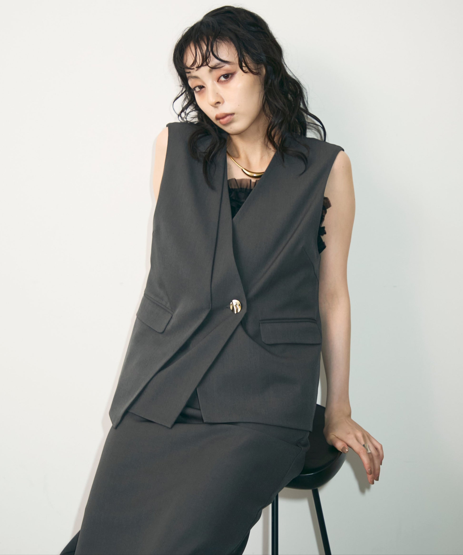 きちんと感を演出できるノーカラーベストとスカートのSETUPです。