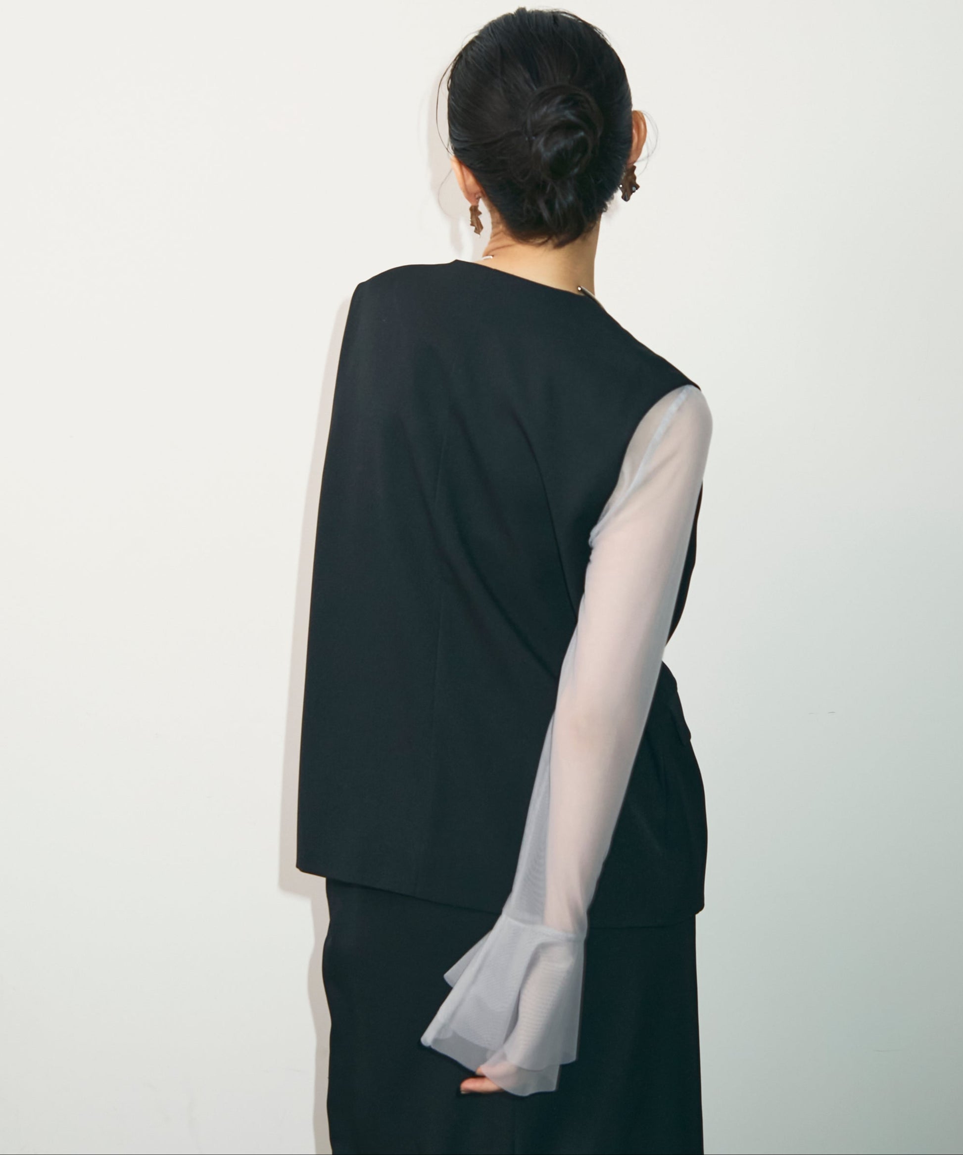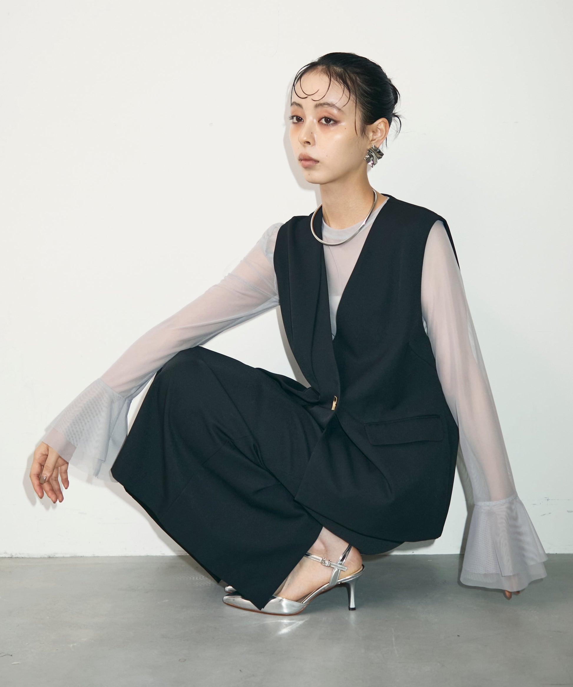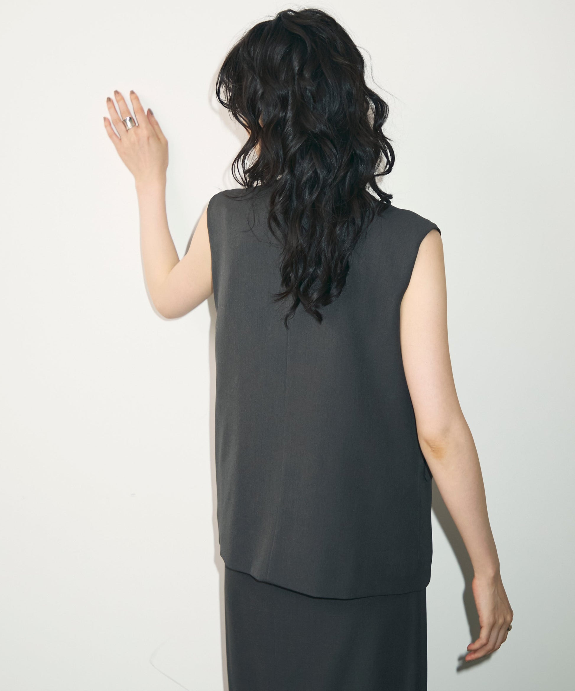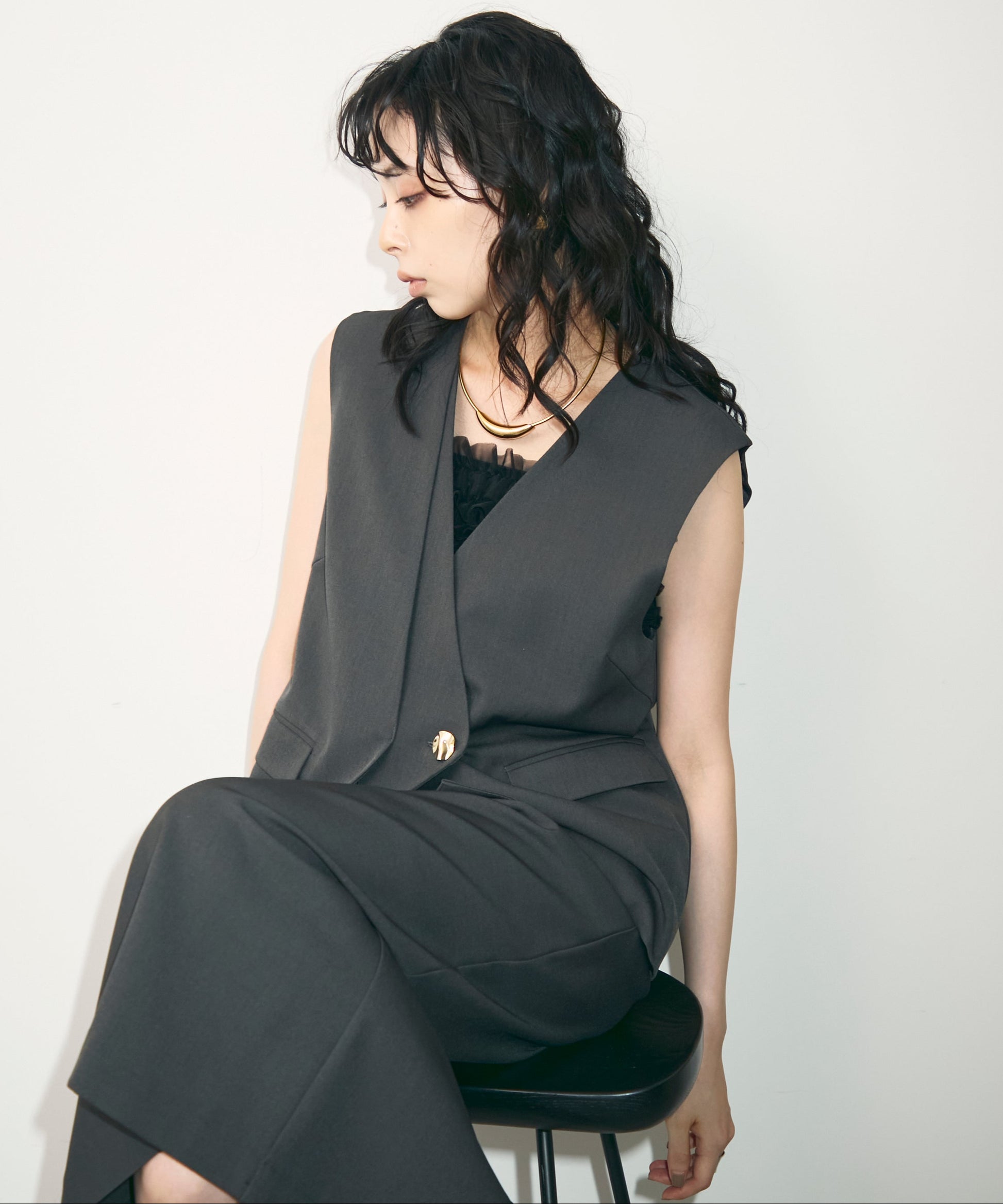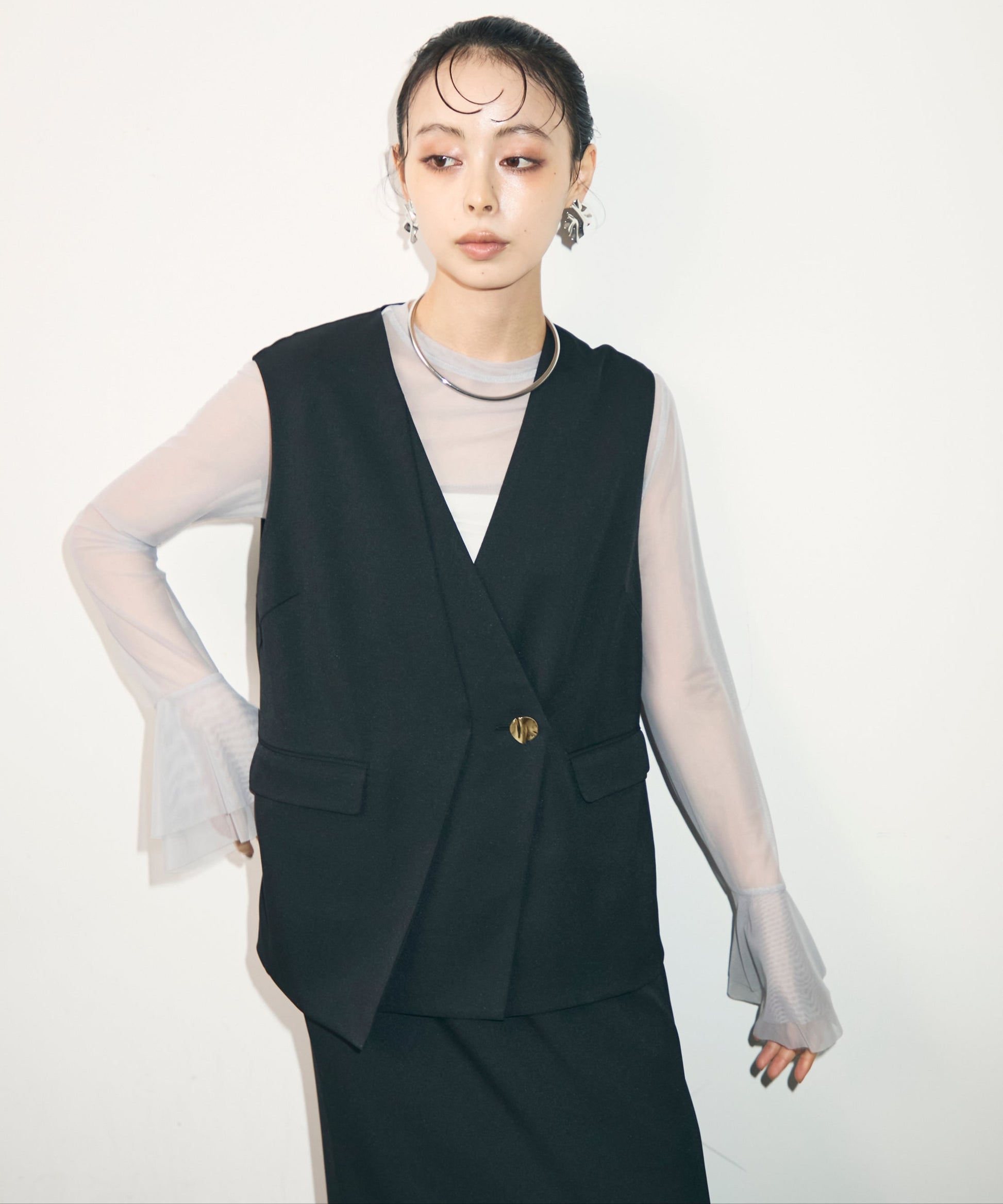 きちんと感を演出できるノーカラーベストとスカートのSETUPです。