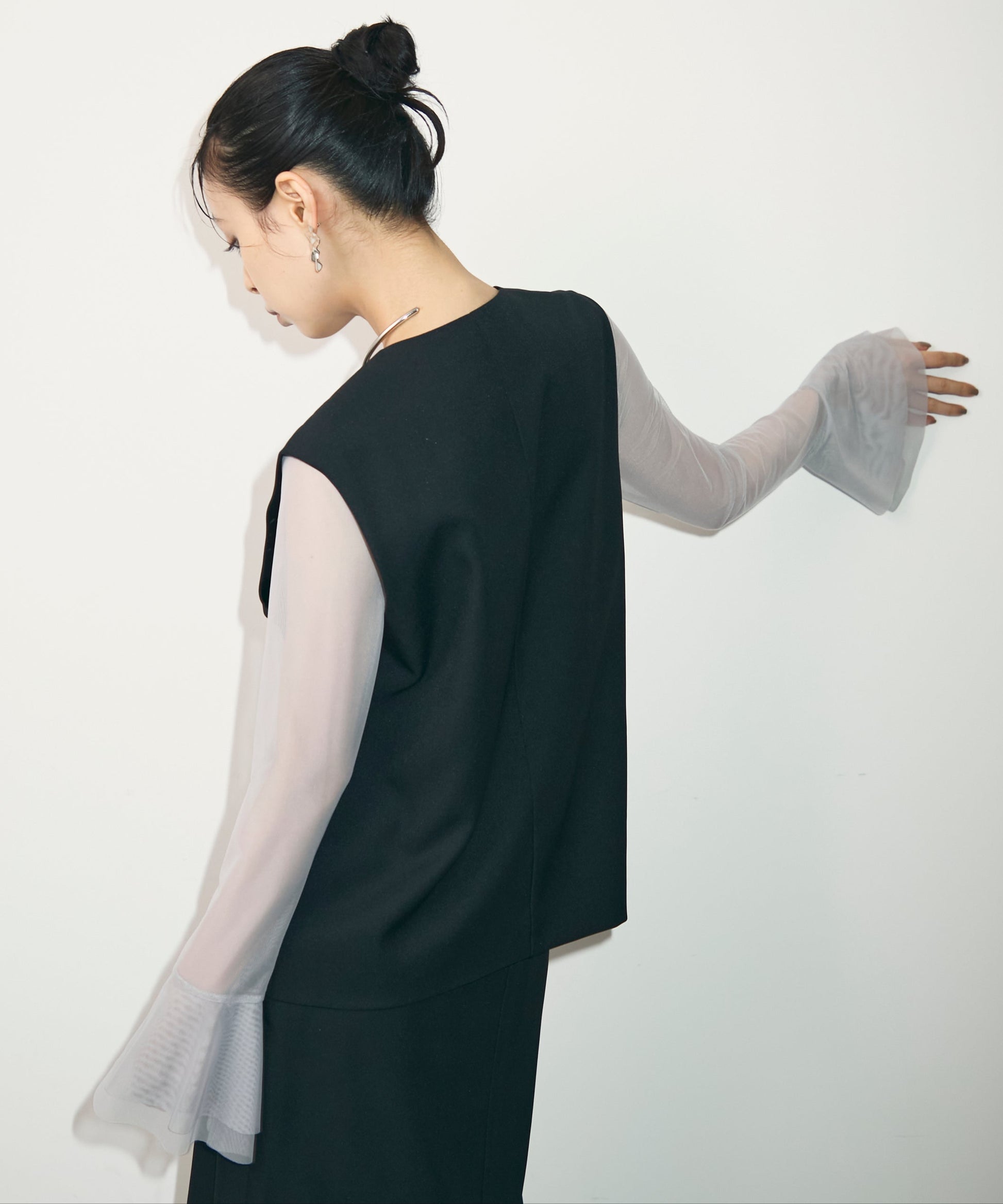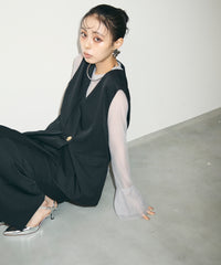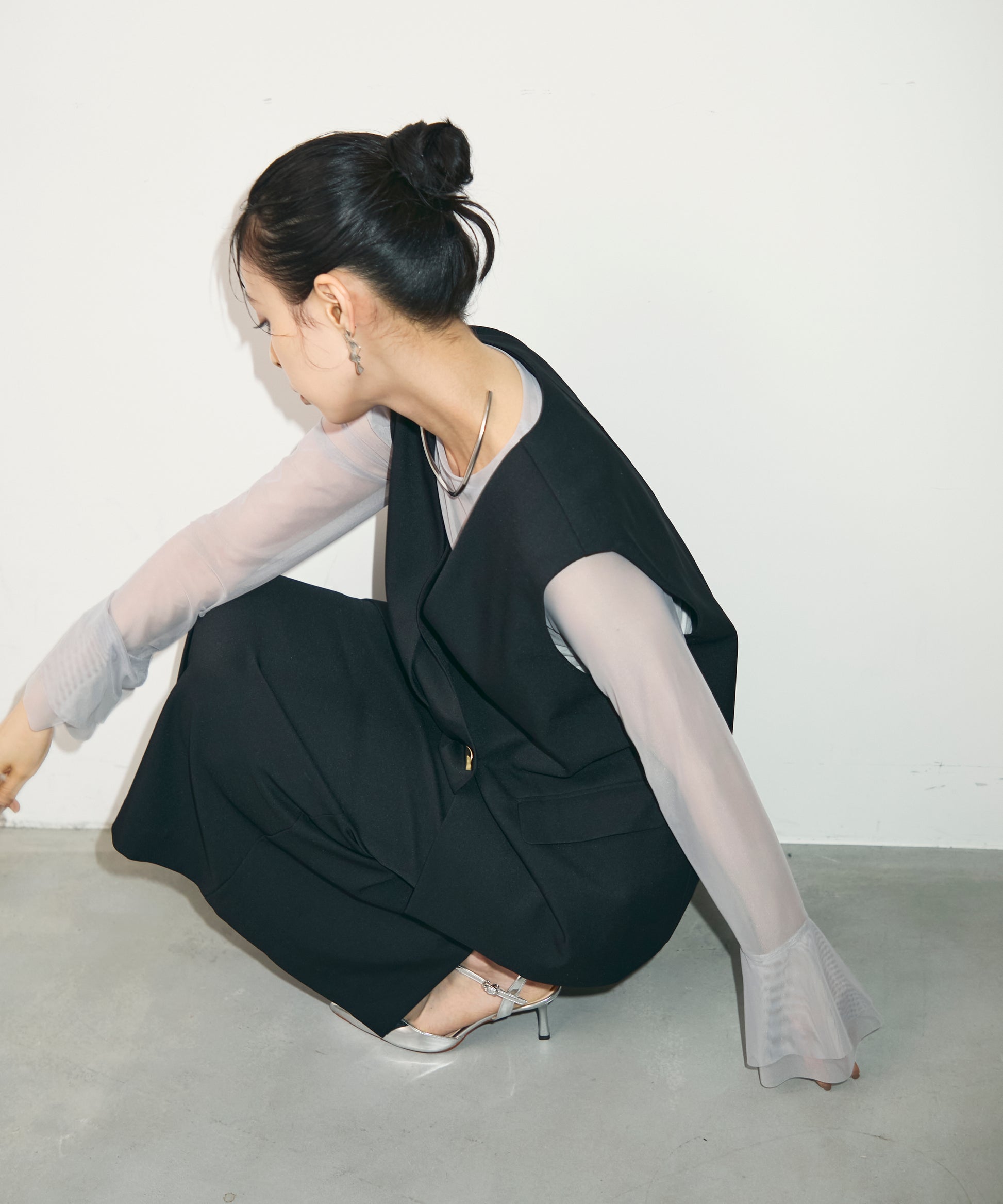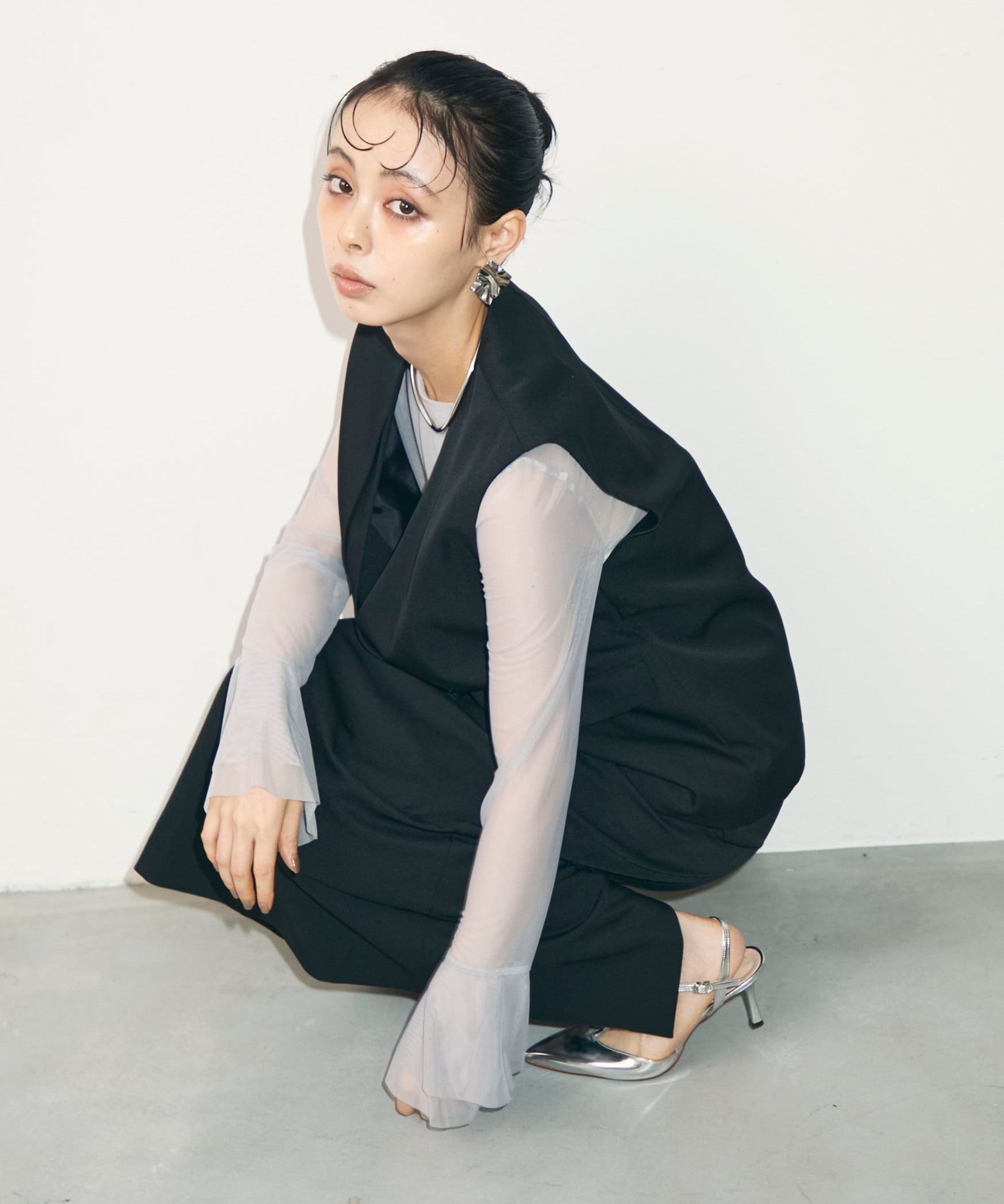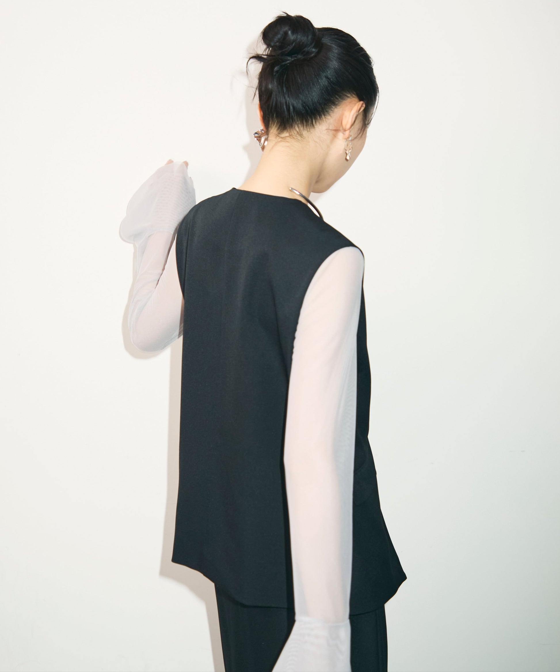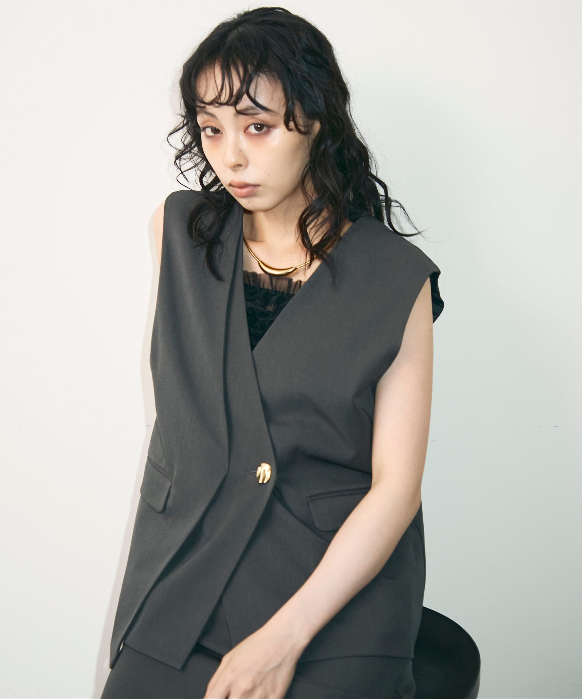 きちんと感を演出できるノーカラーベストとスカートのSETUPです。