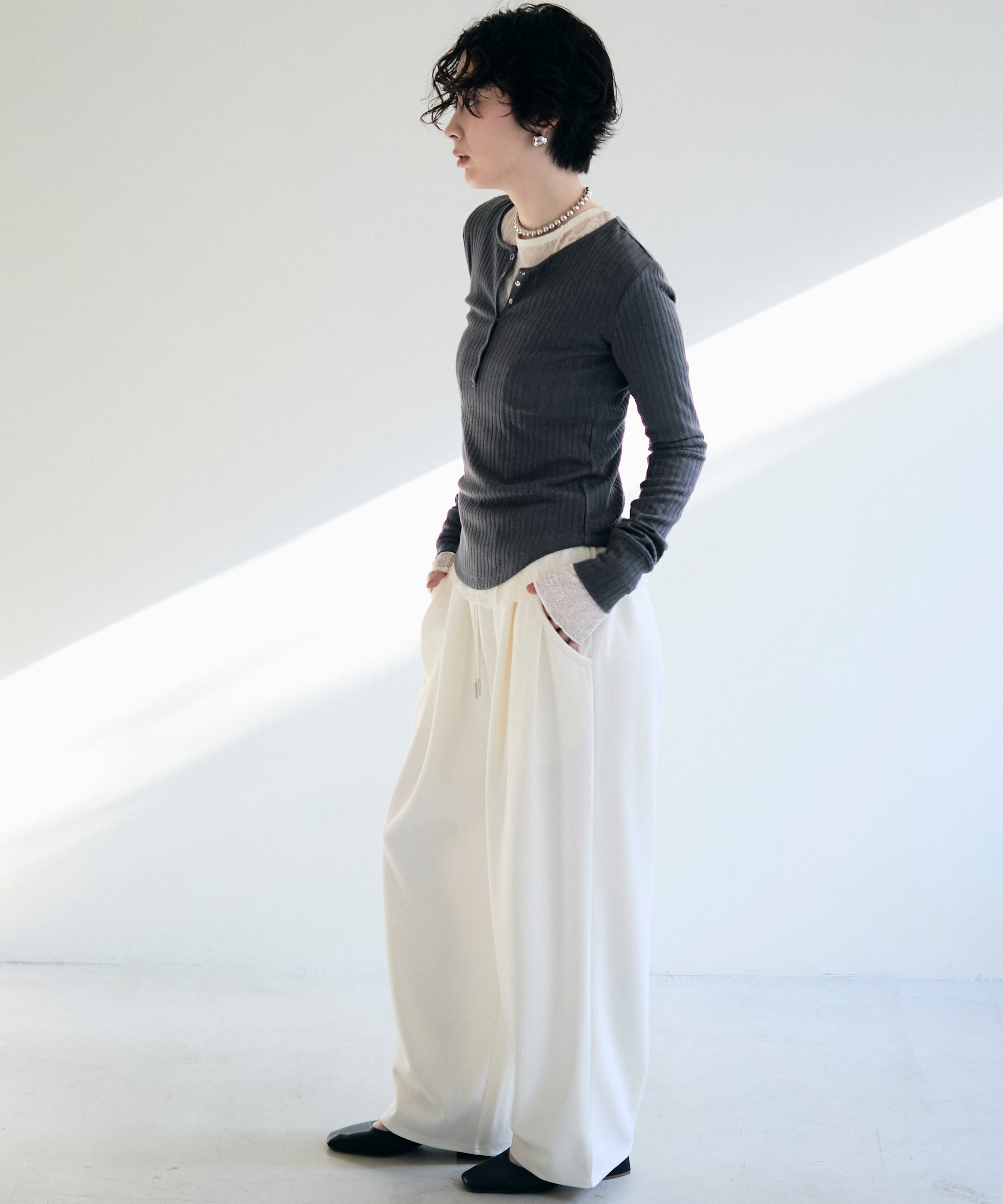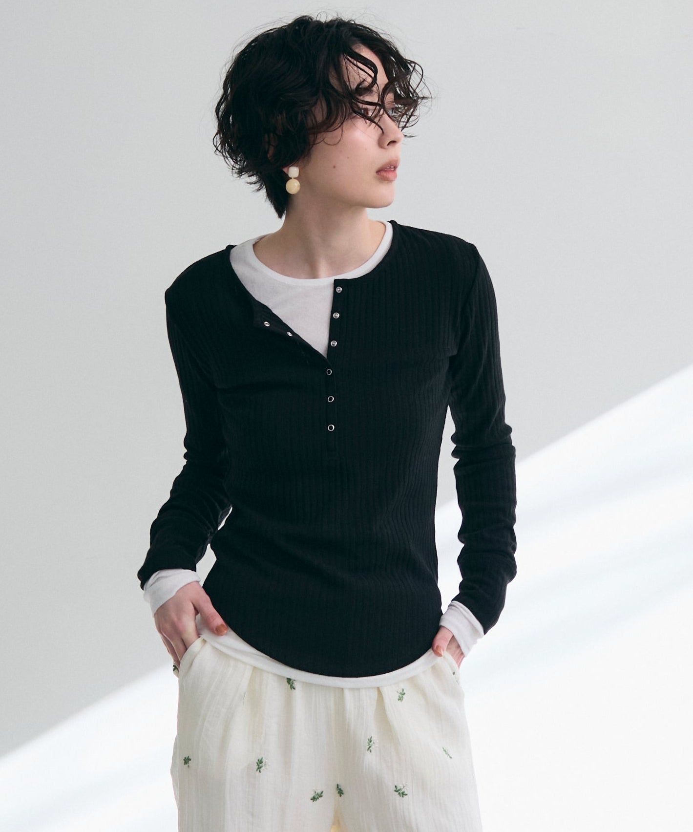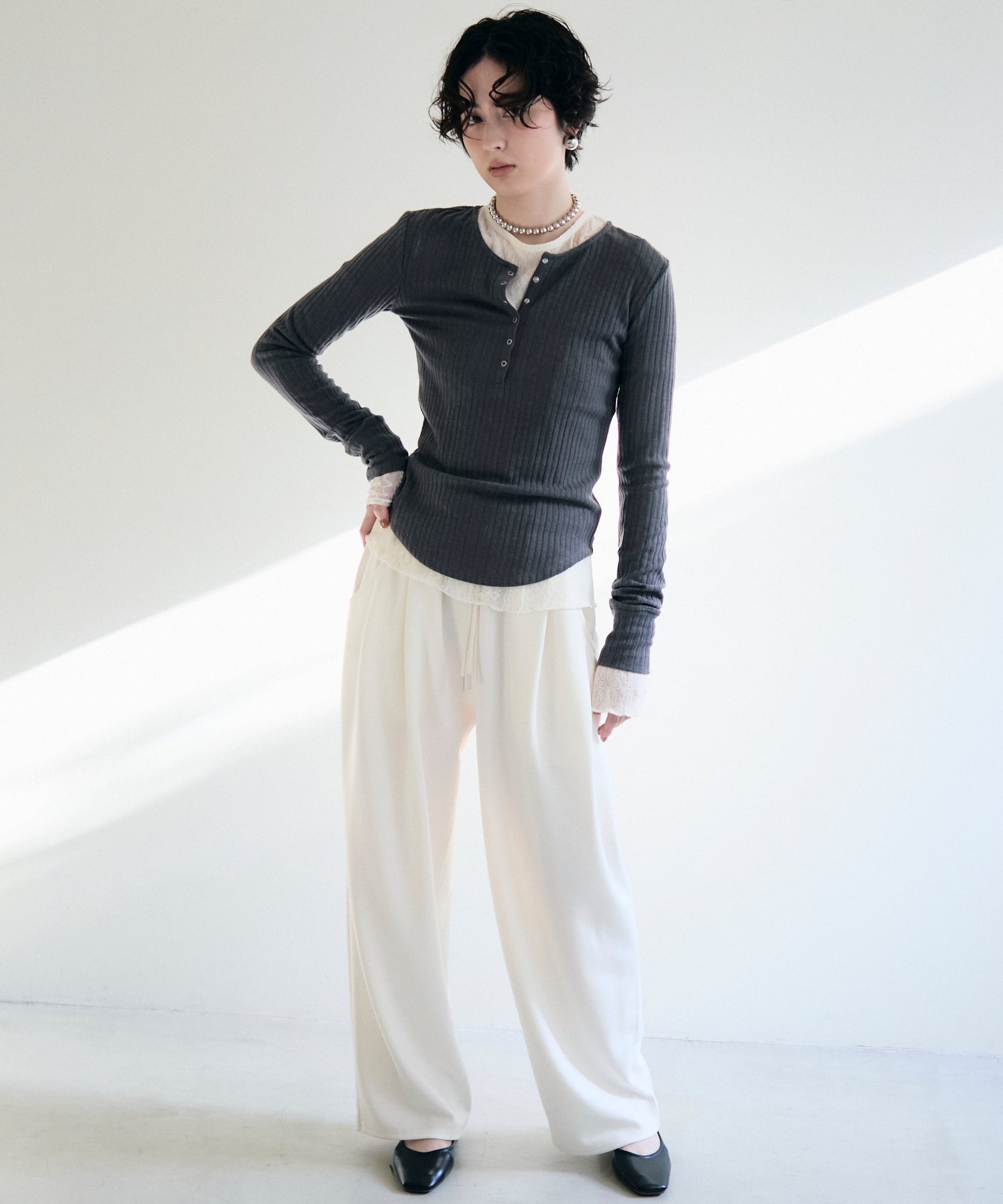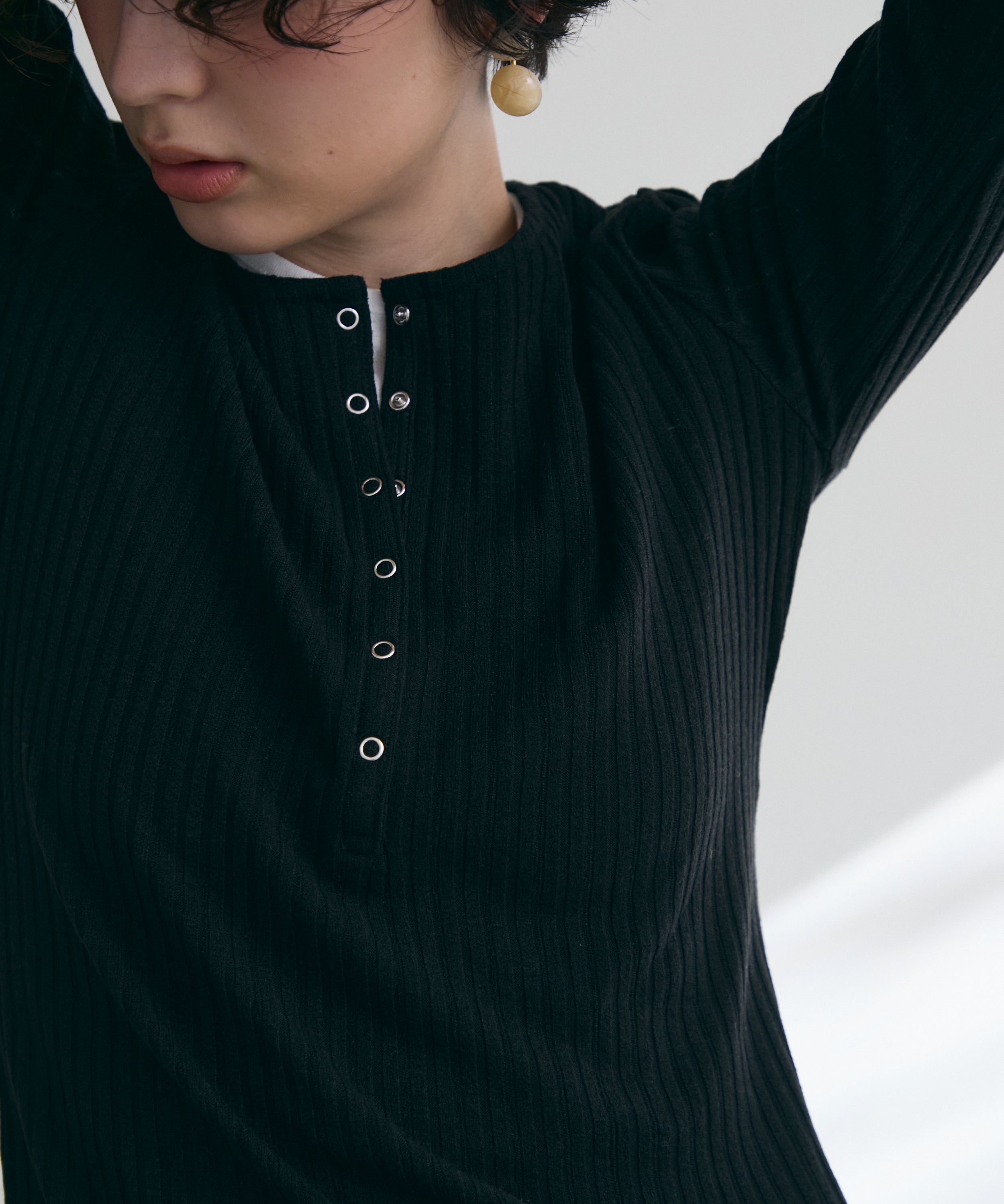 深すぎない絶妙な開きのヘンリーネックが、デコルテラインをきれいに見せつつ、程よい抜け感を演出します。