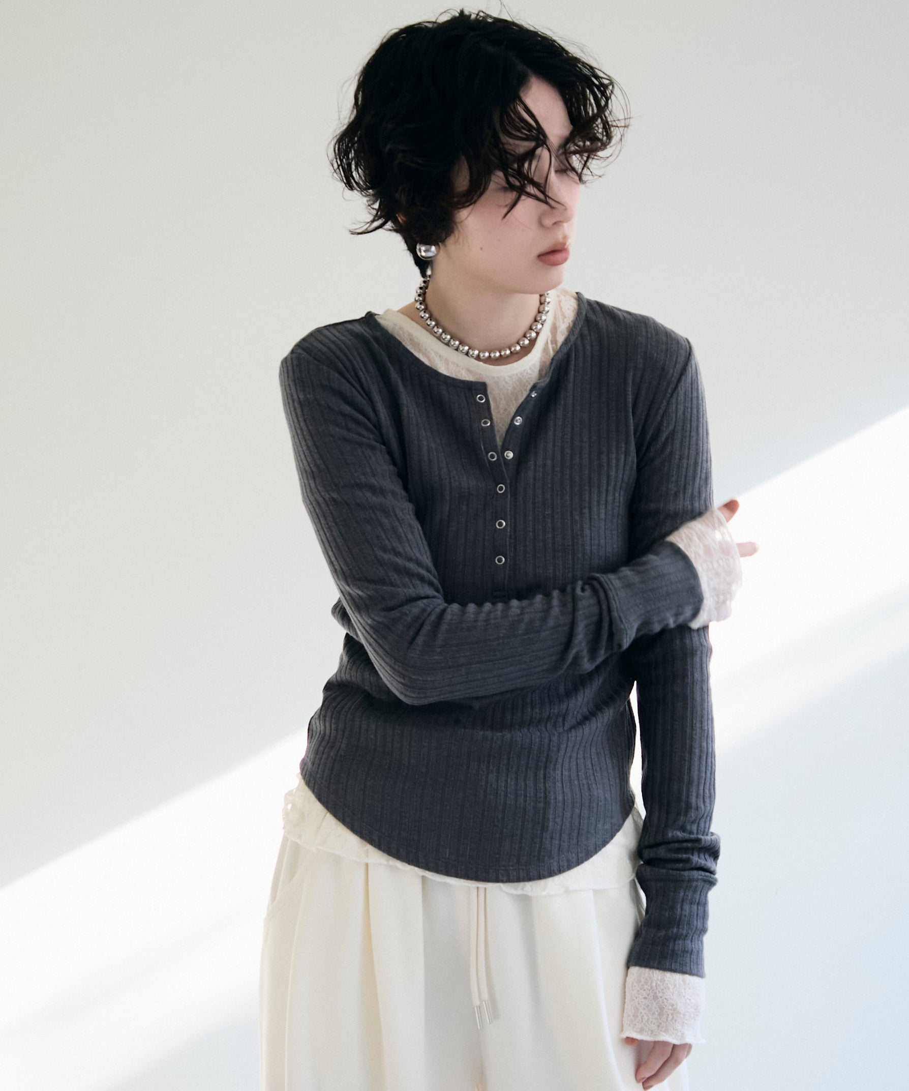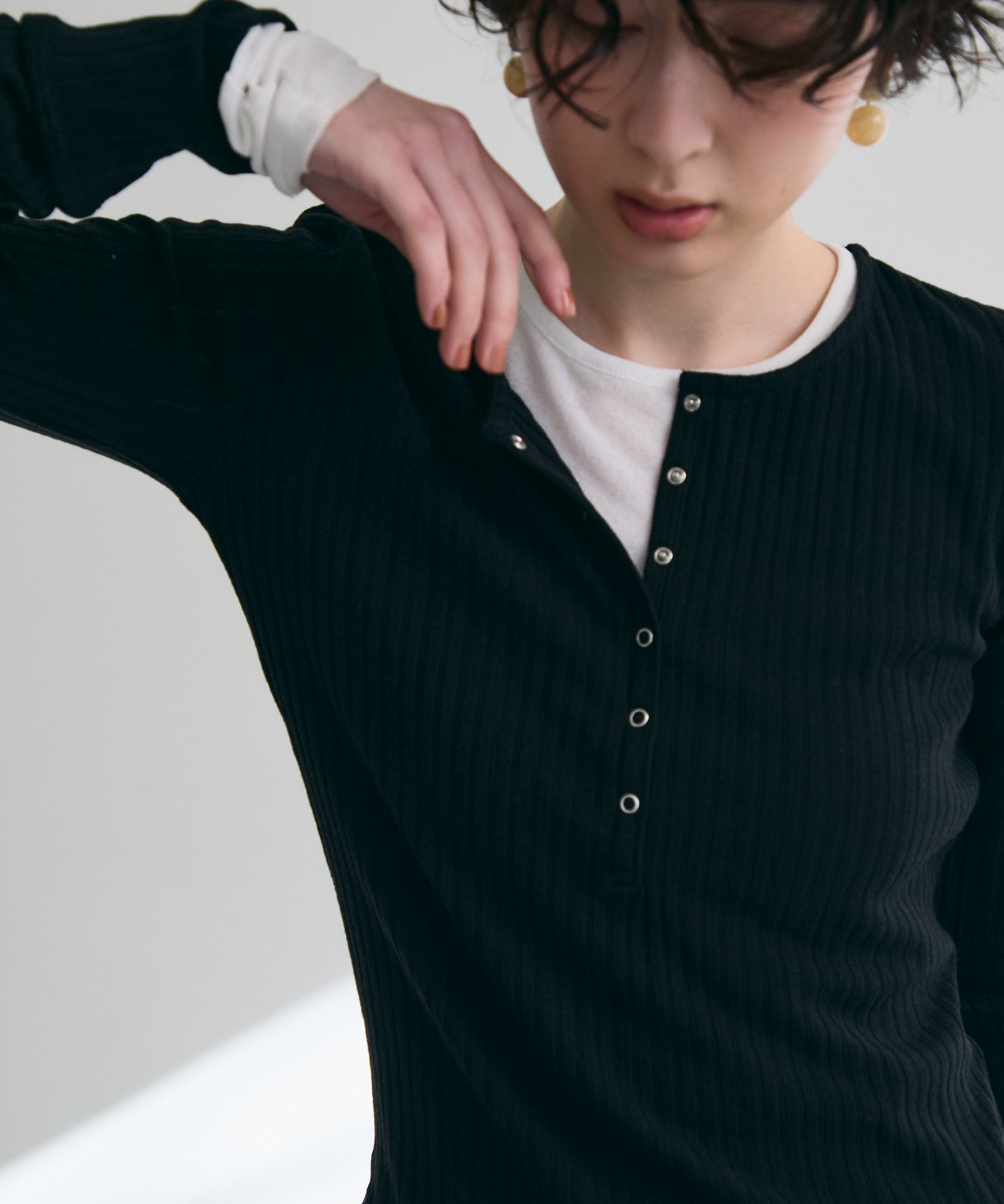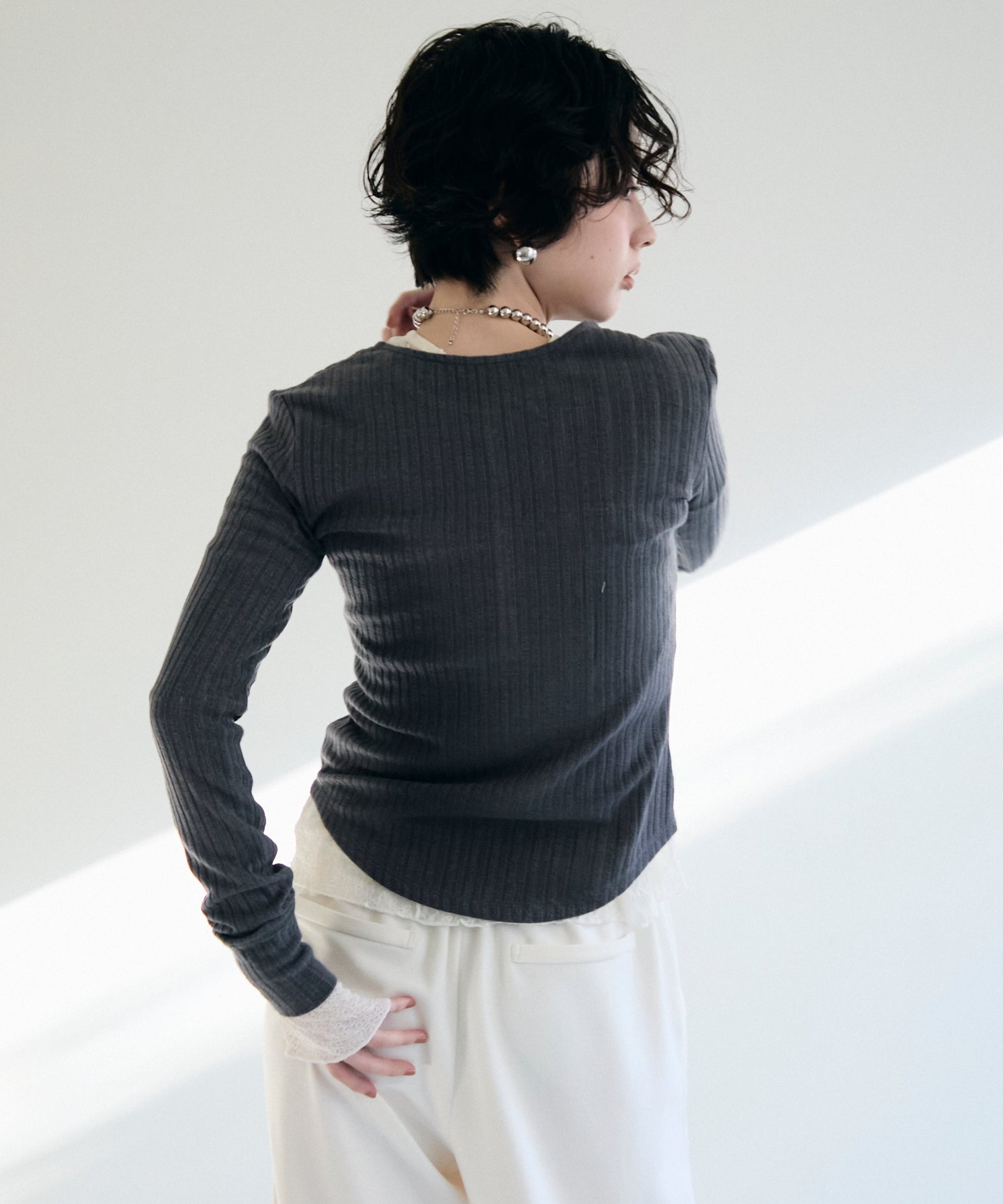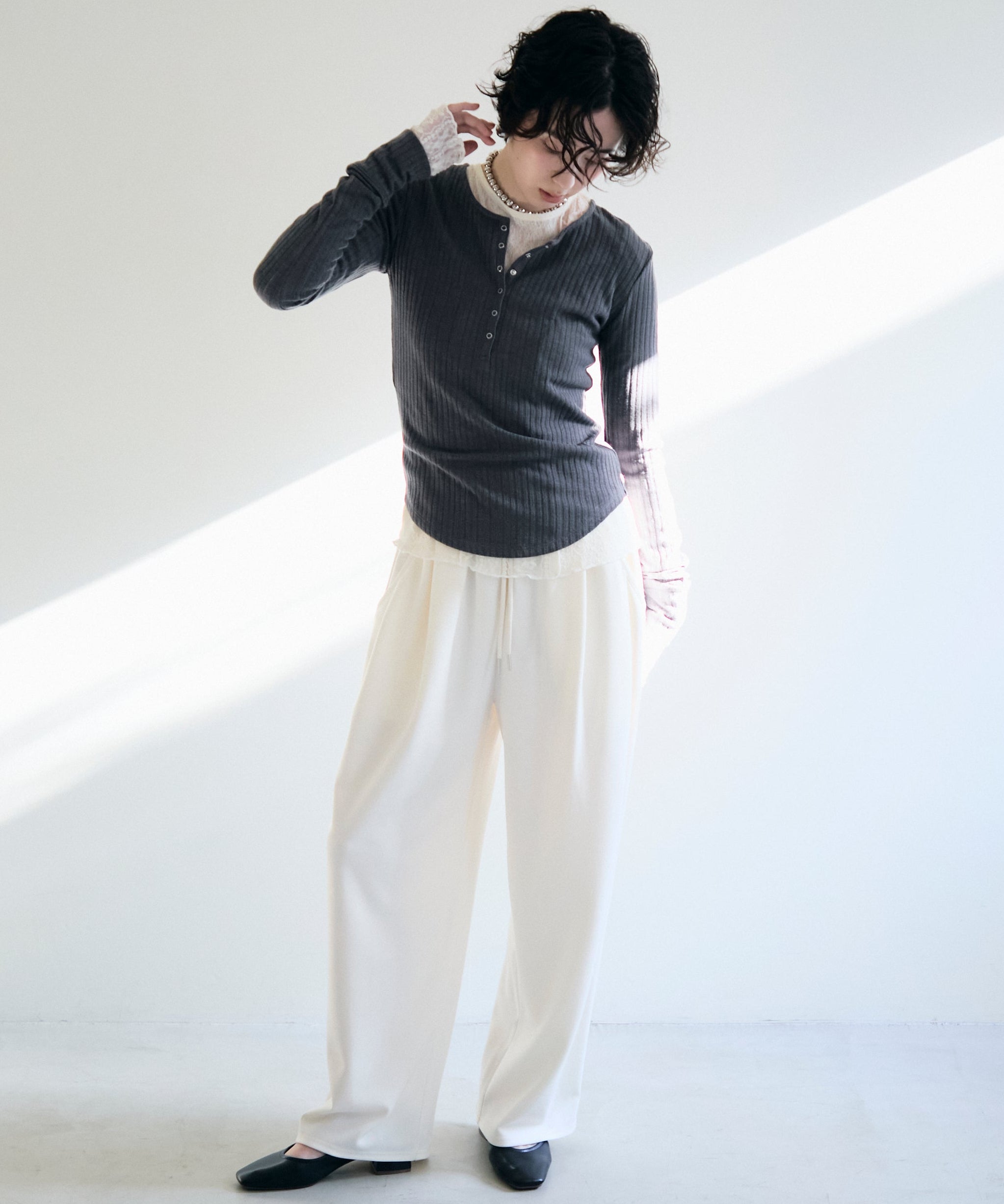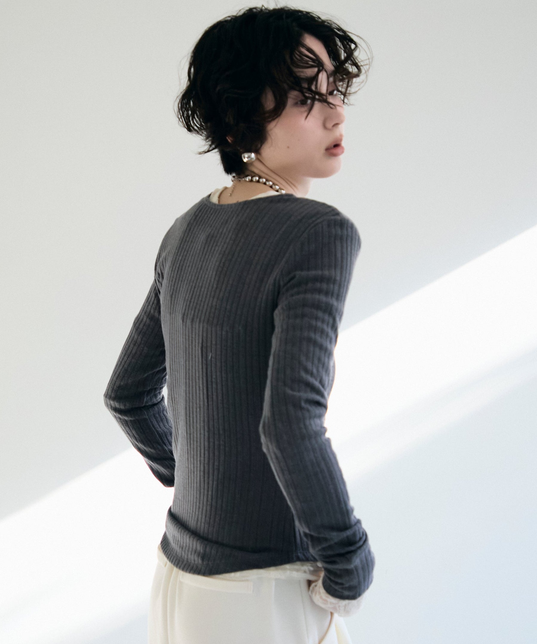 深すぎない絶妙な開きのヘンリーネックが、デコルテラインをきれいに見せつつ、程よい抜け感を演出します。