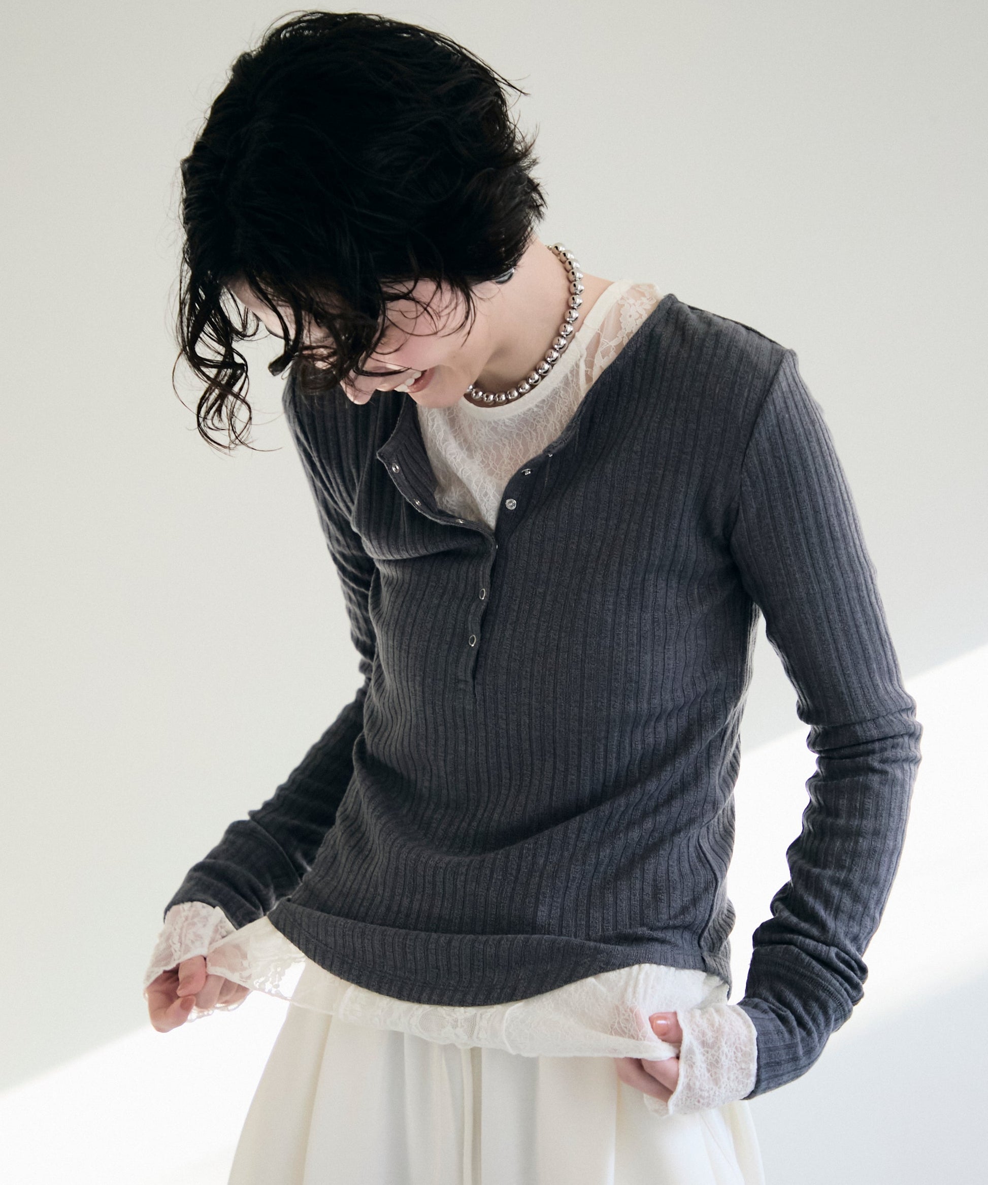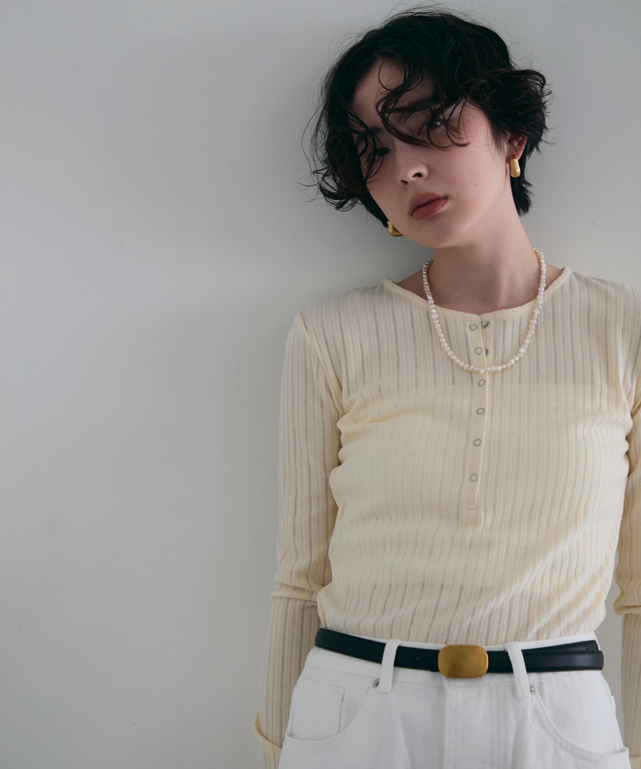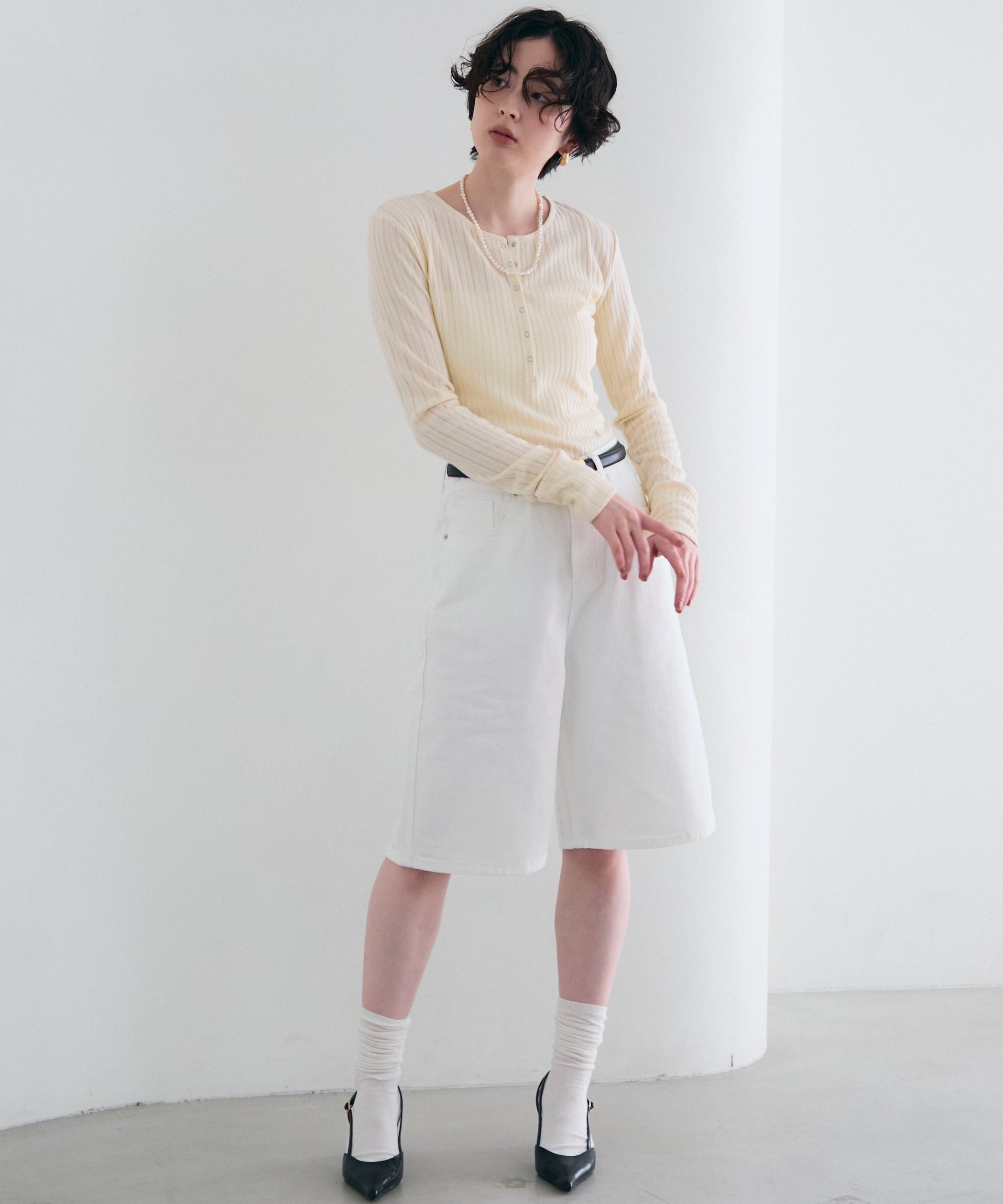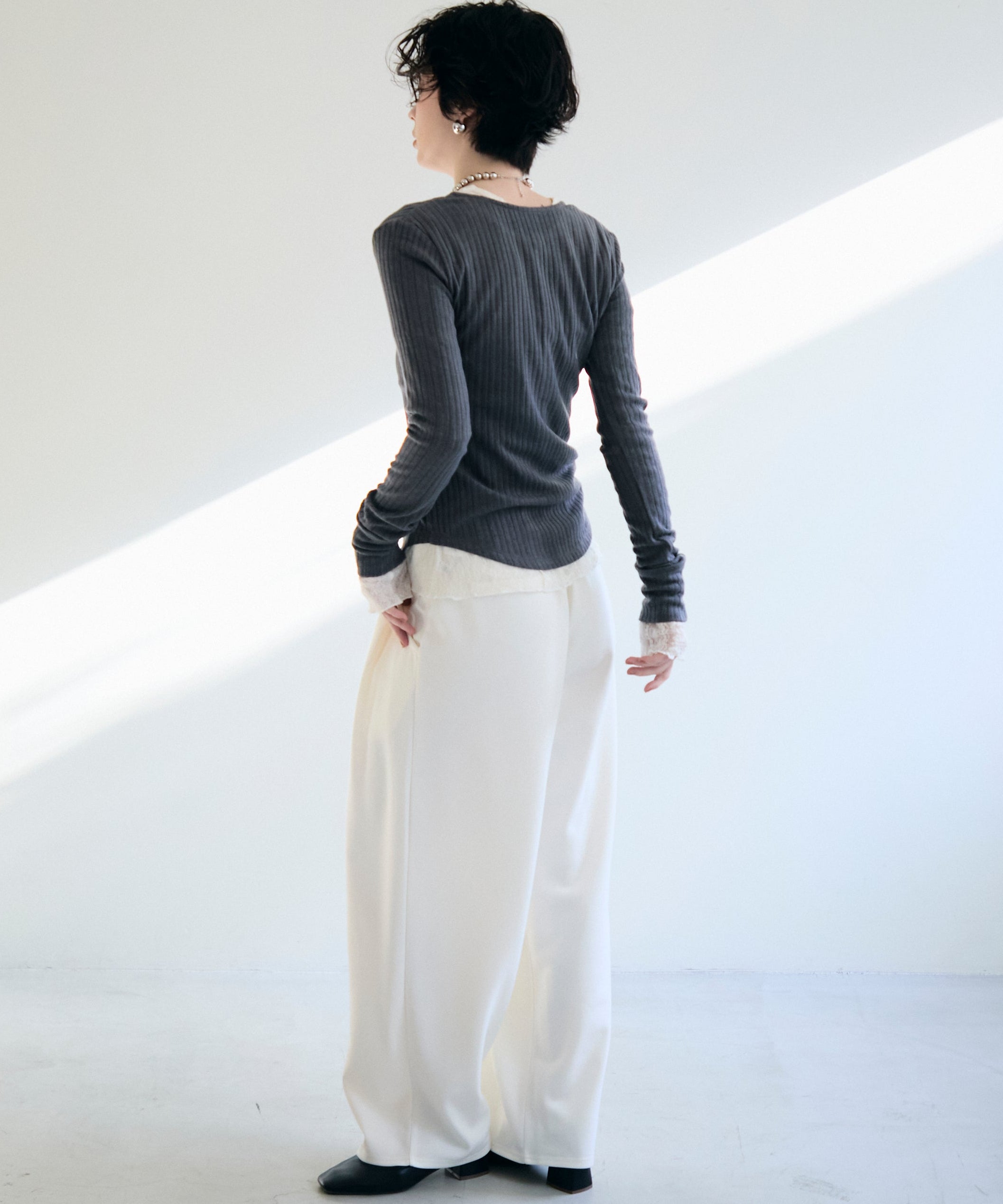 深すぎない絶妙な開きのヘンリーネックが、デコルテラインをきれいに見せつつ、程よい抜け感を演出します。