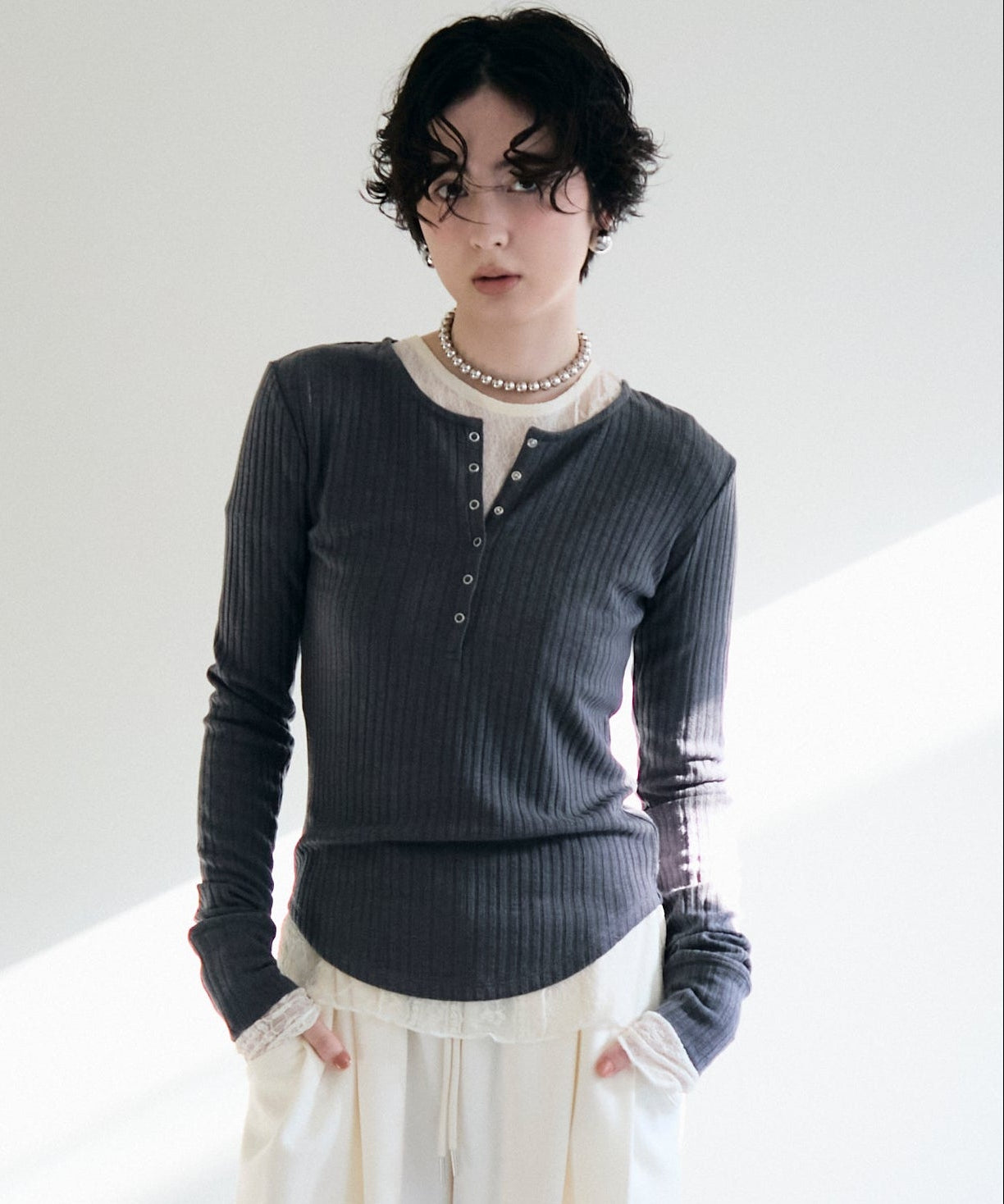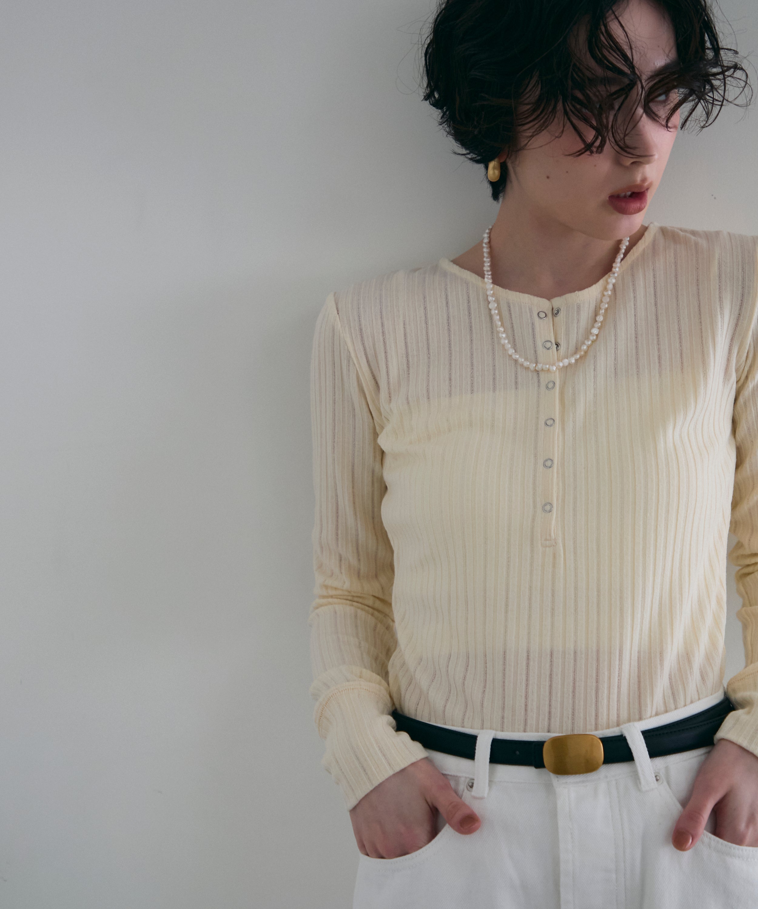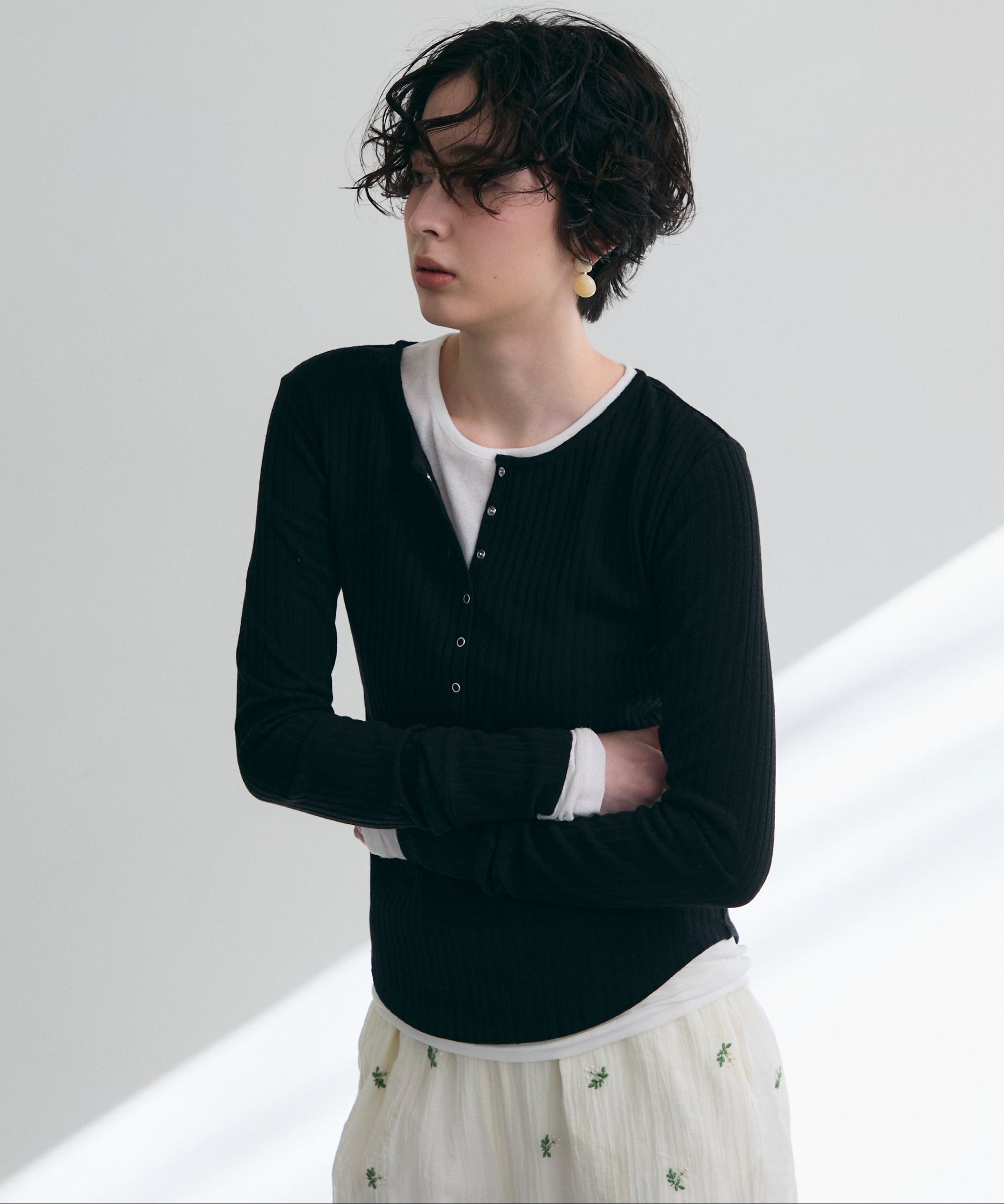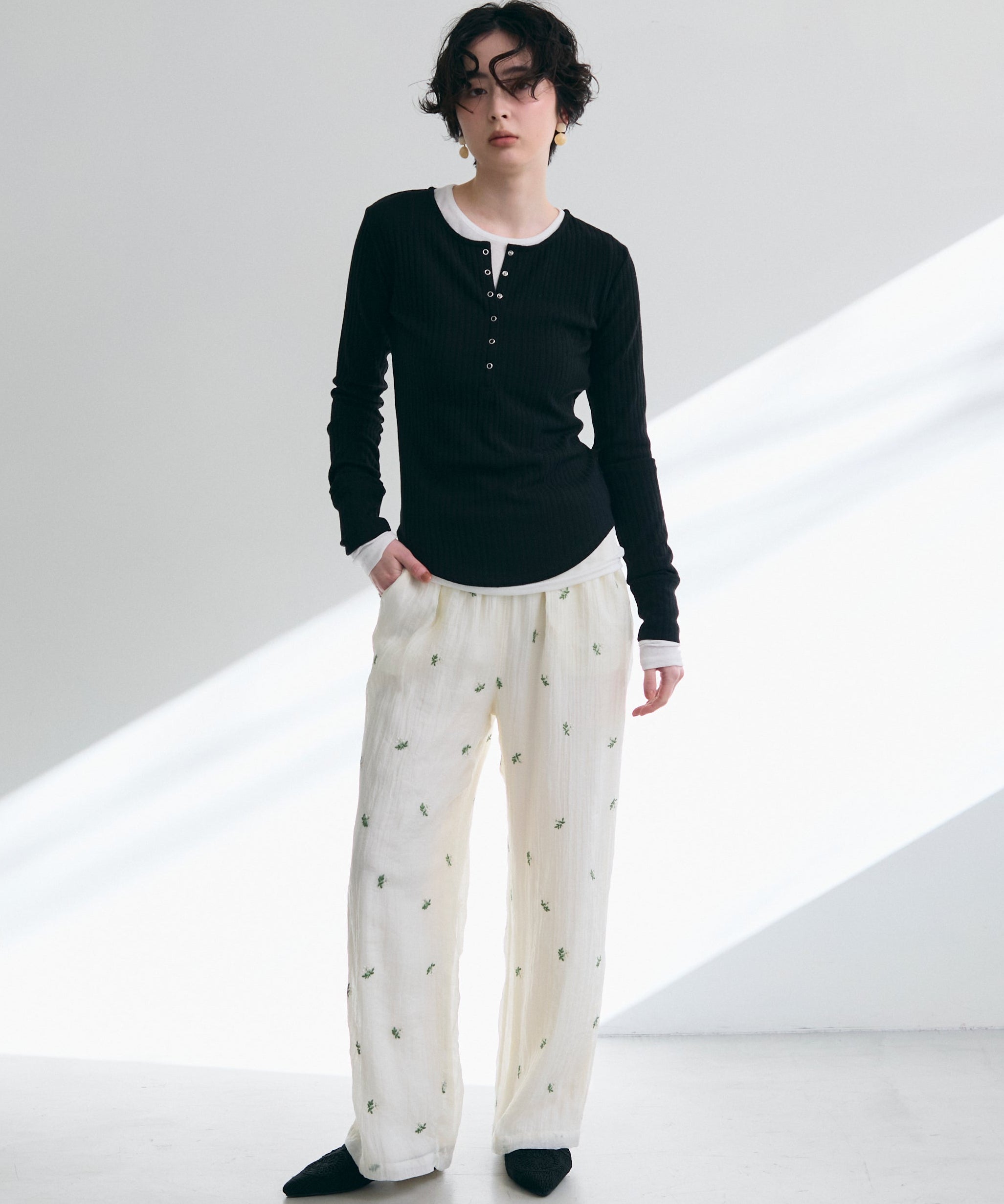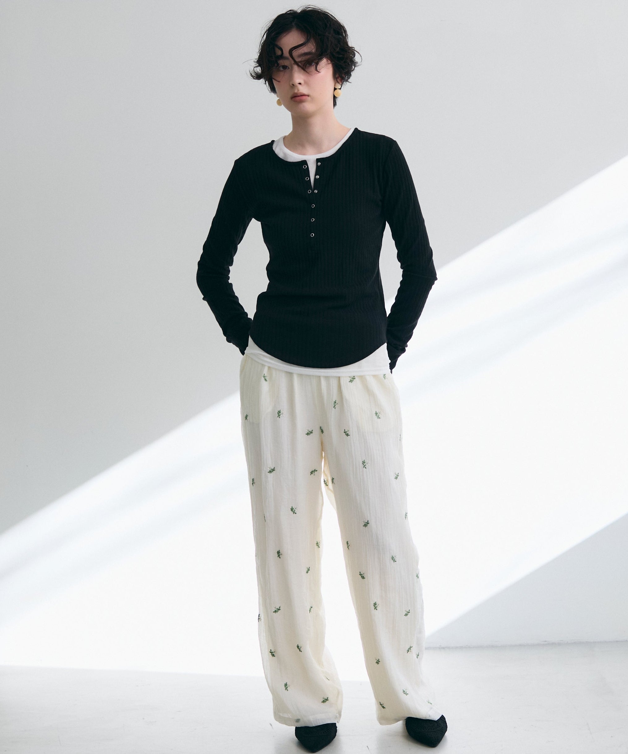 深すぎない絶妙な開きのヘンリーネックが、デコルテラインをきれいに見せつつ、程よい抜け感を演出します。