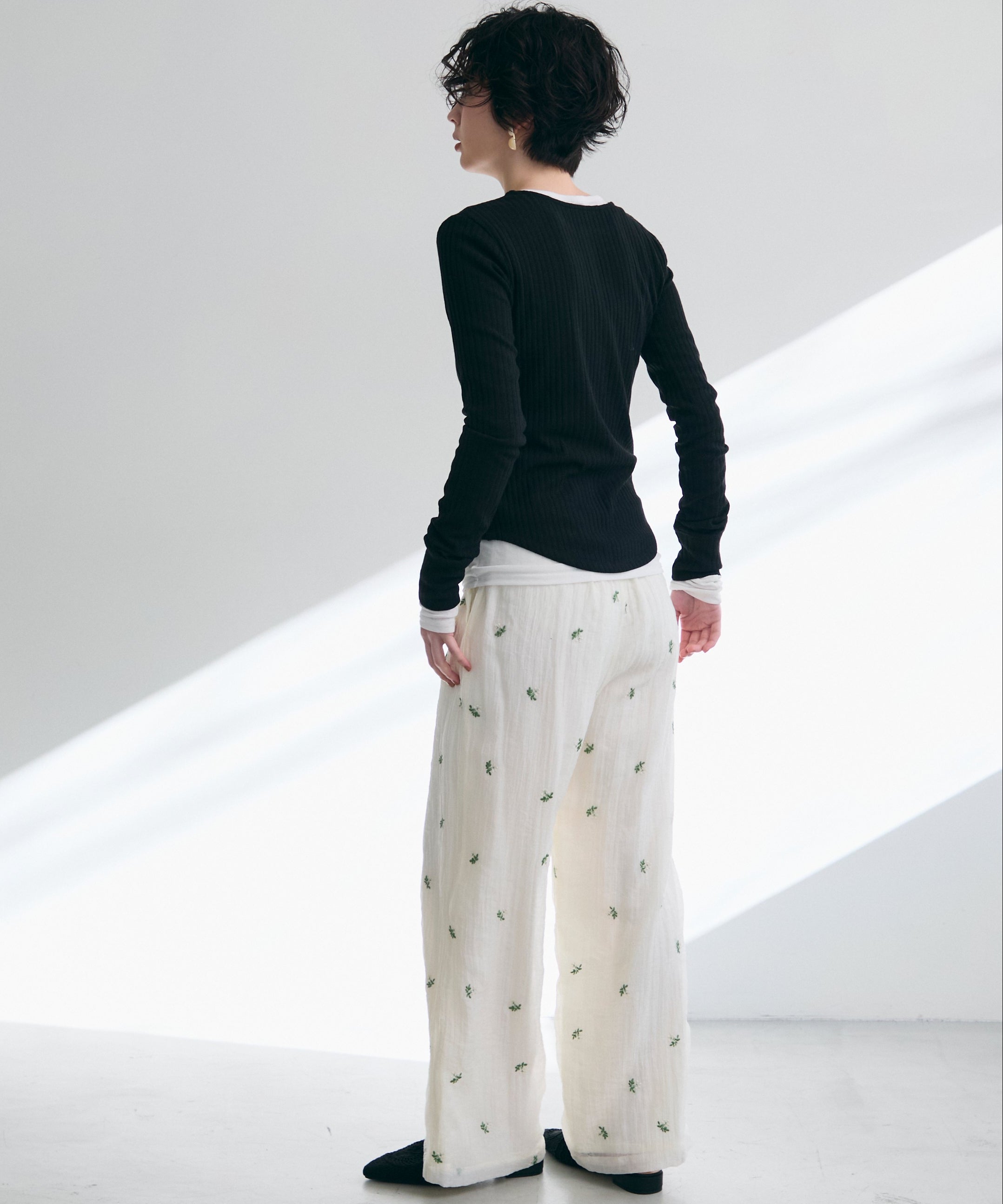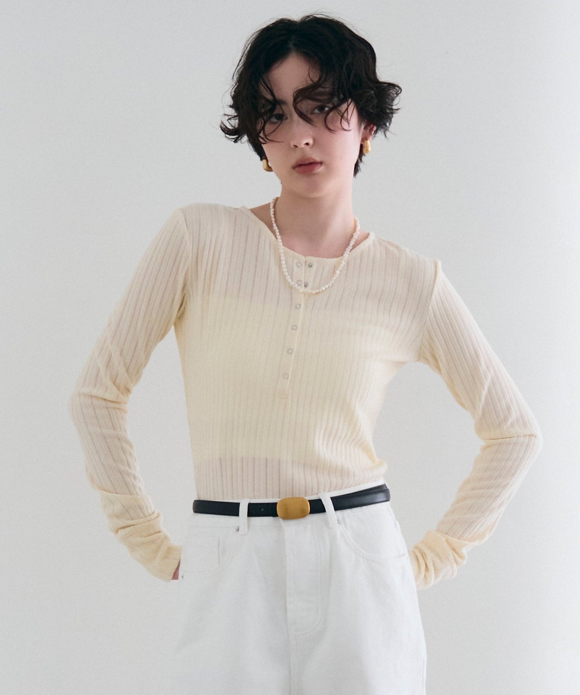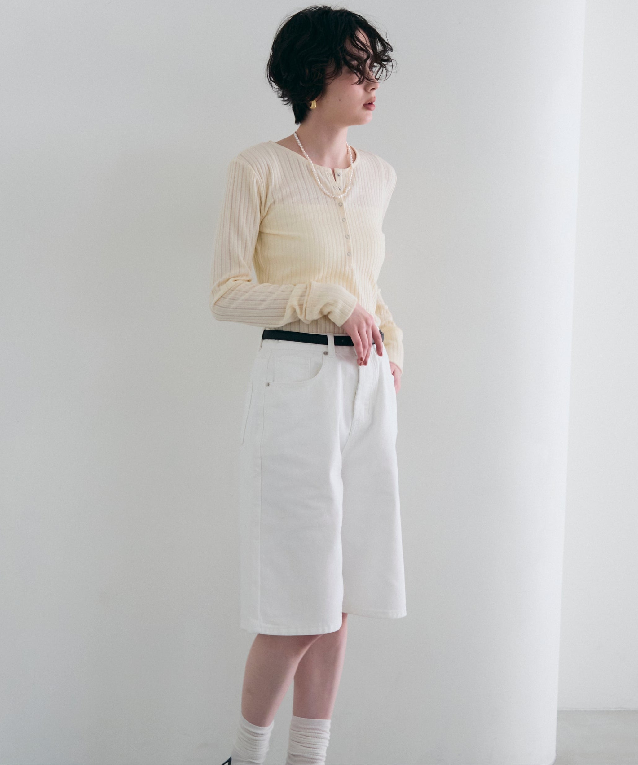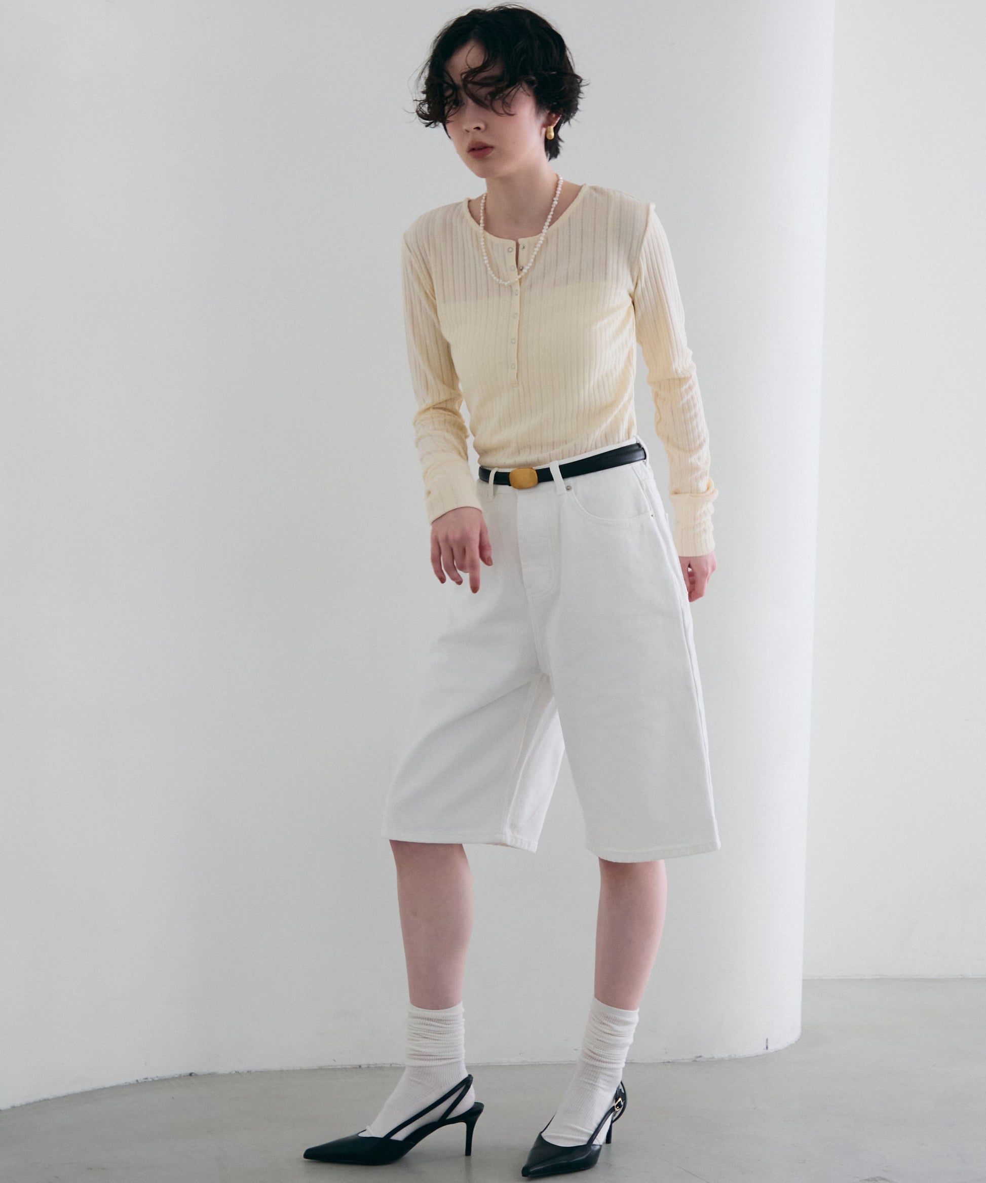 深すぎない絶妙な開きのヘンリーネックが、デコルテラインをきれいに見せつつ、程よい抜け感を演出します。