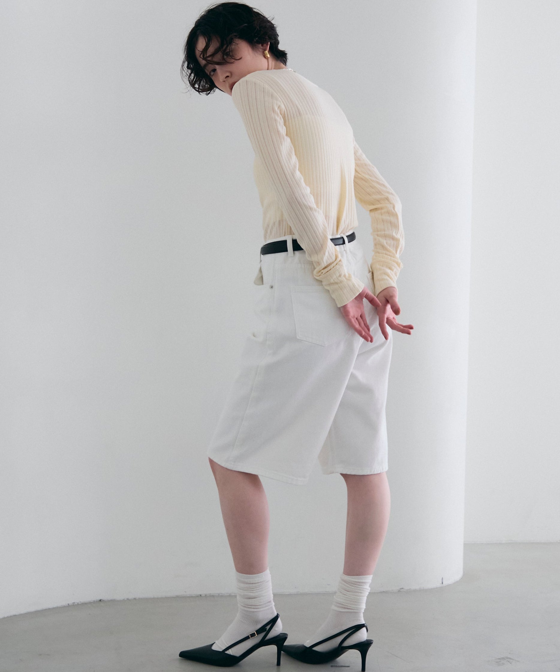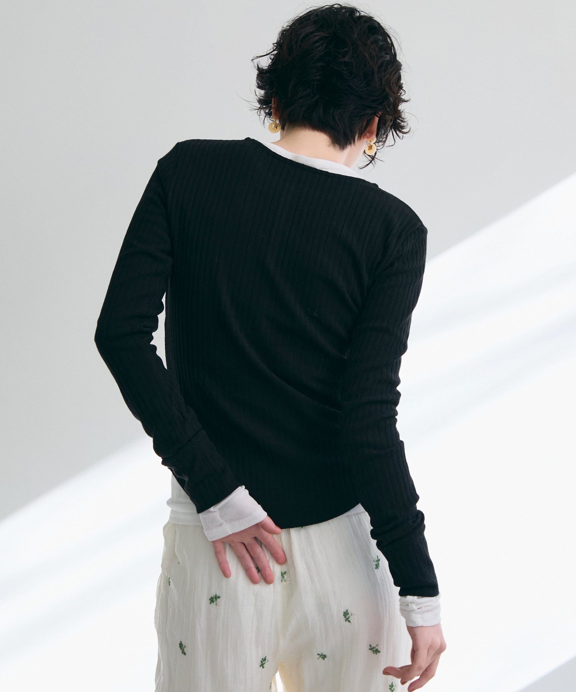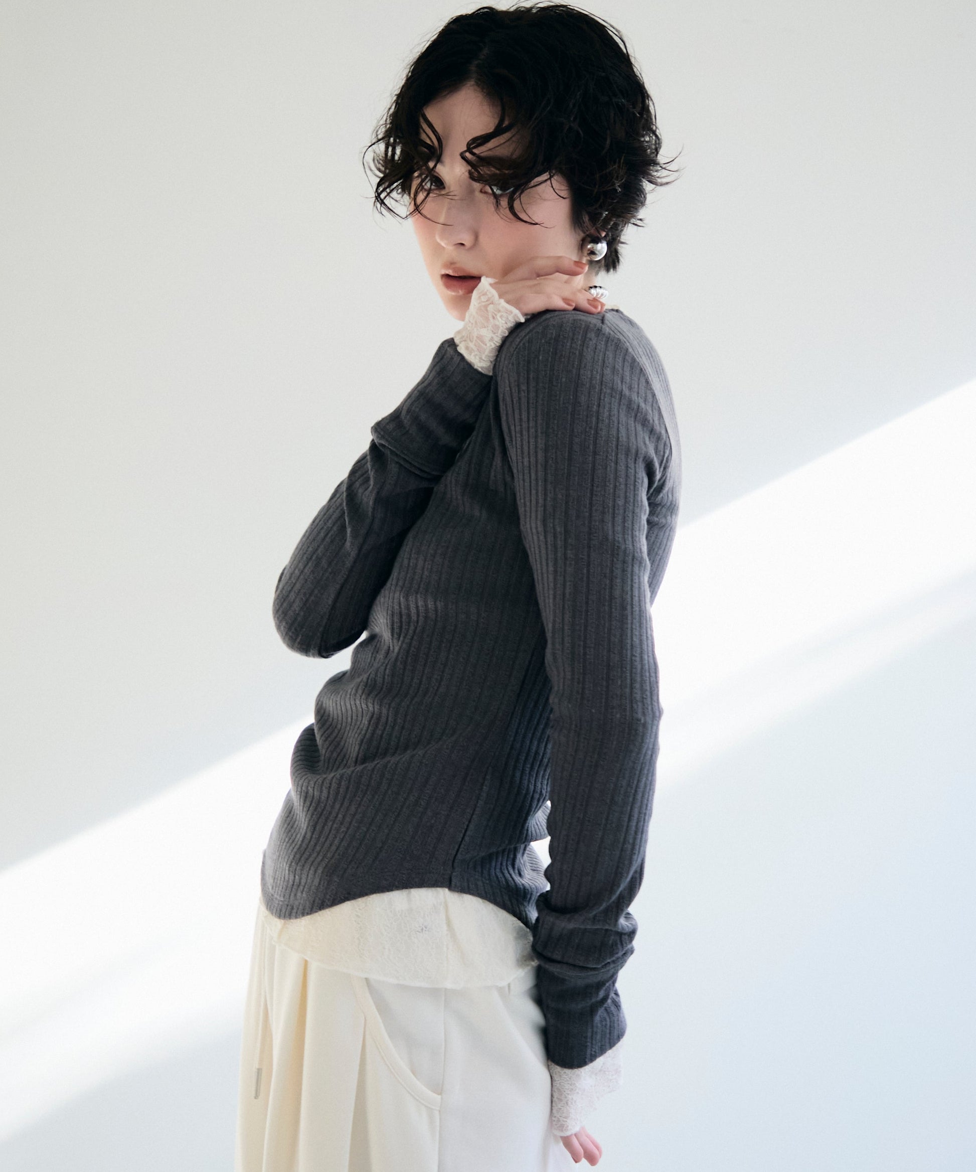 一枚で着用できるちょうど良い厚みと、体のラインを拾いすぎないすっきりとしたシルエットが特徴。