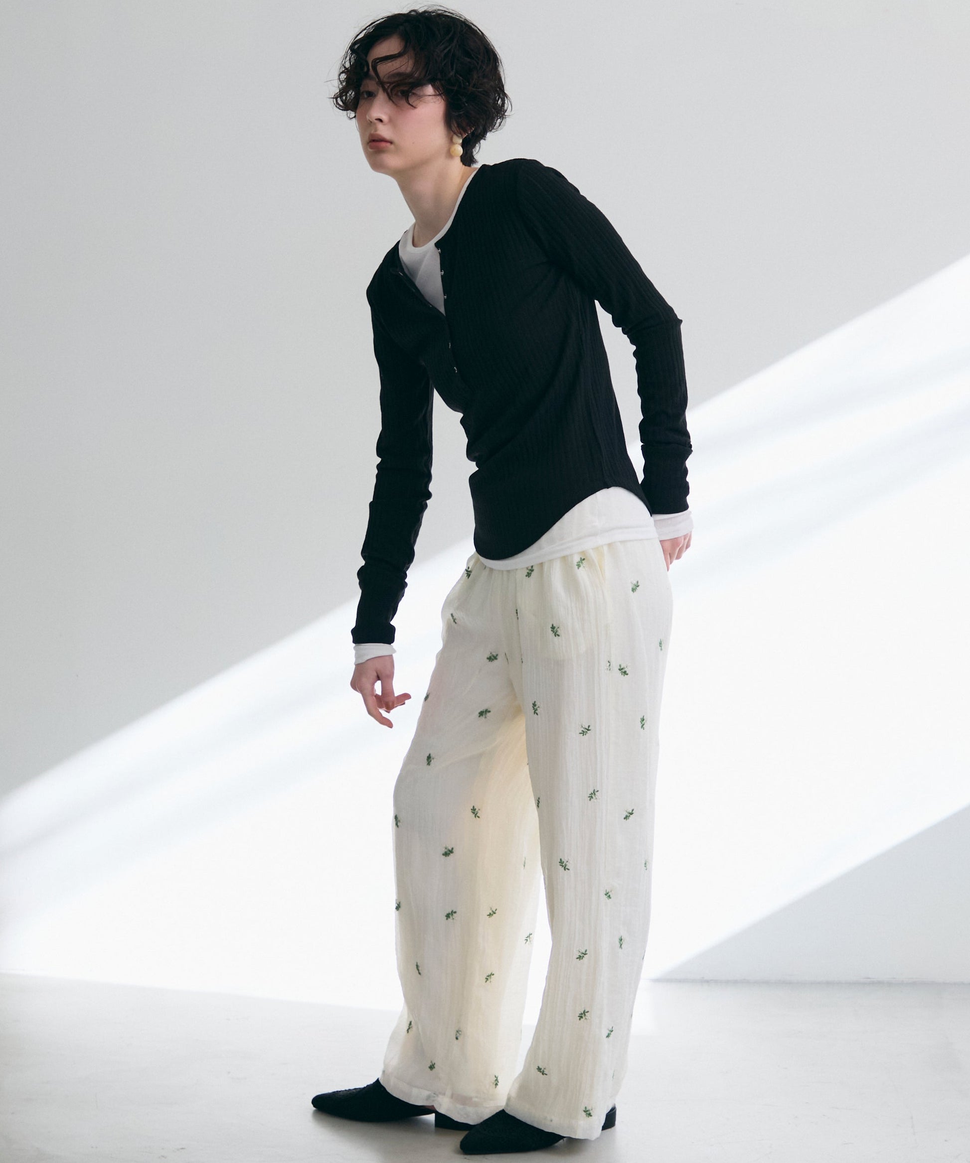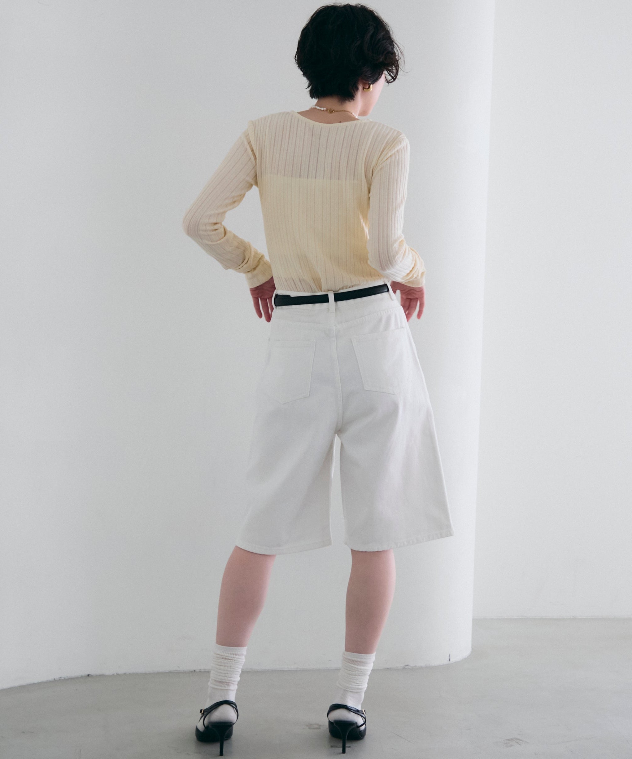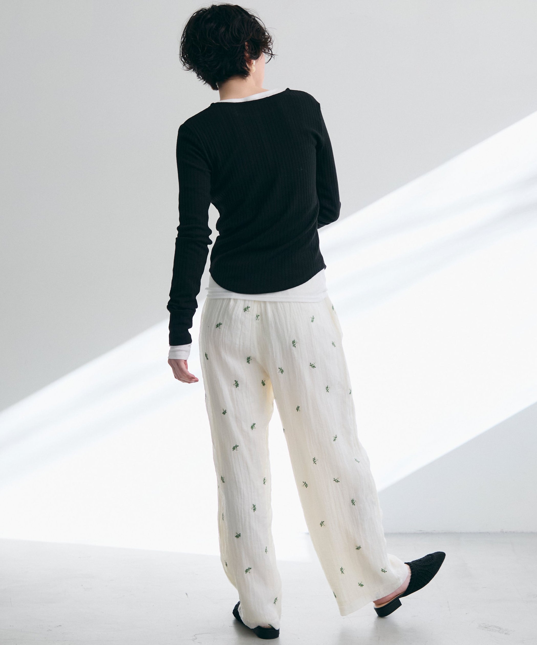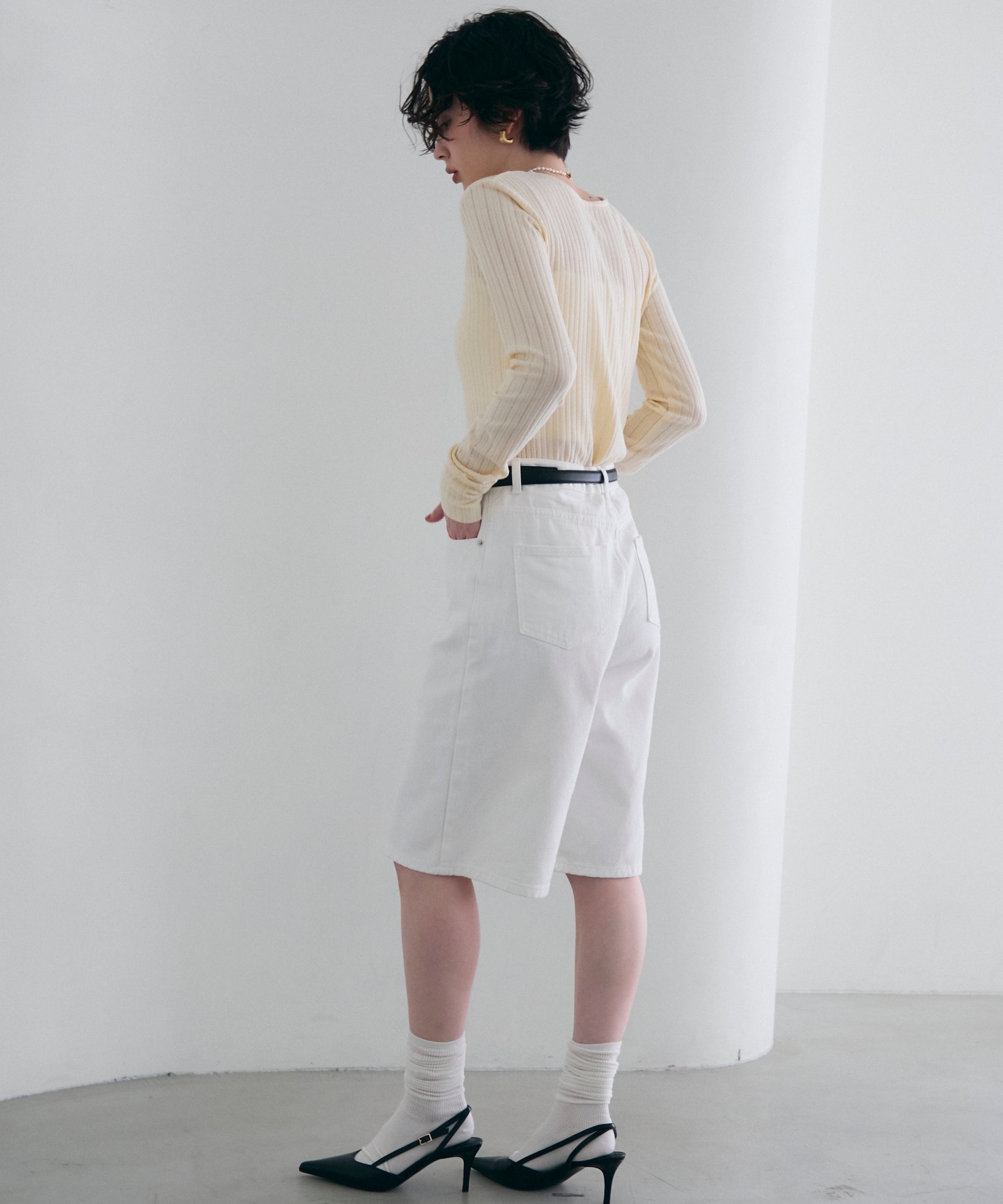 一枚で着用できるちょうど良い厚みと、体のラインを拾いすぎないすっきりとしたシルエットが特徴。