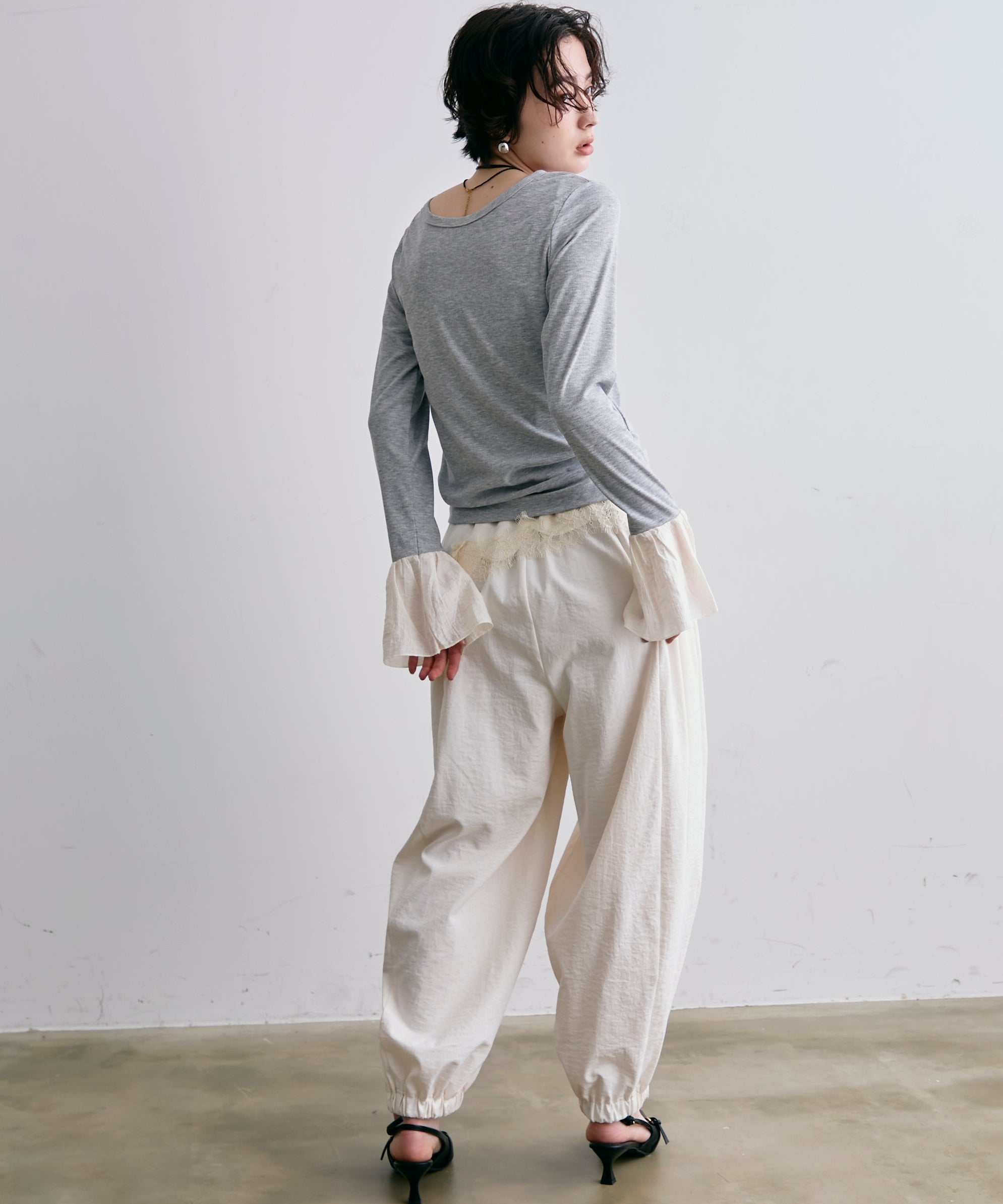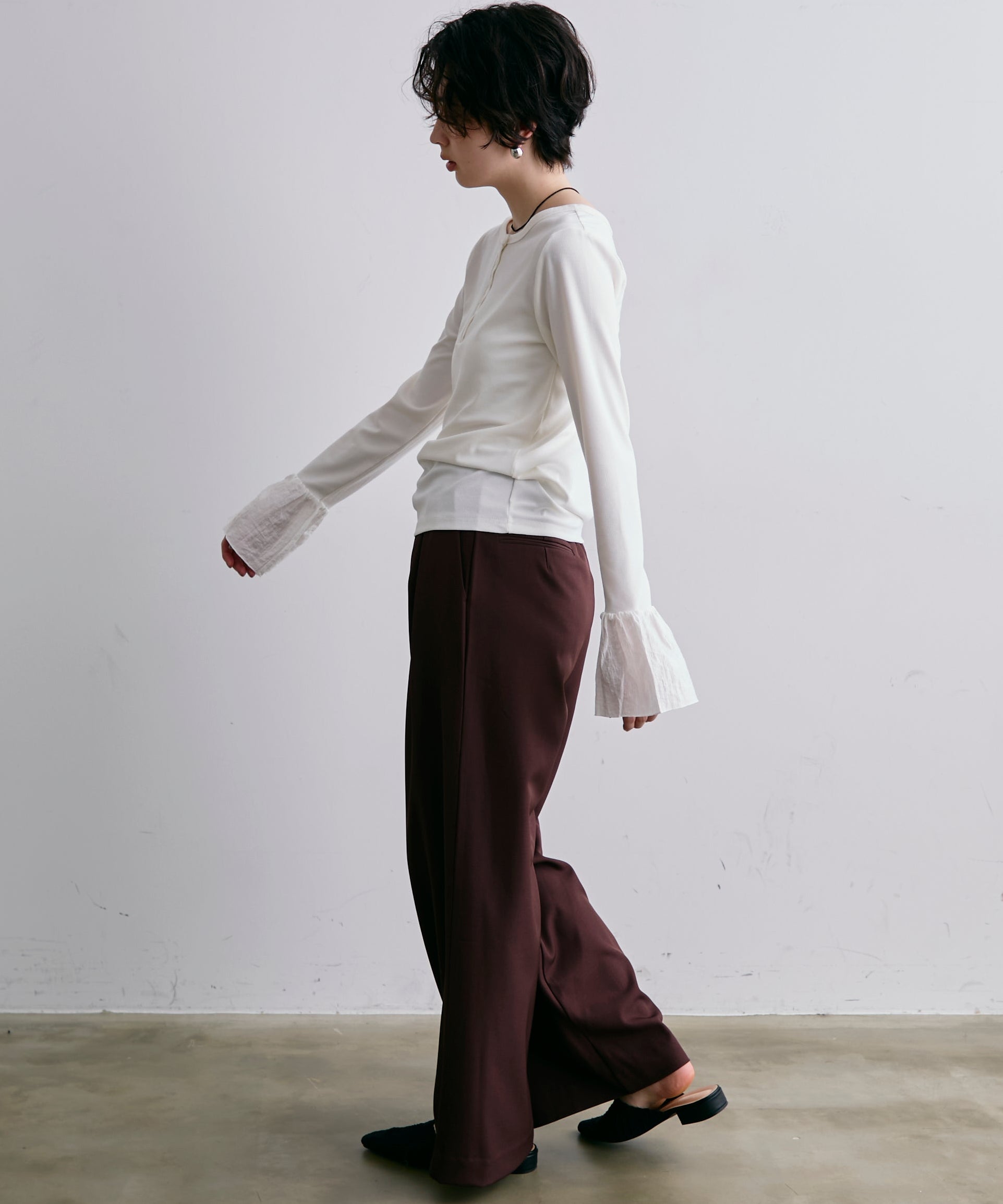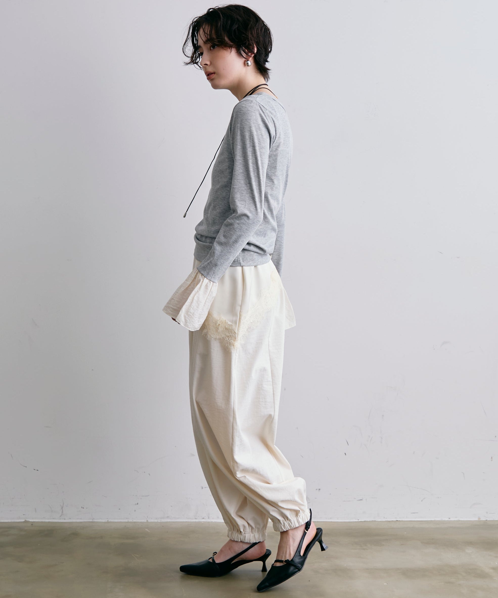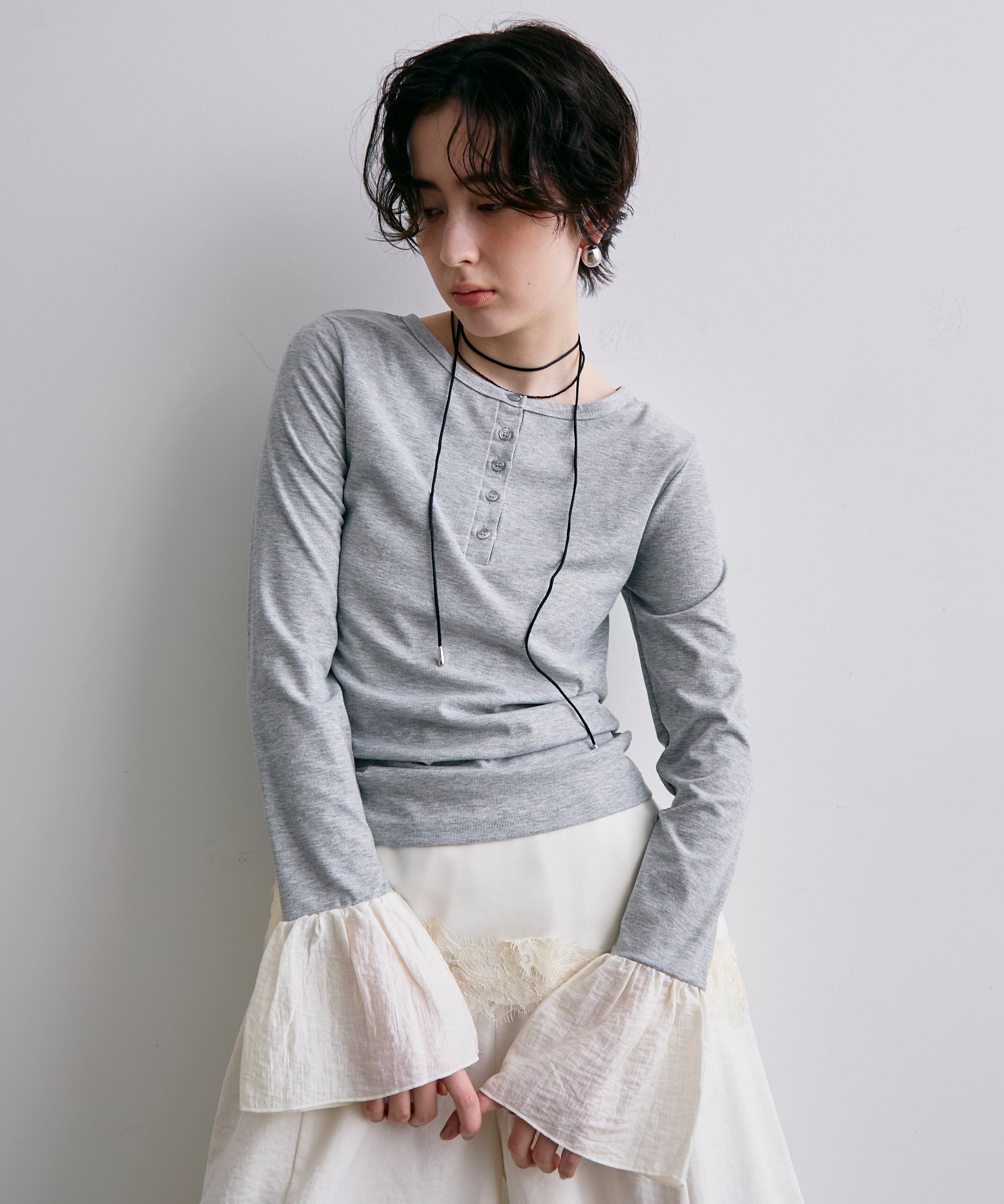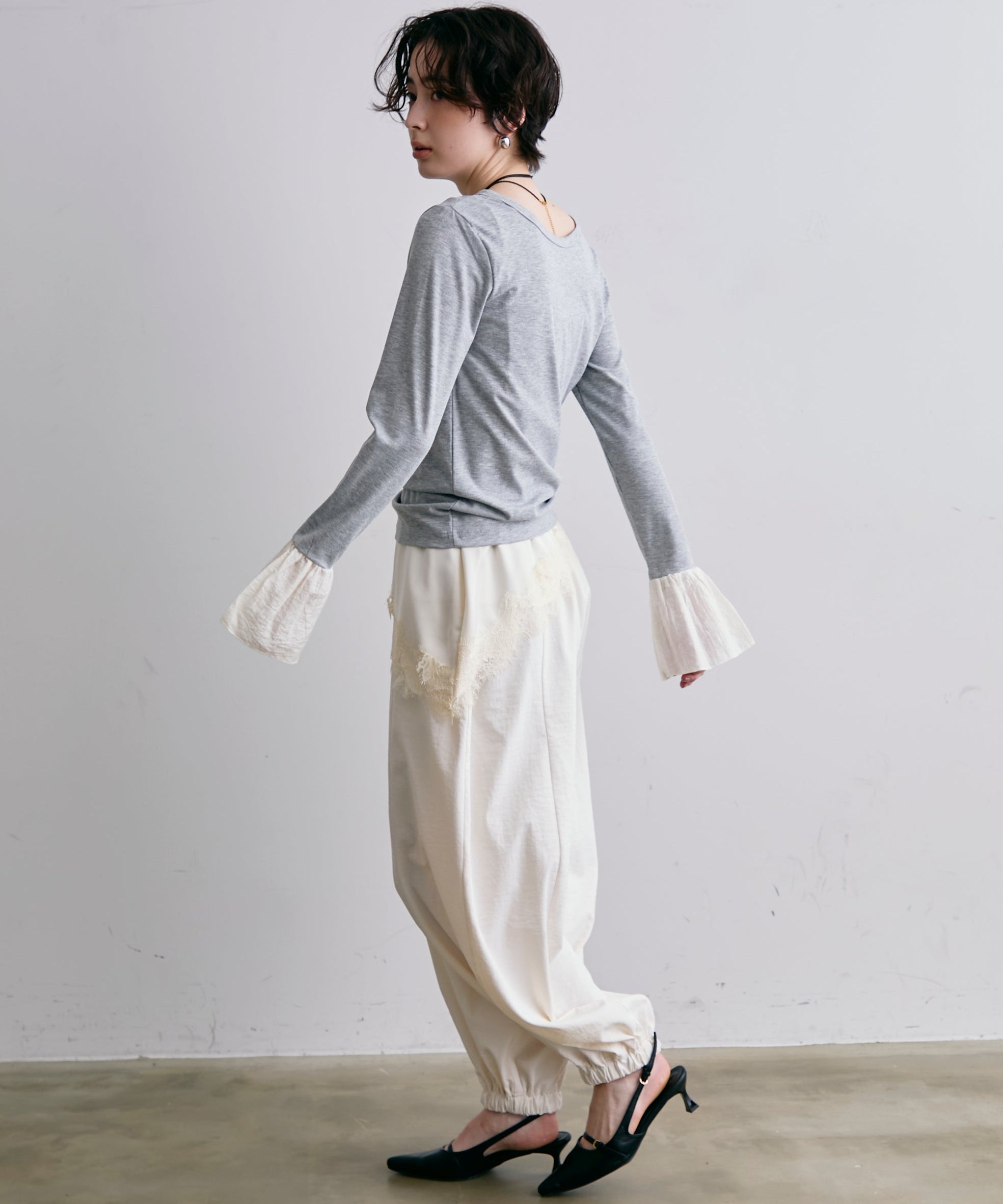 袖口にあしらったフリルデザインが、カジュアルな中にもさりげないフェミニンさをプラスします。