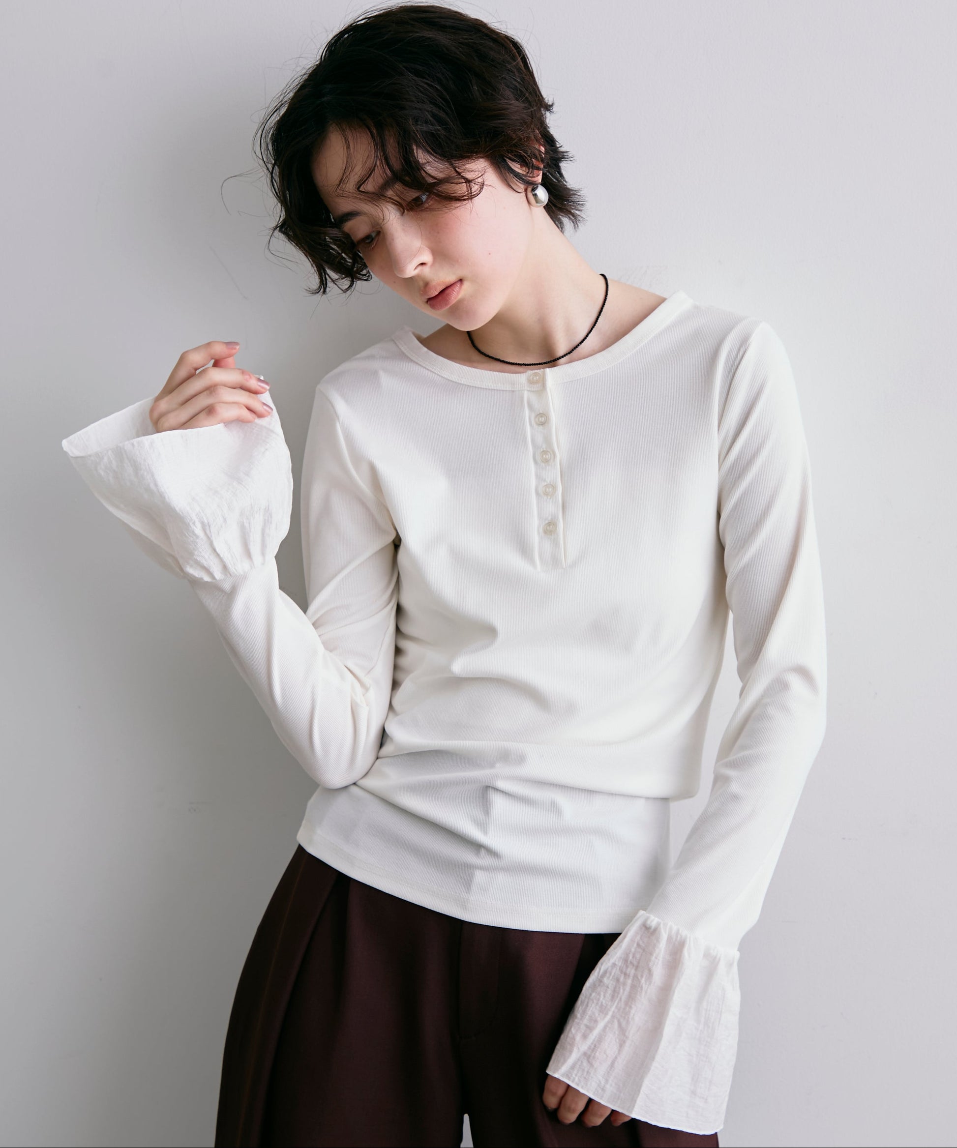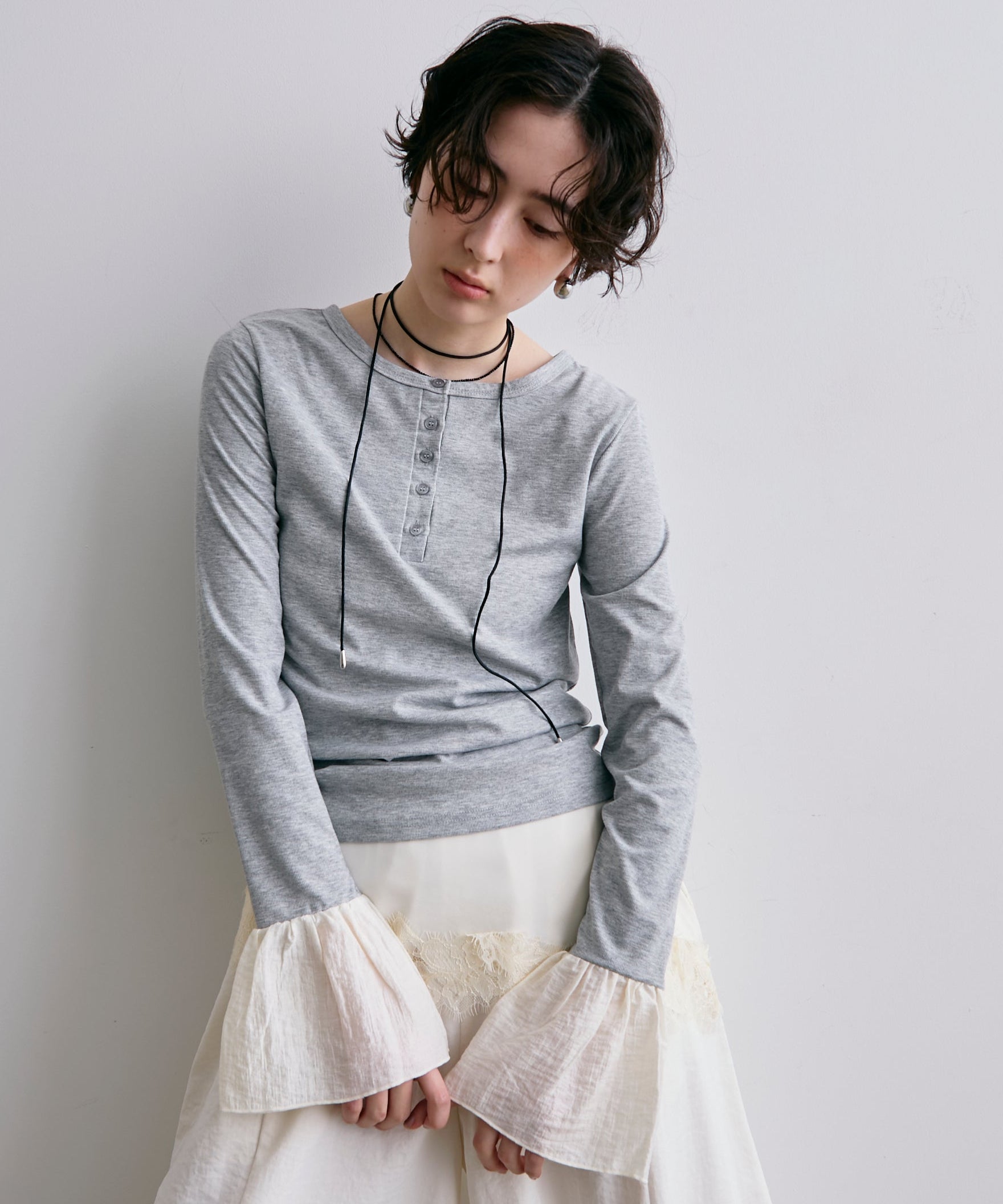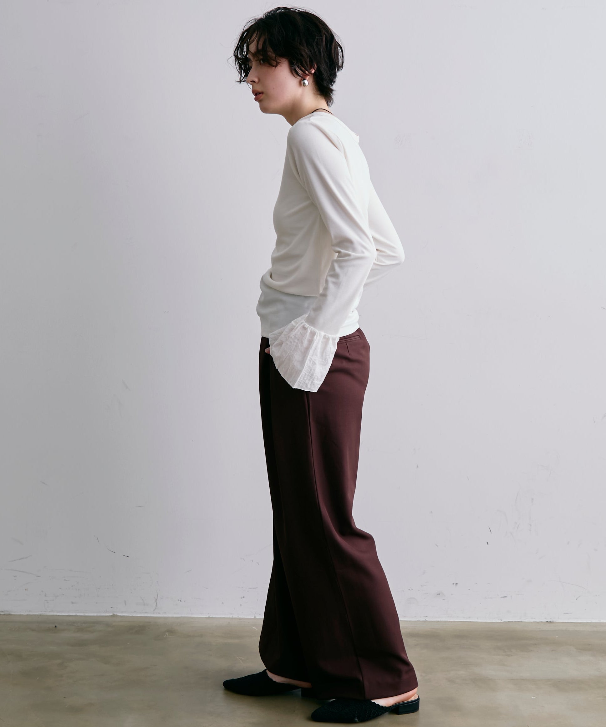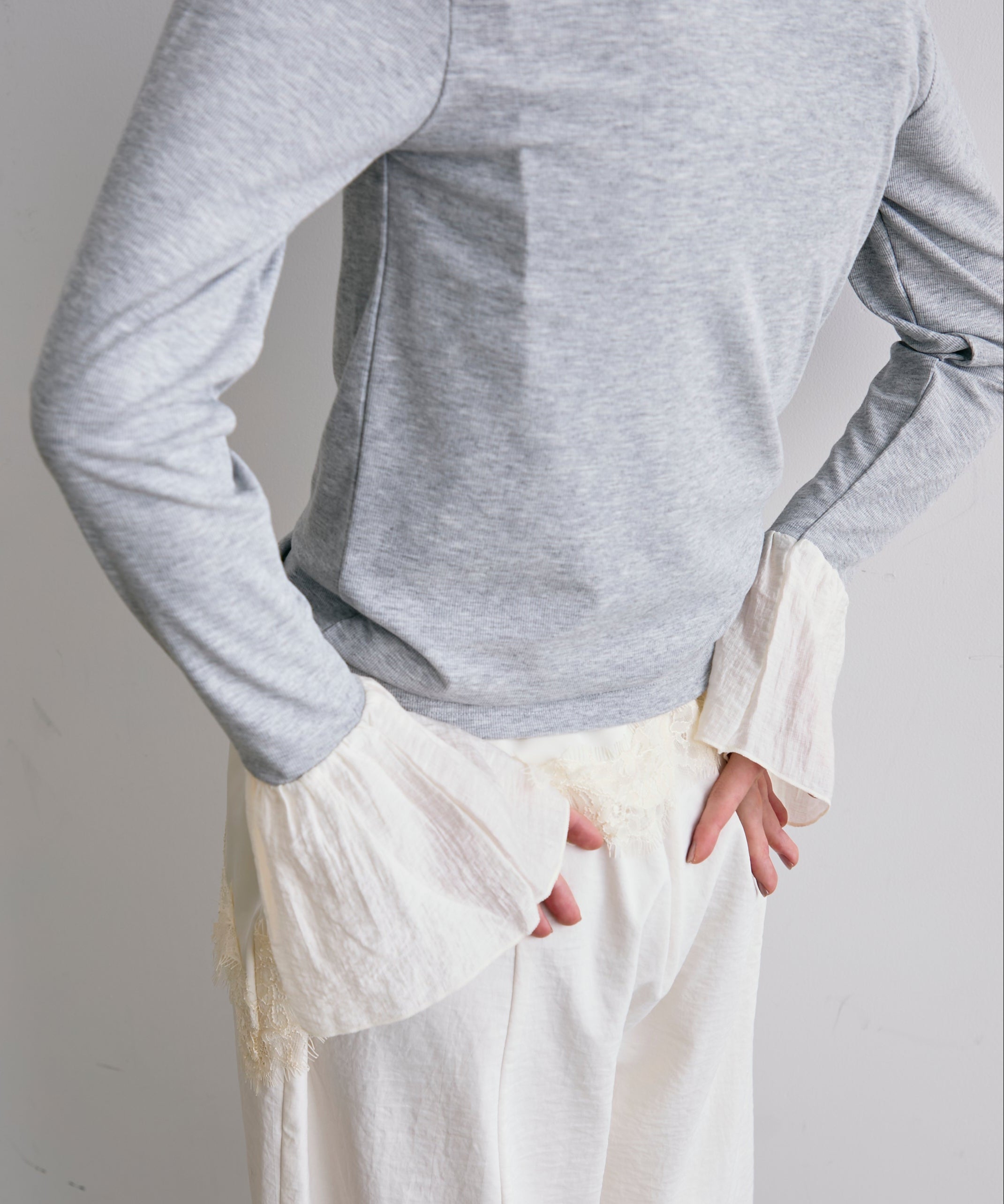 袖口にあしらったフリルデザインが、カジュアルな中にもさりげないフェミニンさをプラスします。
