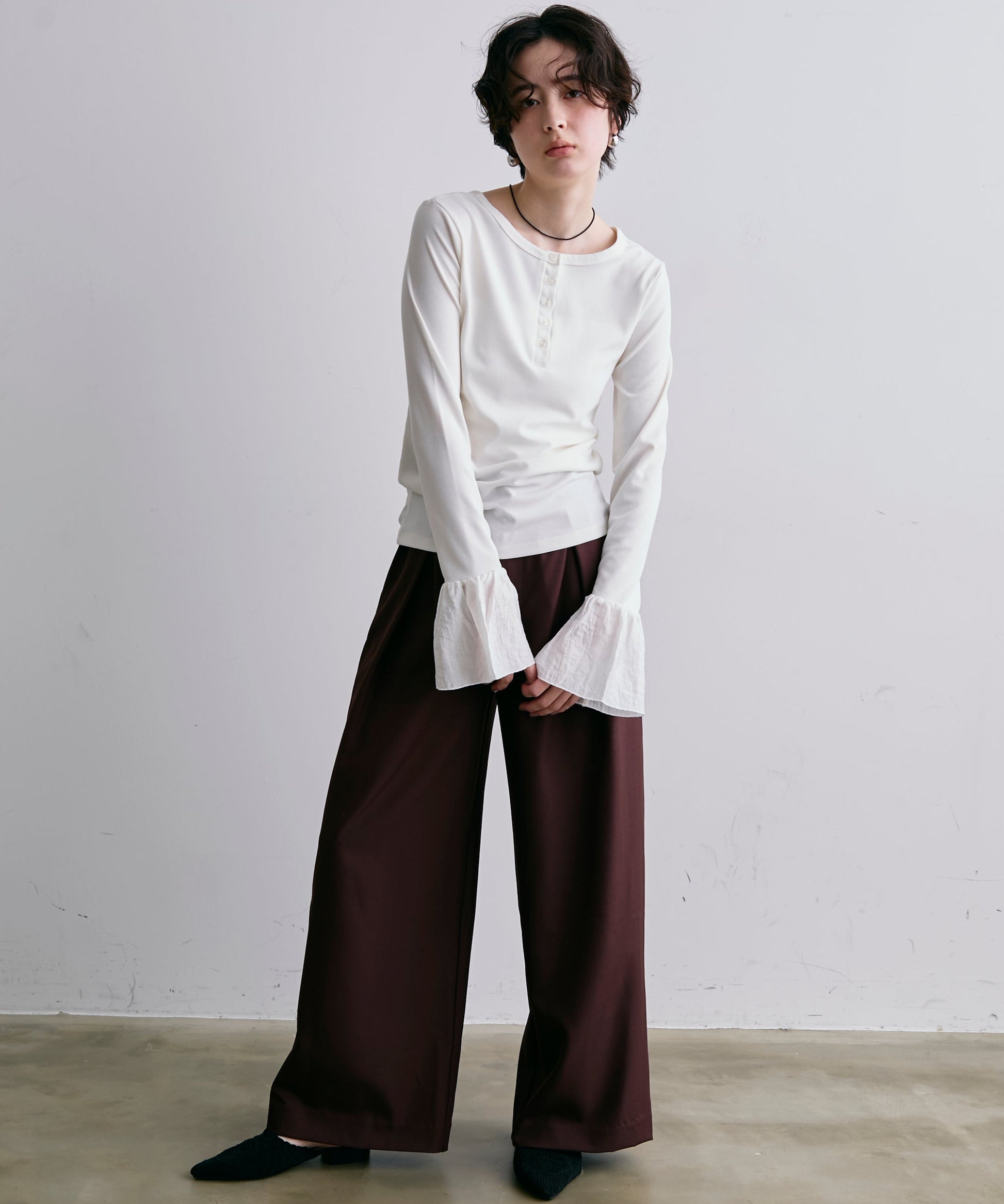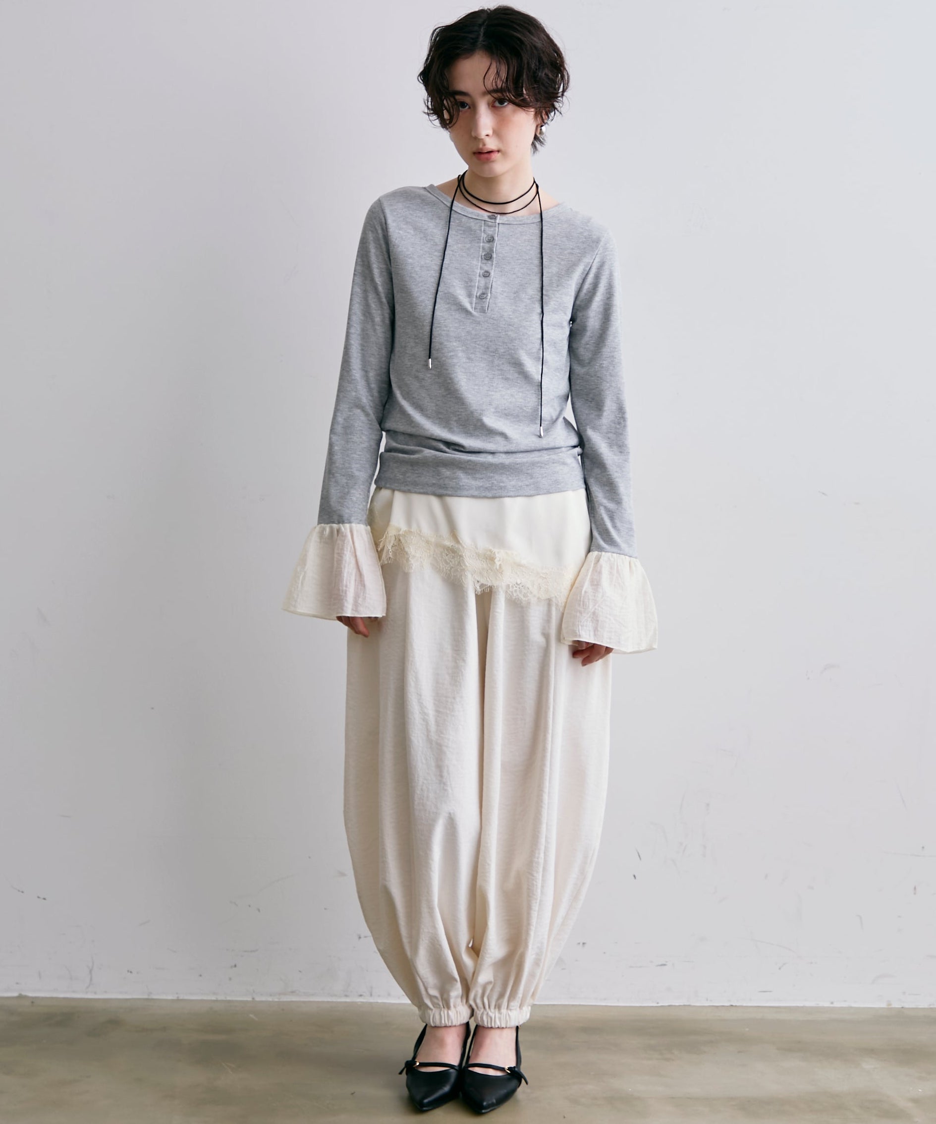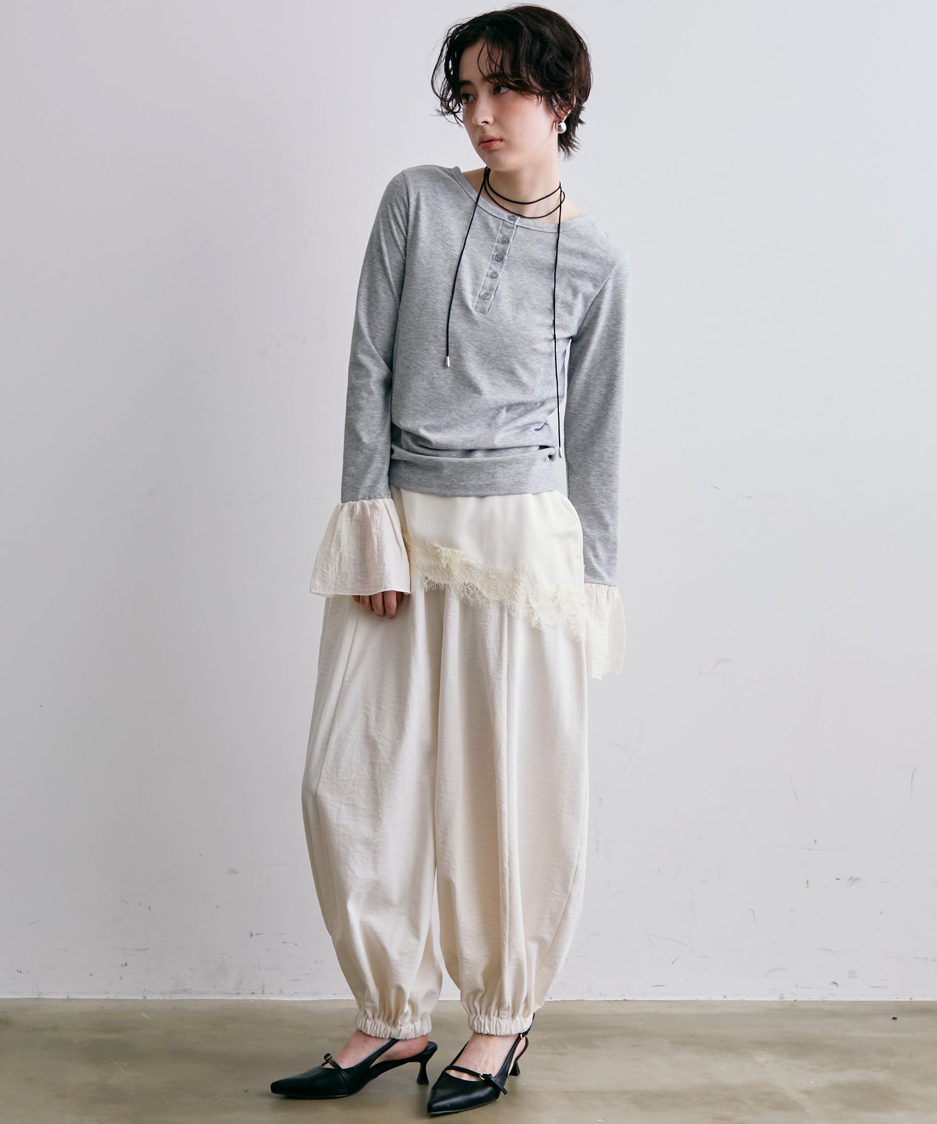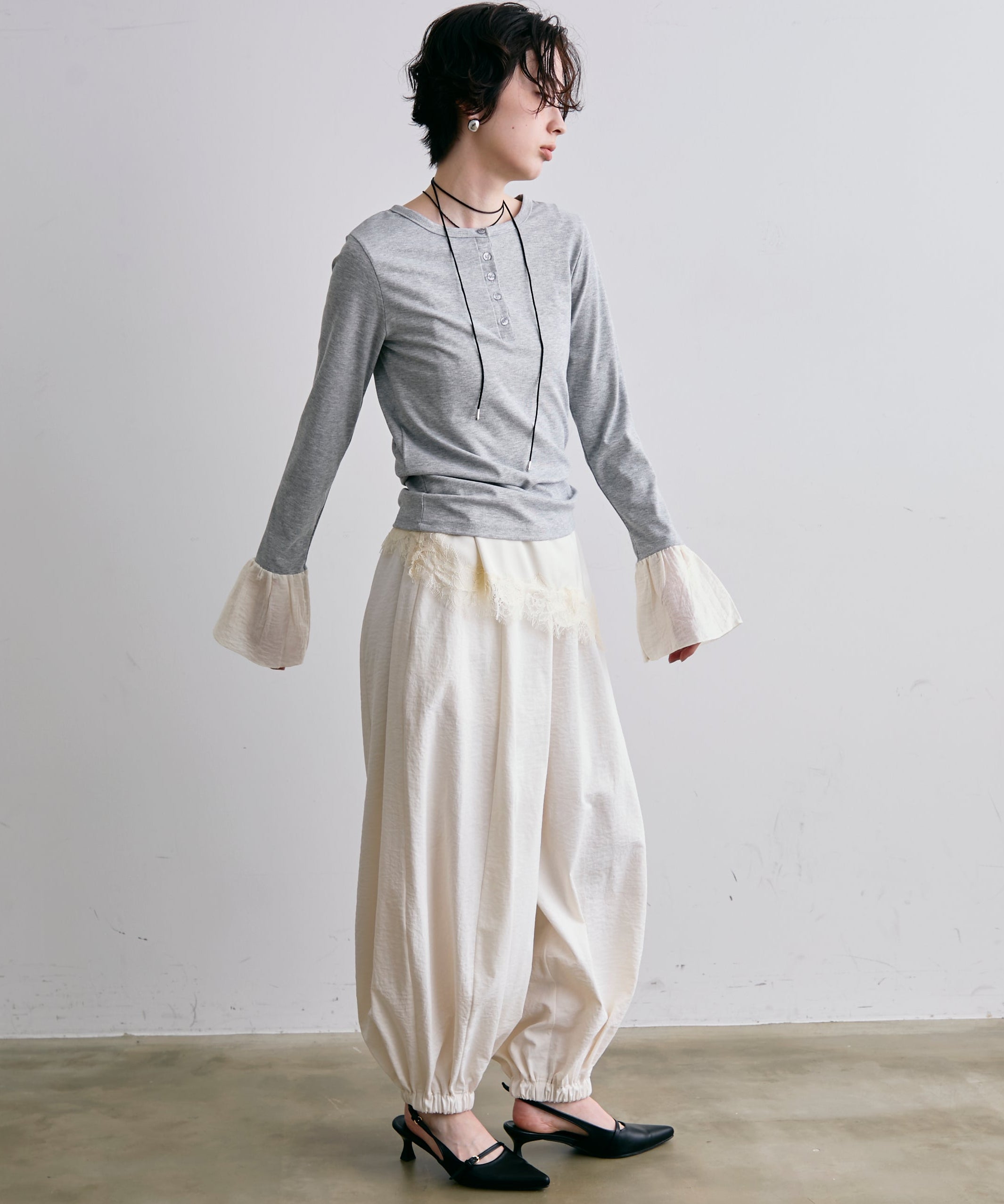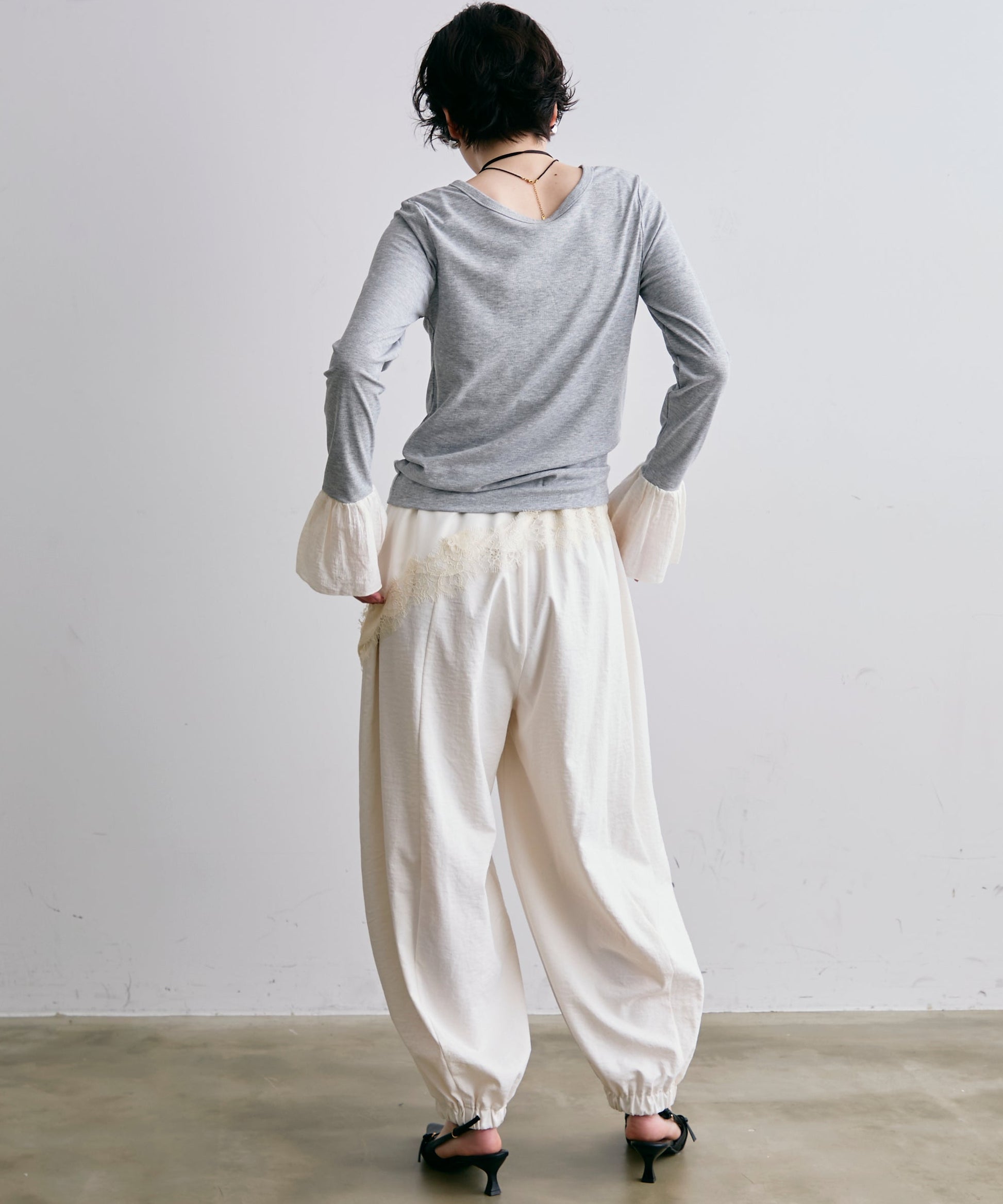 袖口にあしらったフリルデザインが、カジュアルな中にもさりげないフェミニンさをプラスします。