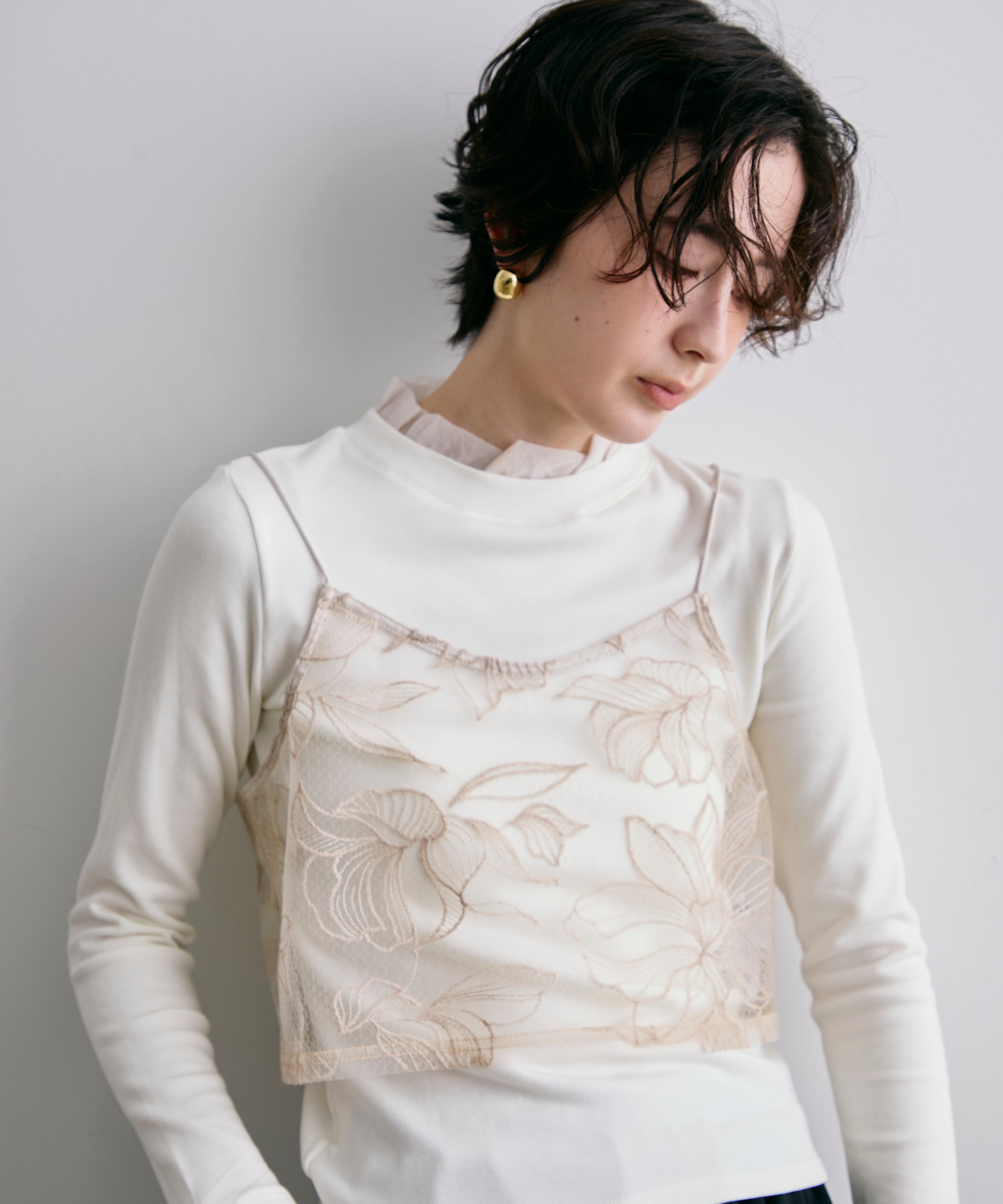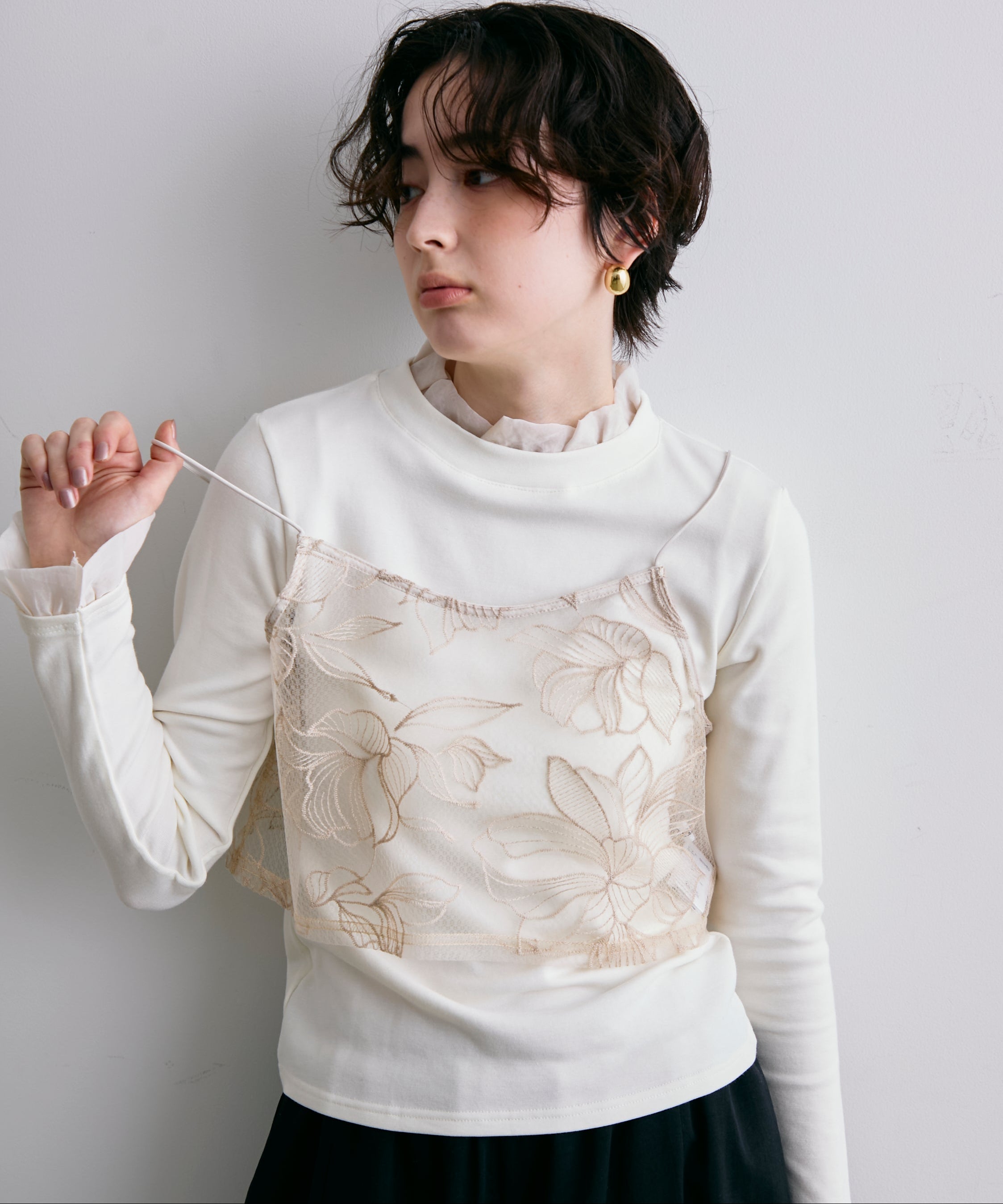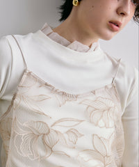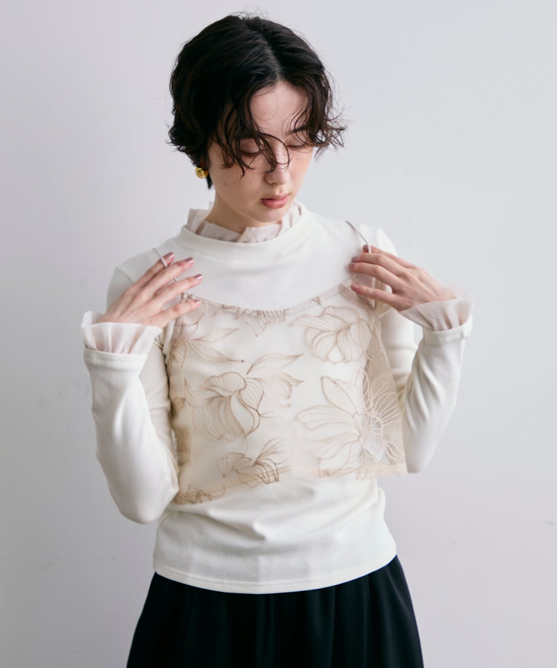 軽やかなオーガンジー素材を重ねた、華やかさ満点のレイヤード風カットソー。