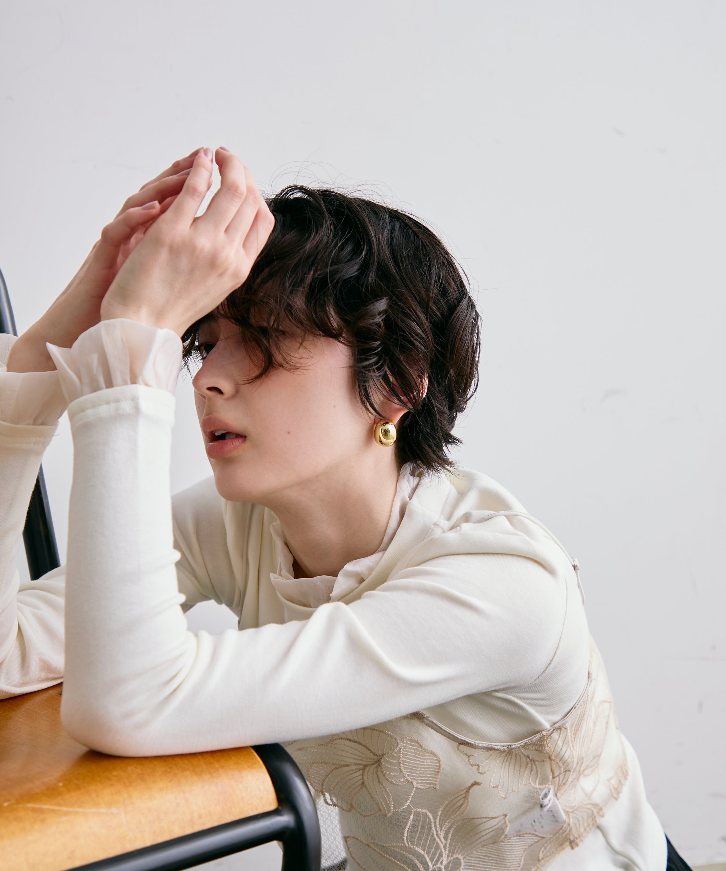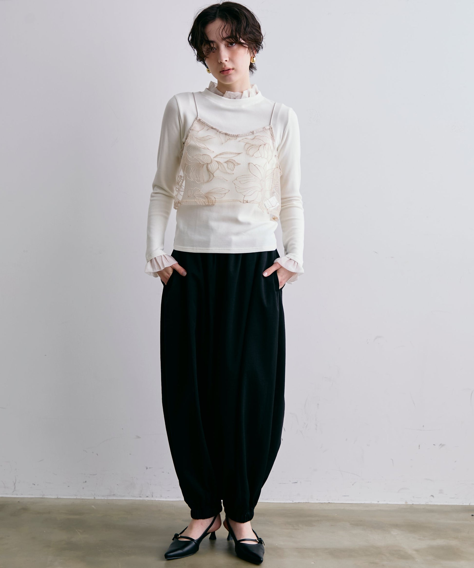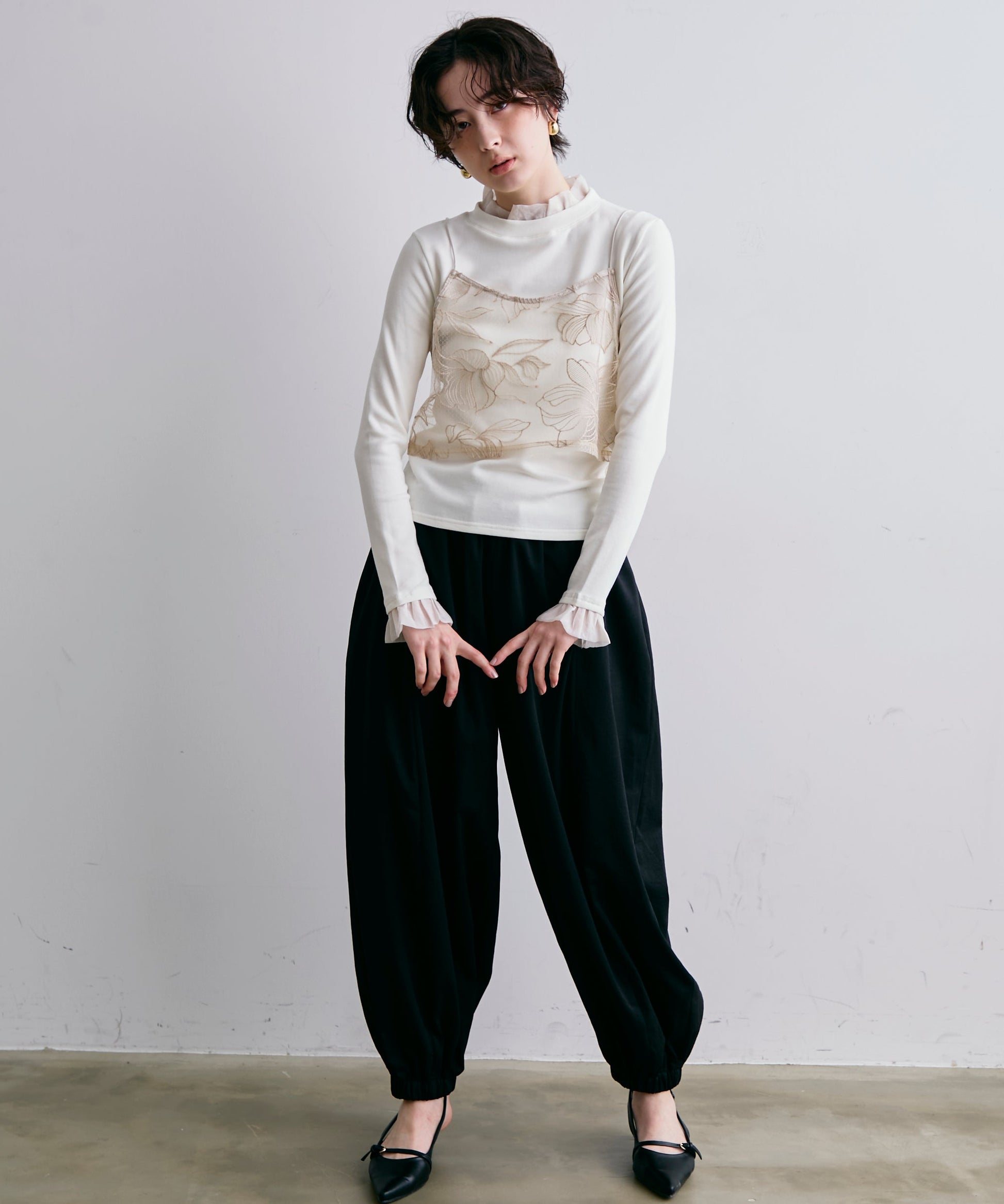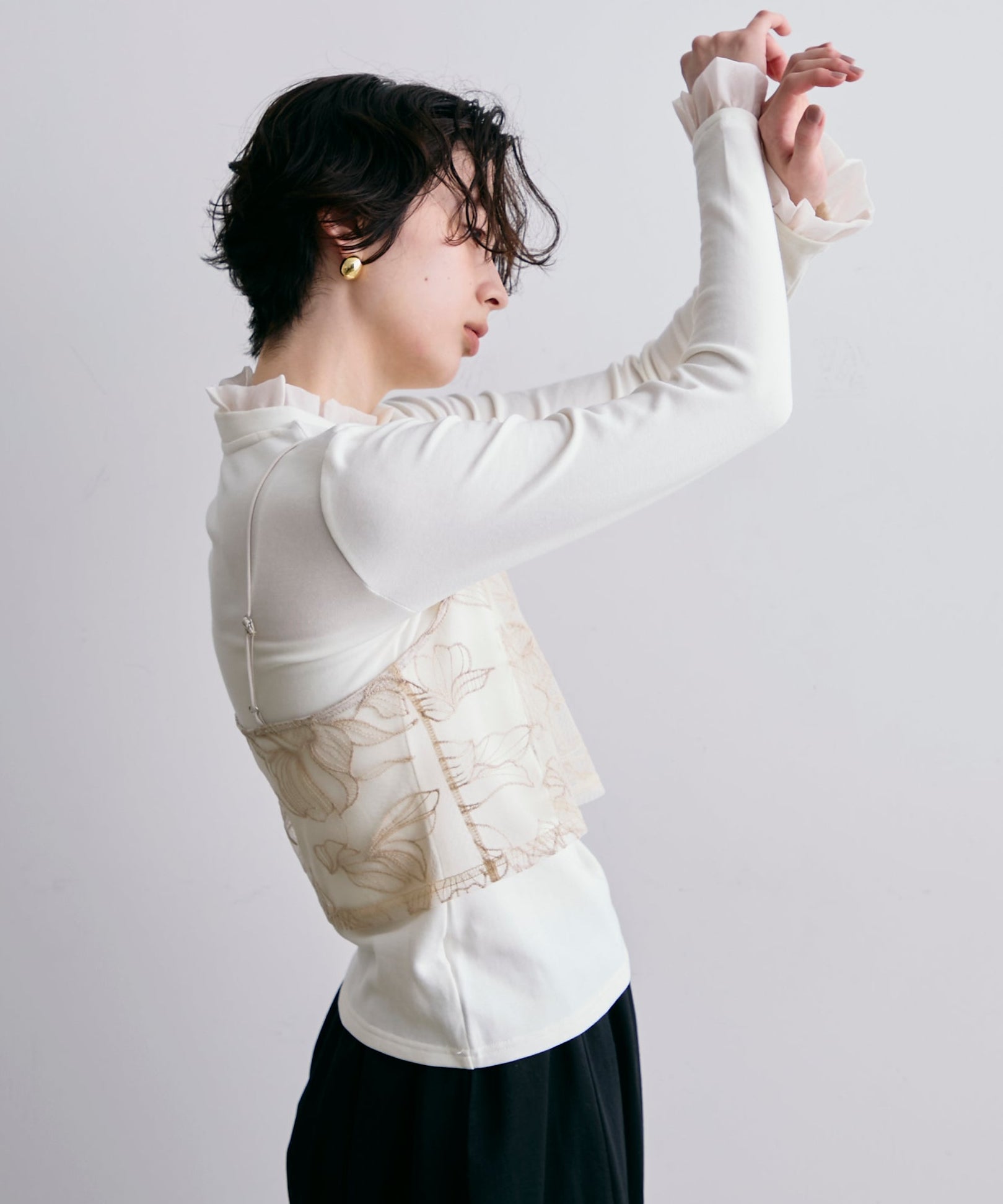 軽やかなオーガンジー素材を重ねた、華やかさ満点のレイヤード風カットソー。