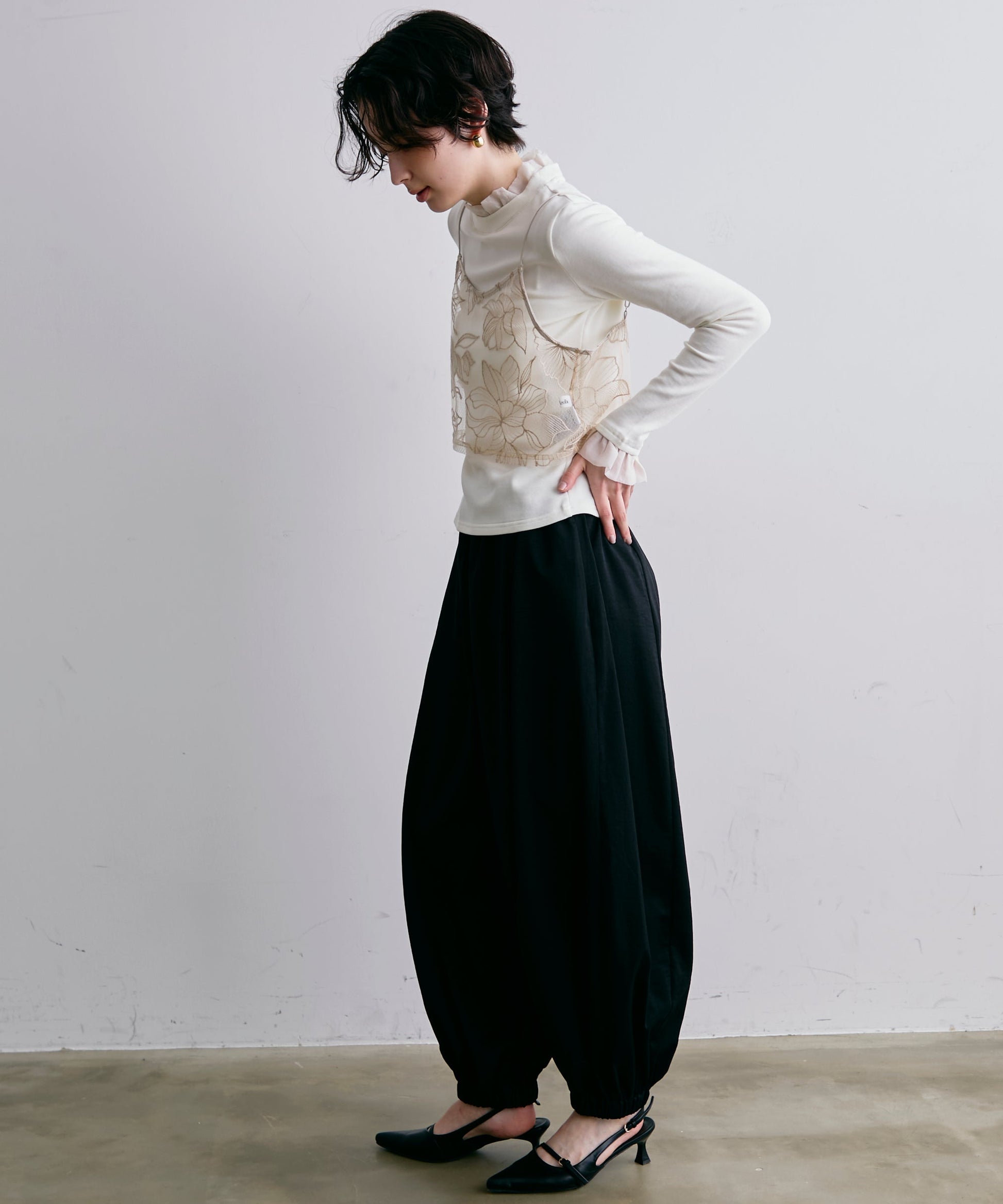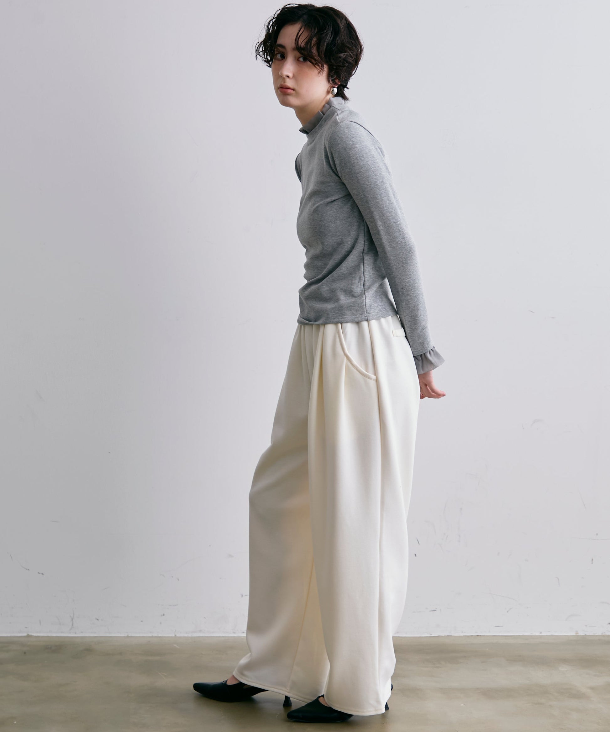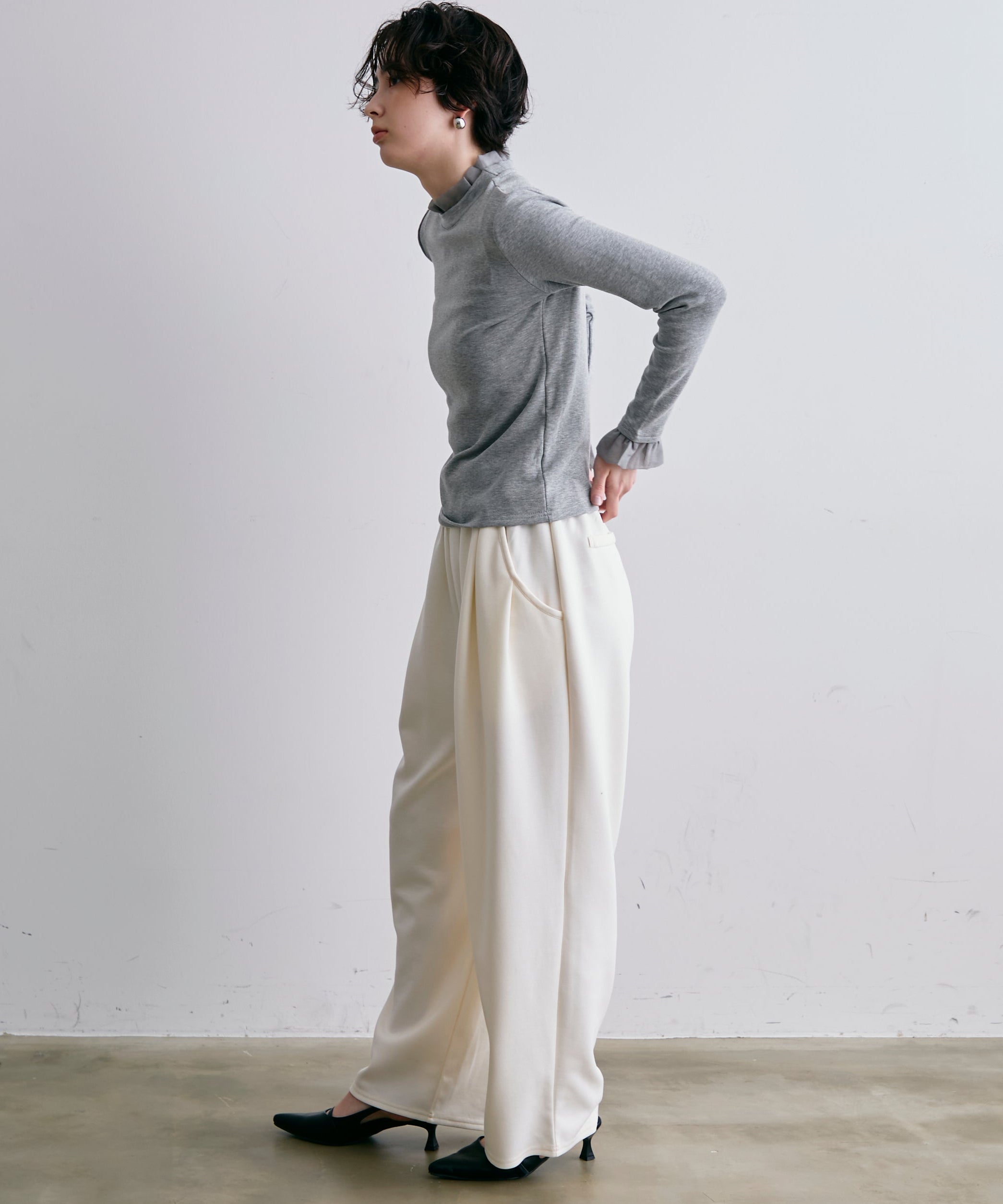 コーデに上品な立体感をプラスします。身頃は伸縮性のあるカットソー生地で着心地も快適。