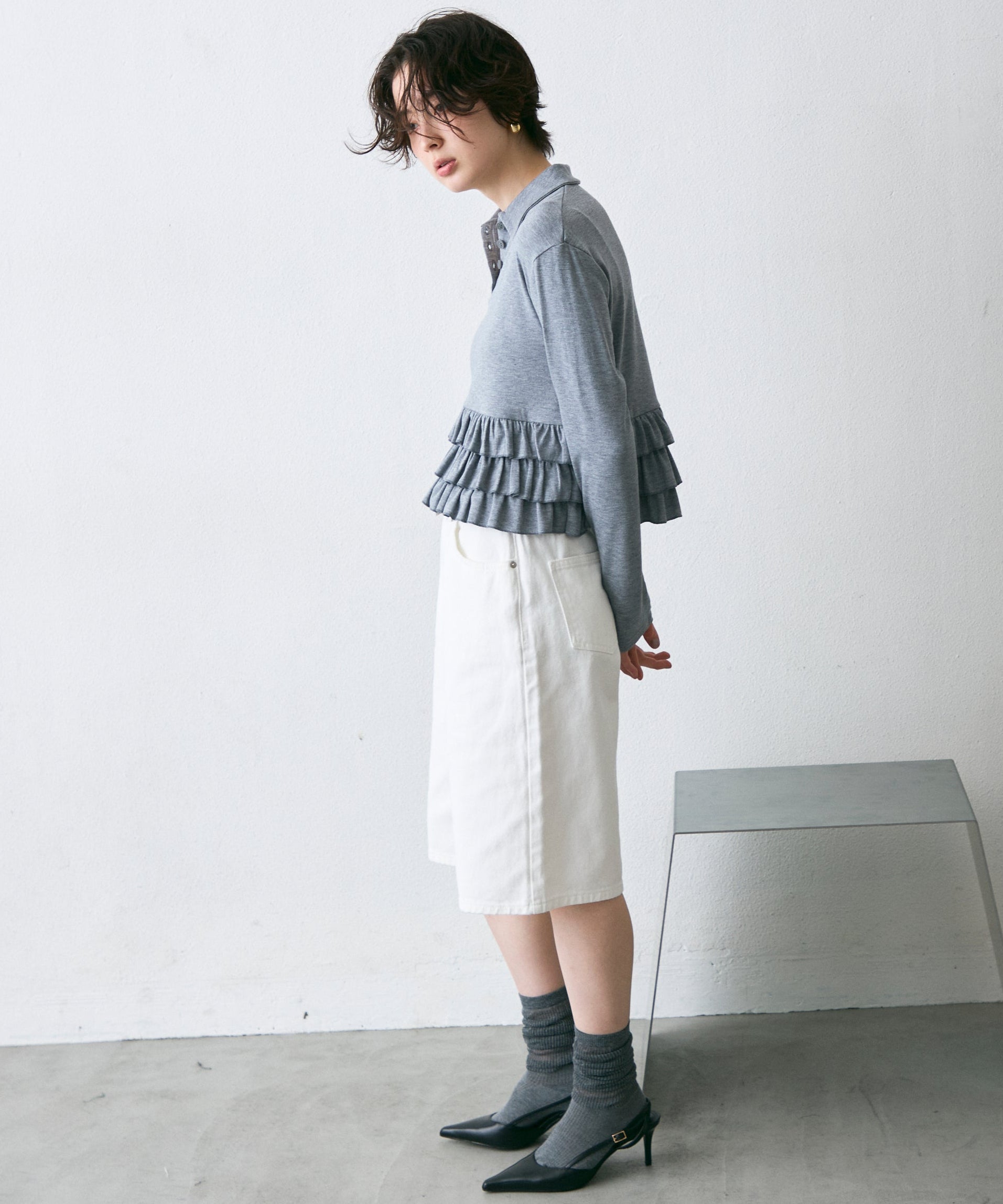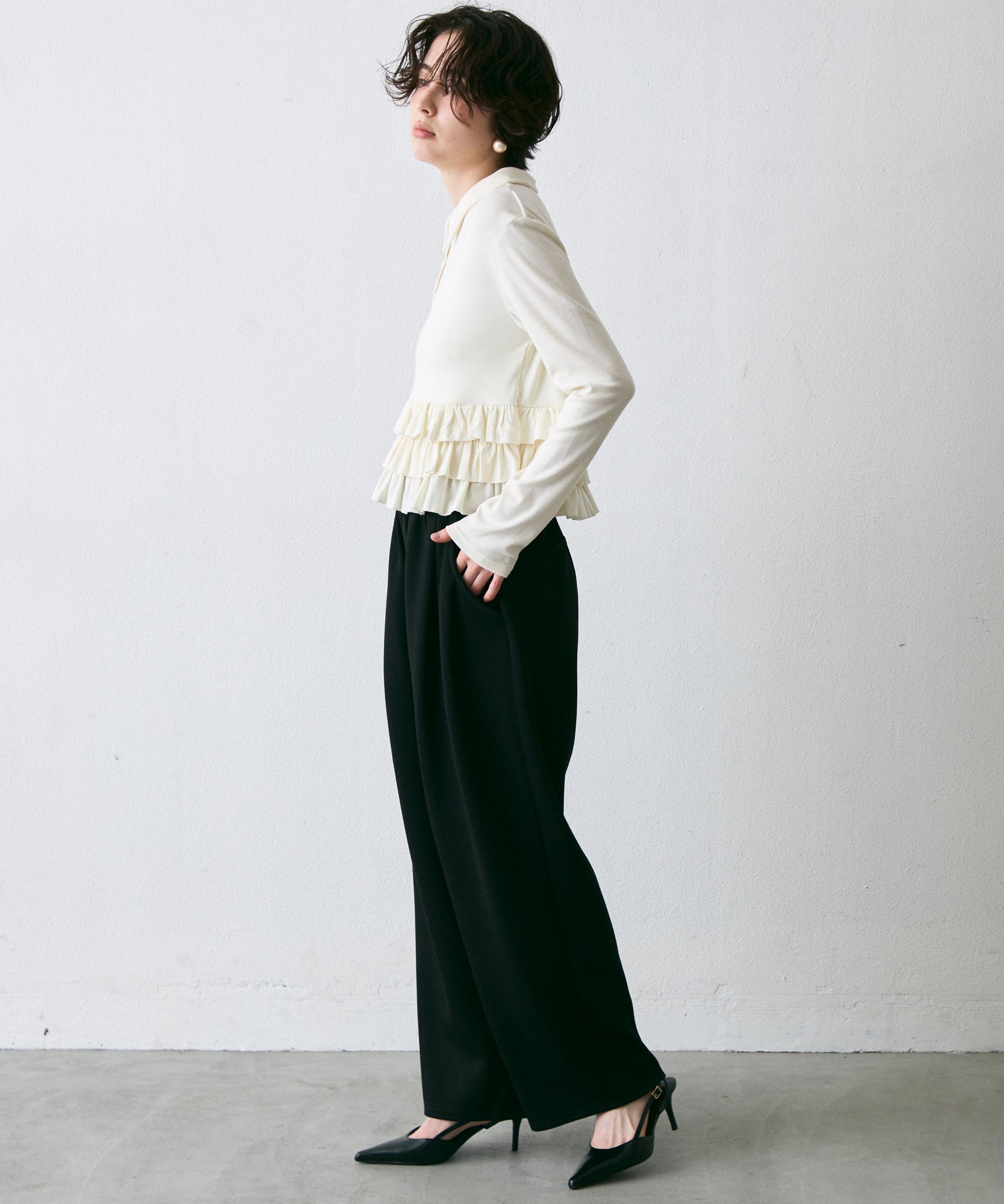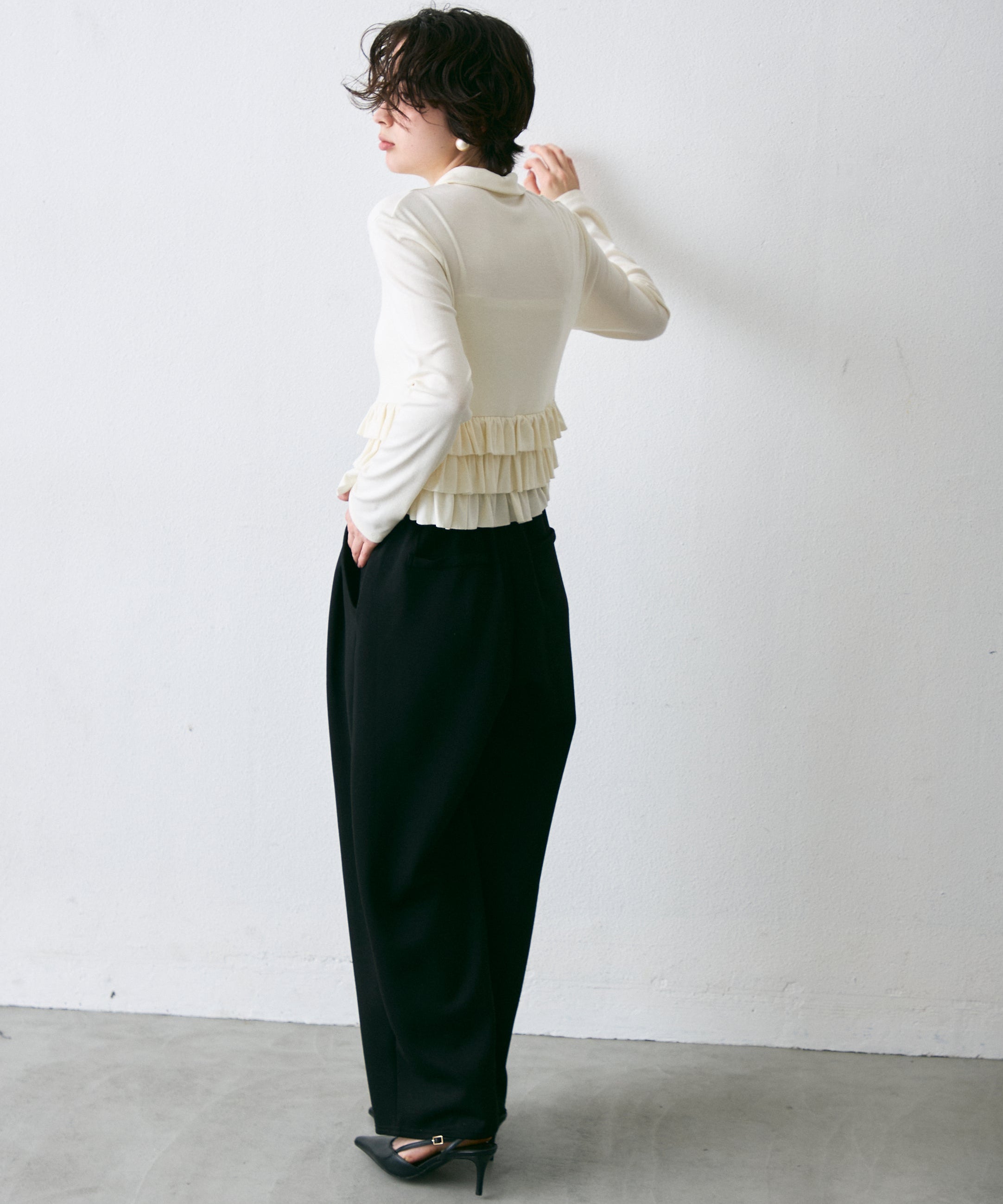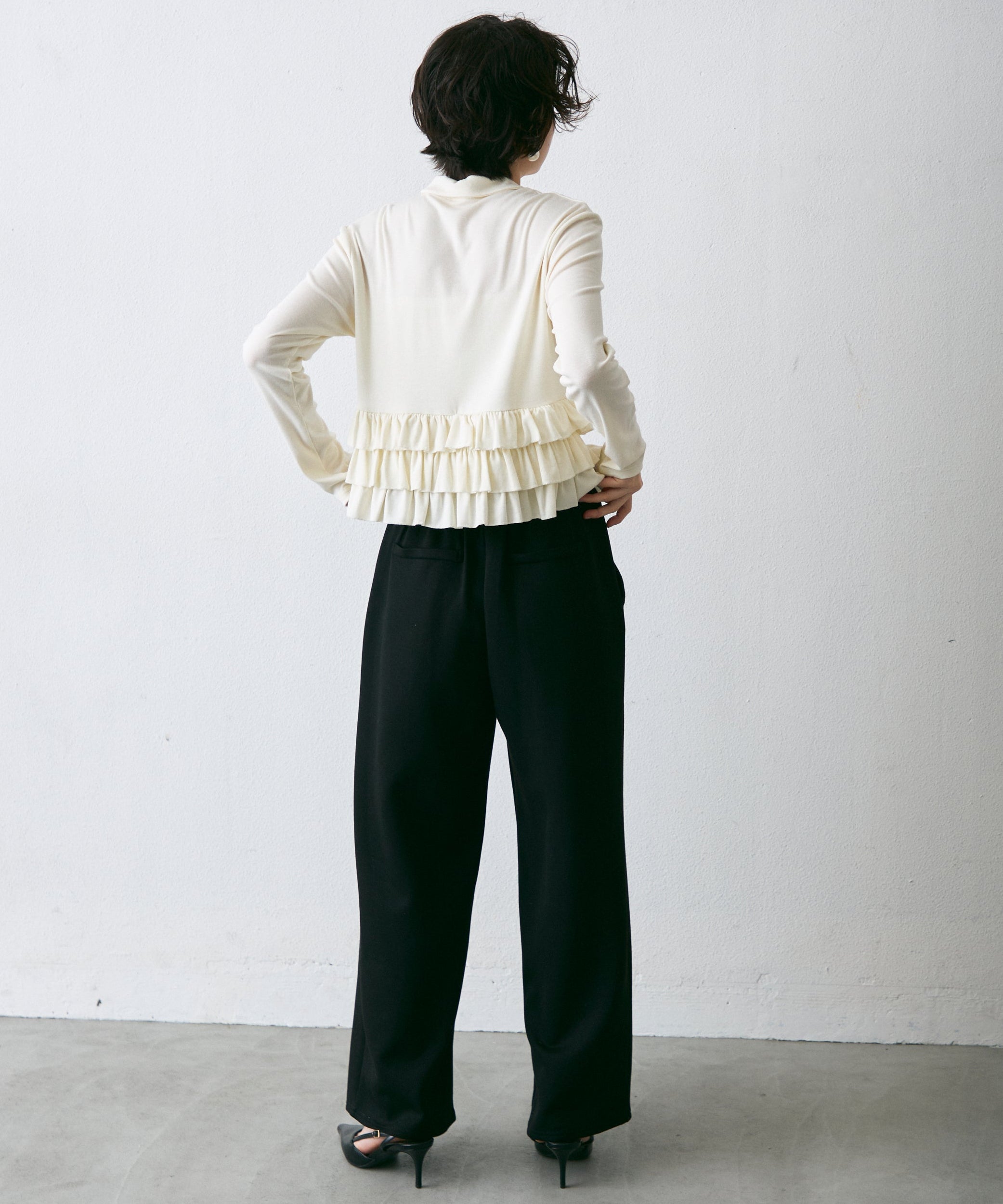 裾のフリルが動くたびに揺れ、さりげなく可愛さを演出します。