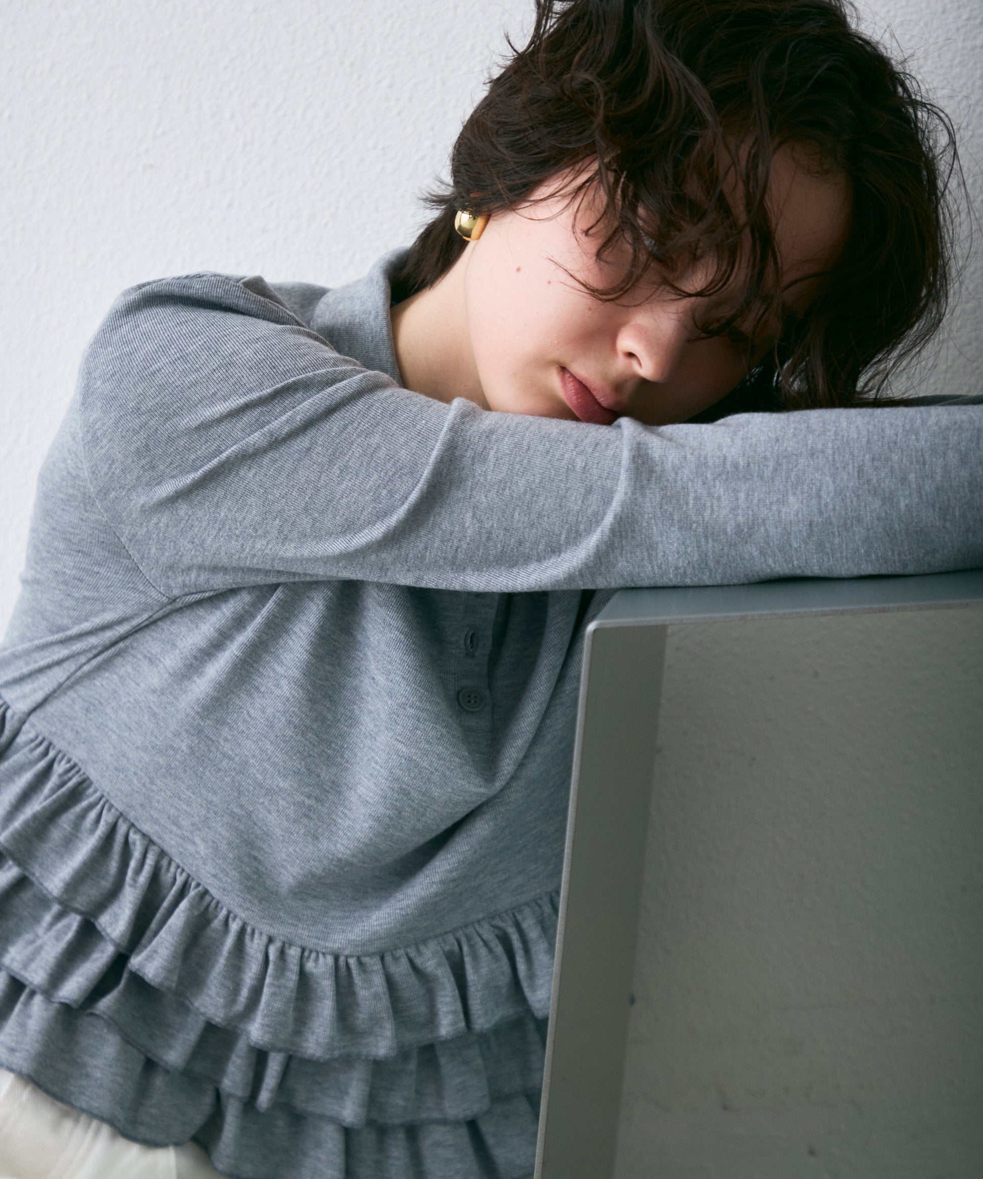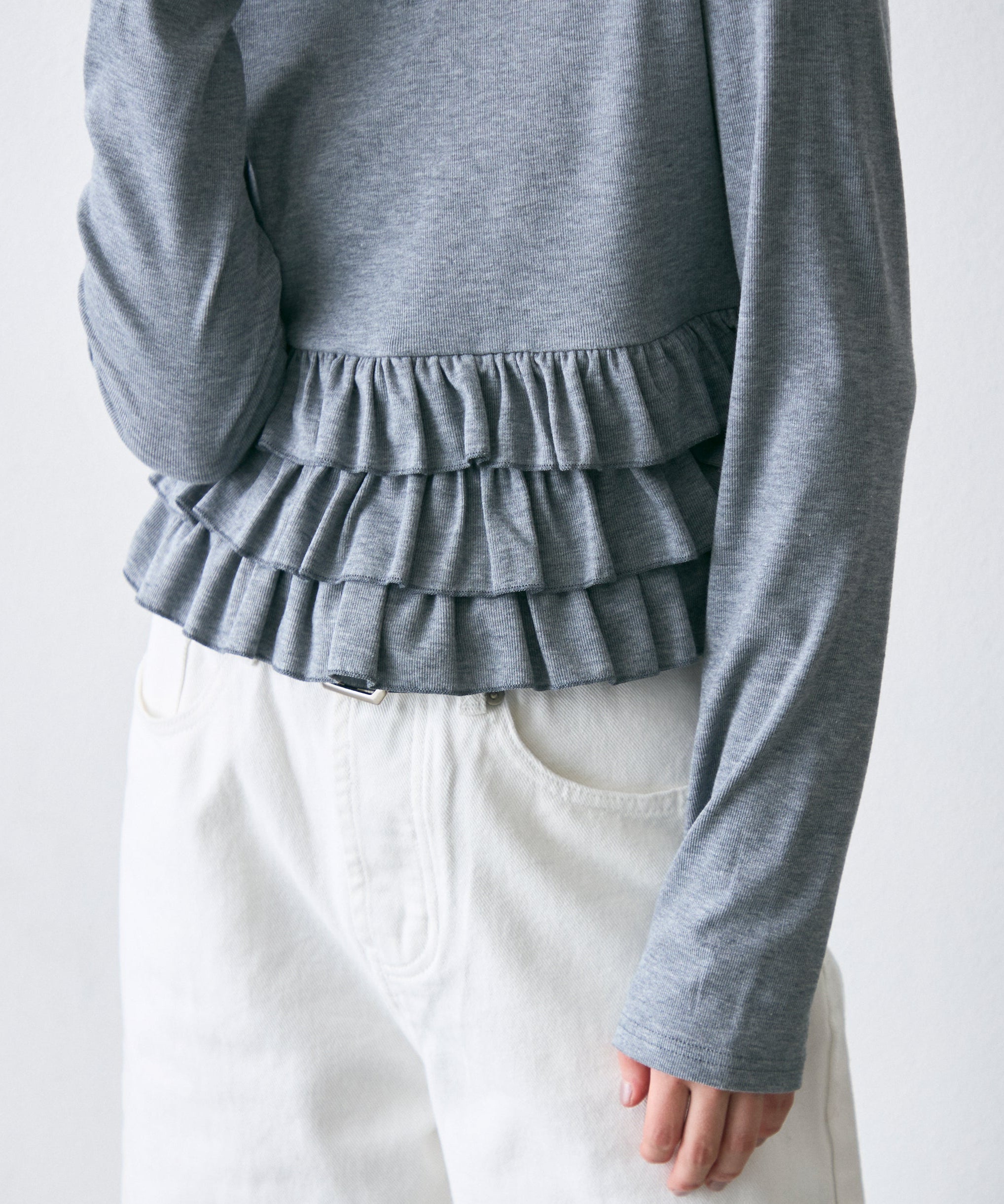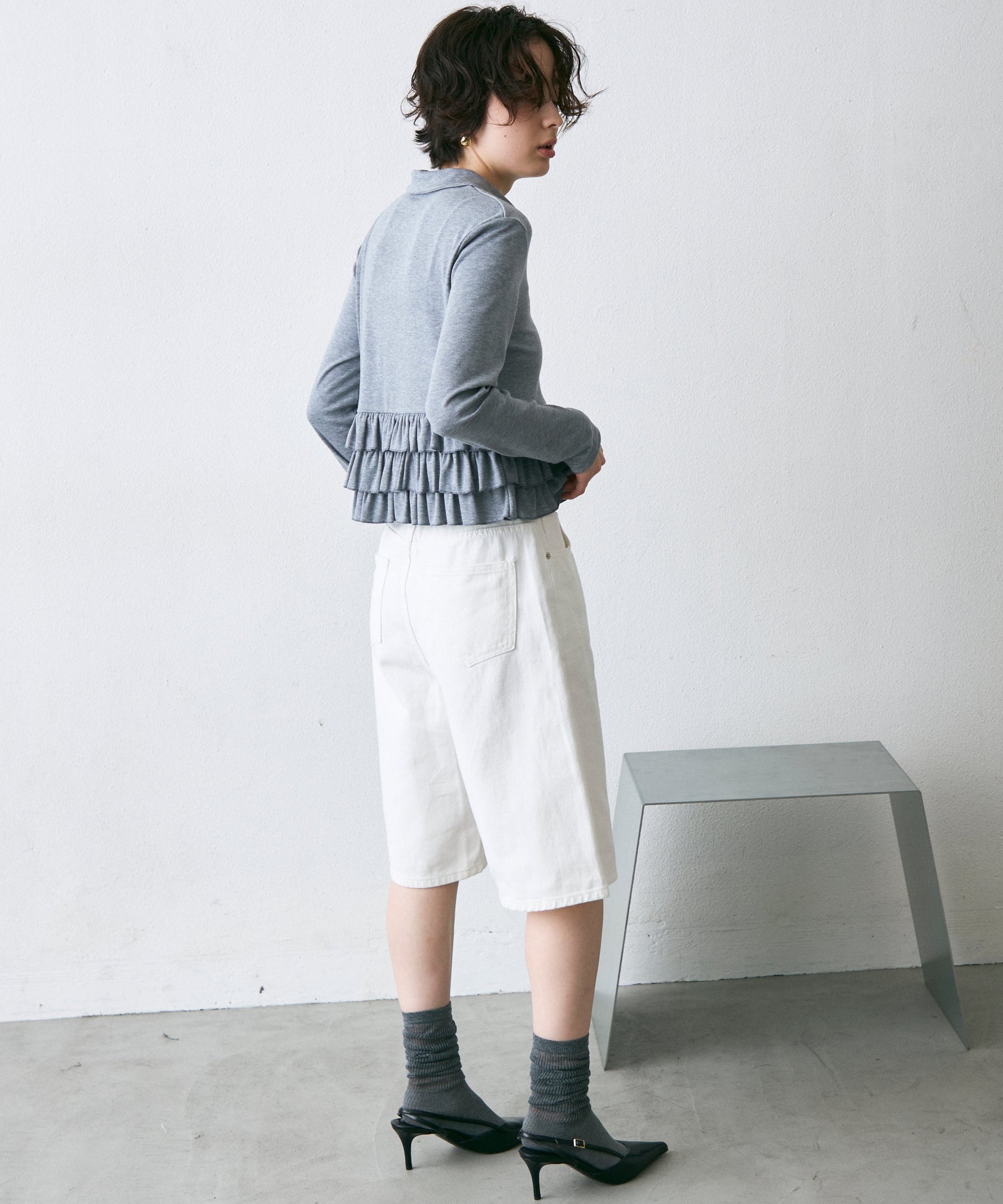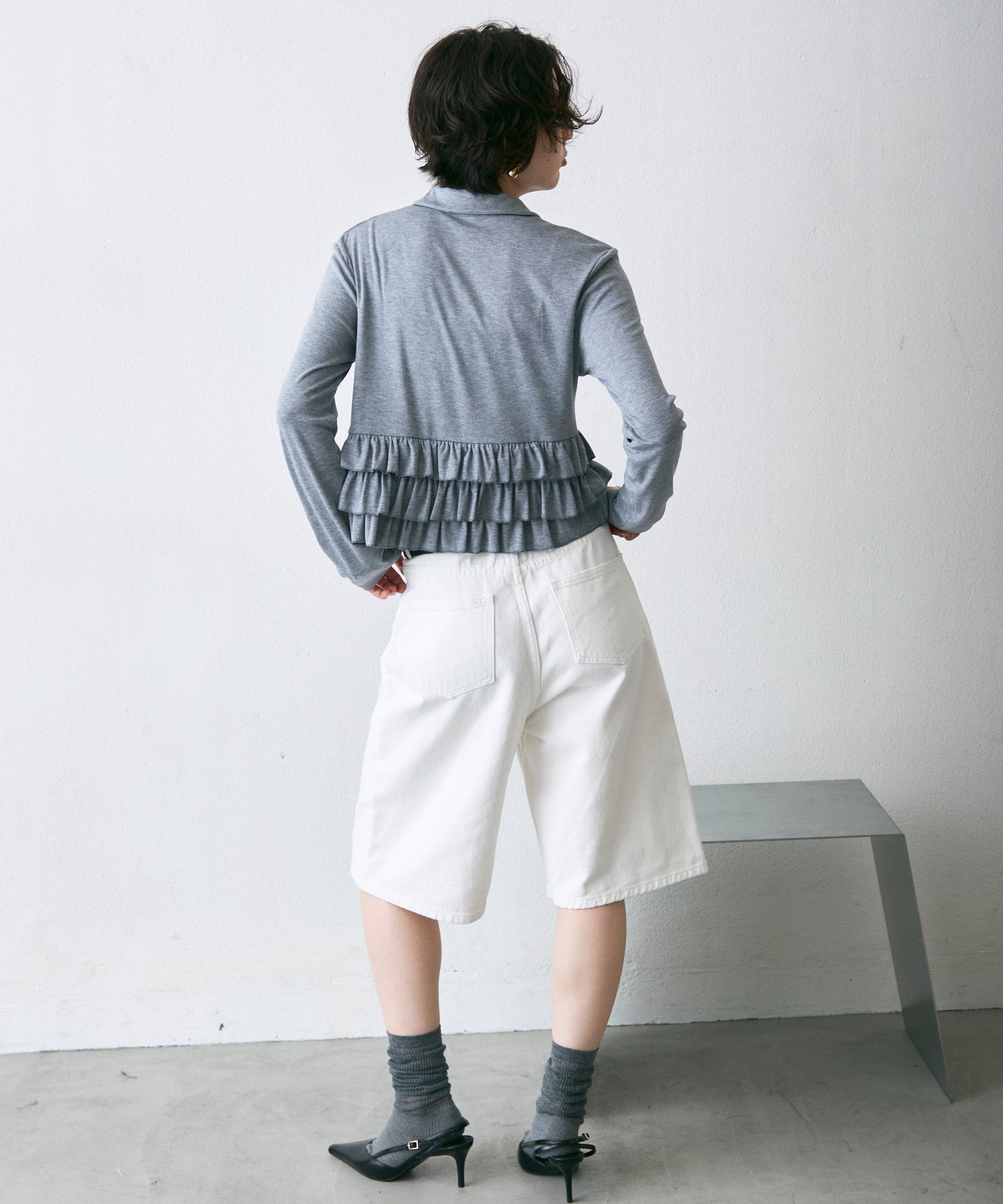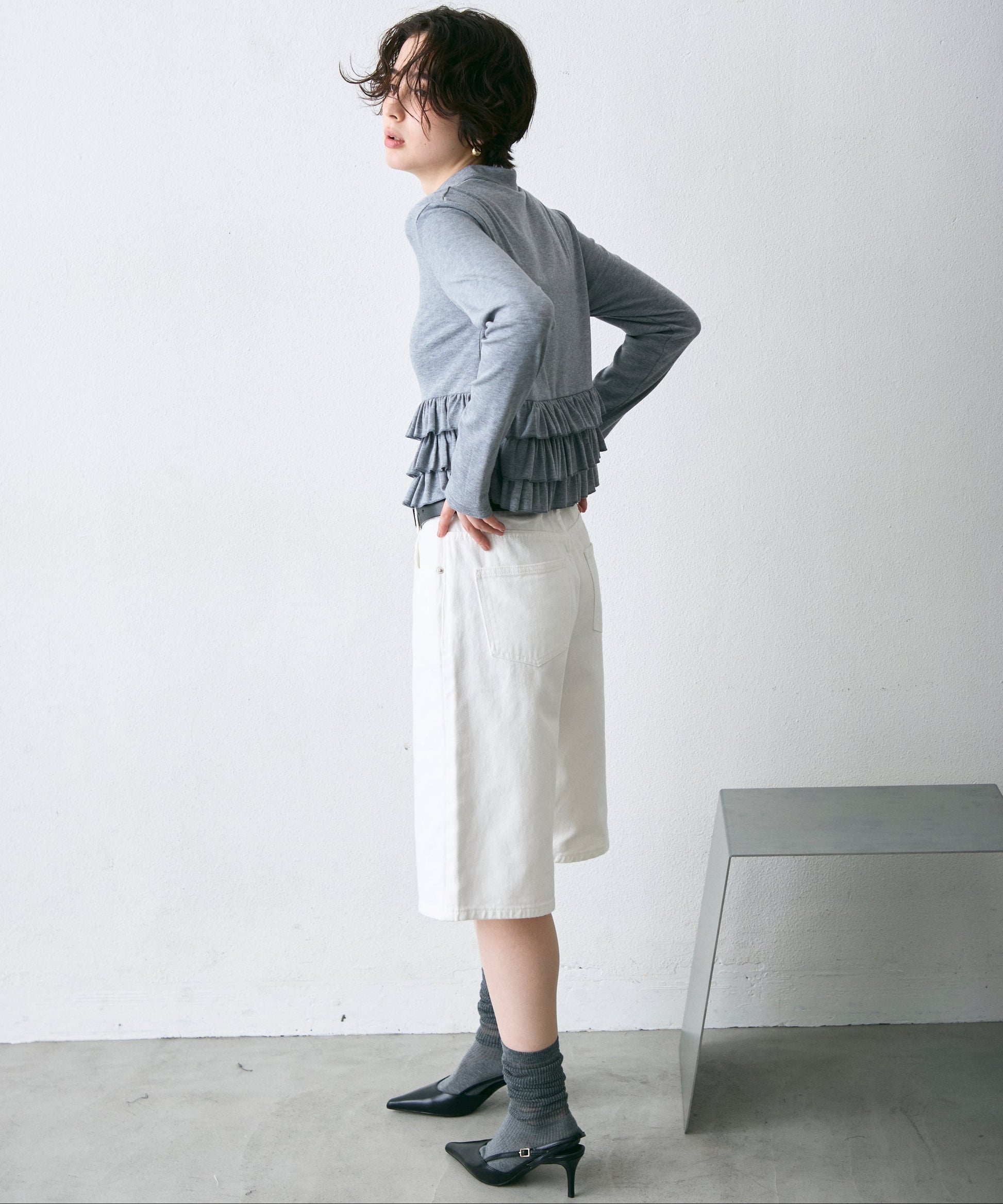 裾のフリルが動くたびに揺れ、さりげなく可愛さを演出します。
