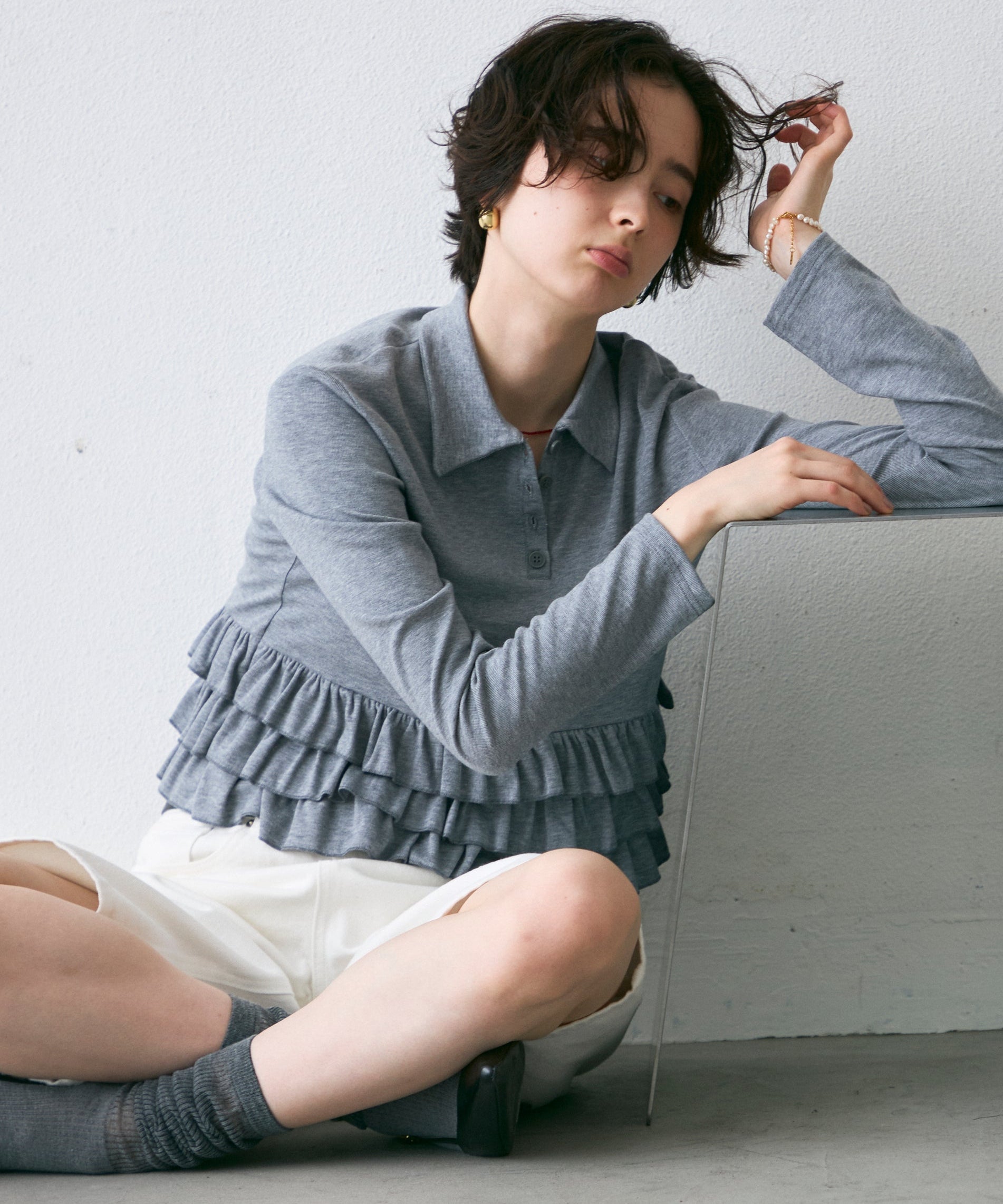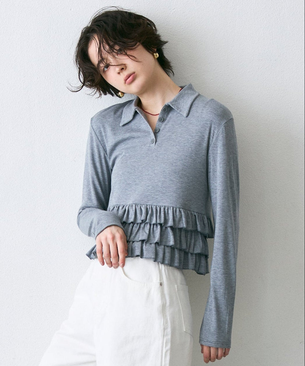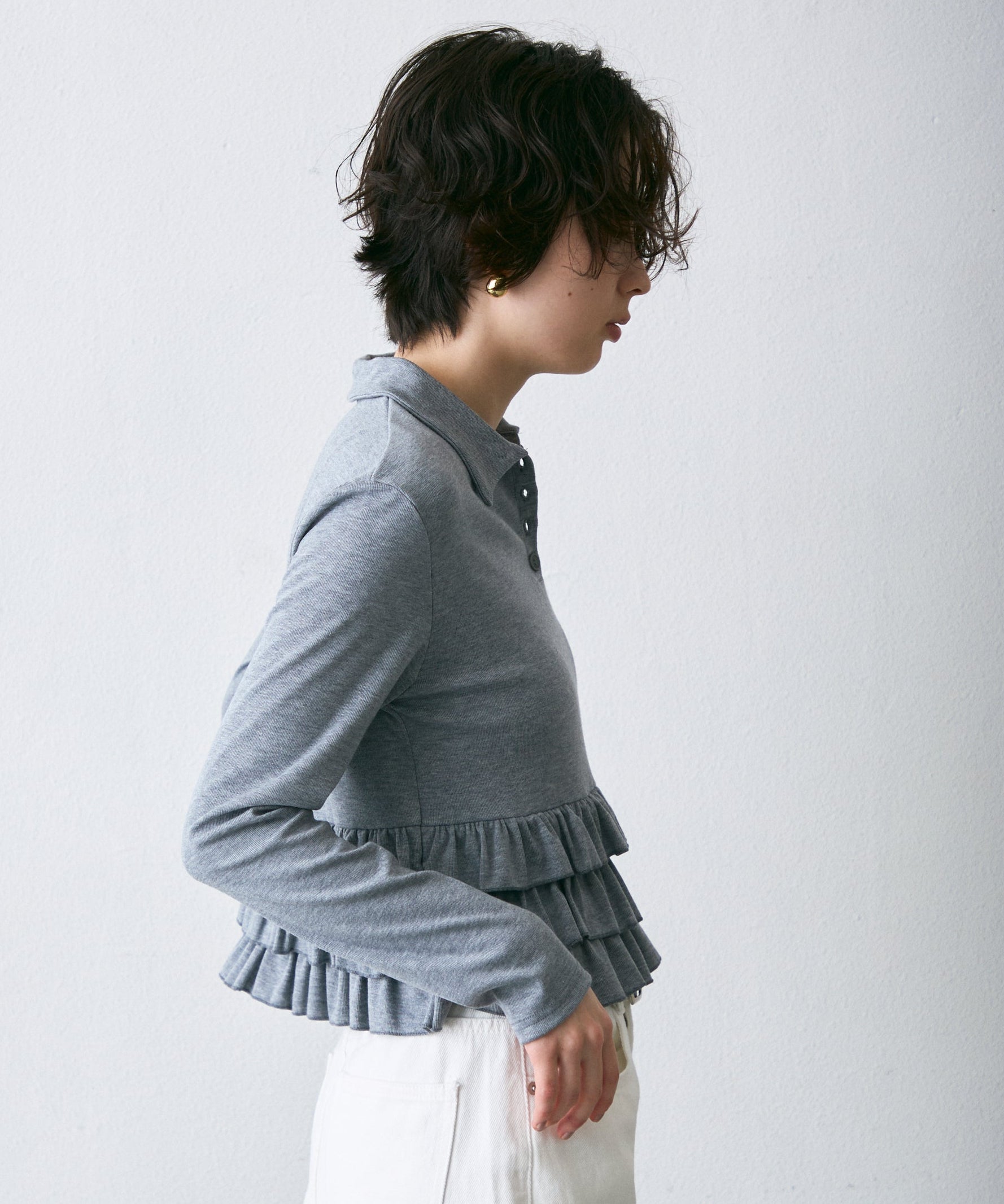 裾にあしらったさりげないフリルが、シンプルなポロデザインに女性らしさをプラス。