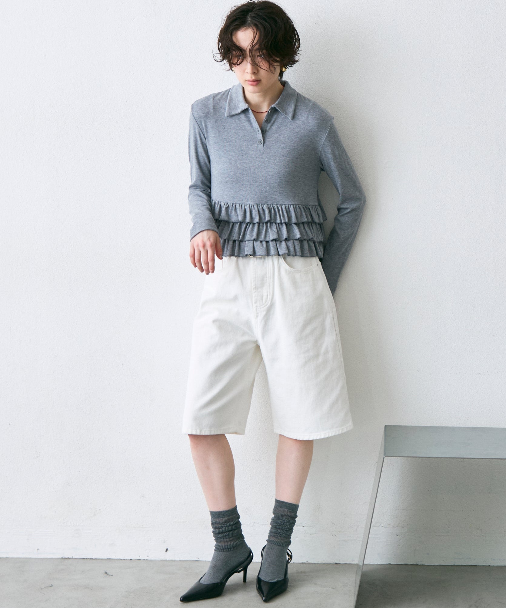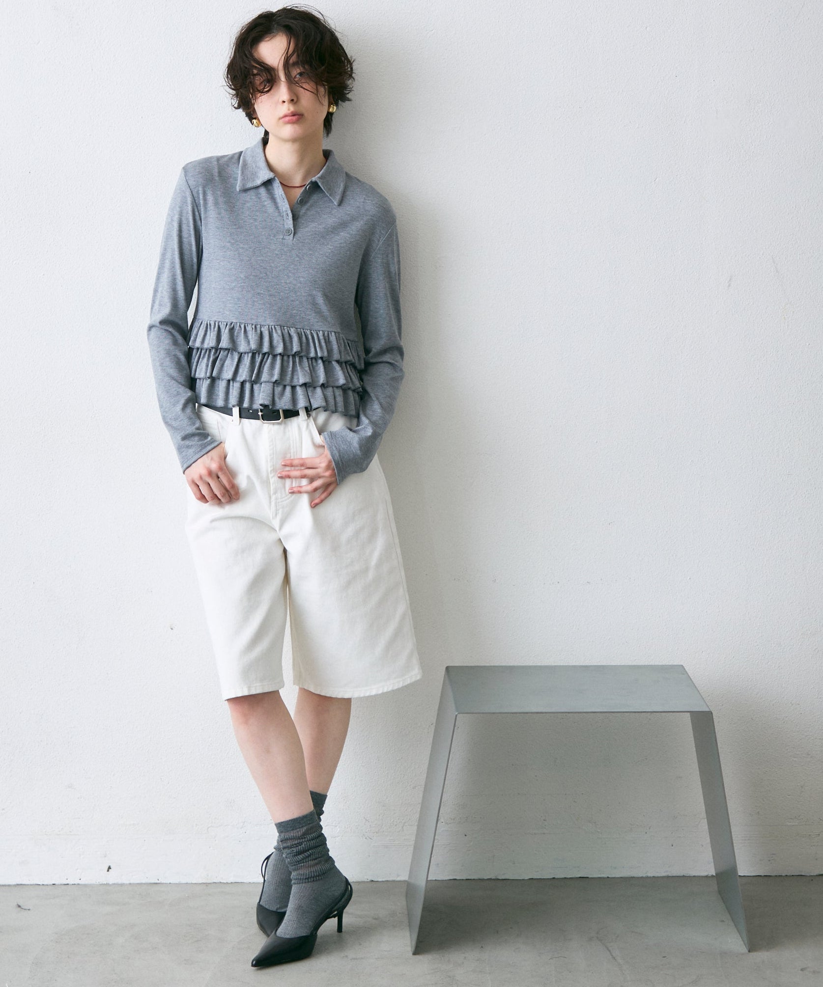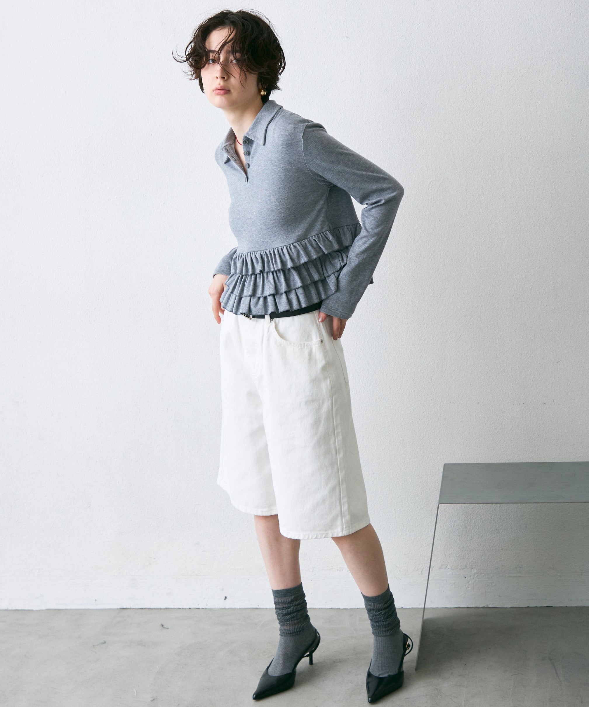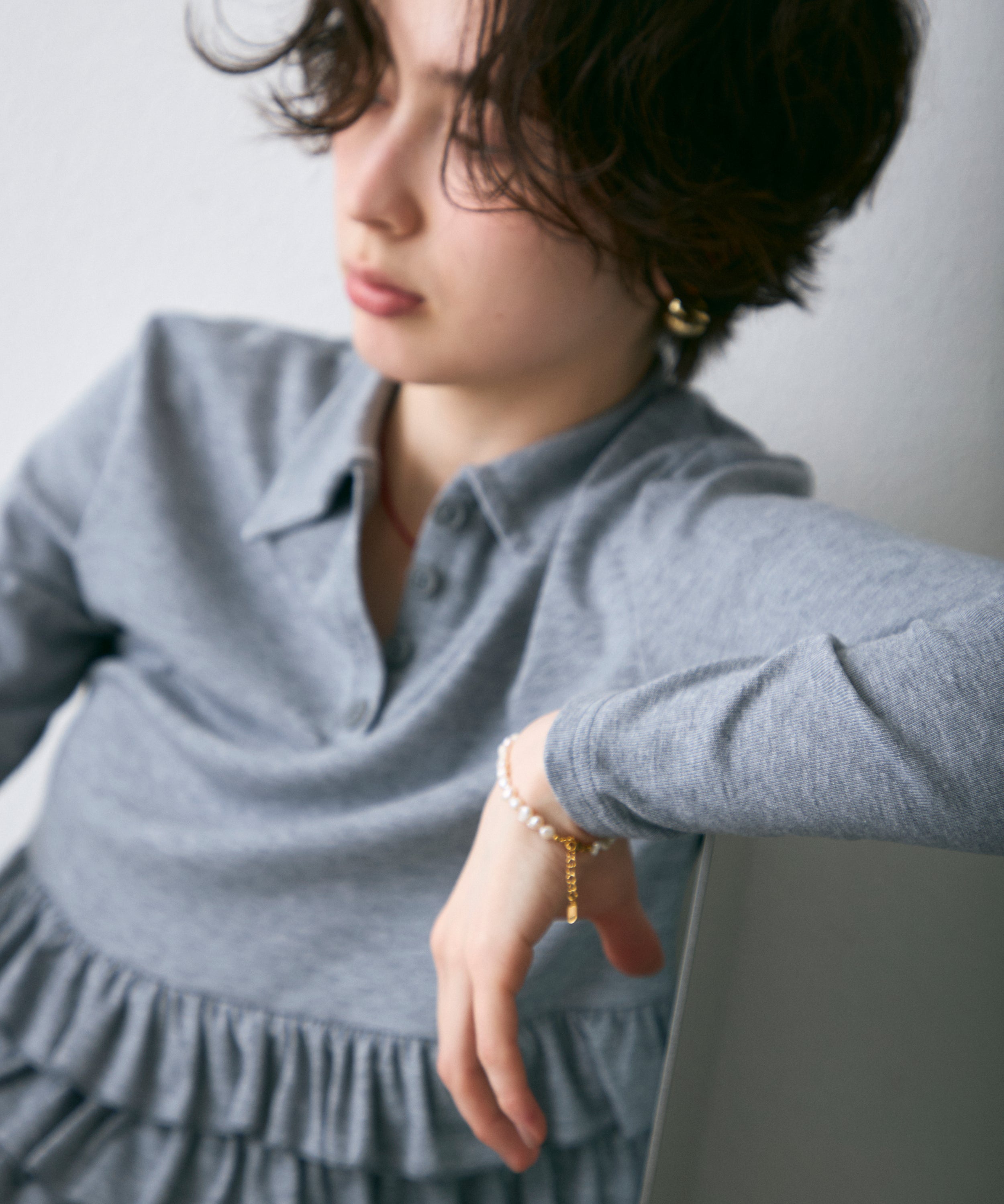 裾にあしらったさりげないフリルが、シンプルなポロデザインに女性らしさをプラス。