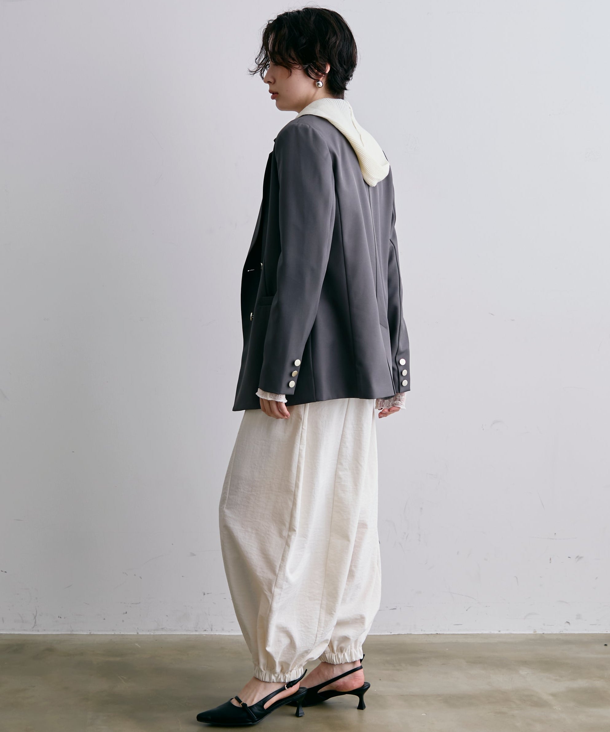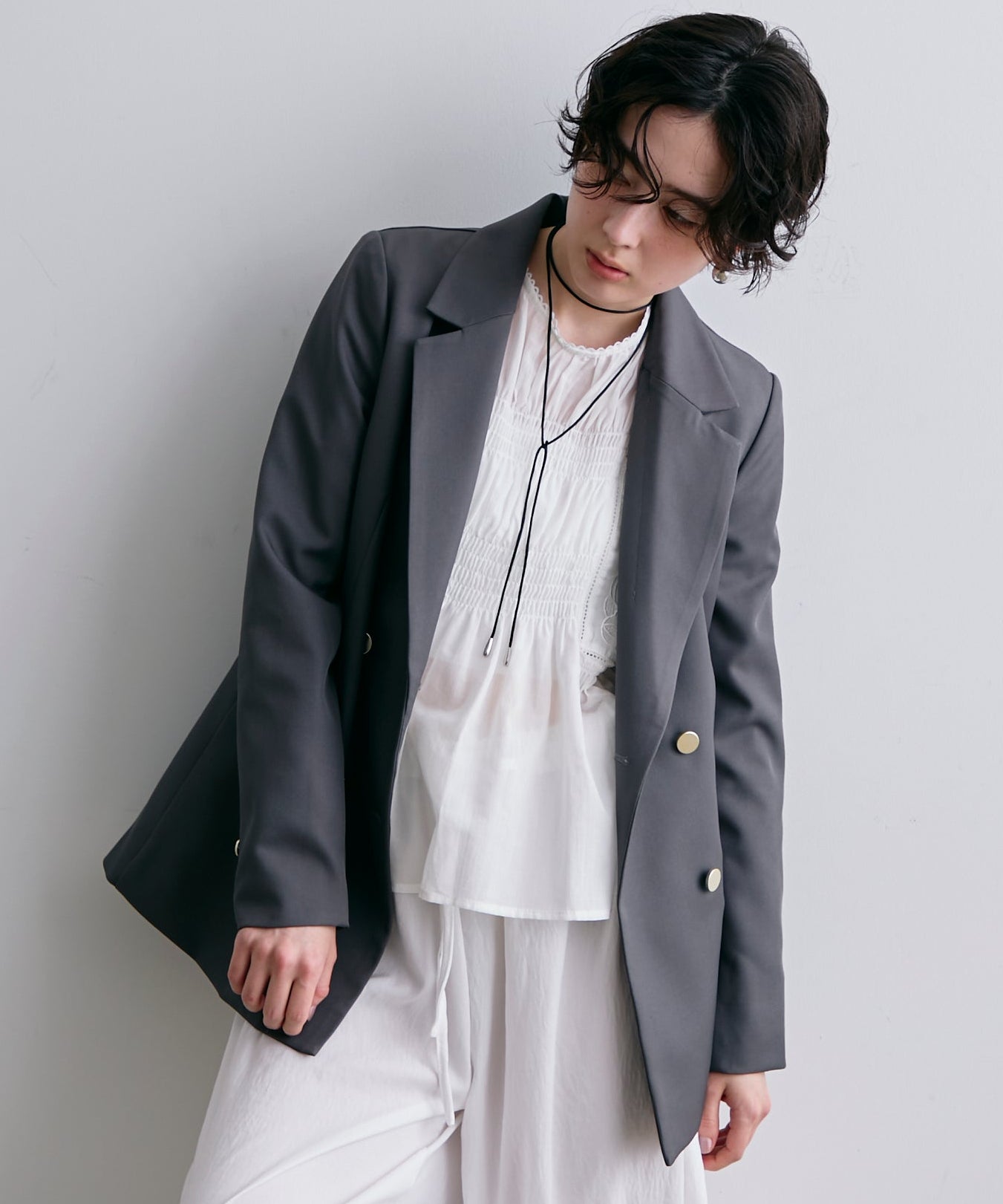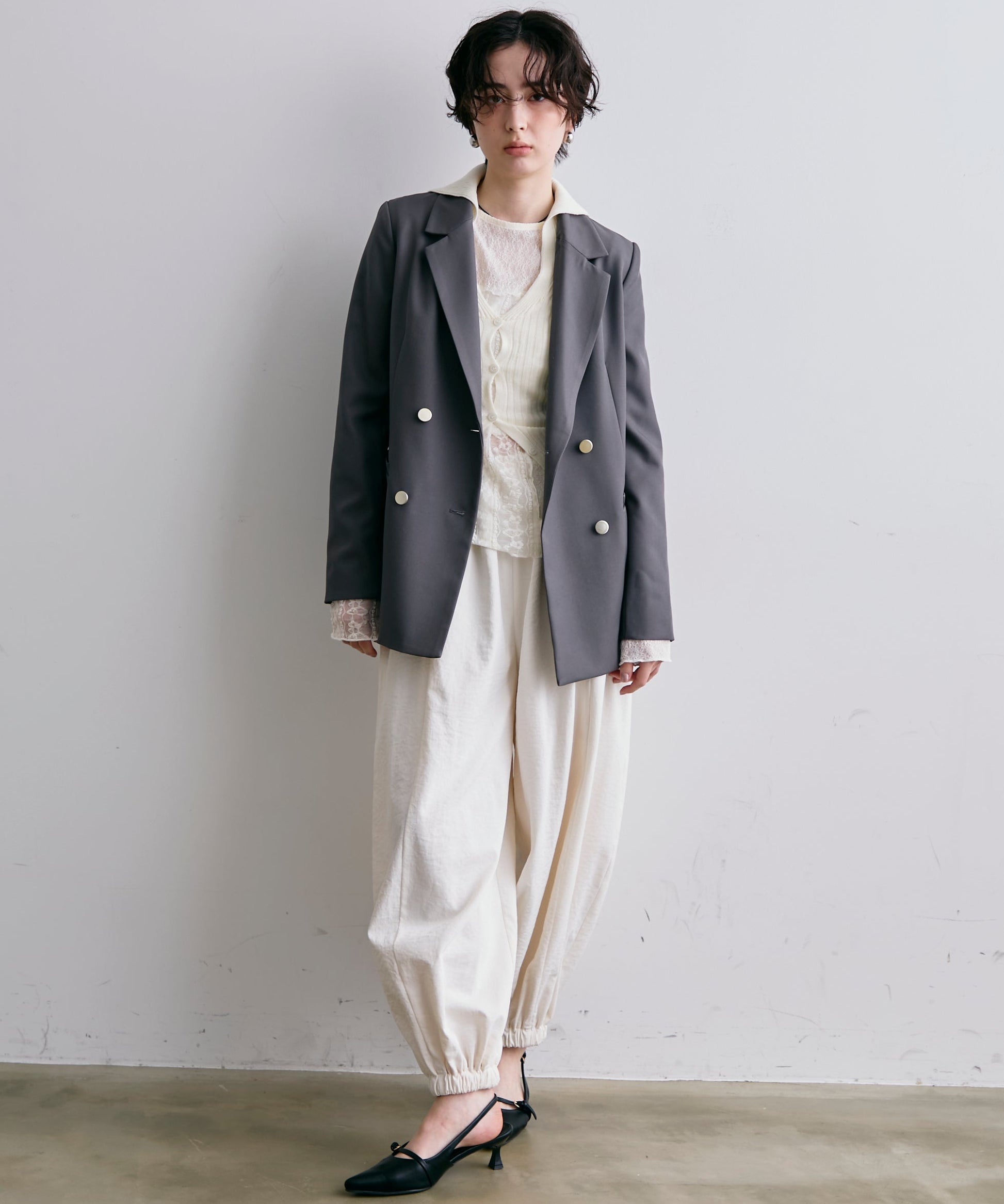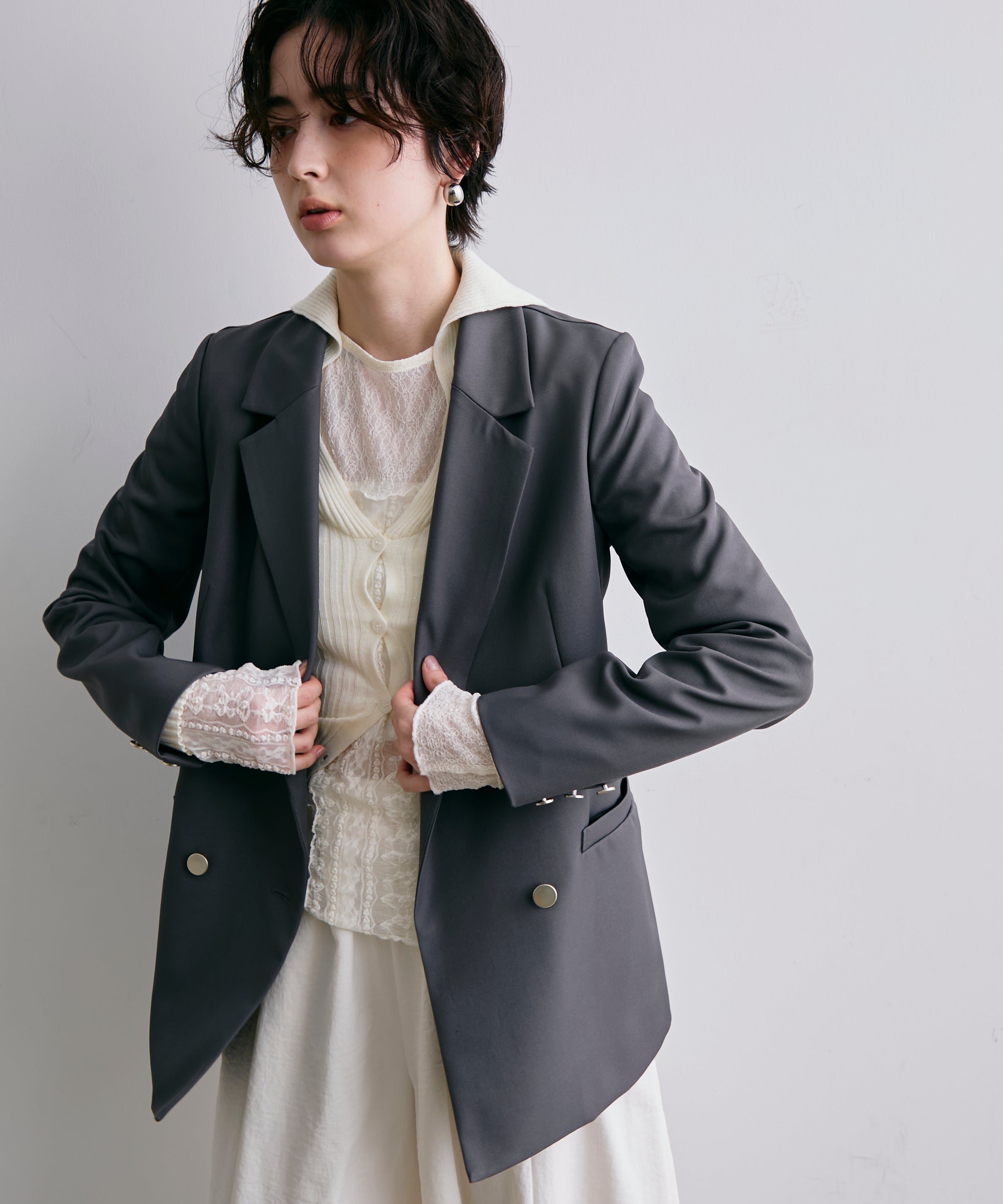 ゴールドボタンがアクセントをプラスするダブルテーラードジャケット